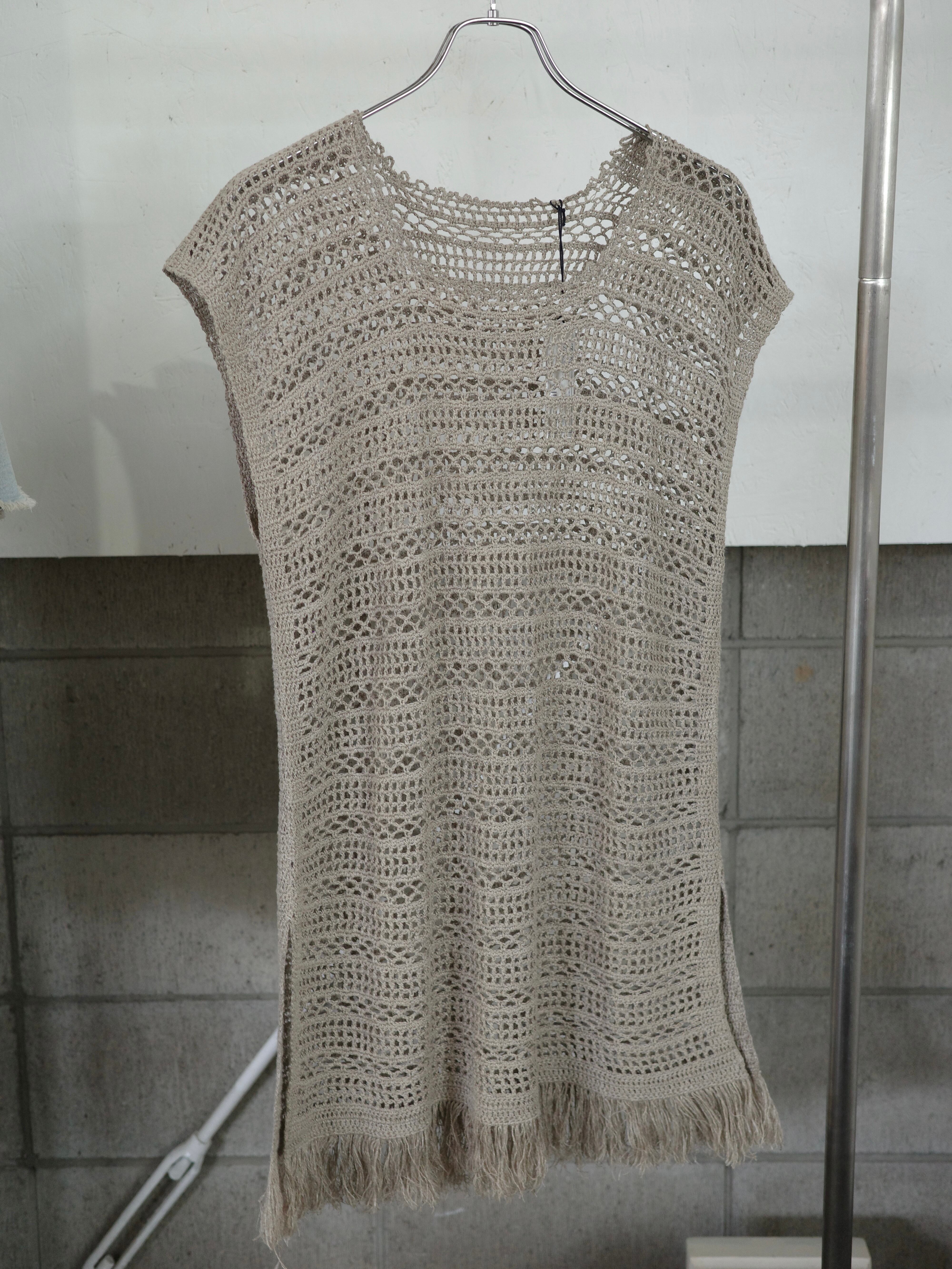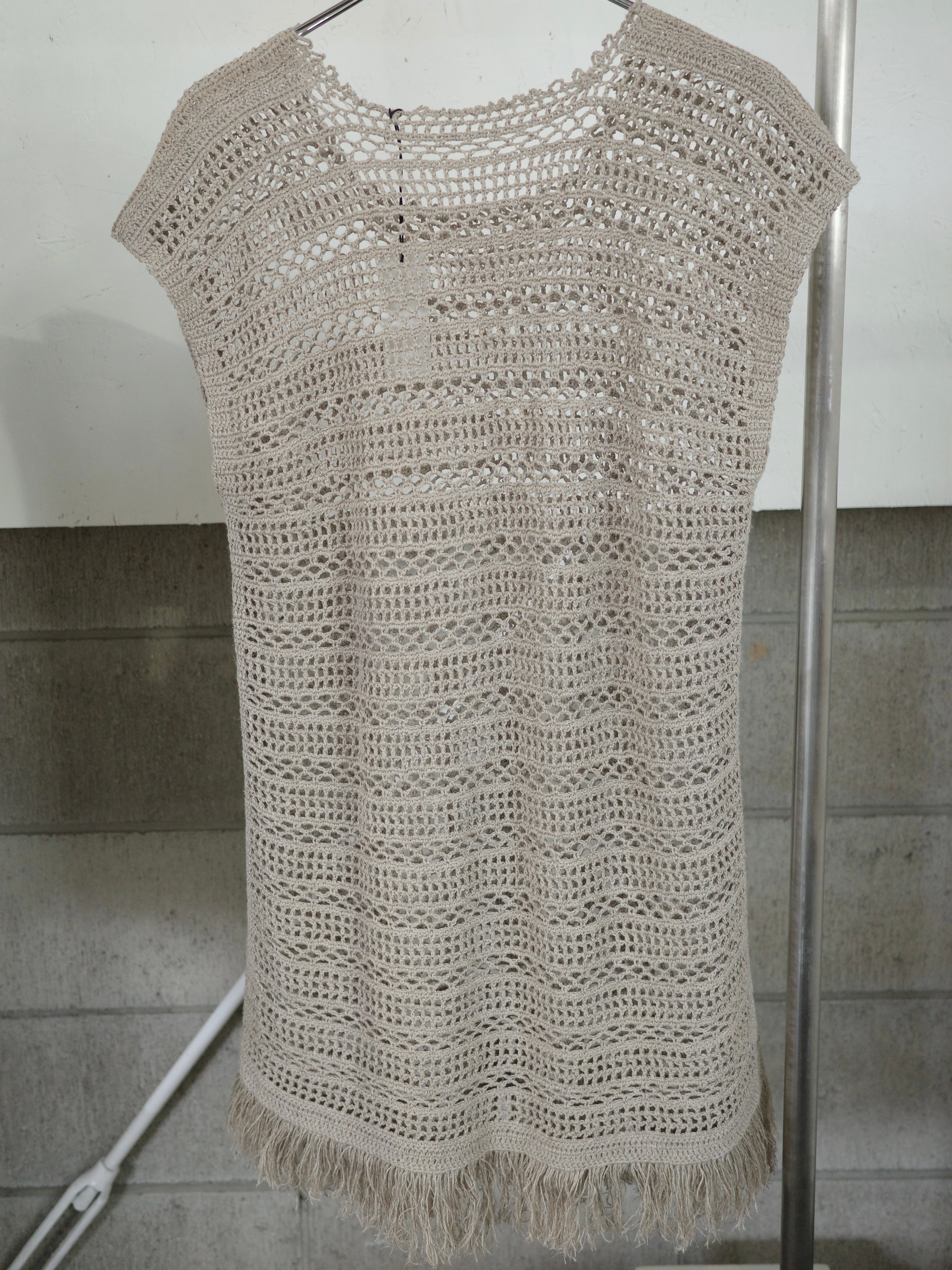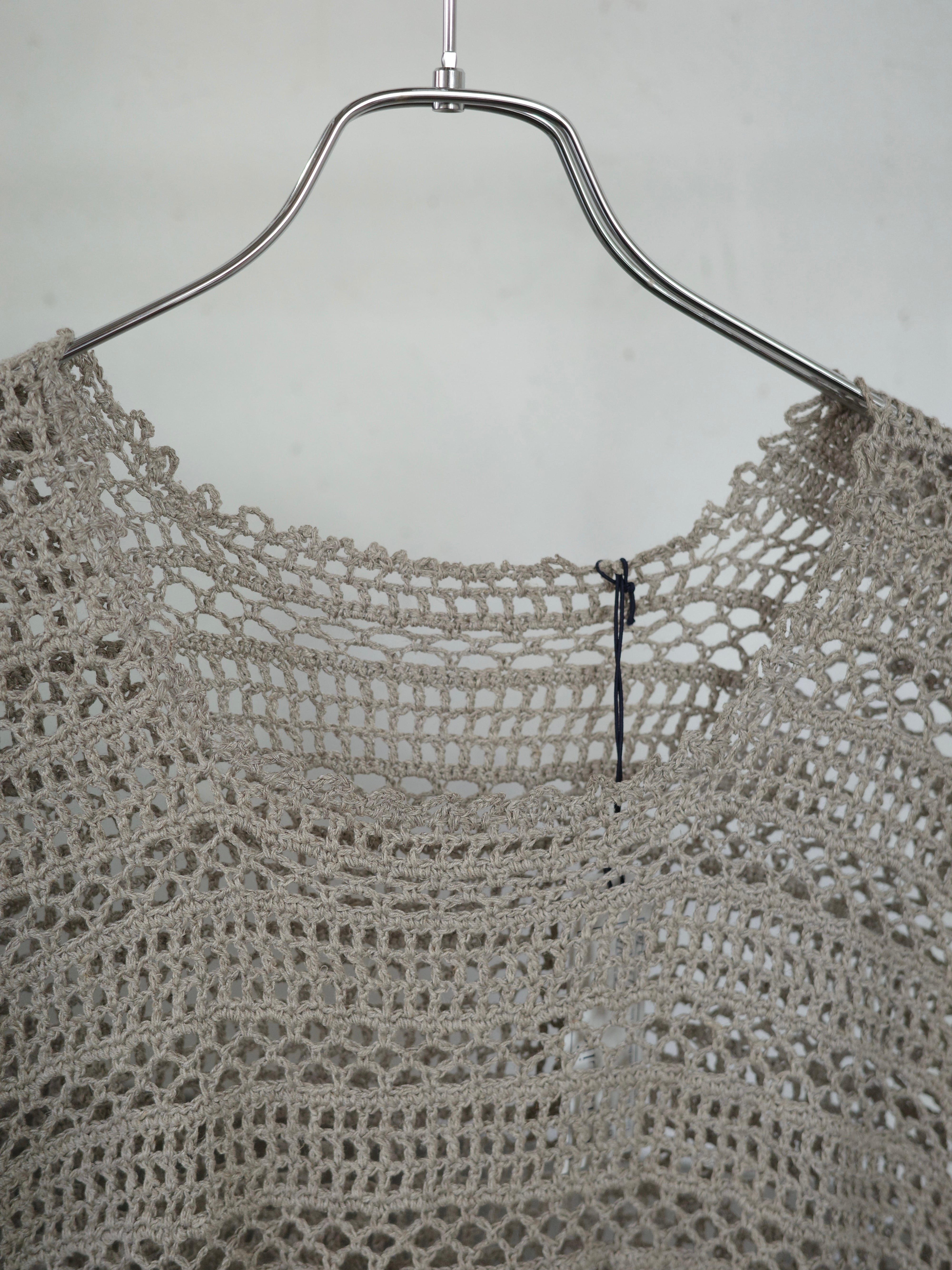 かぎ編みのチュニックです。落ち着いたグレージュの色味が大人っぽく、夏はノースリーブで、秋はベストのような感覚で重ね着して着用いただけます。