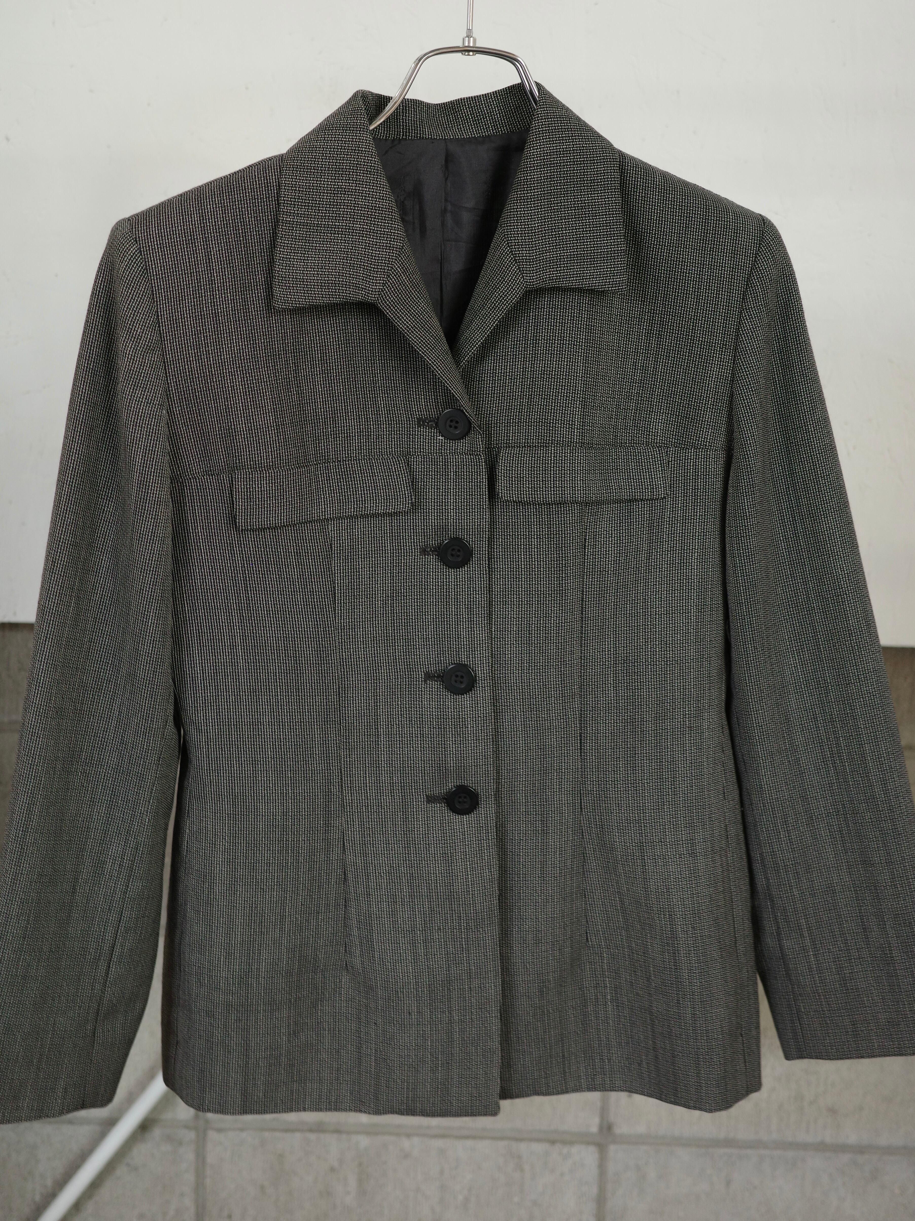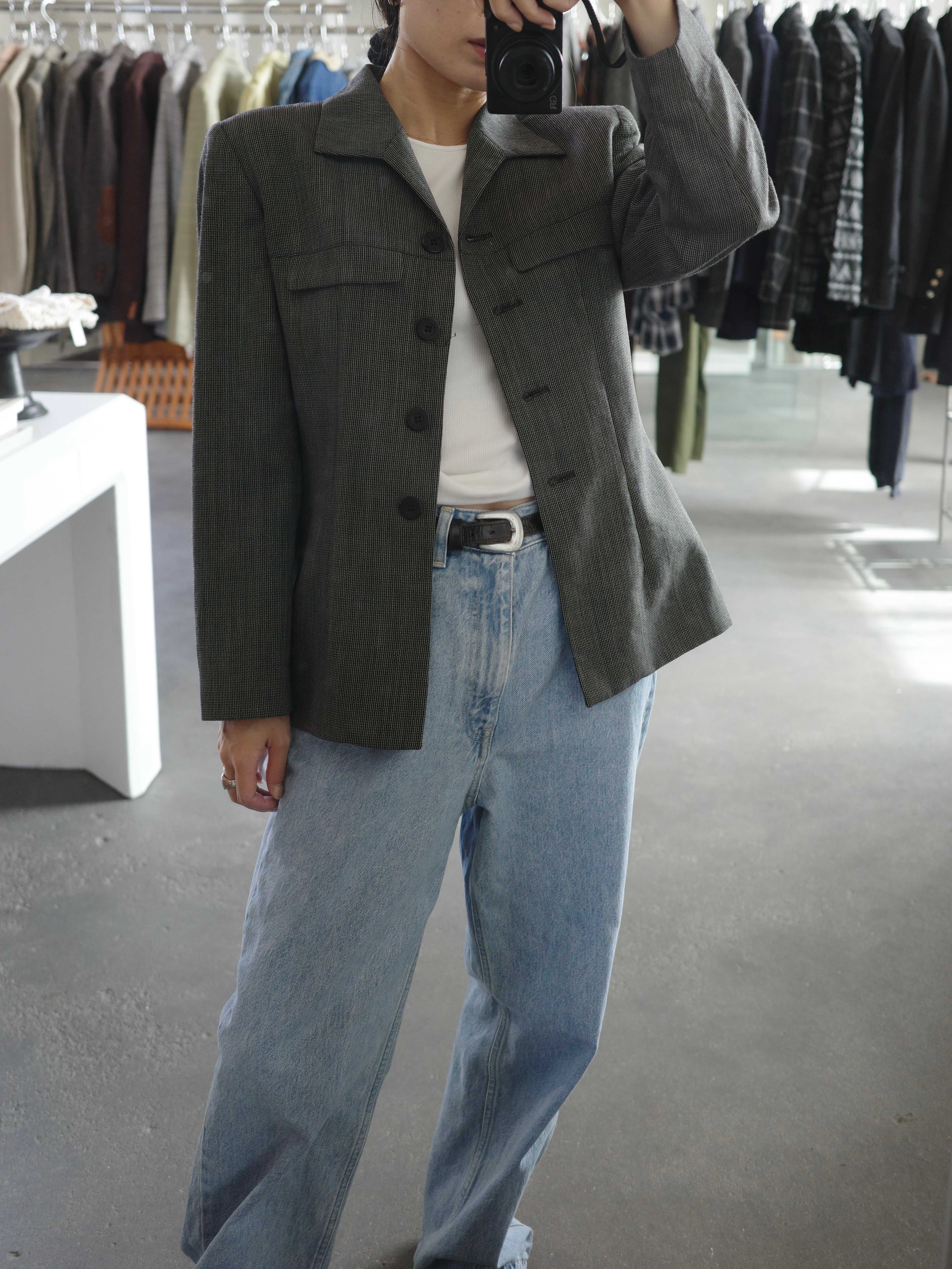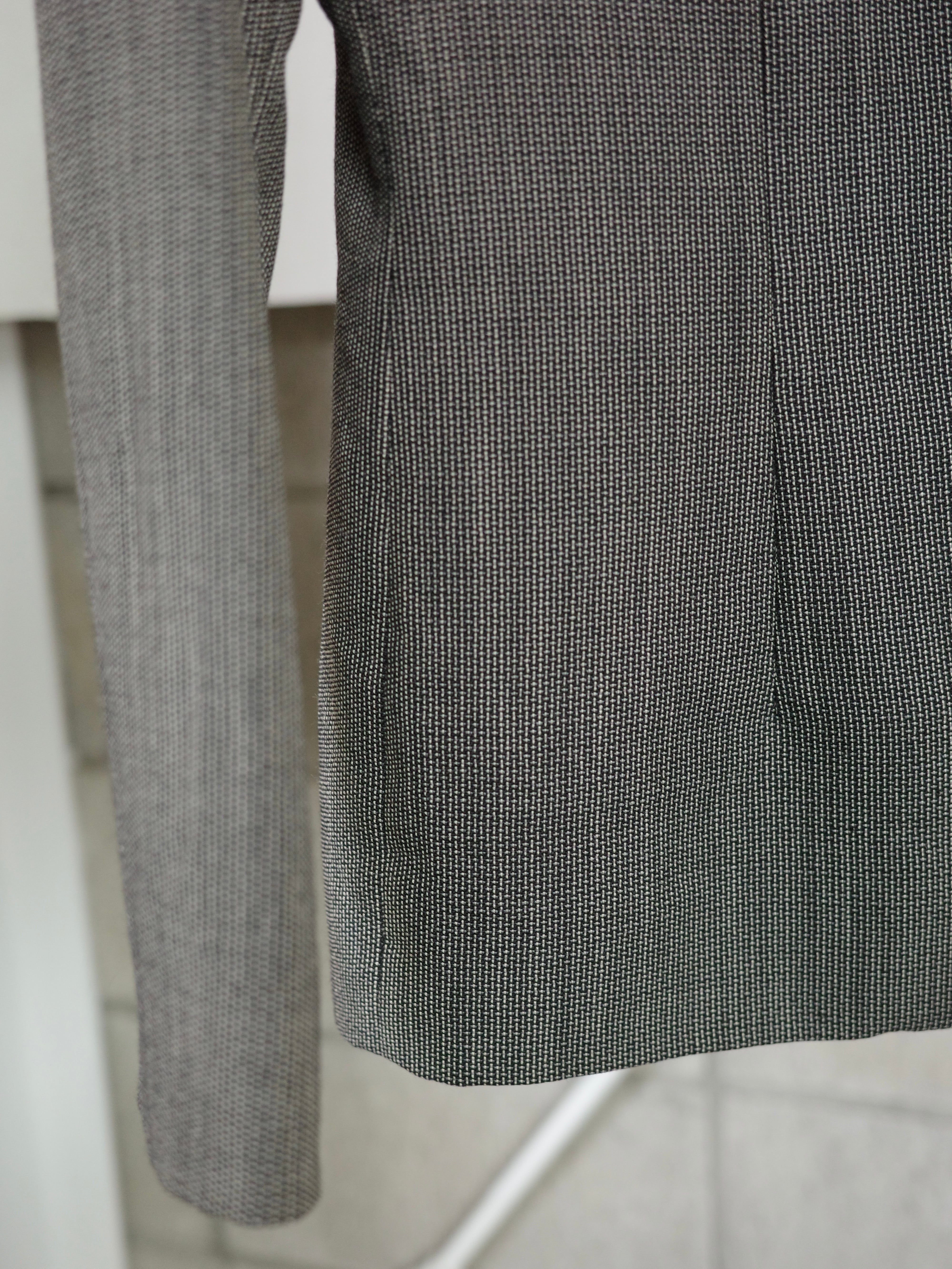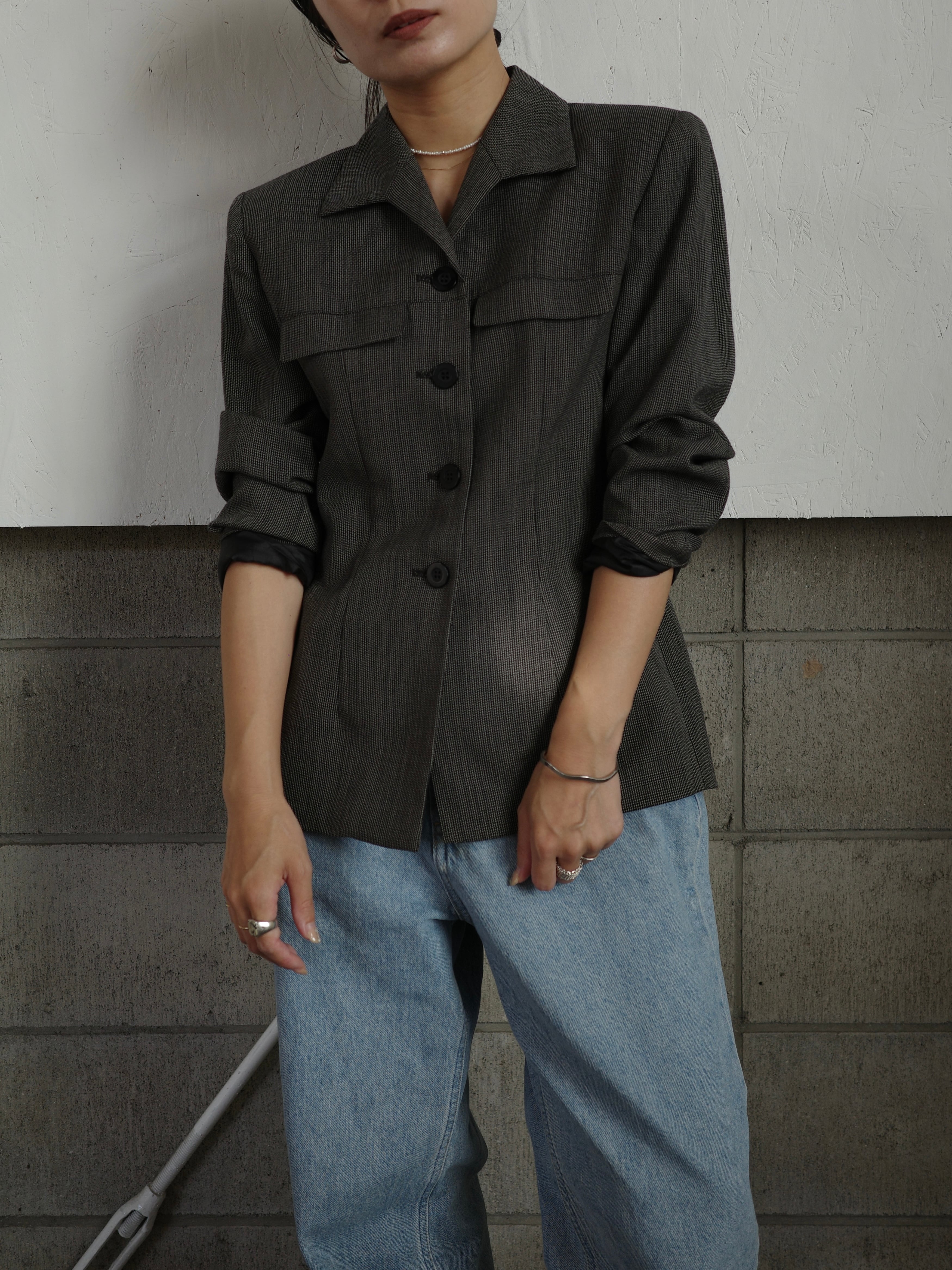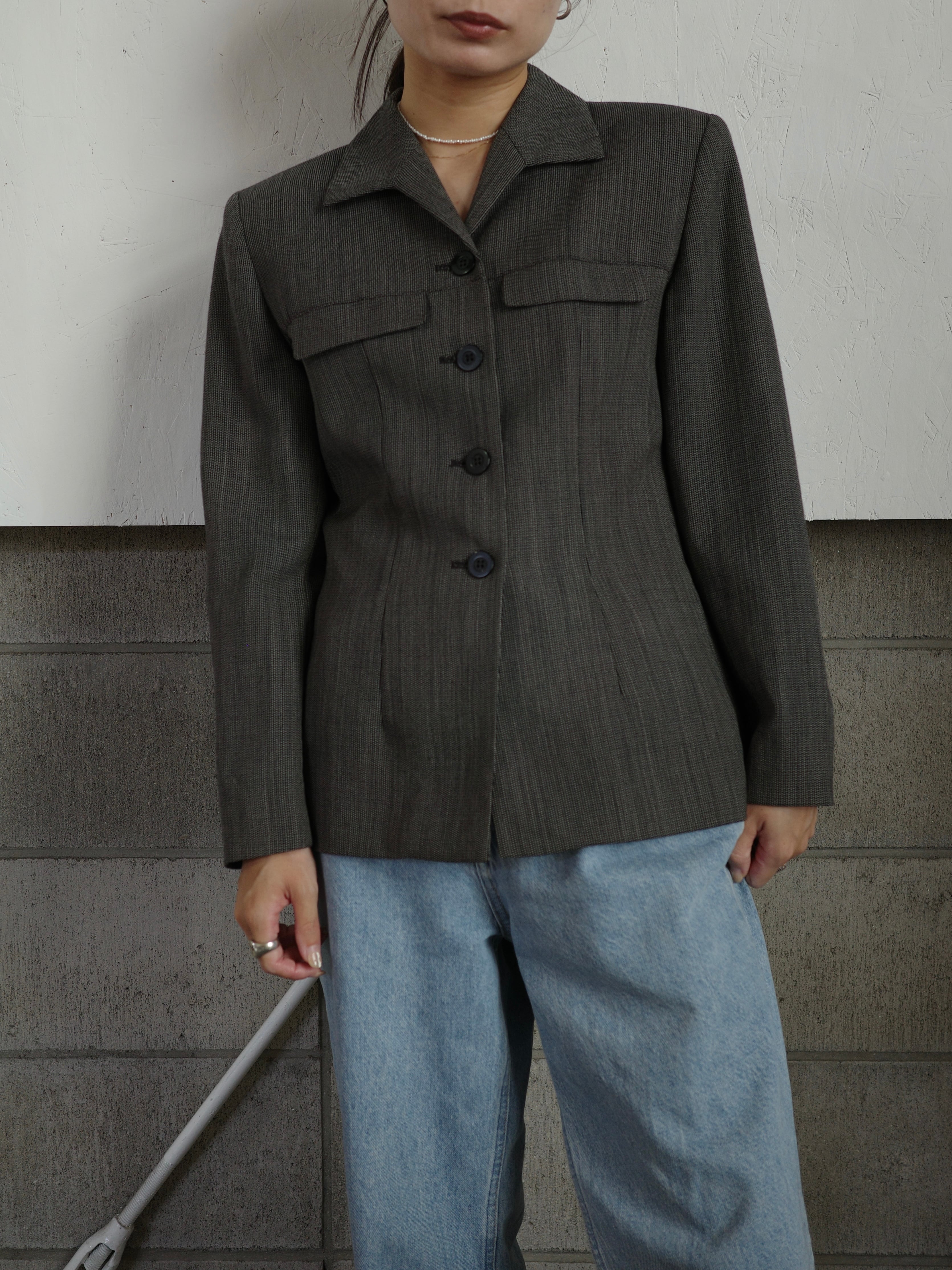コンパクトなシルエットのボタンアップジャケットです。ウエストがくびれたすっきりしたシルエットで、ボタンを閉めてきてもレトロで可愛らしいです。グレーとブラックのミックスカラーの生地感も素敵です。