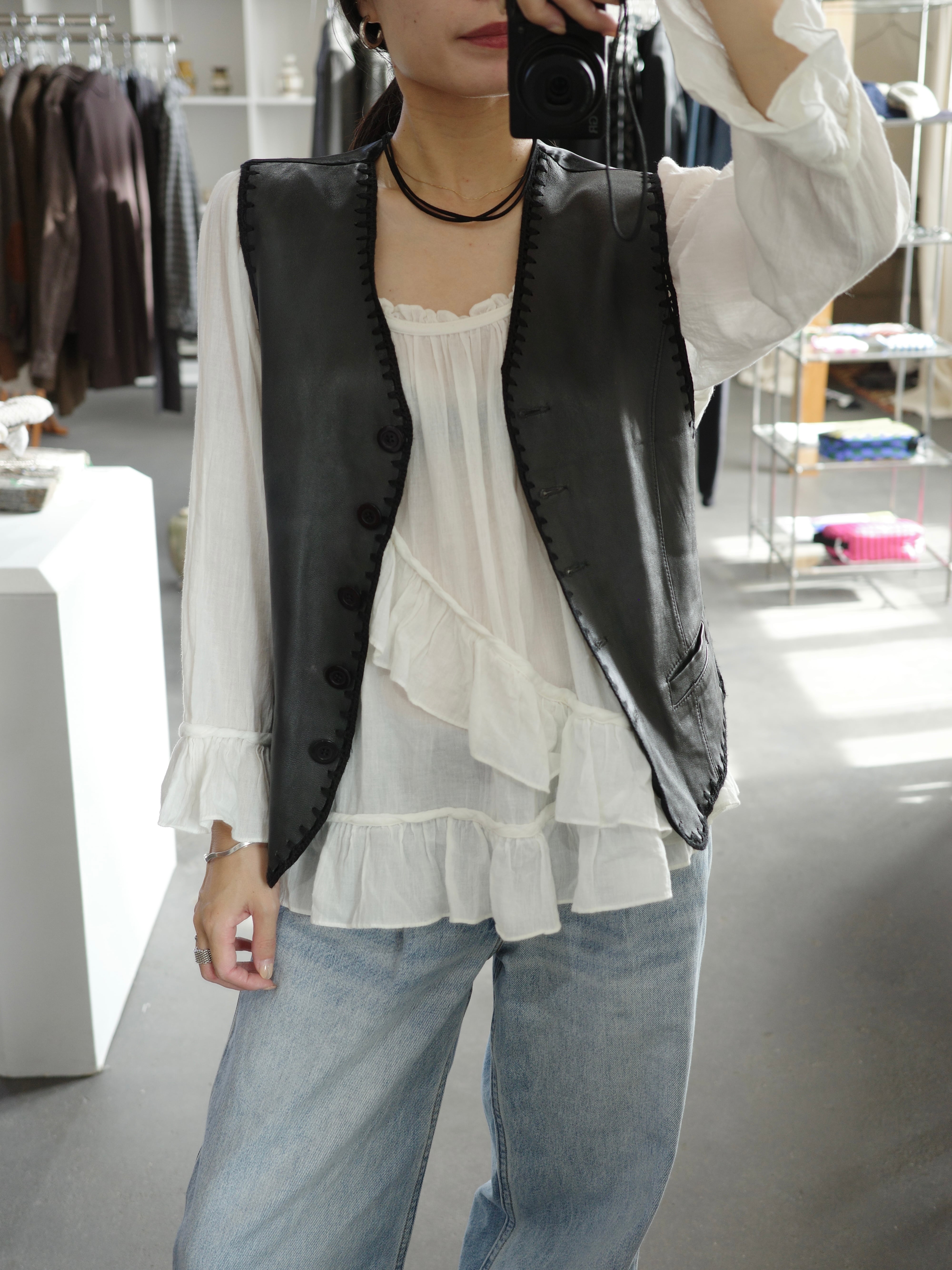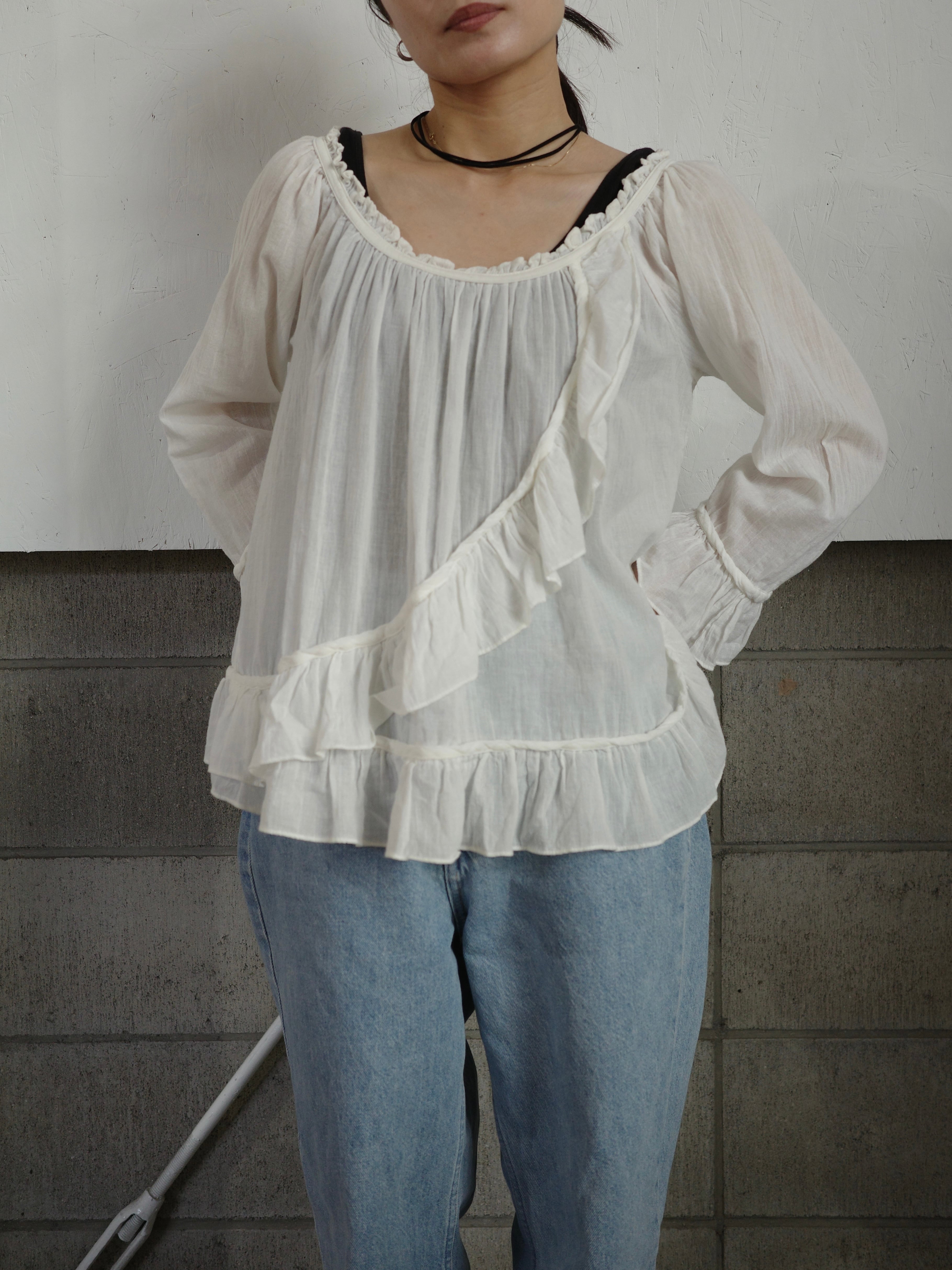 コットンのフリルトップスです。やや透け感のある素材で、斜めに入ったフリルの切り替えがポイントです。薄手のゆったりしたシルエットなので、中にタートルを入れたり、上からベストを重ねたり、季節問わずいろんな着回しが効くアイテムです。