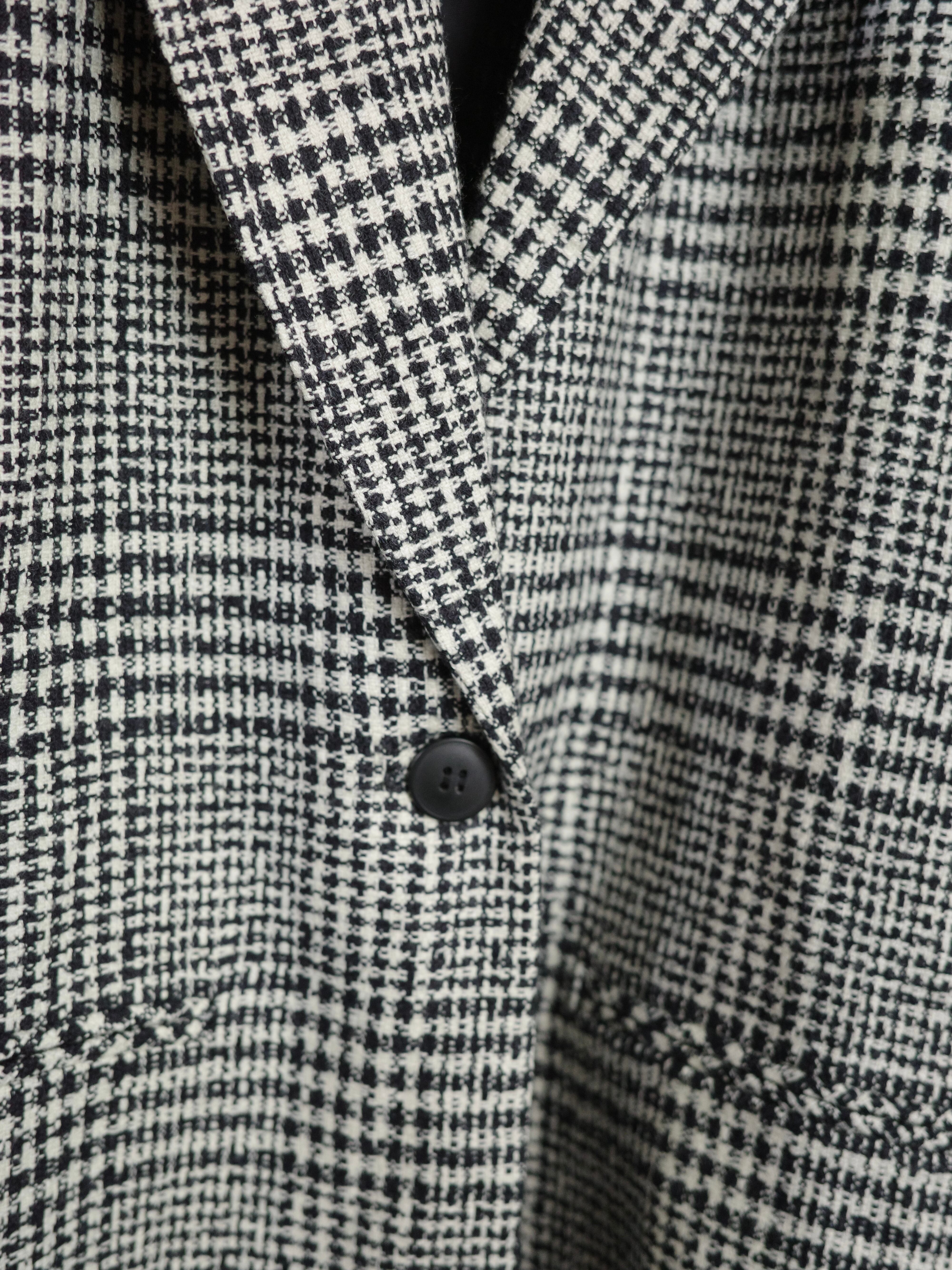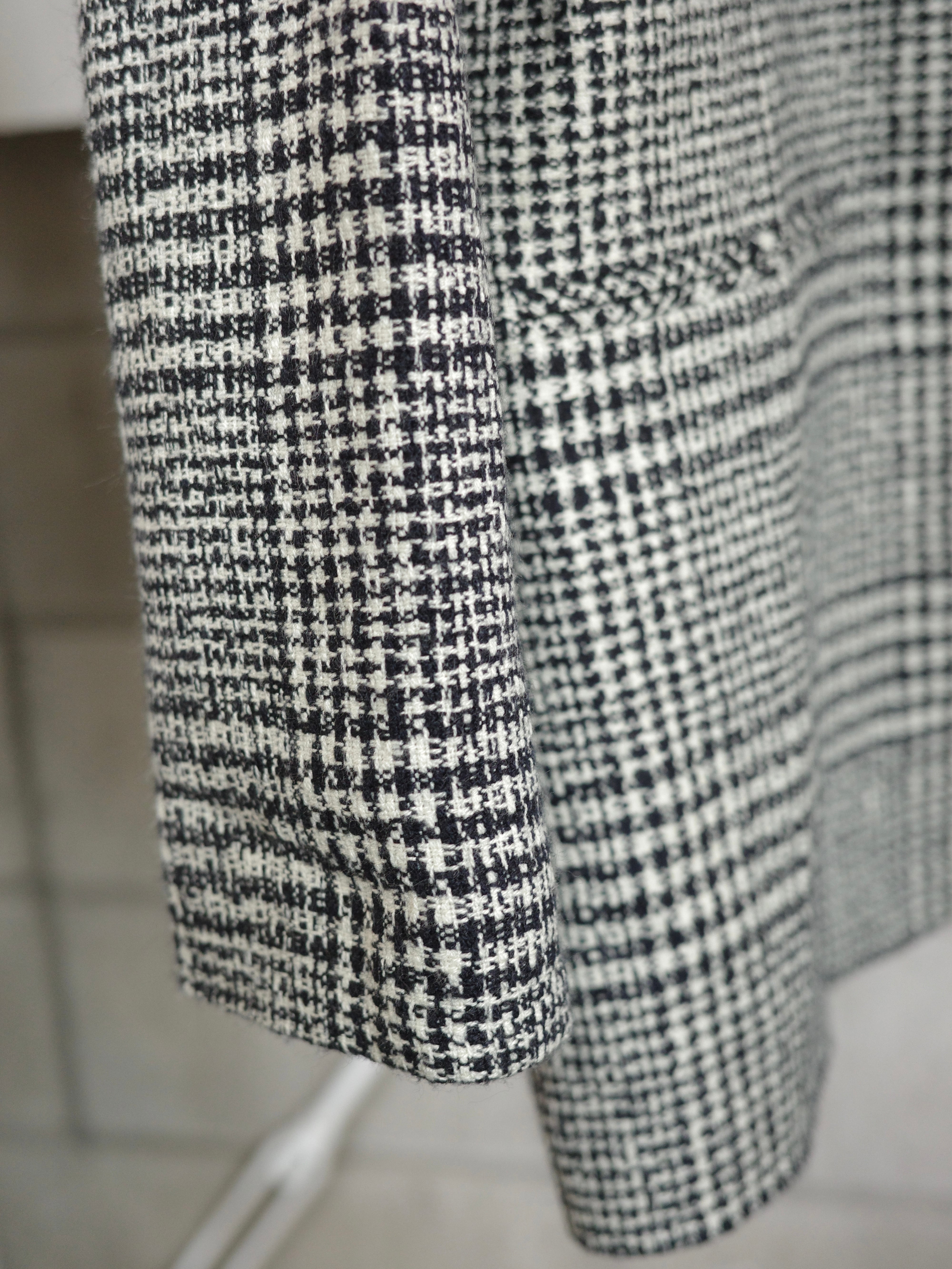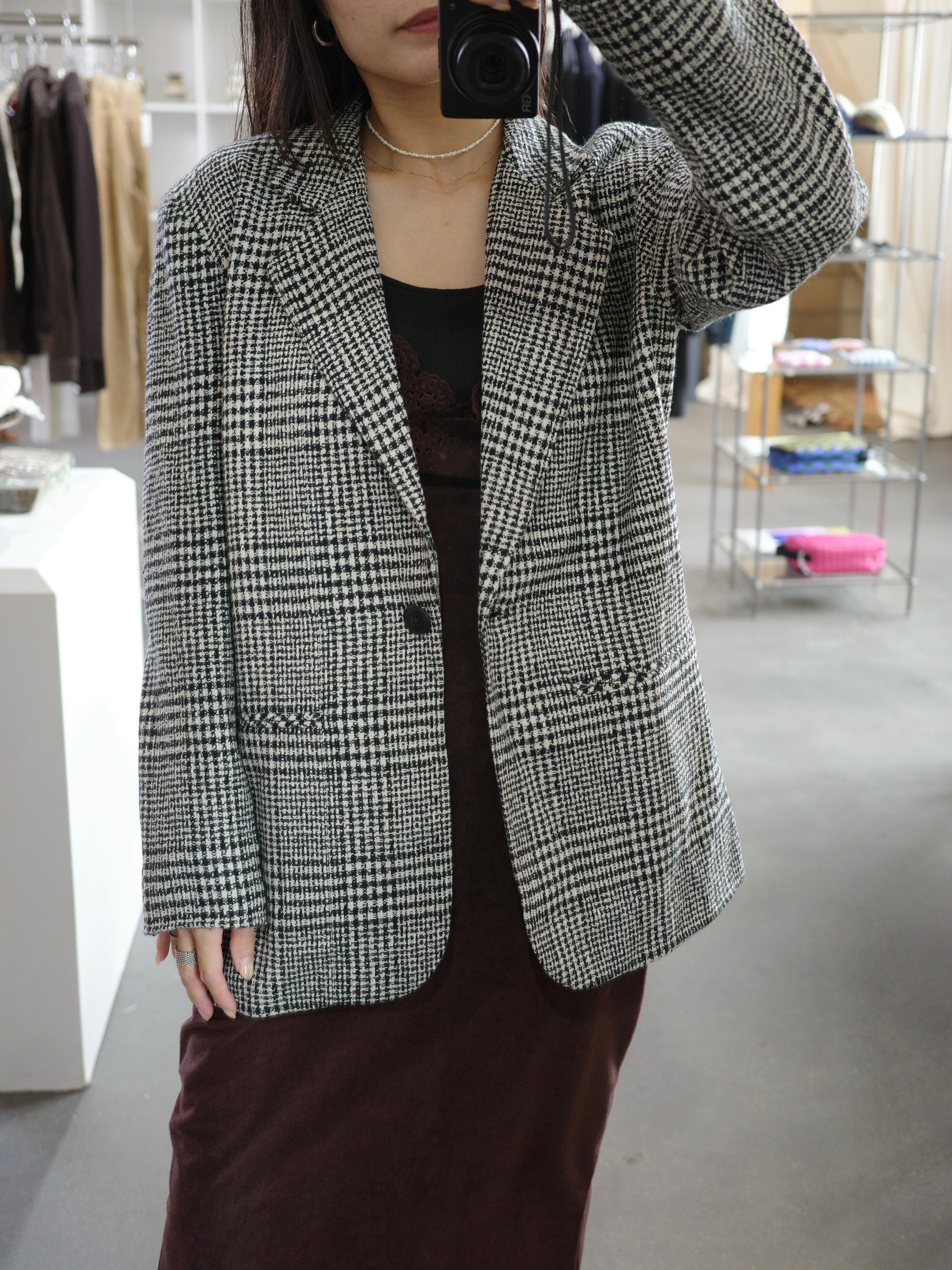 モノトーンのグレンチェックジャケットです。シンプルなボックス型ですが、目を惹く柄でコーデイネートのアクセントになります。