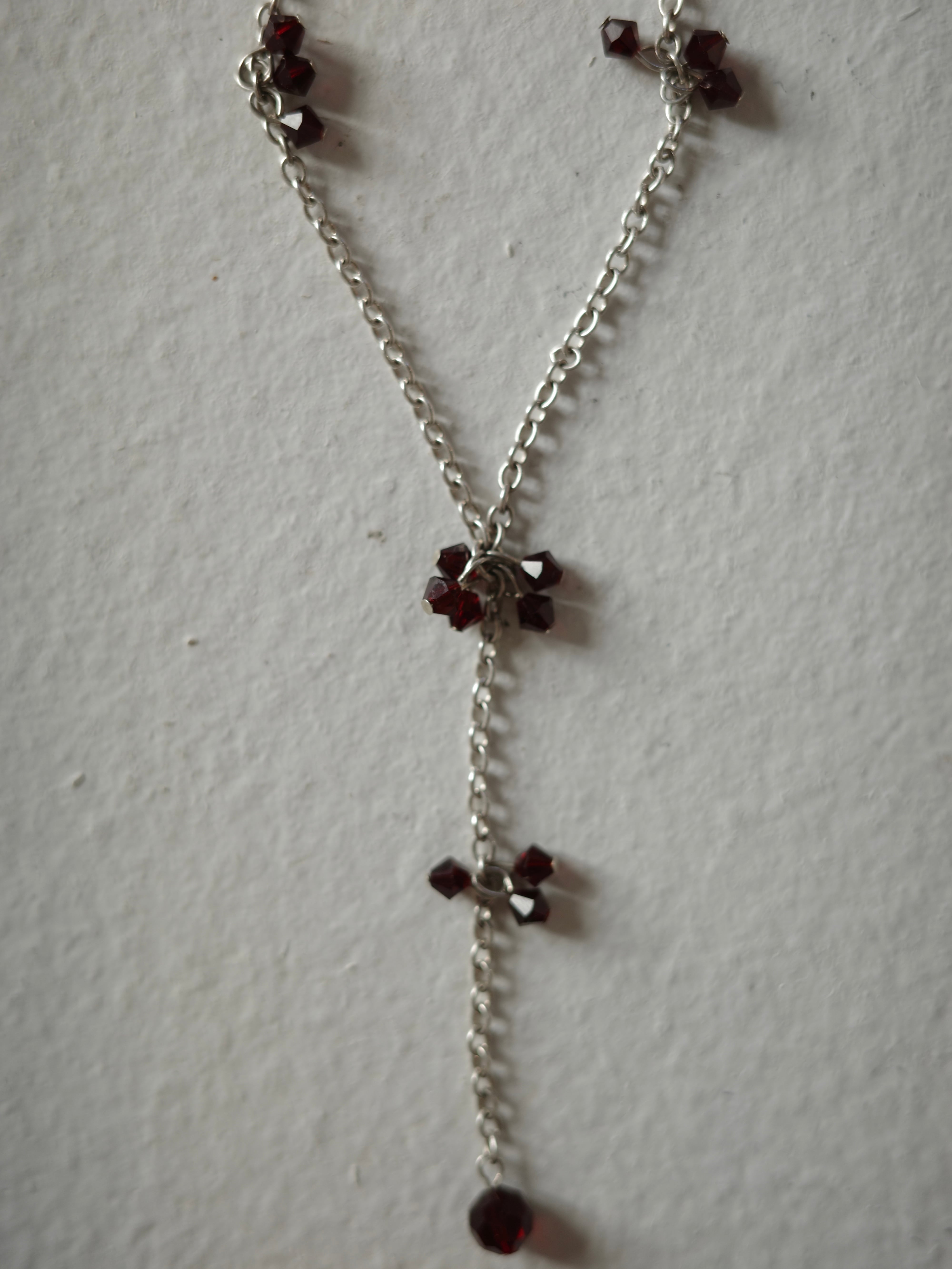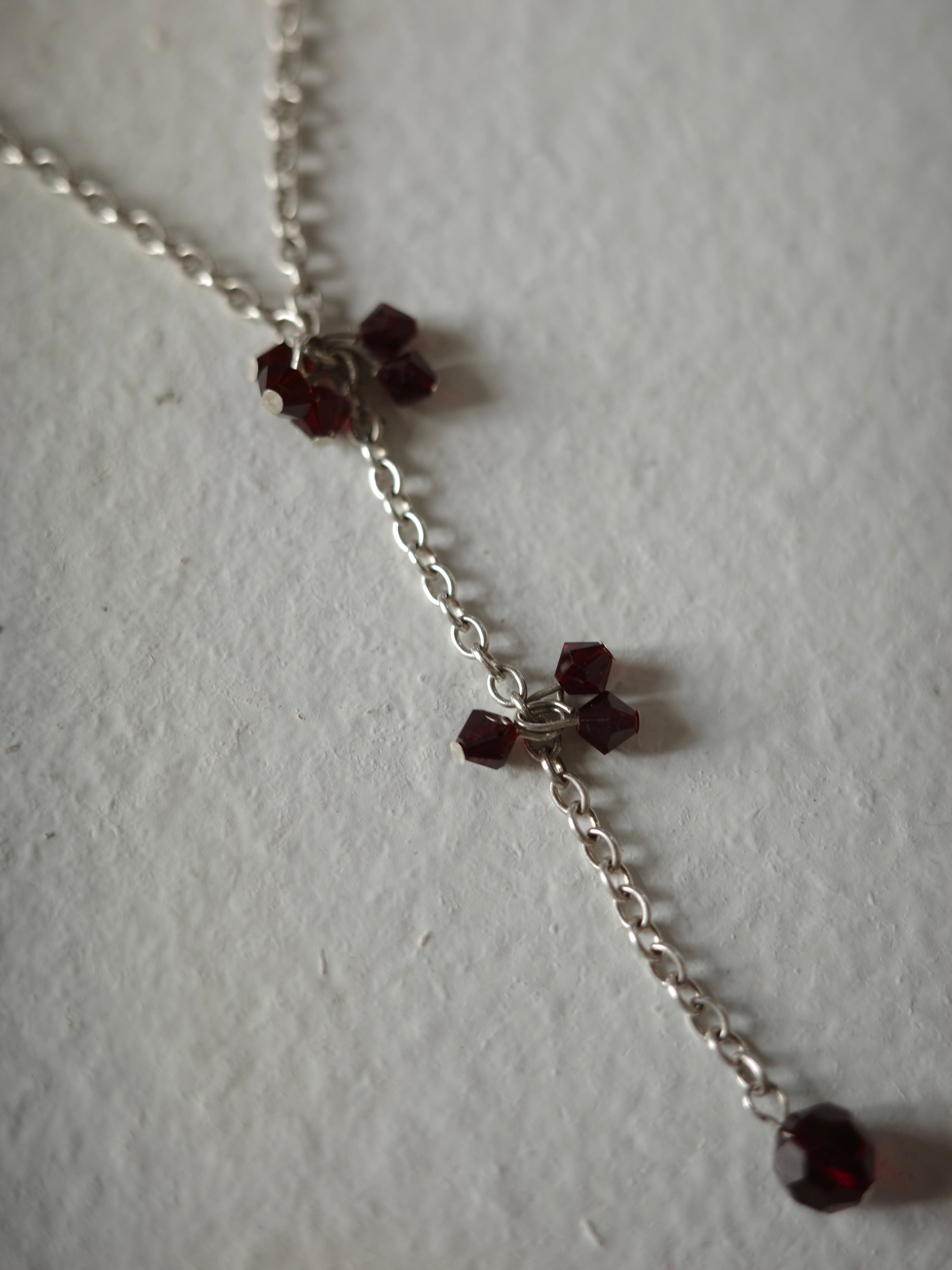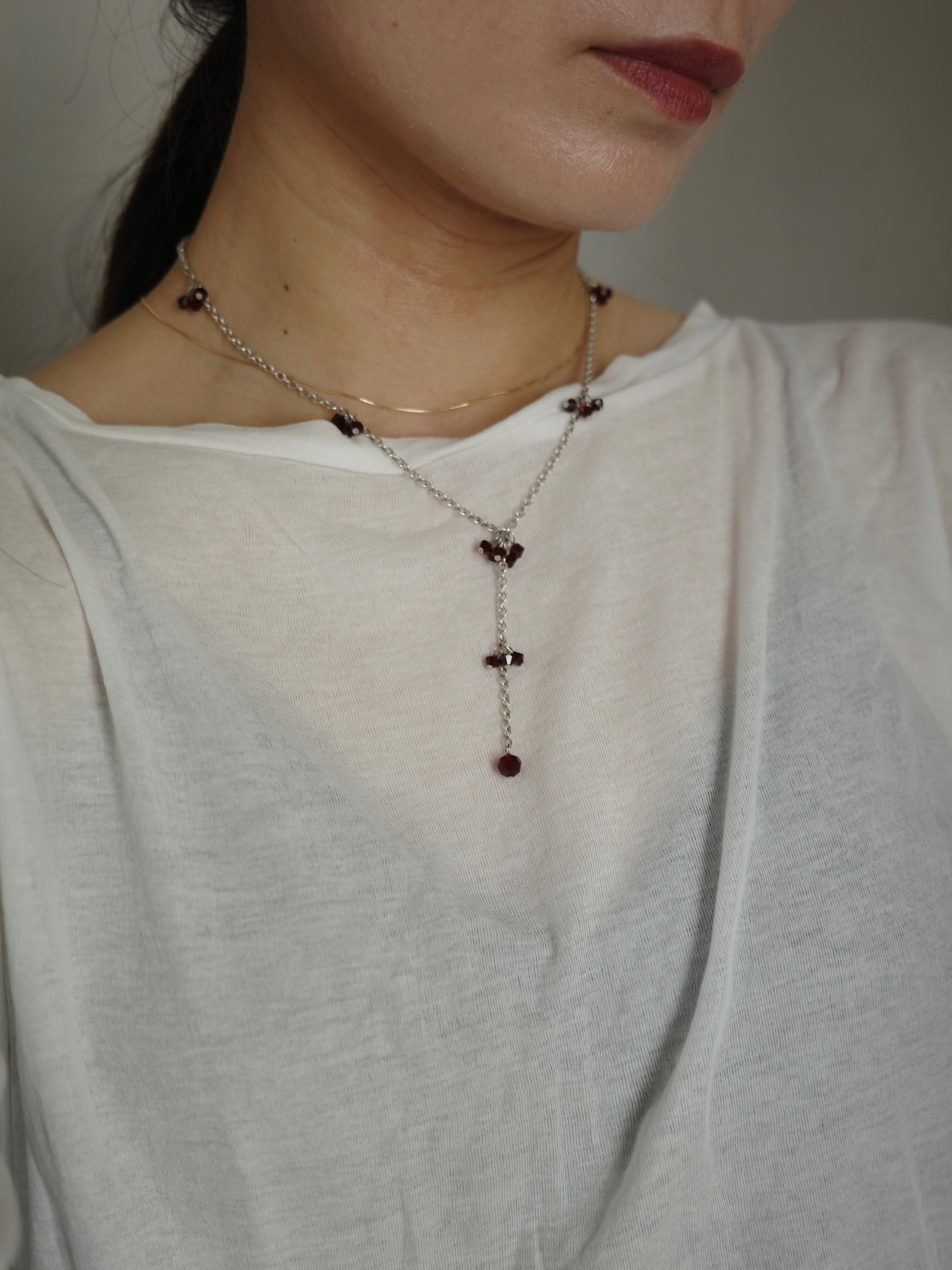 アメリカより仕入れたヴィンテージネックレスです。カジュアルなチェーンにガーネットのビーズがしゃらしゃらと揺れます。真ん中から長くチェーンが垂れたデザインで、華やかで存在感のあるアイテムです。
