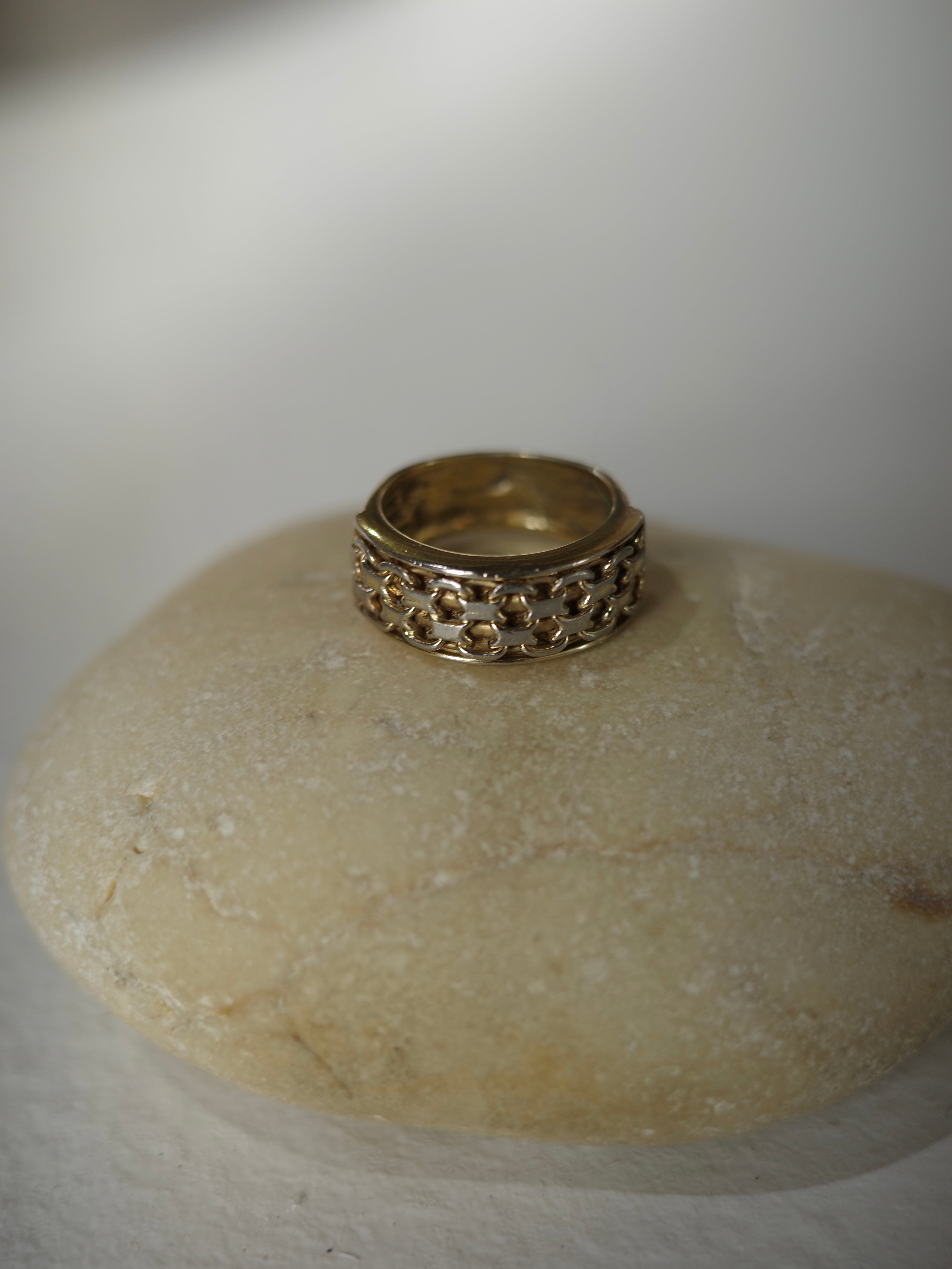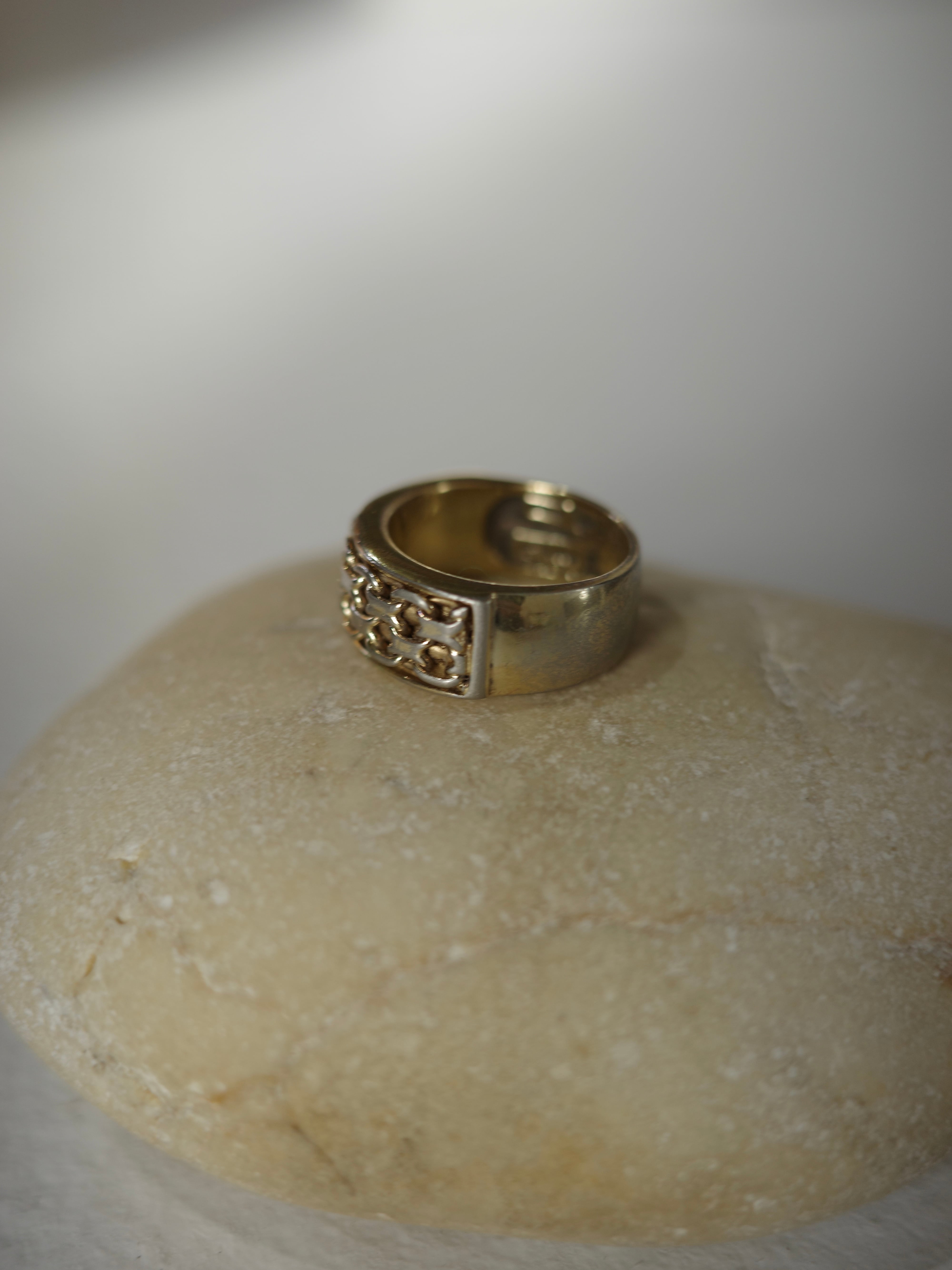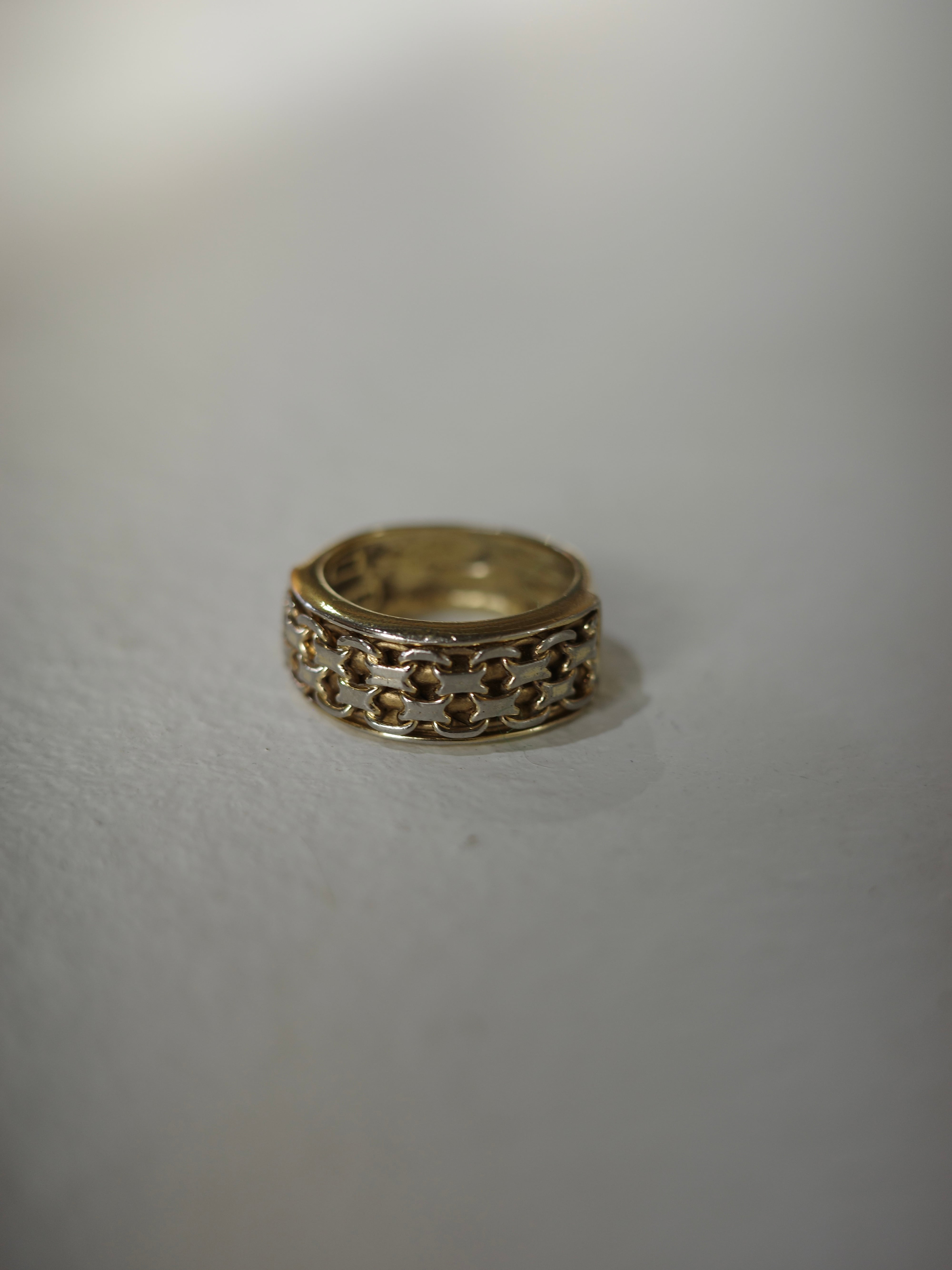 アメリカより仕入れたヴィンテージリングです。太めのゴールドリングに、前側だけチェーンのようなデザインが施されています。ボリュームがありつつもレトロで上品なデザインです。