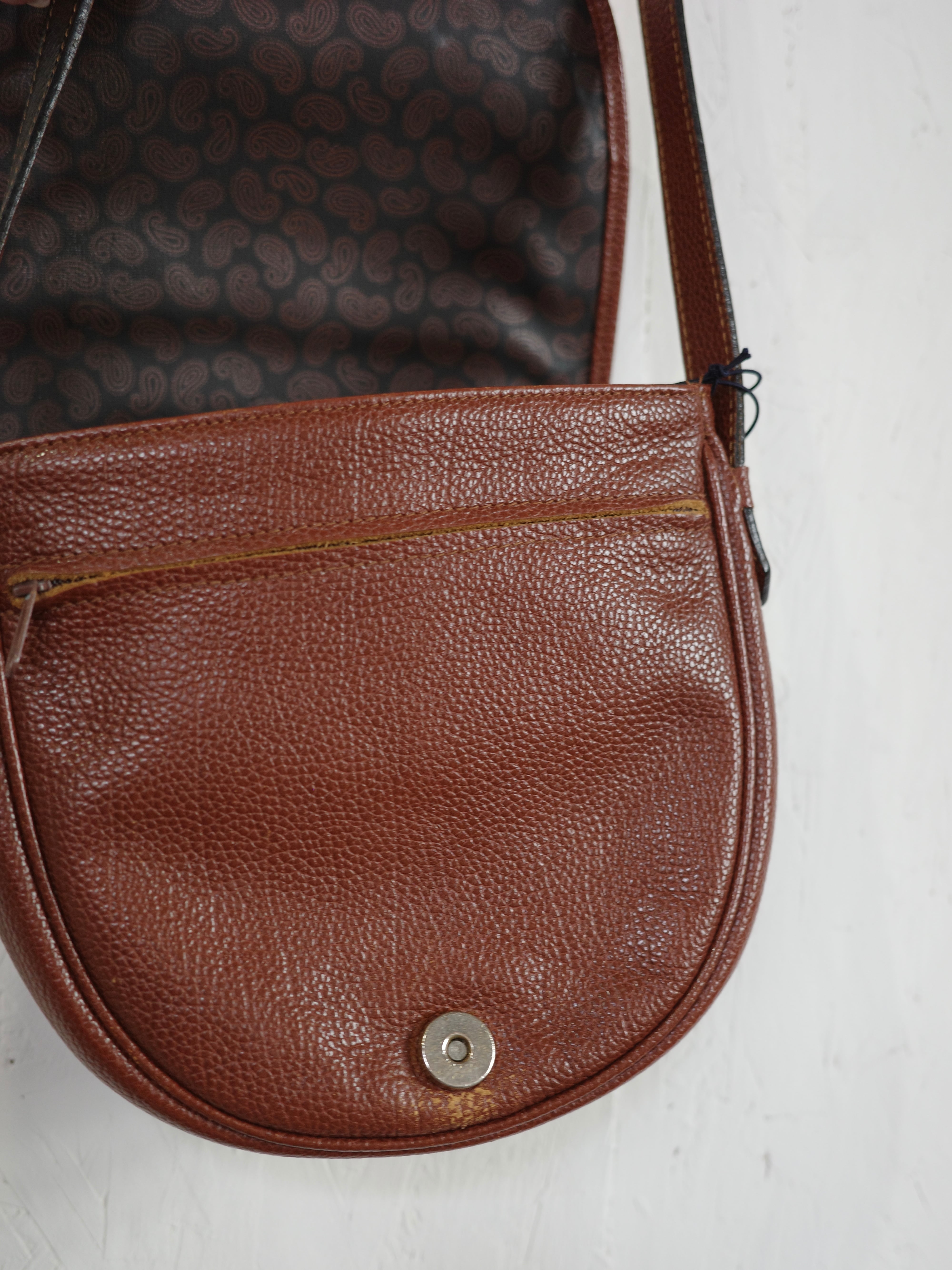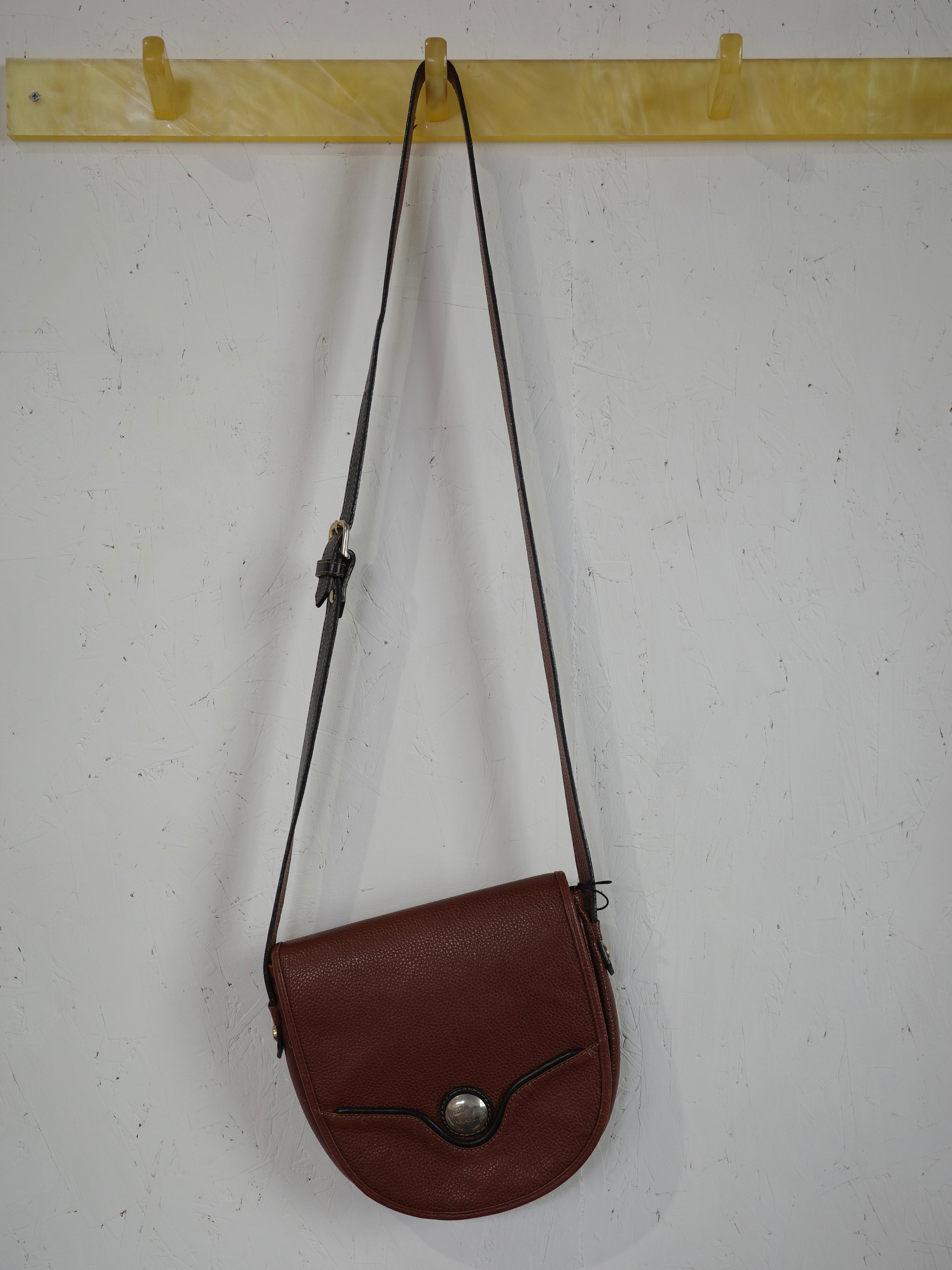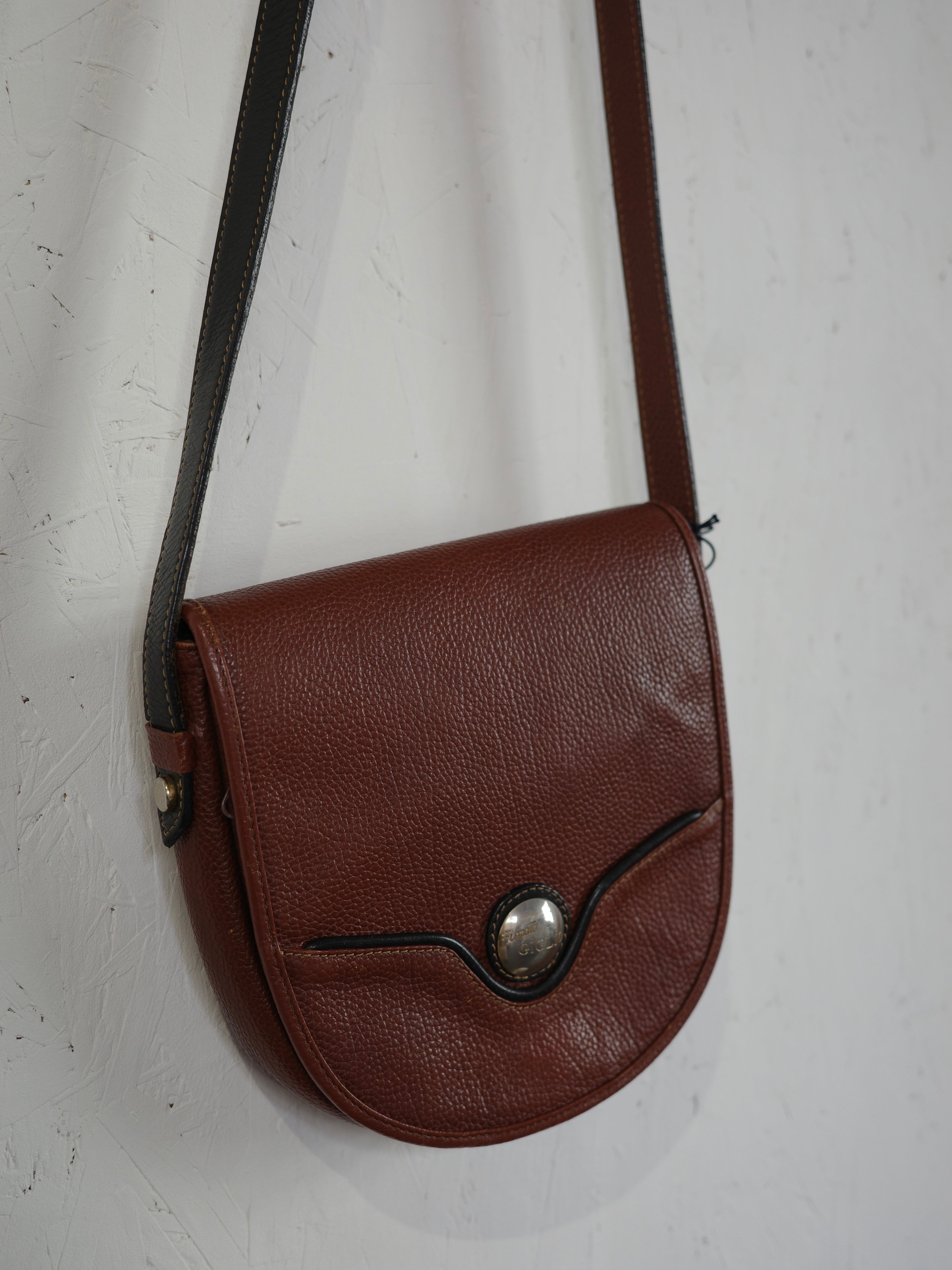 ブラウンレザーのショルダーバッグです。シルバーのコンチョのような金具がアクセントになっています。ファスナーポケットが2箇所あり最低限の貴重品などは入る、使いやすいサイズ感のポシェット。ショルダー部分はブラックでツートーンになっているところも可愛く、長さ調節も可能です。