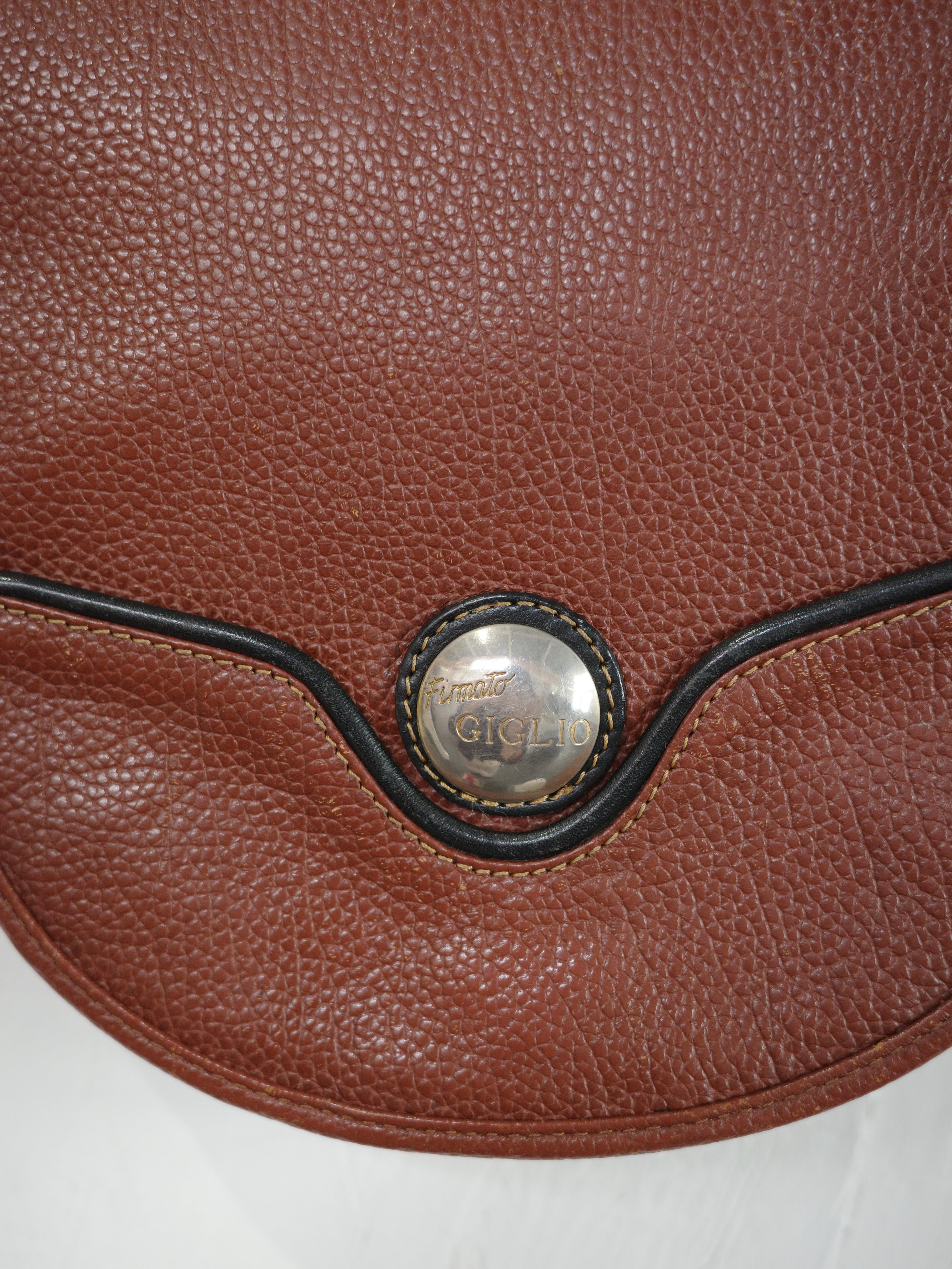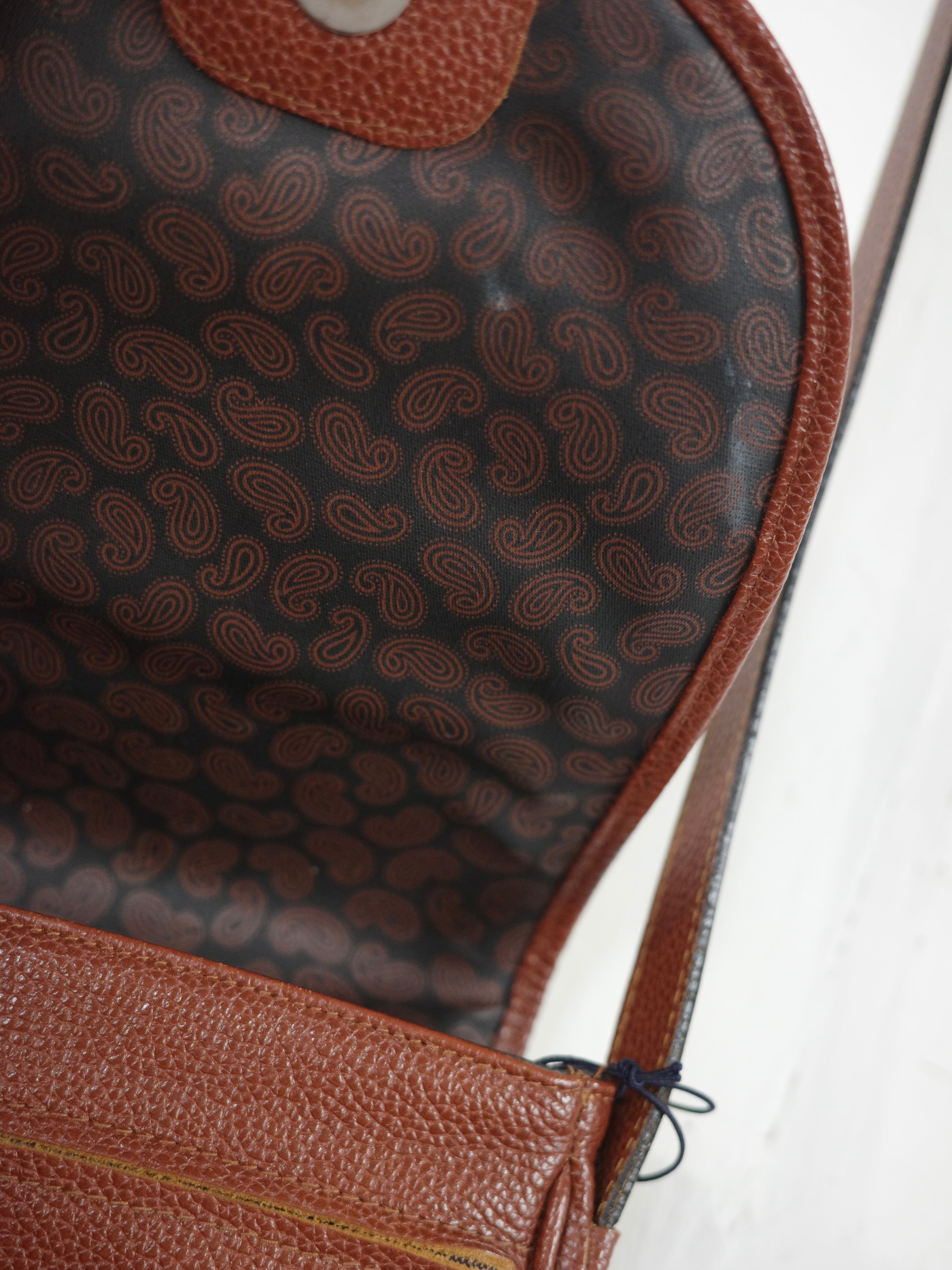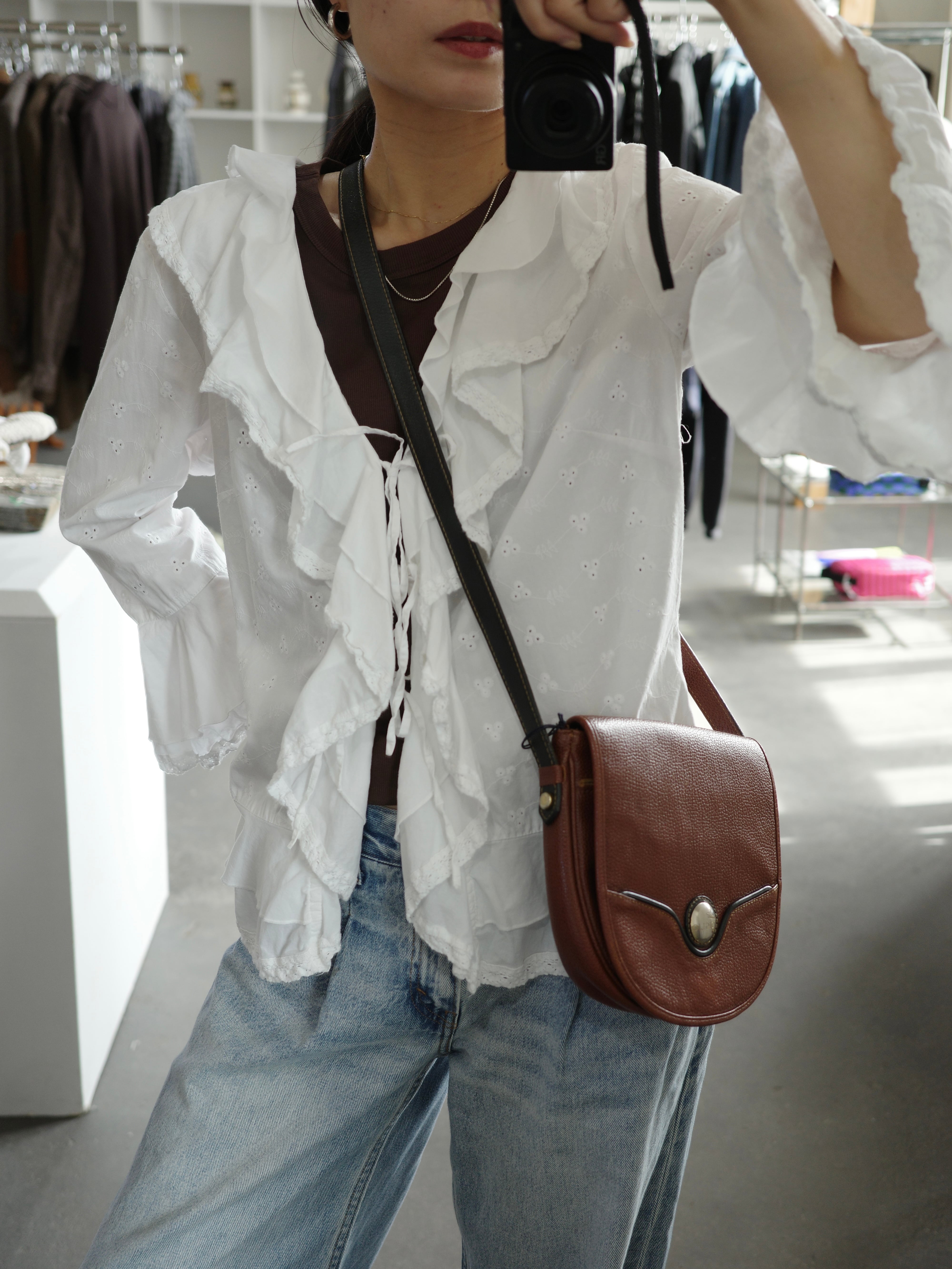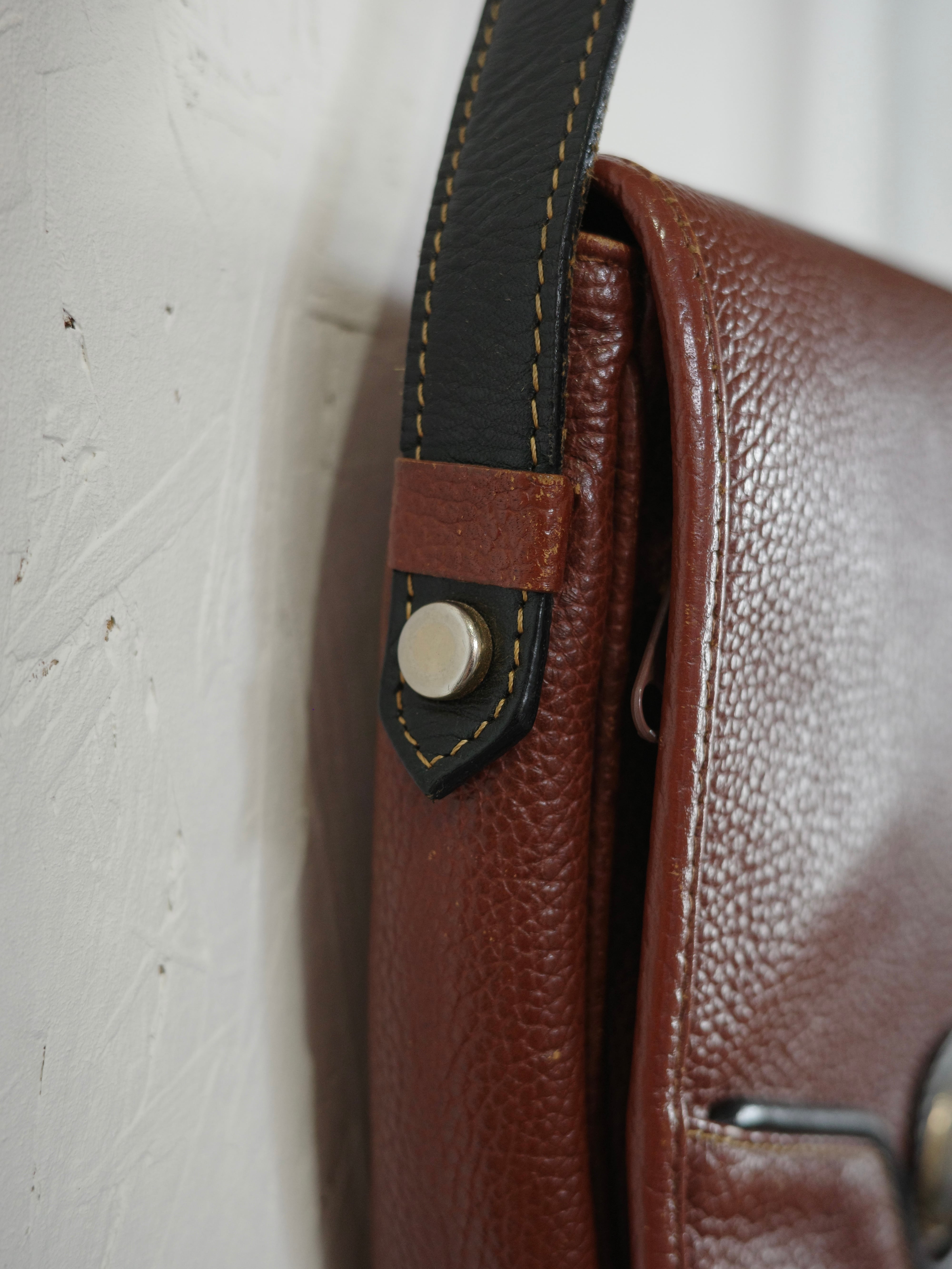 ブラウンレザーのショルダーバッグです。シルバーのコンチョのような金具がアクセントになっています。ファスナーポケットが2箇所あり最低限の貴重品などは入る、使いやすいサイズ感のポシェット。ショルダー部分はブラックでツートーンになっているところも可愛く、長さ調節も可能です。