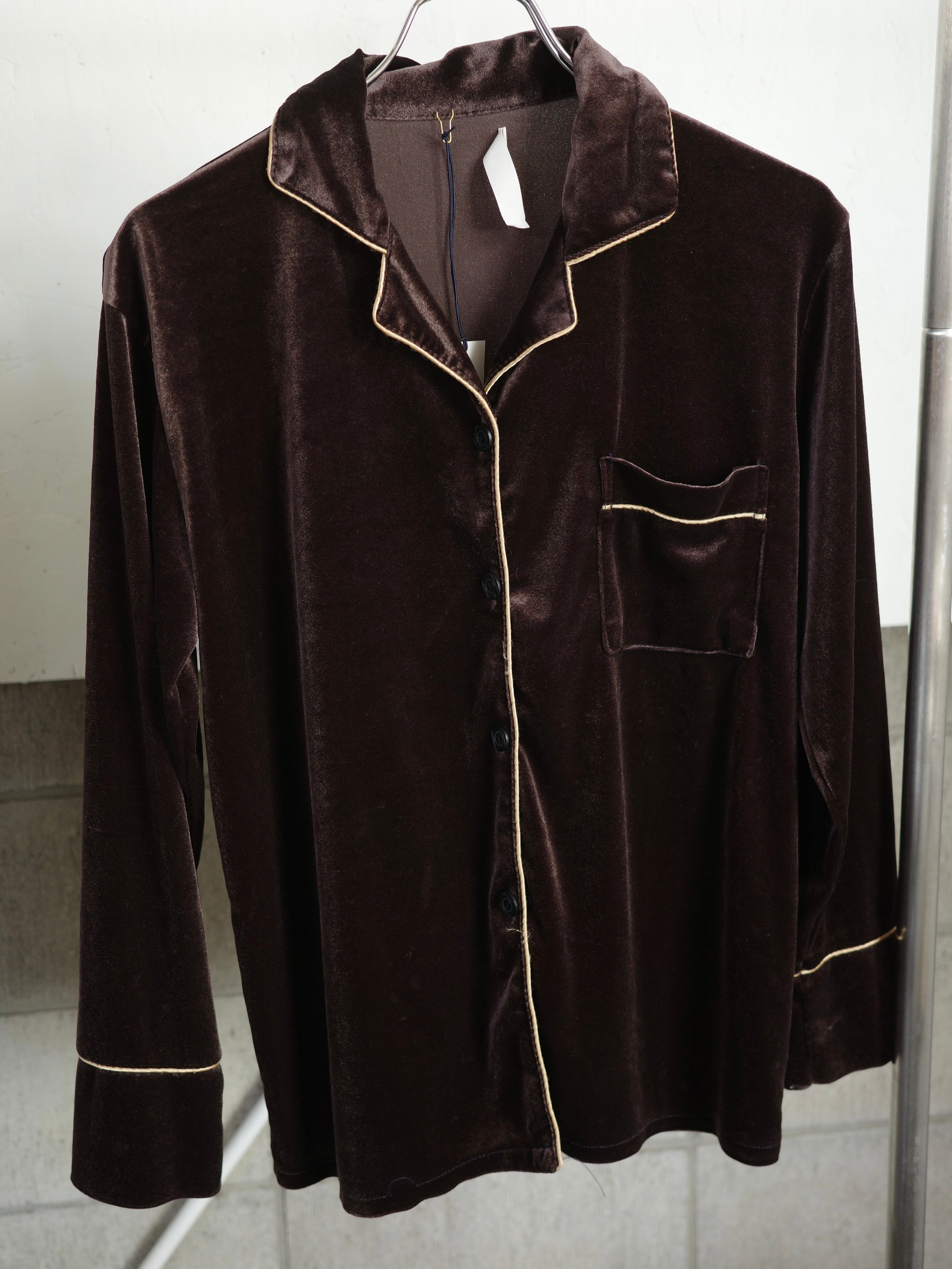 ベロアのパジャマ風シャツです。こっくりブラウンにゴールドのパイピングがアクセントになっています。ゆったりめのシルエットなので、前を開けて羽織としても、閉じてトップスとしても着用いただけます。