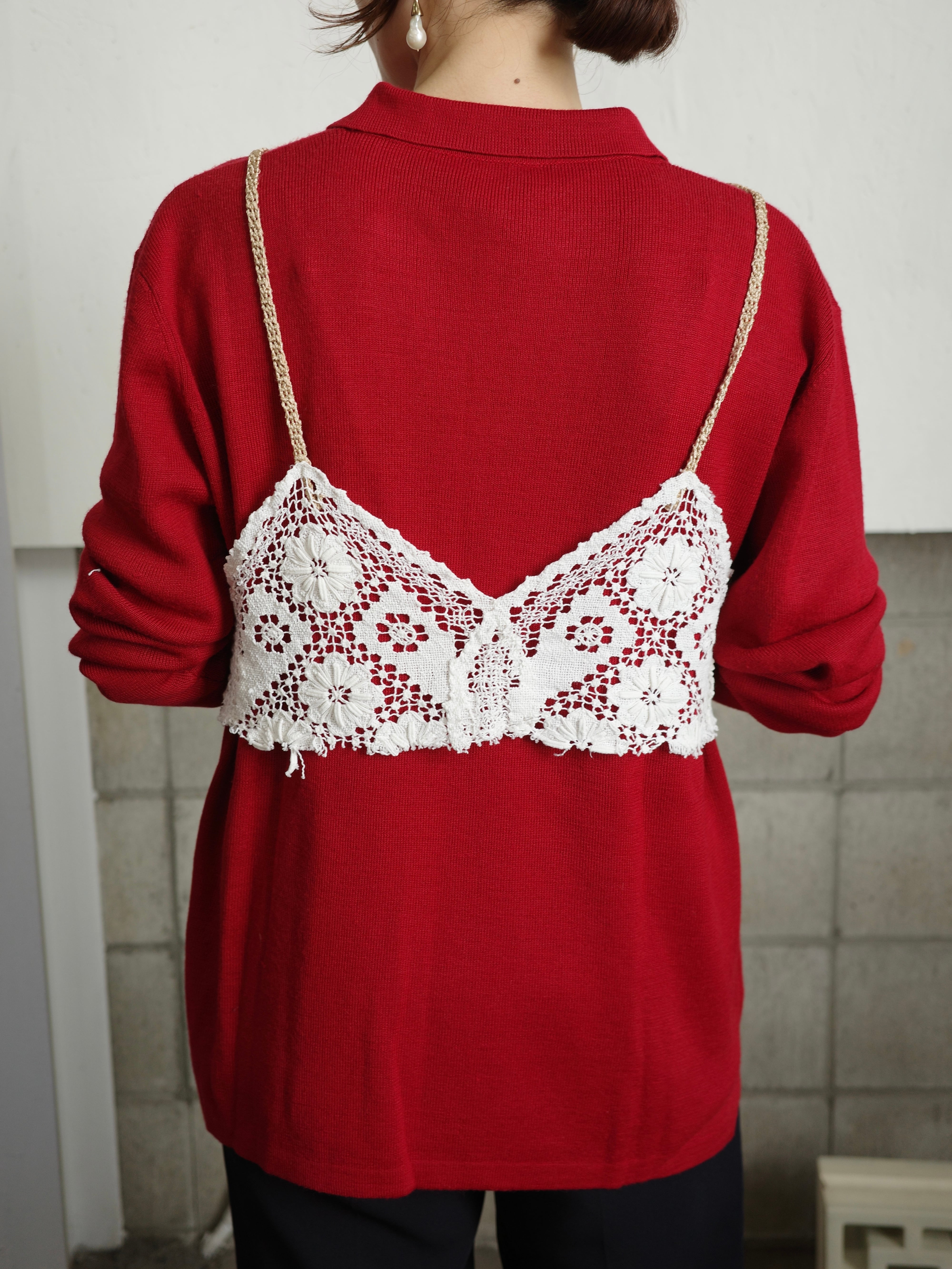 ヴィンテージのレースをリメイクしたビスチェです。ざっくりとしたクロシェ編みが風合いのあるアイテムで、前後で異なるデザインになっているので、気分やコーディネートに合わせて前後ろ反対で着用いただくことも可能です。