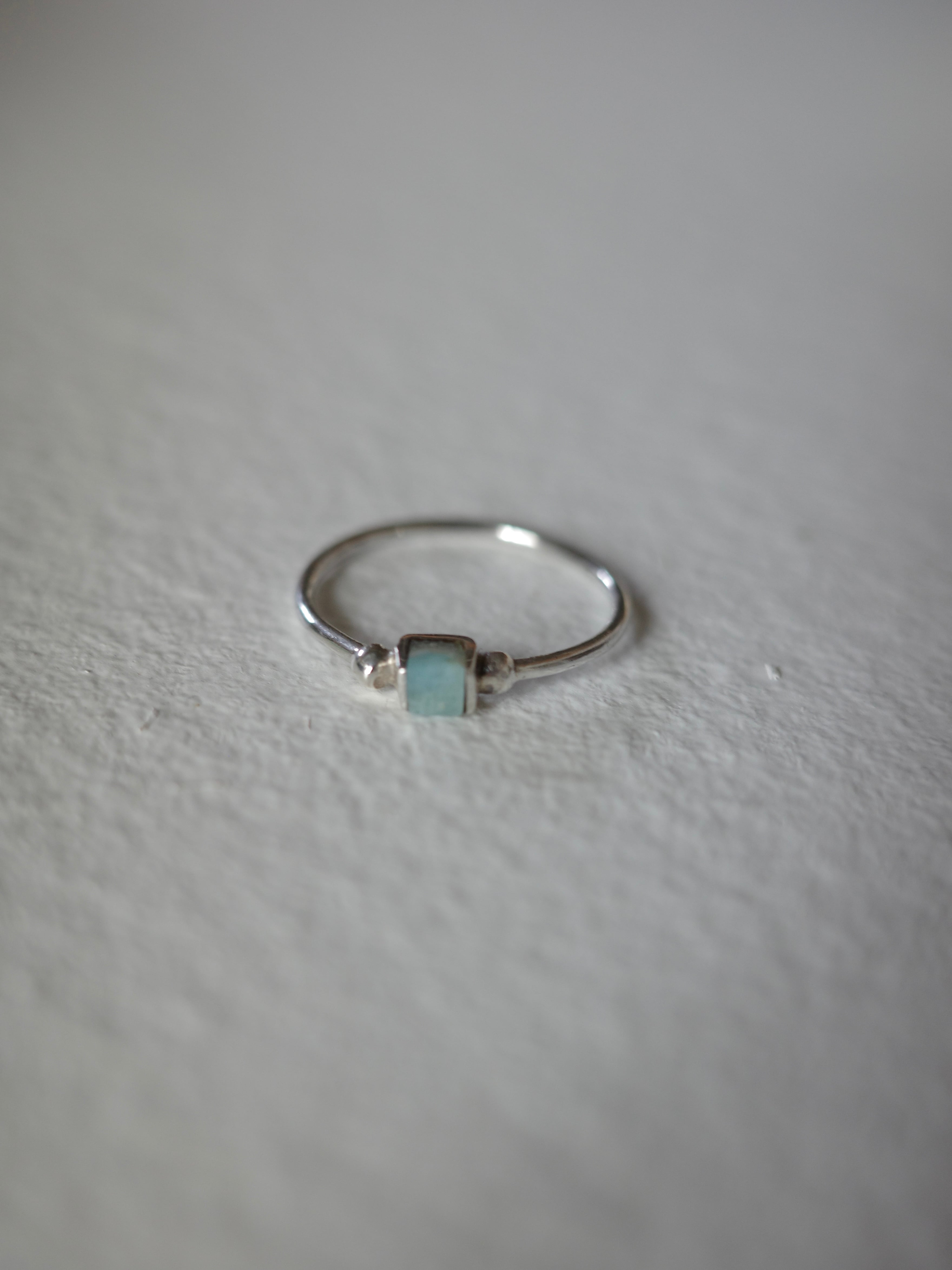 アメリカより仕入れたヴィンテージリングです。華奢なリングに、スクエア型の小さなラリマーの石が施されています。単体でシンプルに着用しても、他のリングと重ね付けするのもお勧めです。