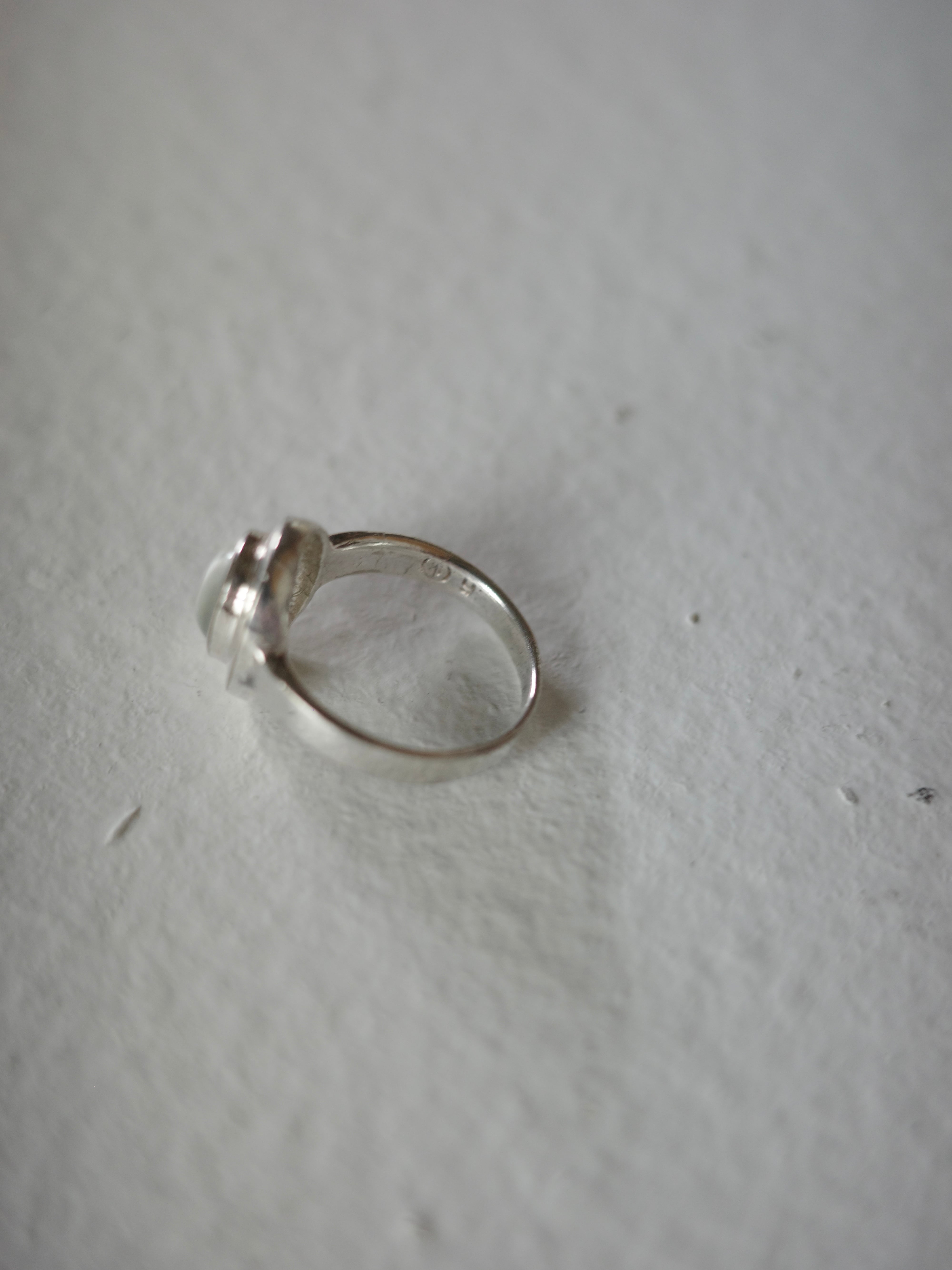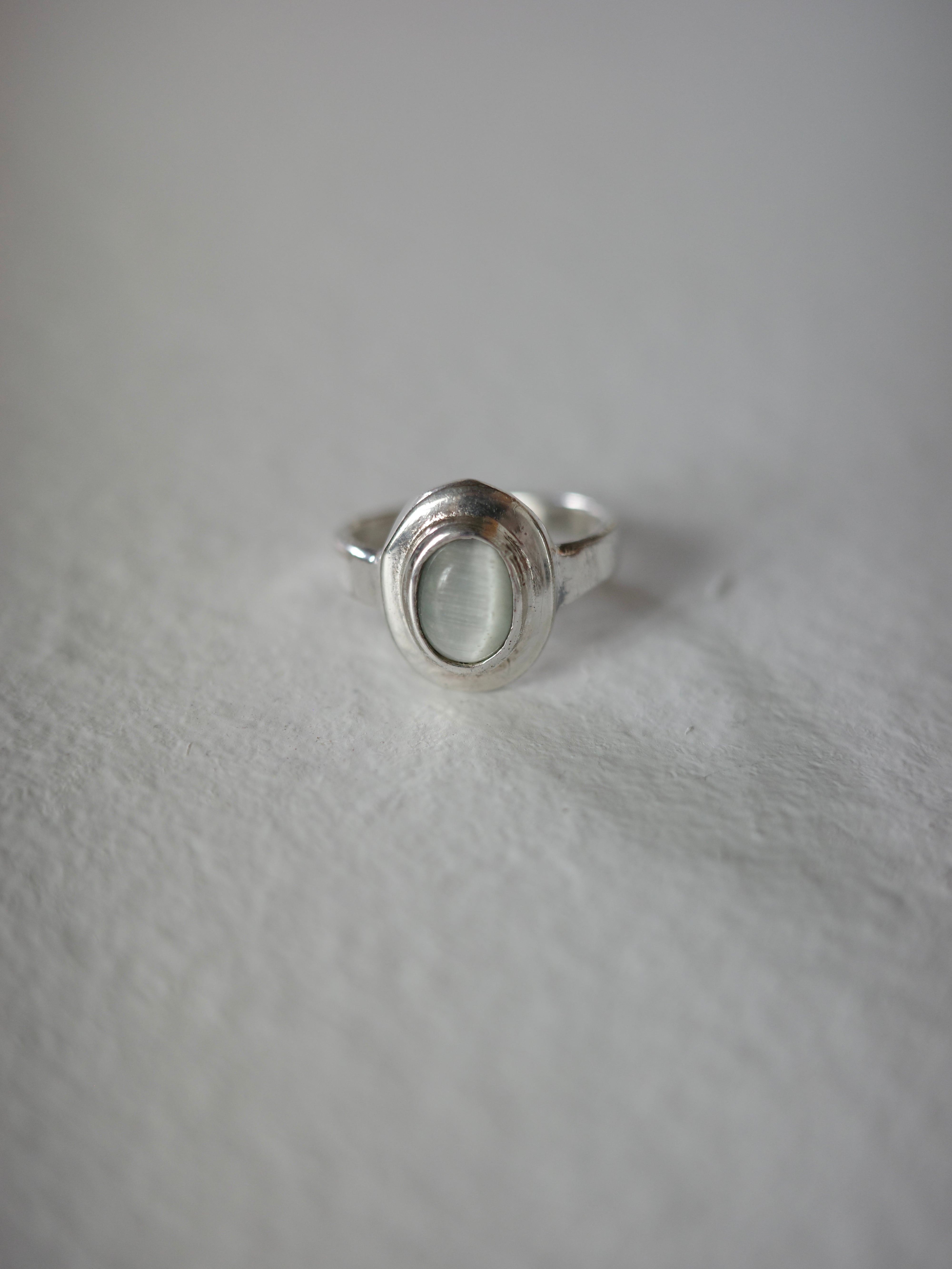 アメリカより仕入れたヴィンテージリングです。オーバル型のホワイトキャッツアイという白い石が埋め込まれています。