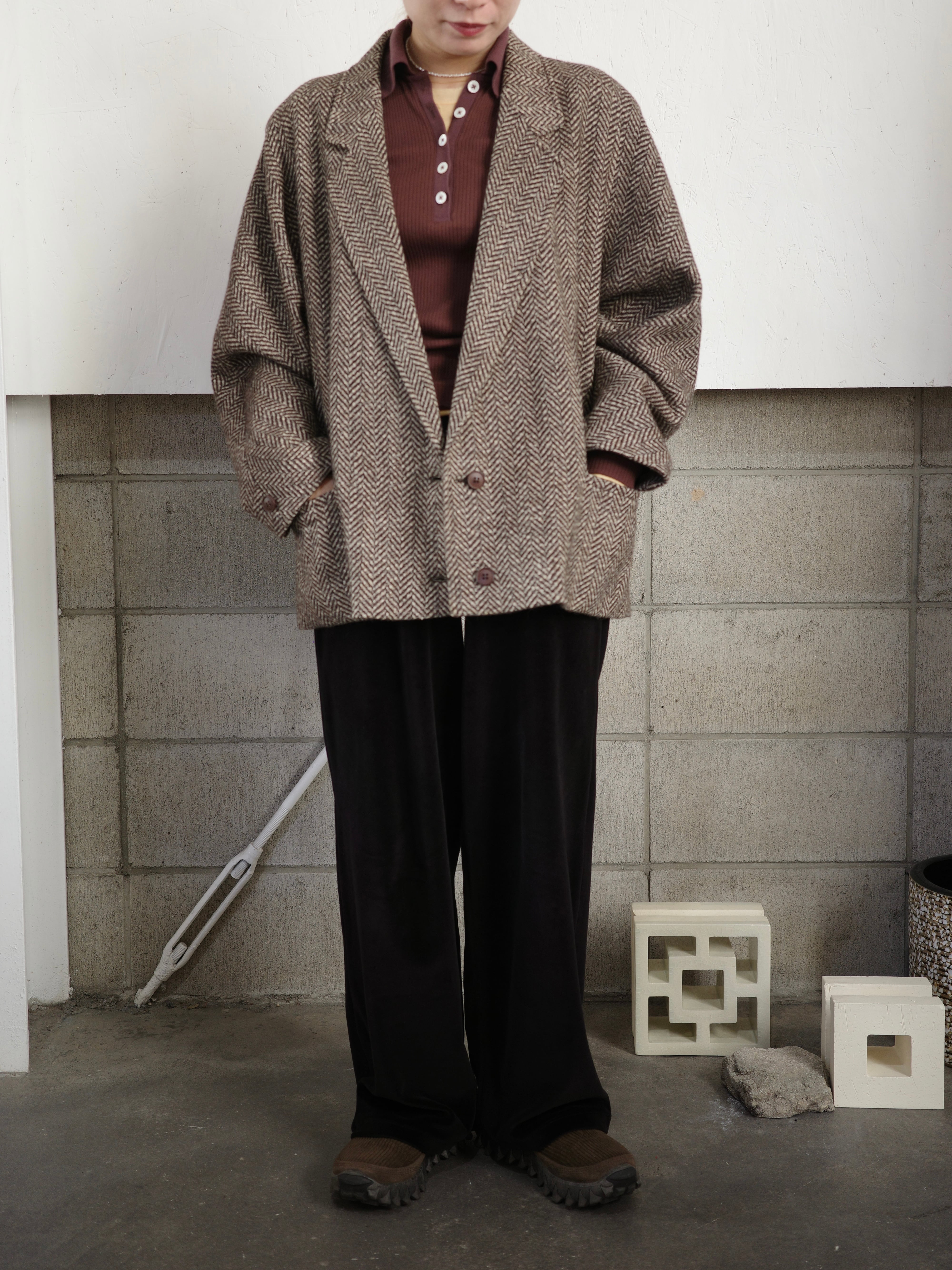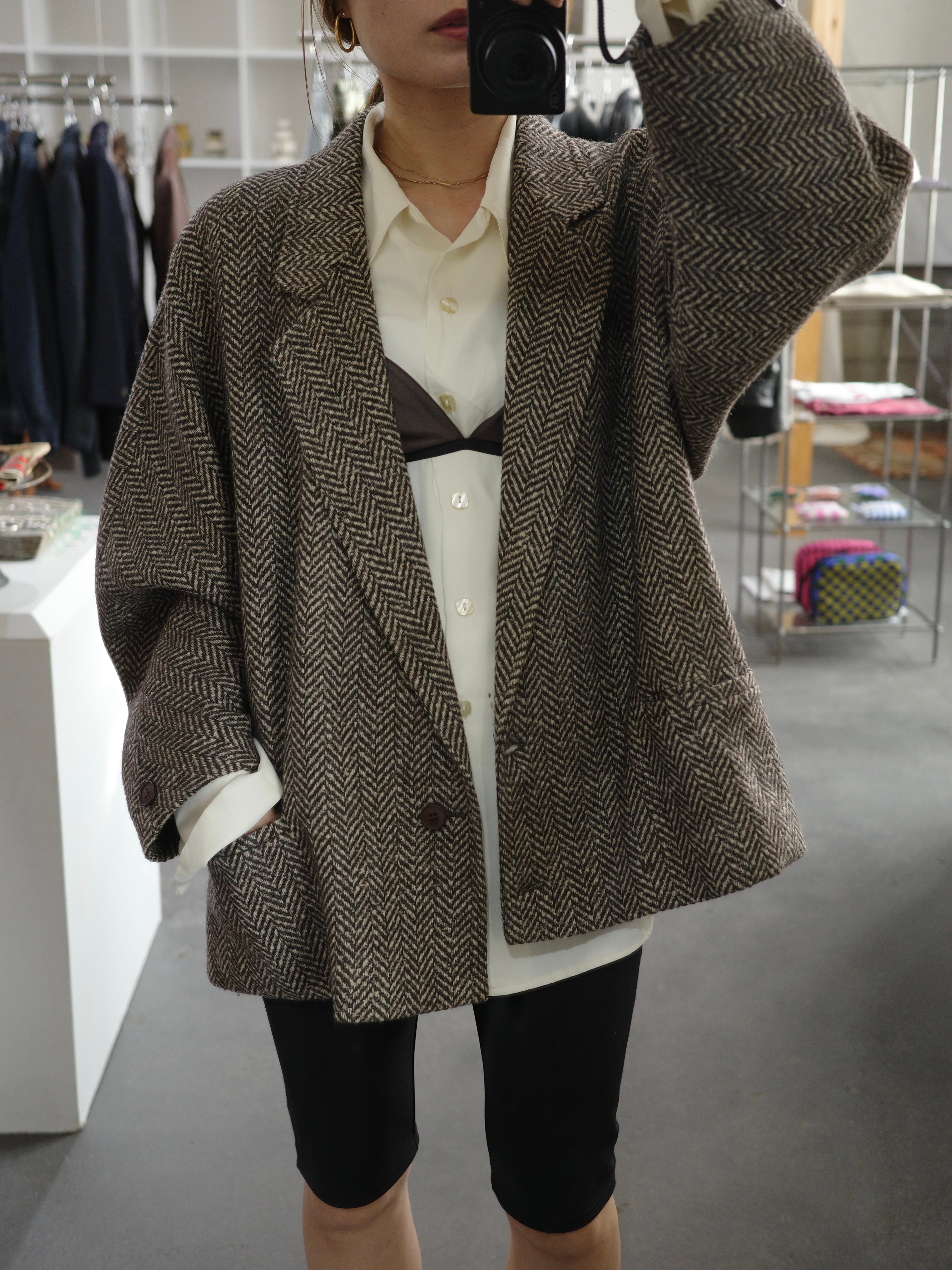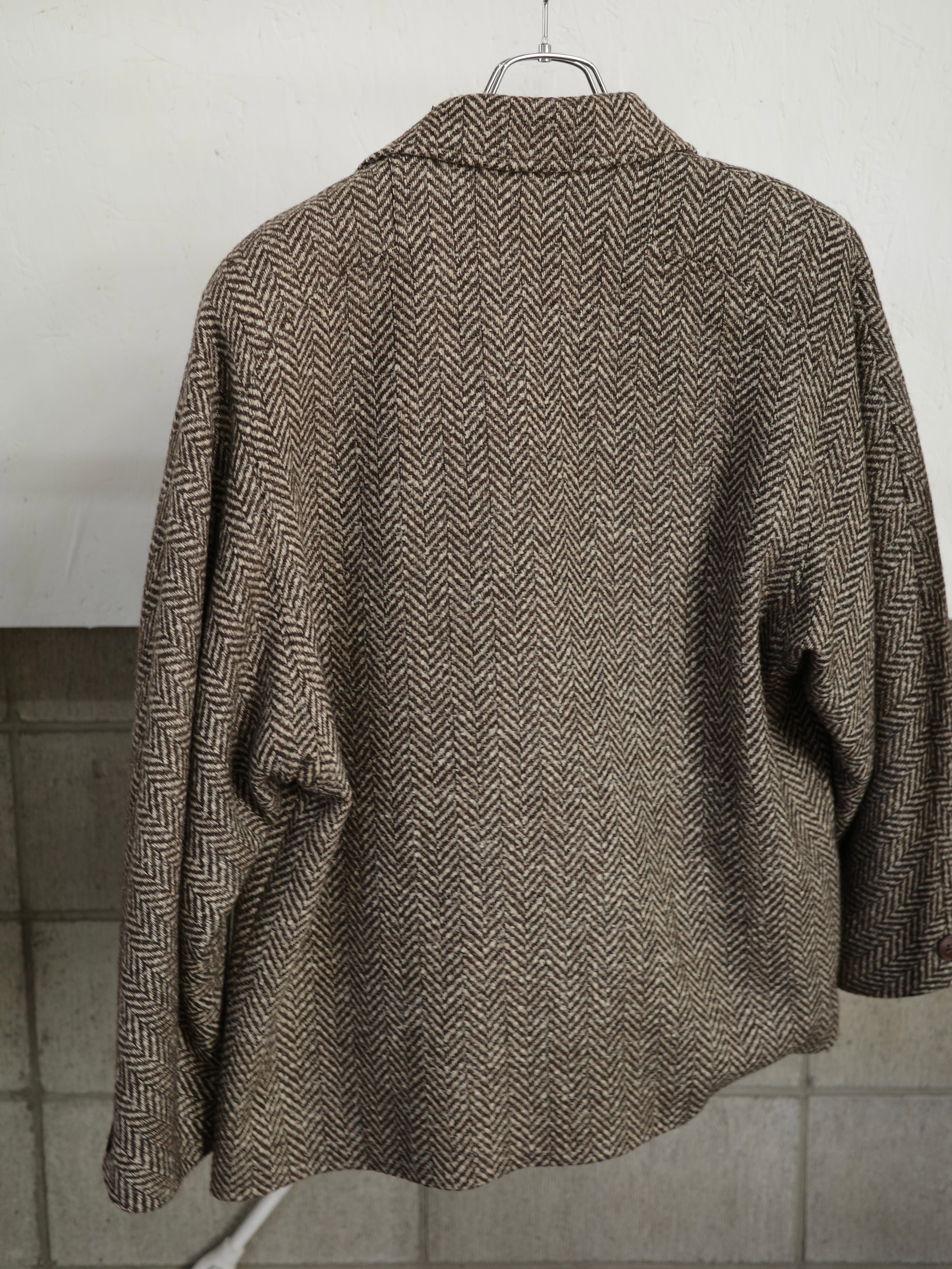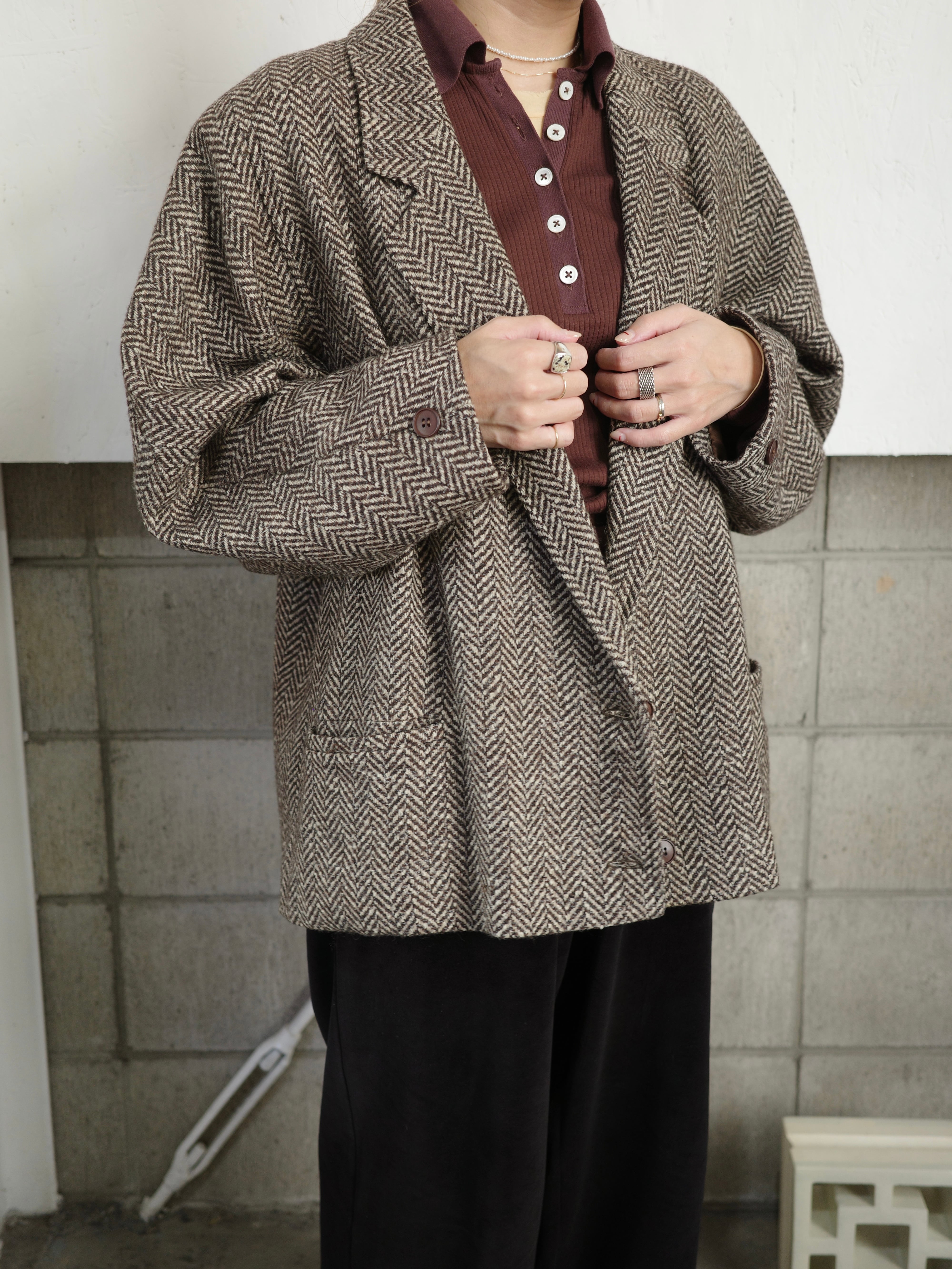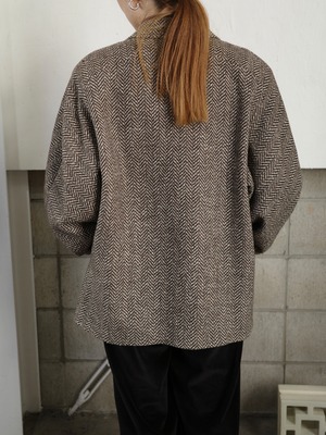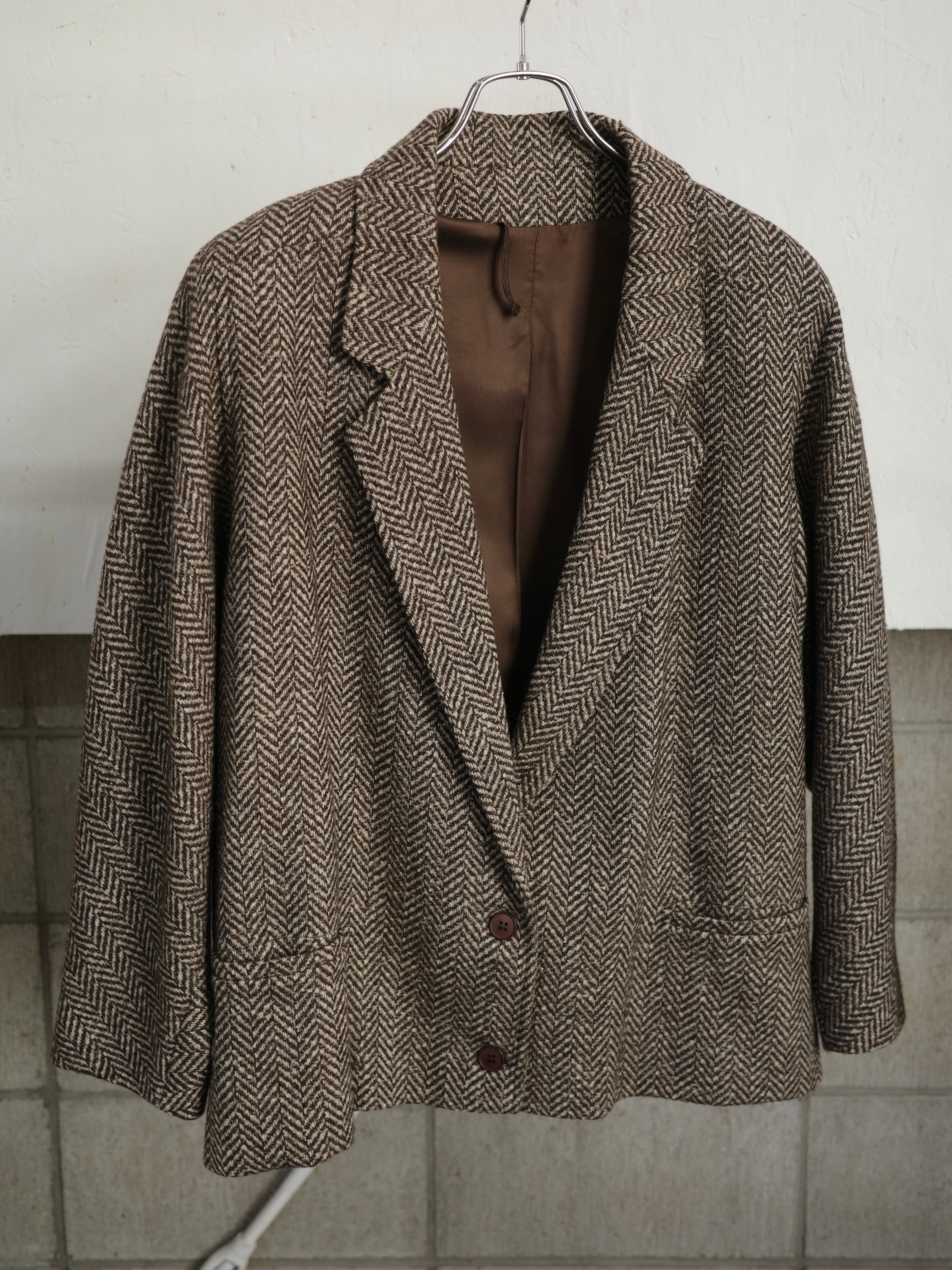 ブラウンのヘリンボーン生地の、80年代イタリア製ジャケットです。裾も袖も丸みのあるシルエットが可愛らしく、肩も切り替えがないので、普通のジャケットよりかっちりしすぎずラフに着ていただけます。アームホールが大きいので、中に厚手のニットも着込みやすいです。
