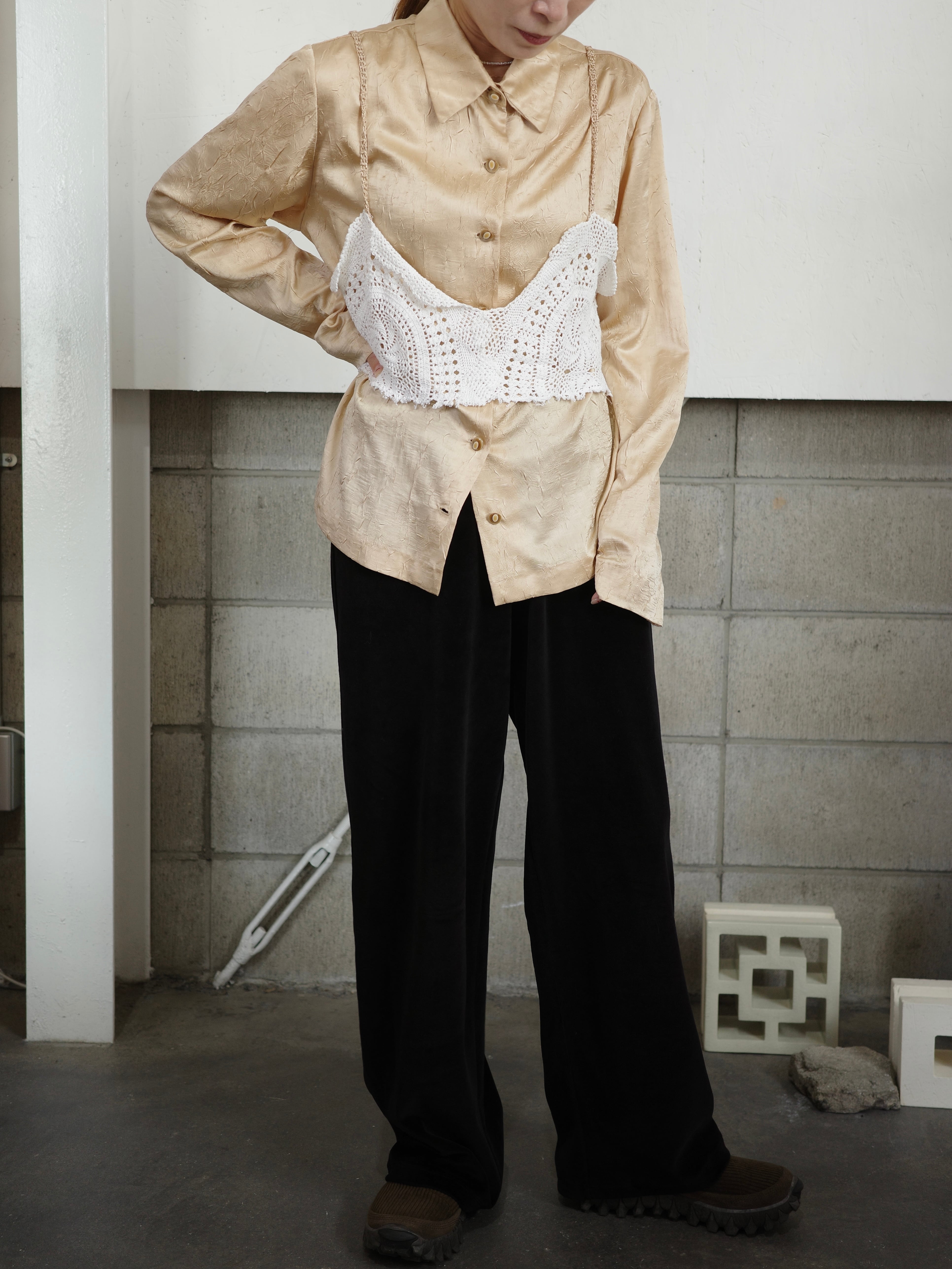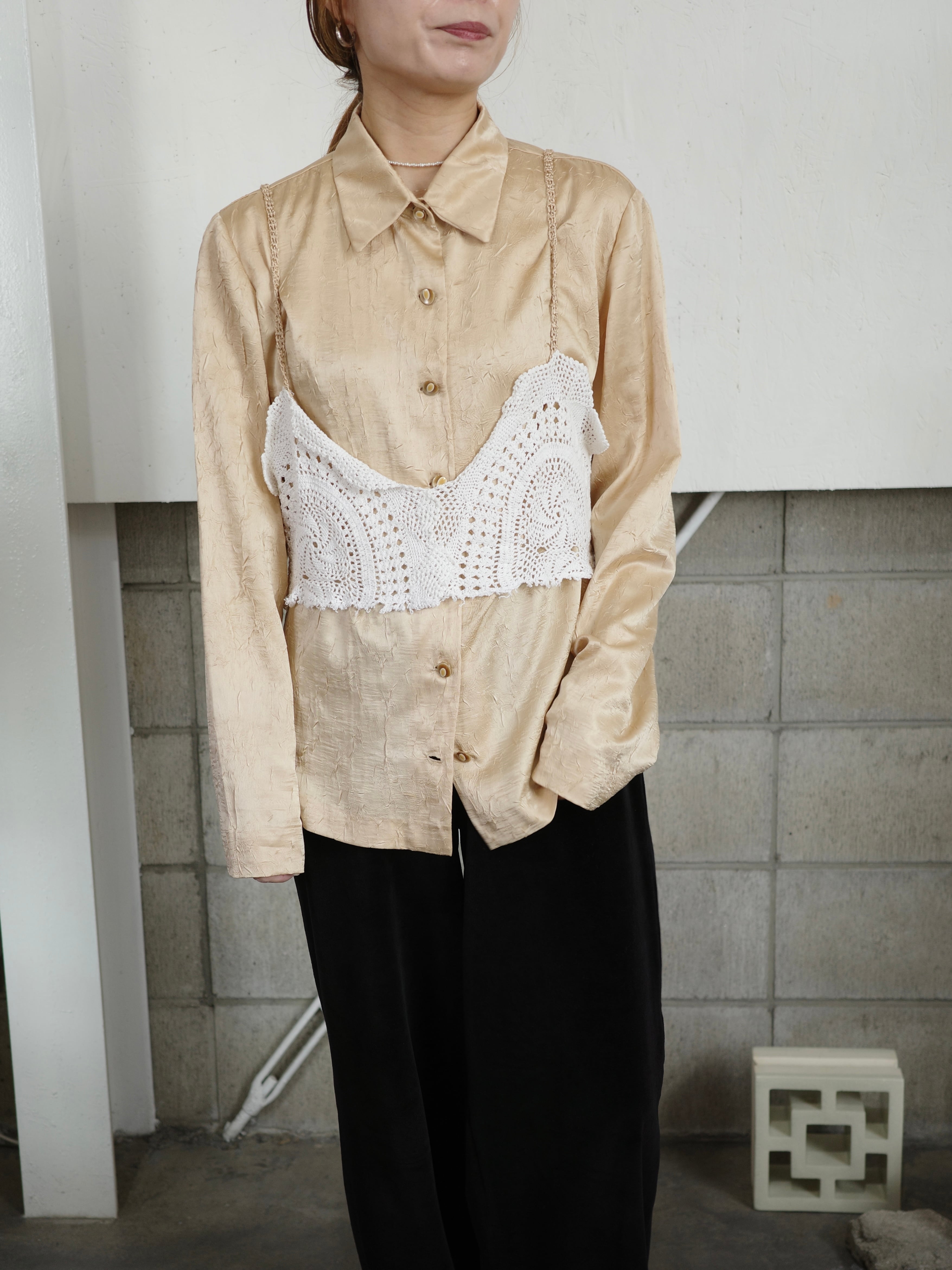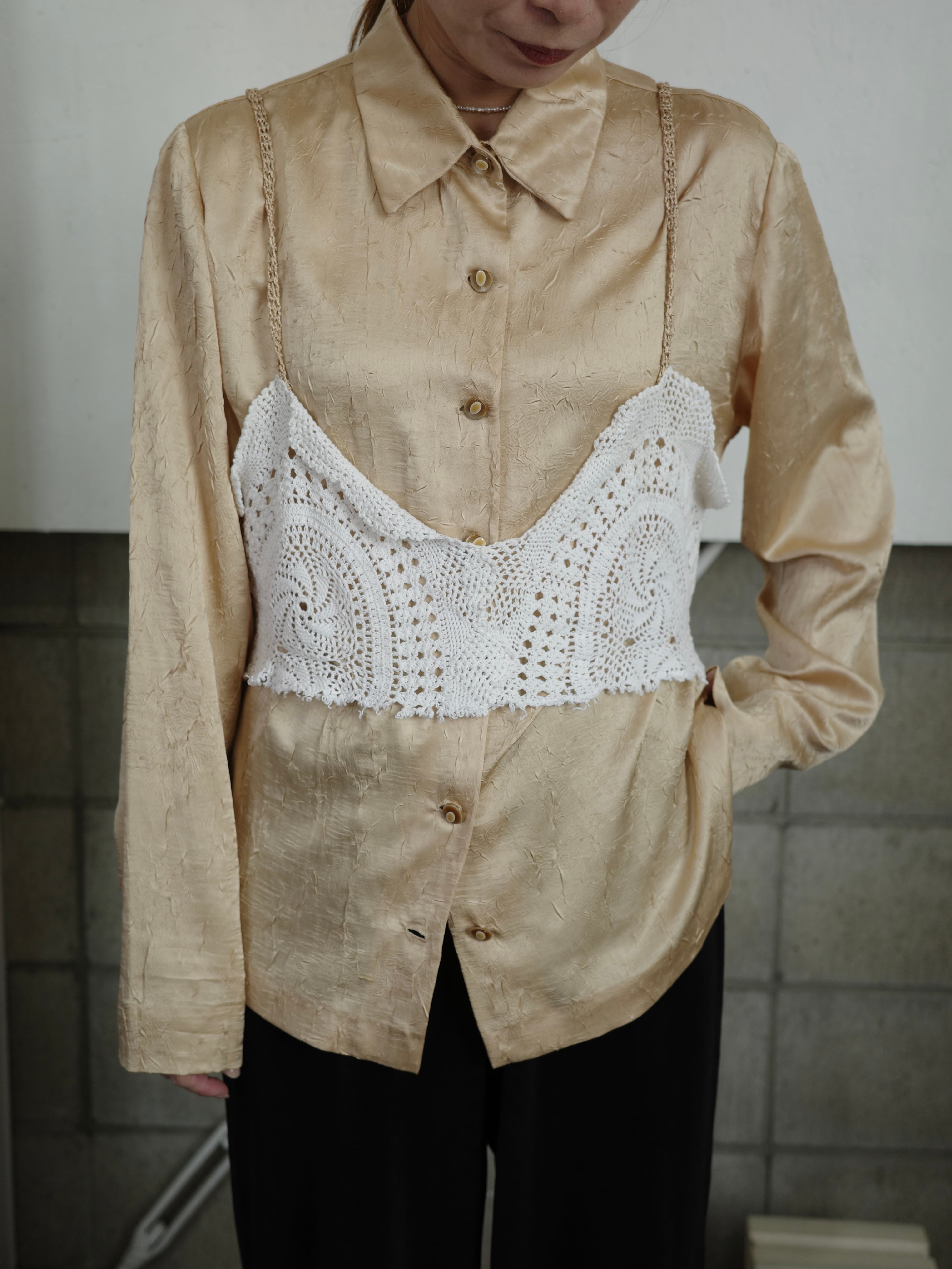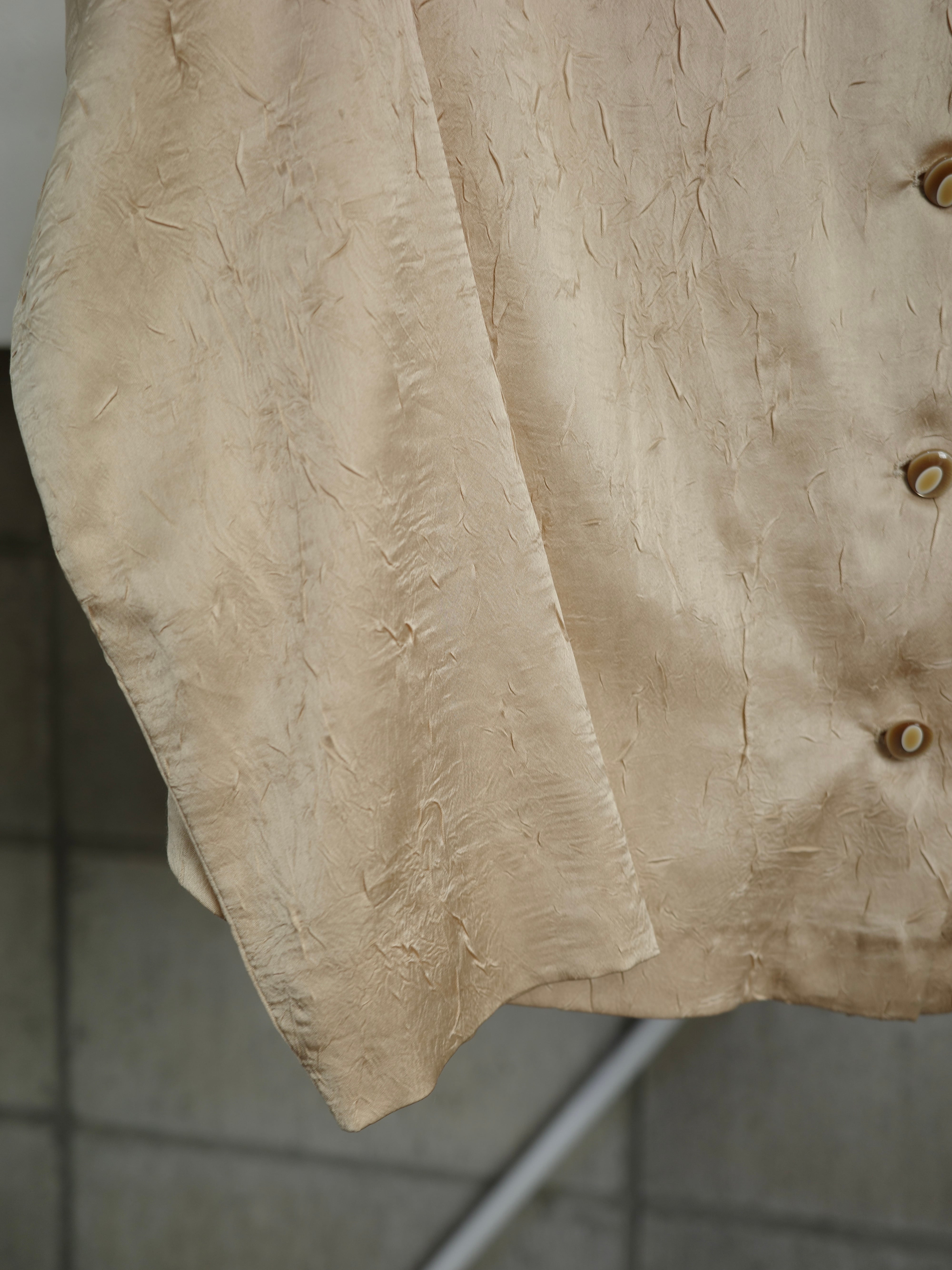 しわ加工の入った光沢感のあるシャツです。シャンパンゴールドの艶やかな色味が上品で、レトロなデザインが素敵です。一枚でも重ね着をしても使える、着回しの効く形とサイズ感です。