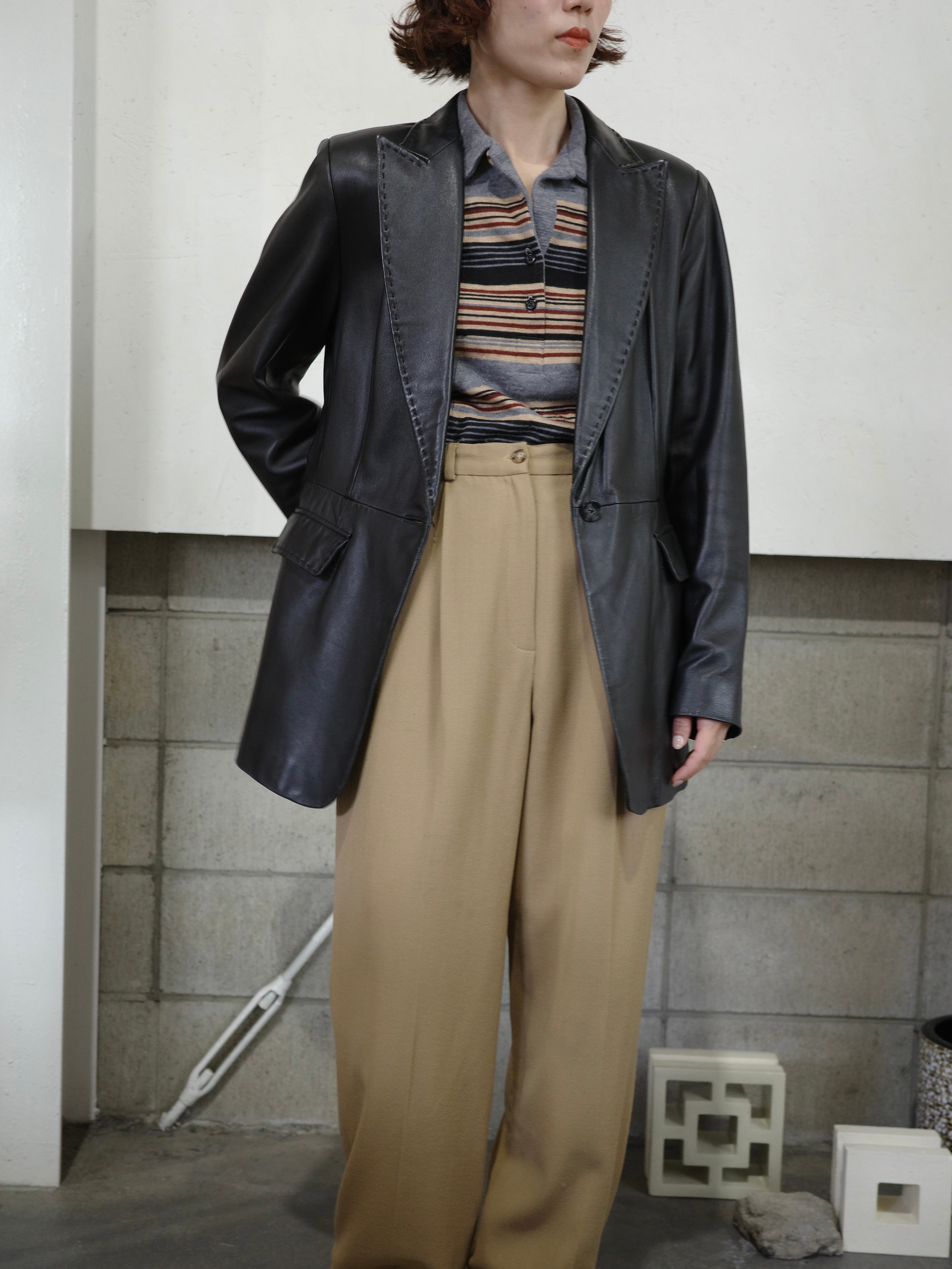 90年代のリアルレザーのジャケットです。とっても柔らかく滑らかなレザーの質感で、襟とポケットのステッチデザインがアクセントになっています。ウエスト切り替えで女性らしいシルエットになっているので、レザーでもイカつくならずジャケット感覚で着ていただけます。