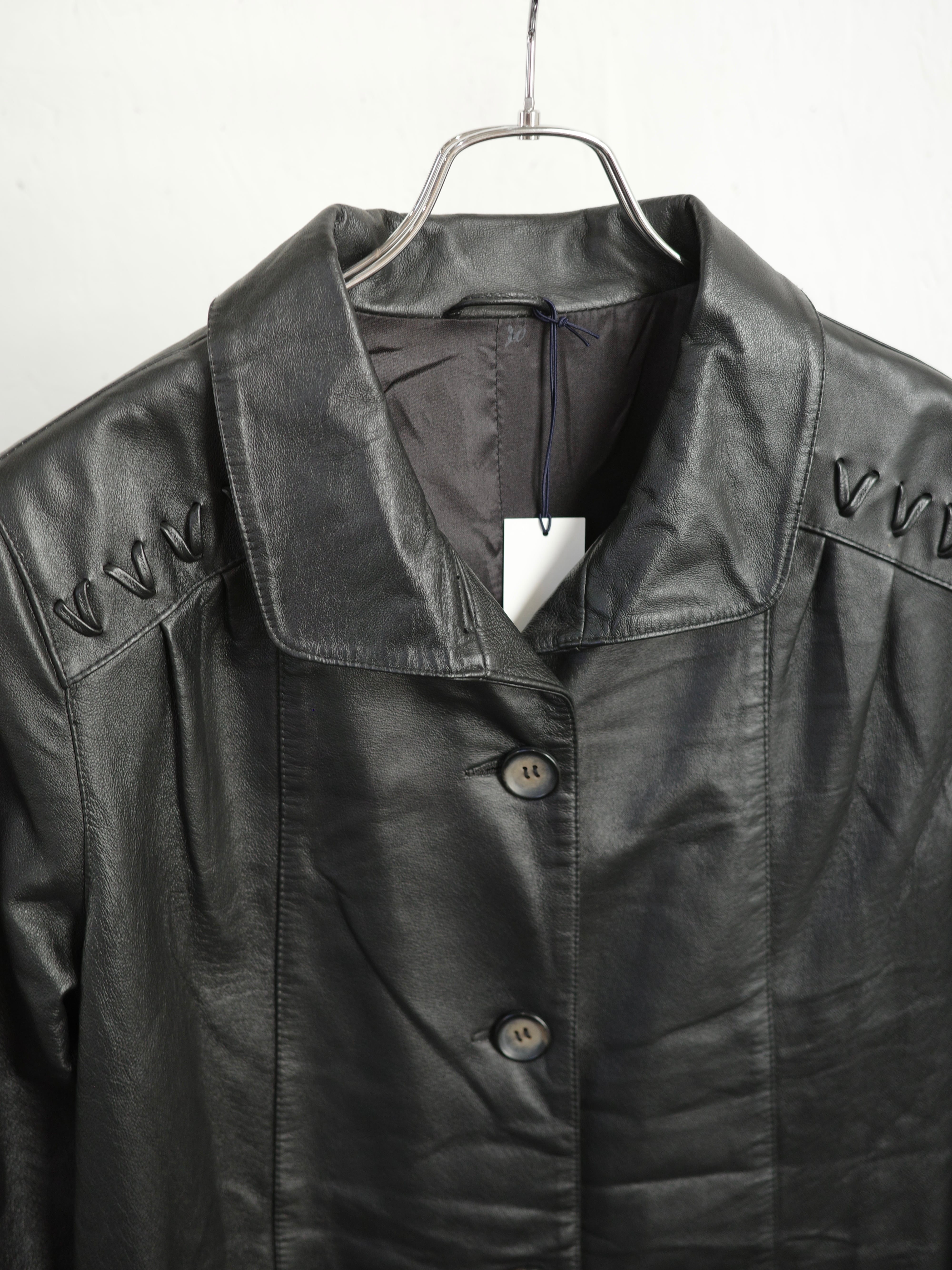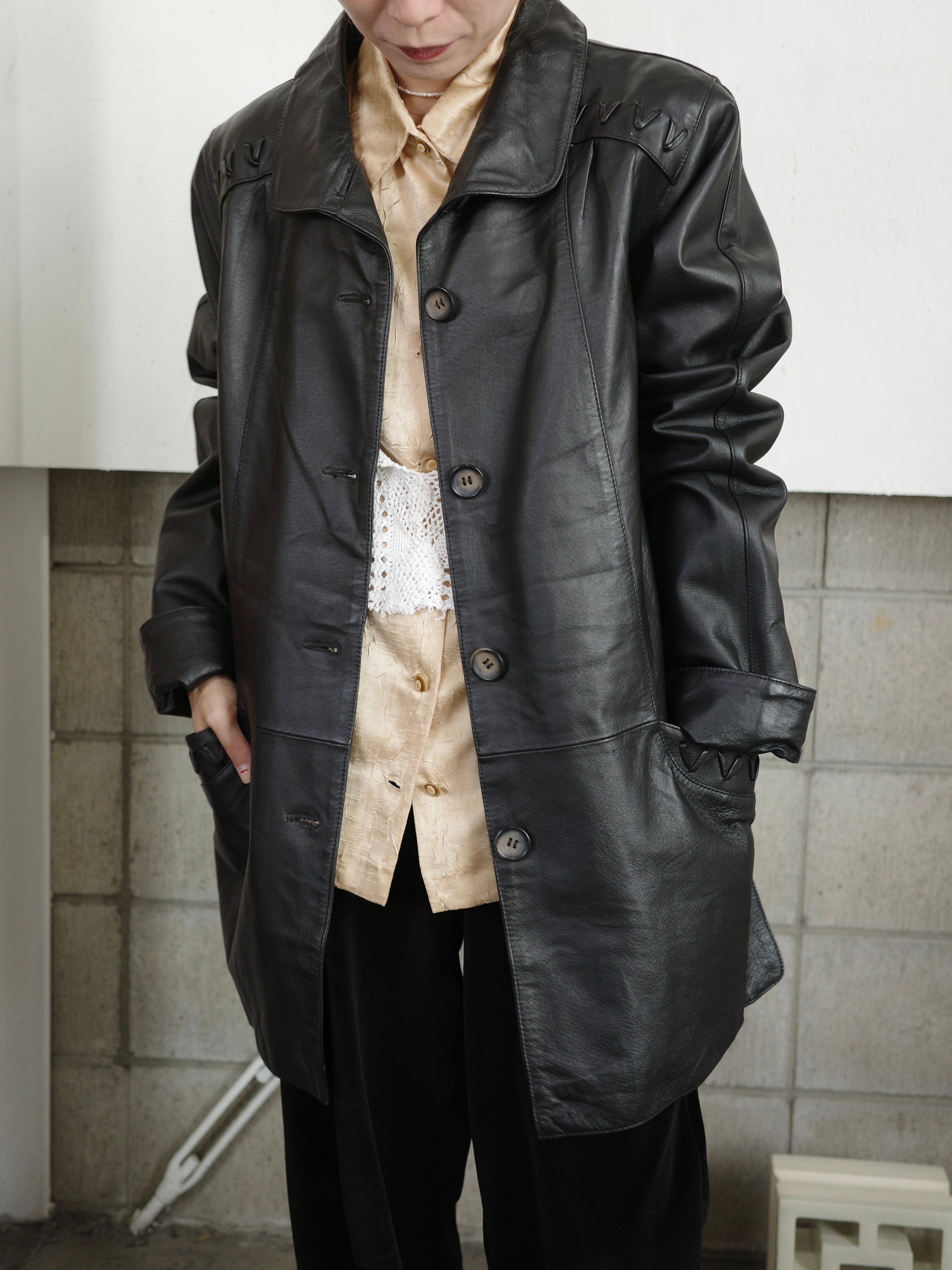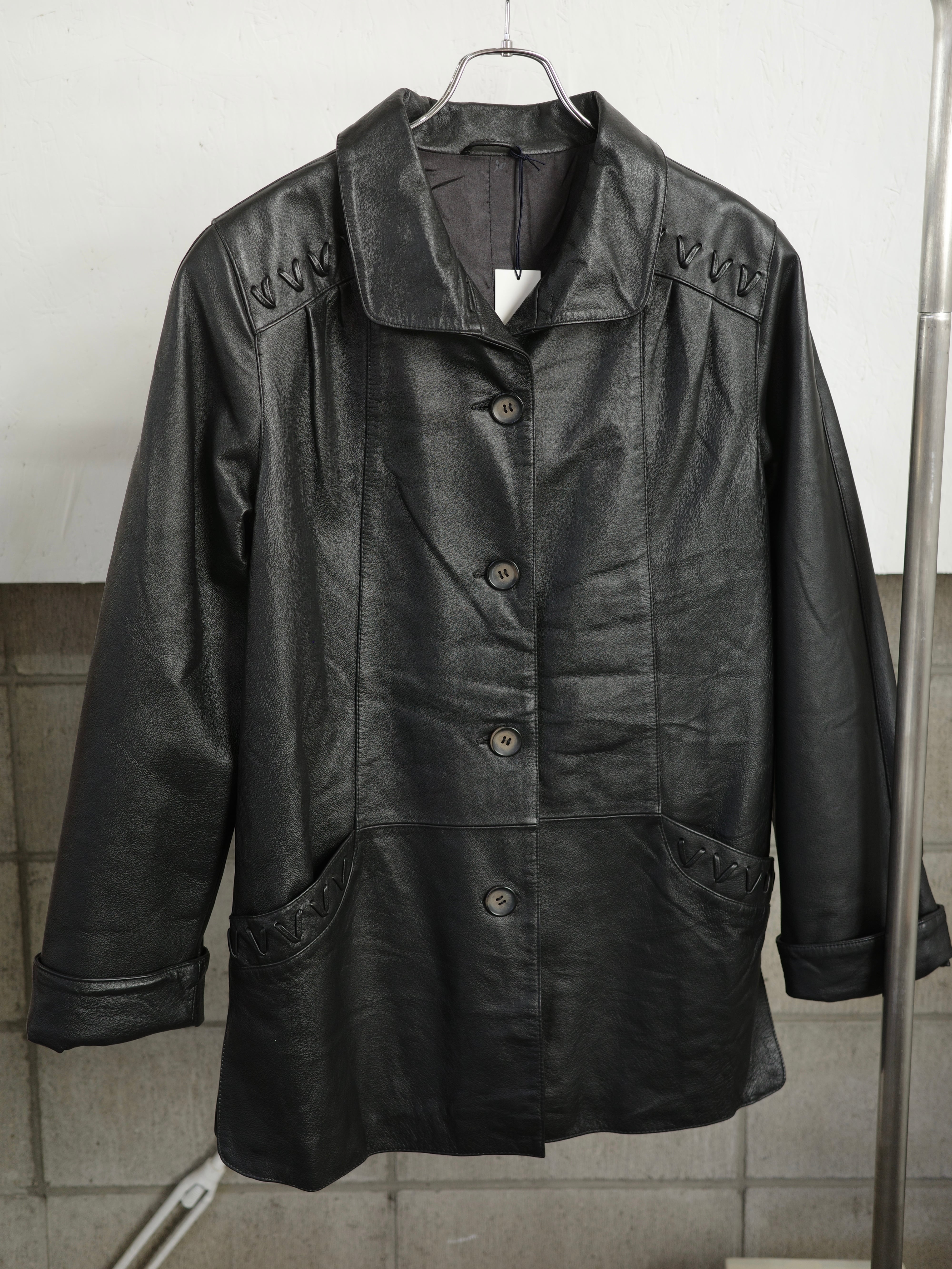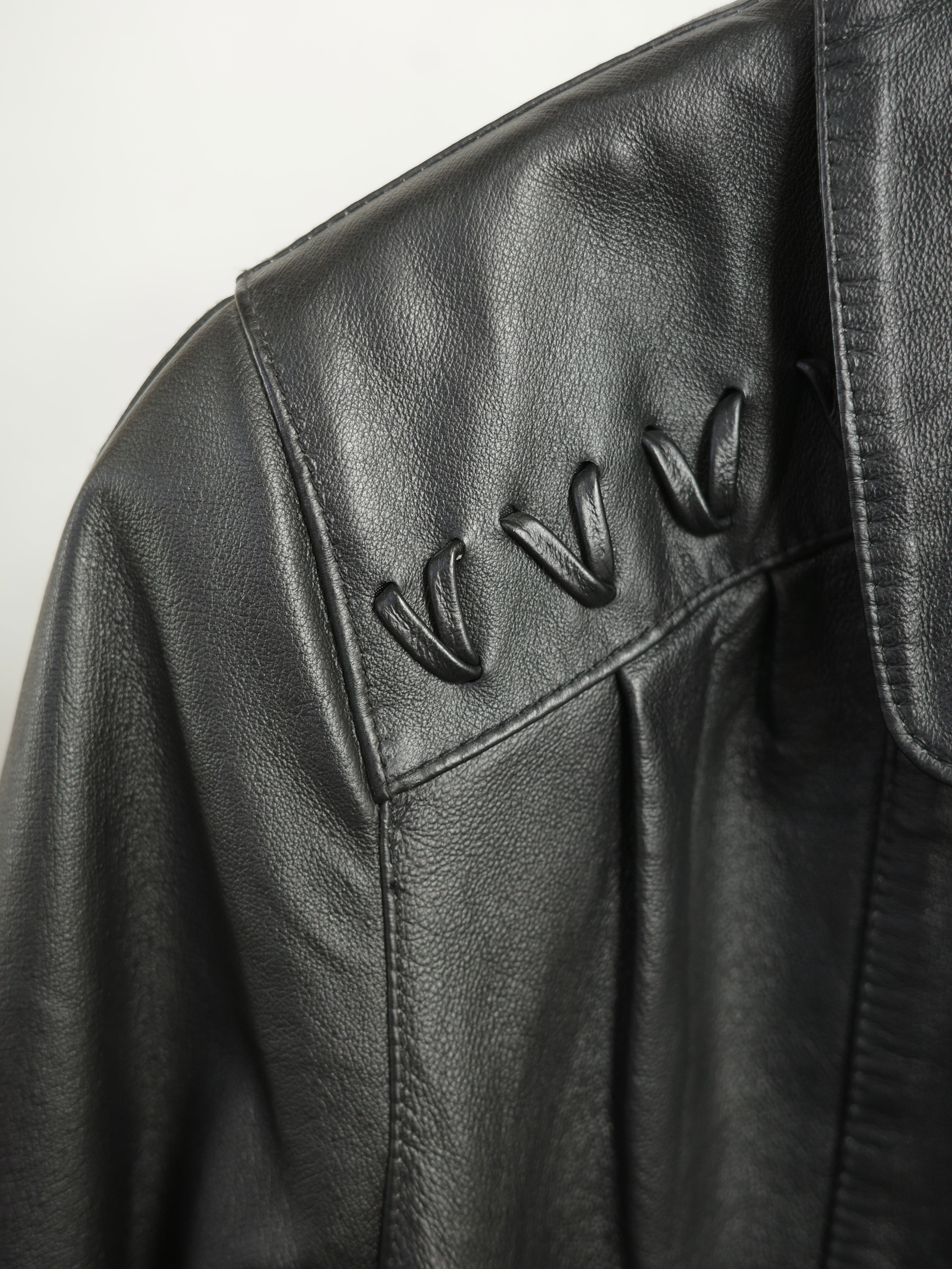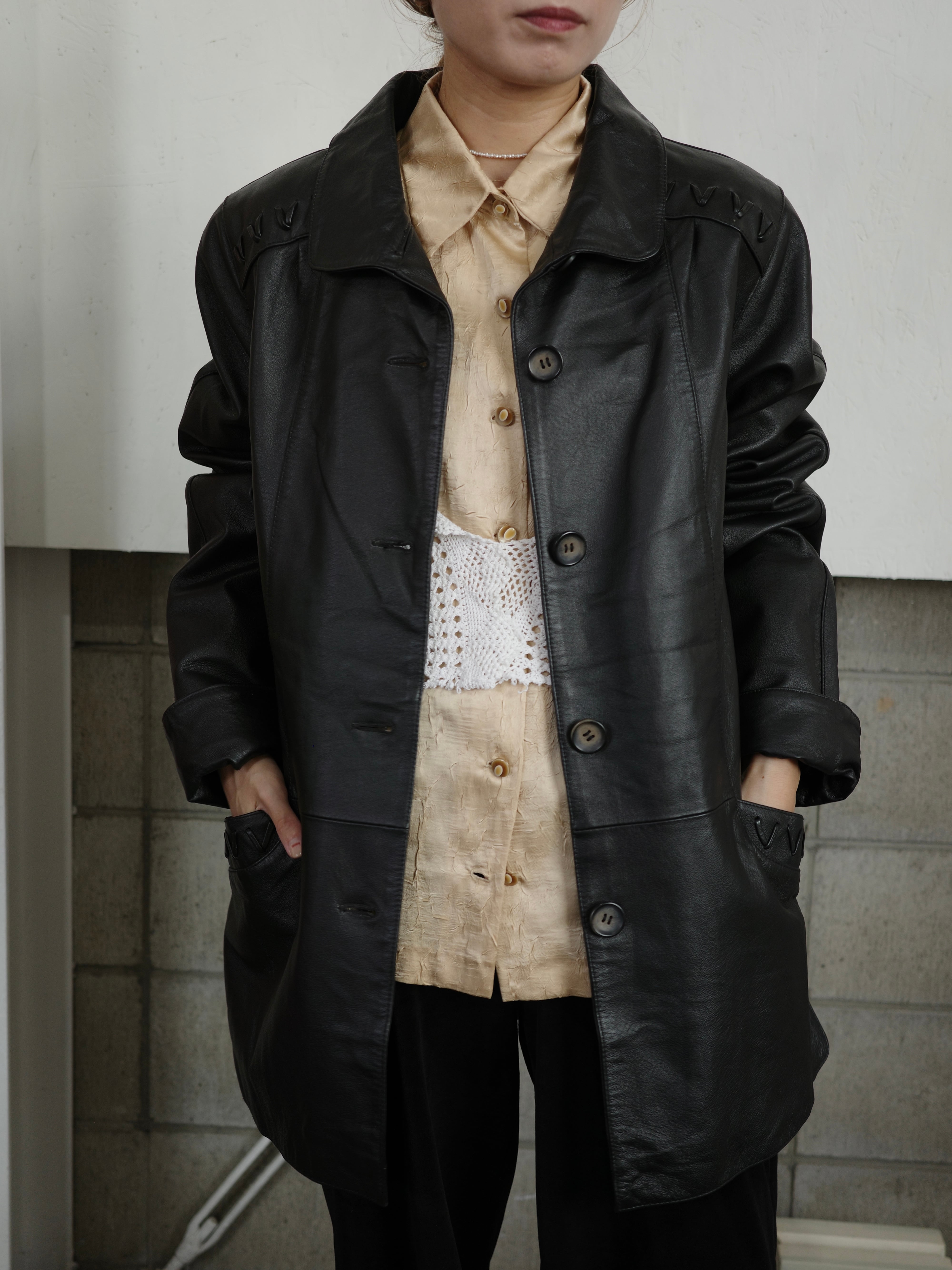 90年代のリアルレザーコートです。肩とポケット部分のレースアップデザインがアクセントになったアイテム。ざっくりオーバーサイズで、中にも着込みやすいです。裏地はキルティングではないので、長い期間着用しやすいです。