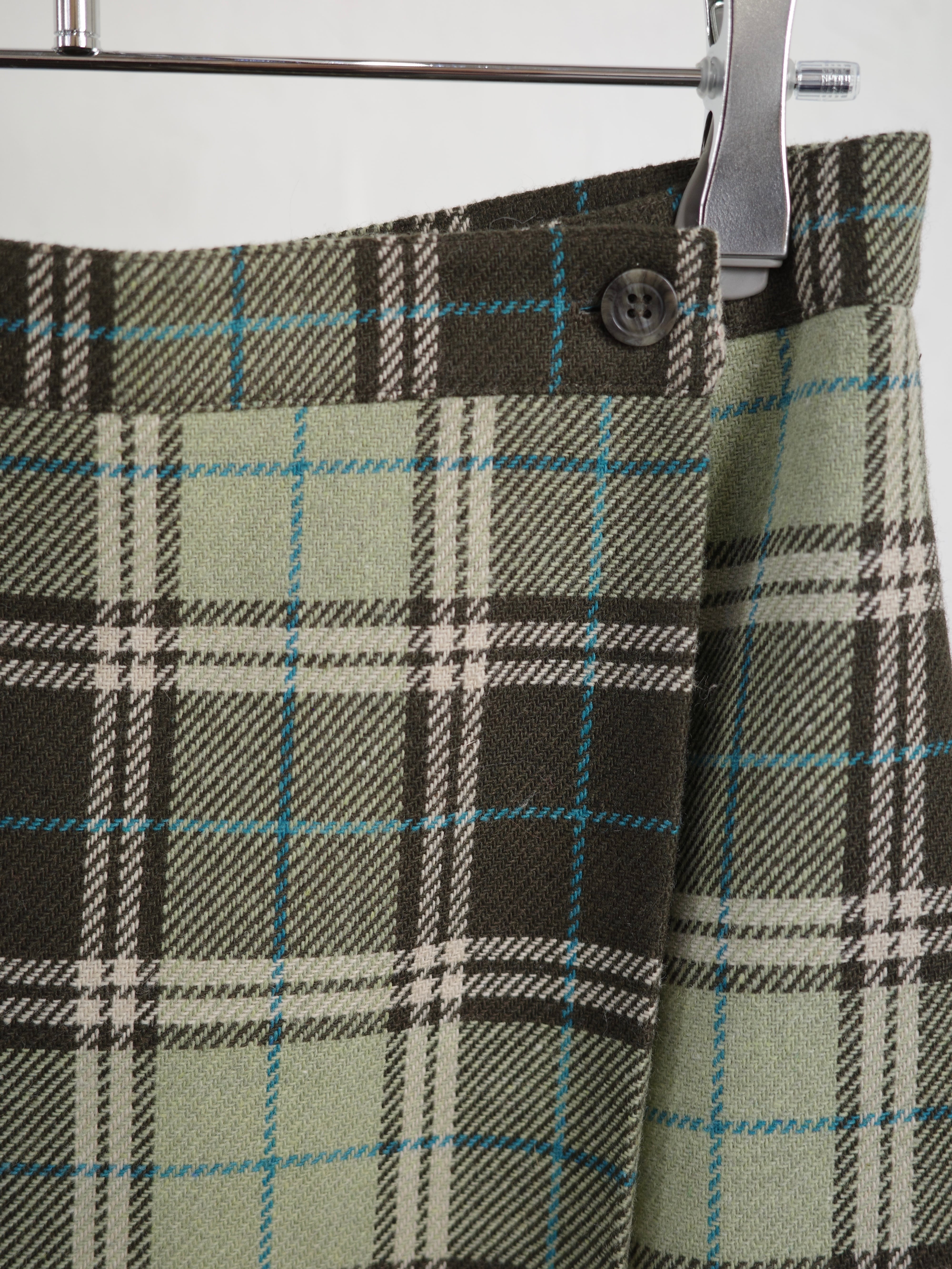 90年代、チェック柄の巻きスカートです。ウール混生地で裾はフリンジになっており、ブランケットのようなデザインがとっても可愛らしいアイテム。ウエスト部分は巻きつけてボタンで止める仕様になっているので、ウエストサイズが合わない場合もボタン位置を付け替えていただければ綺麗に着用いただけそうです。