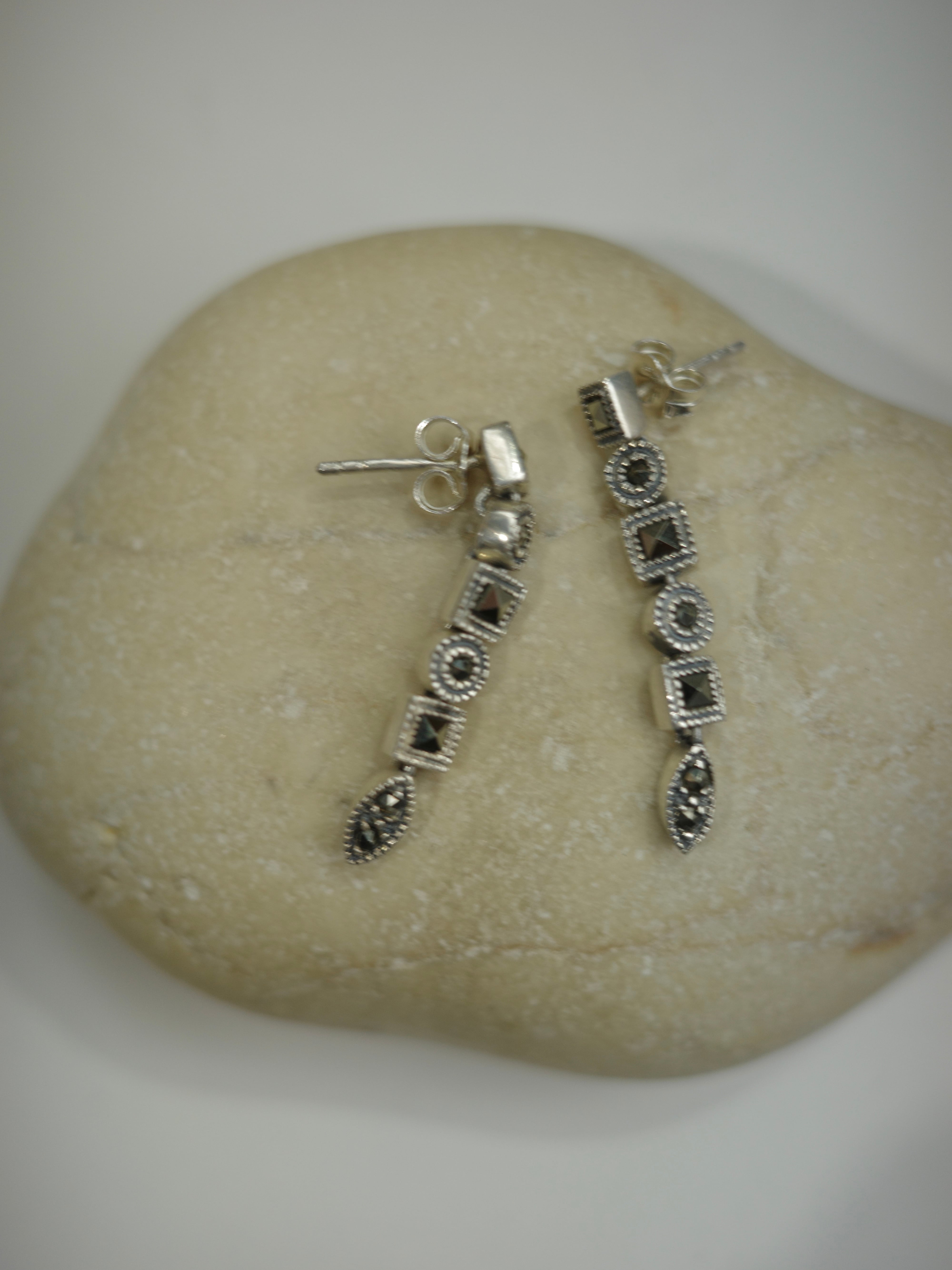 アメリカより仕入れたヴィンテージピアスです。いろんな形のマーカサイトのモチーフが盾に連なって揺れるデザインになっています。小ぶりですが華やかでさりげない輝きが素敵なピアスです。