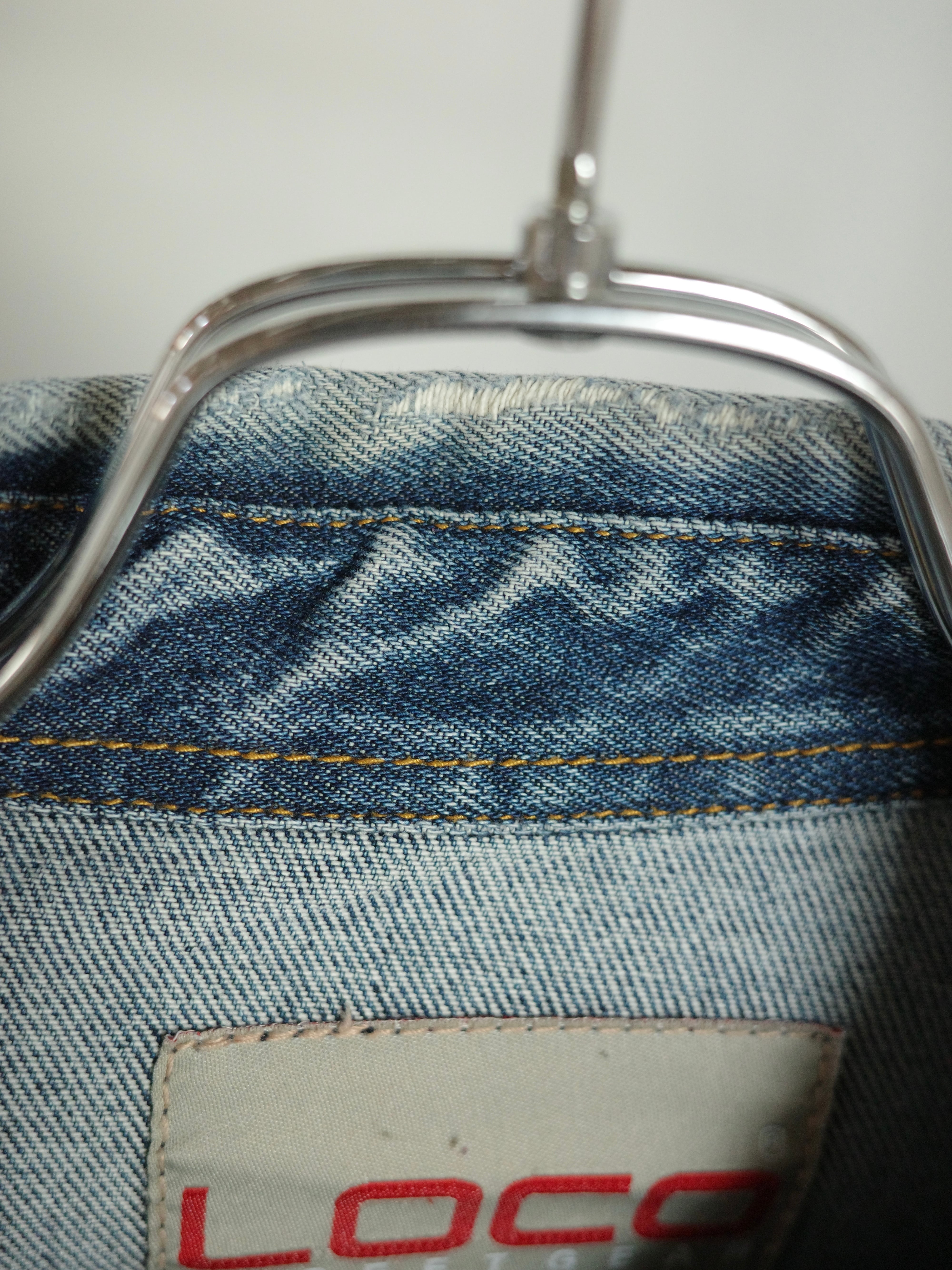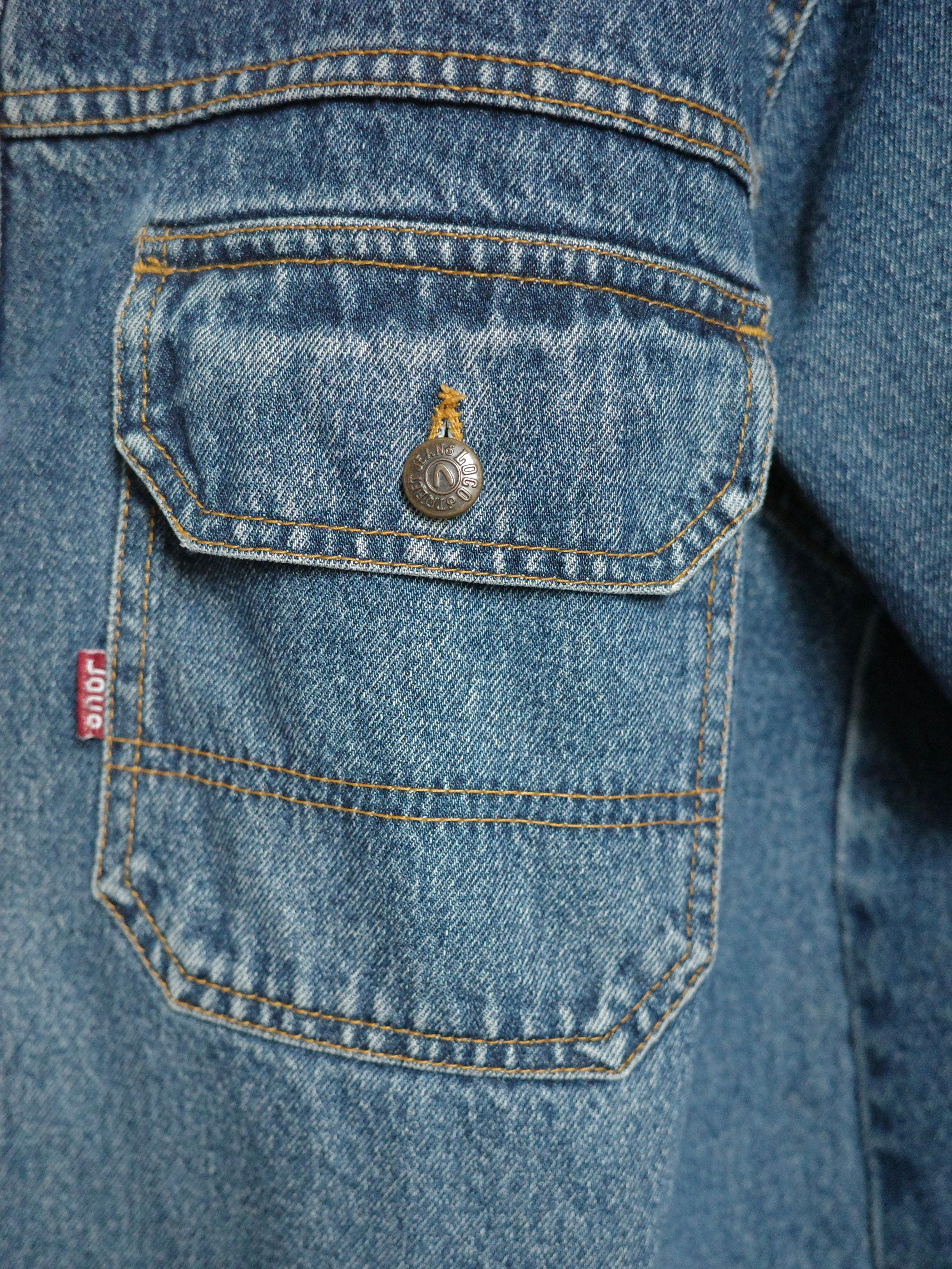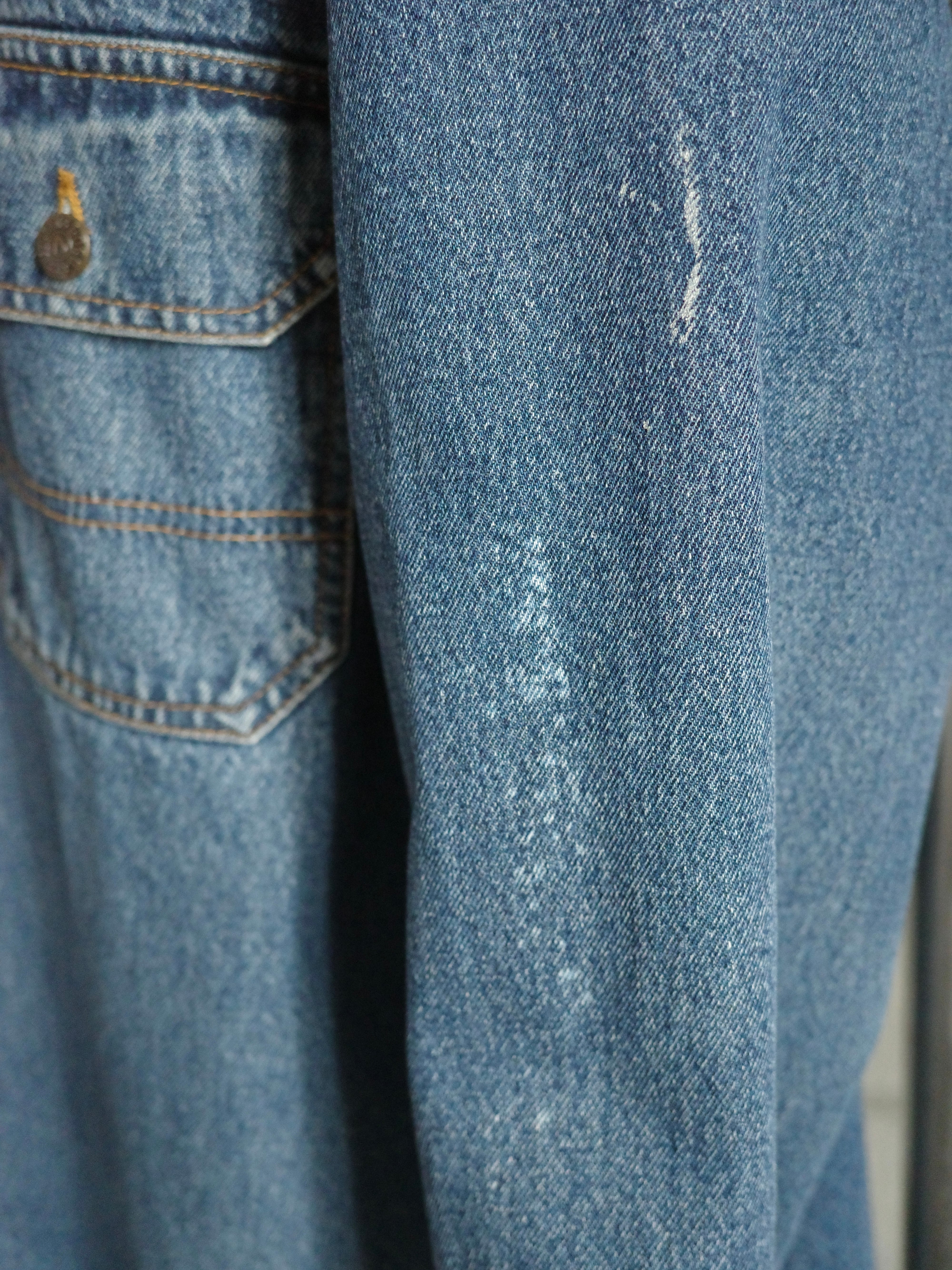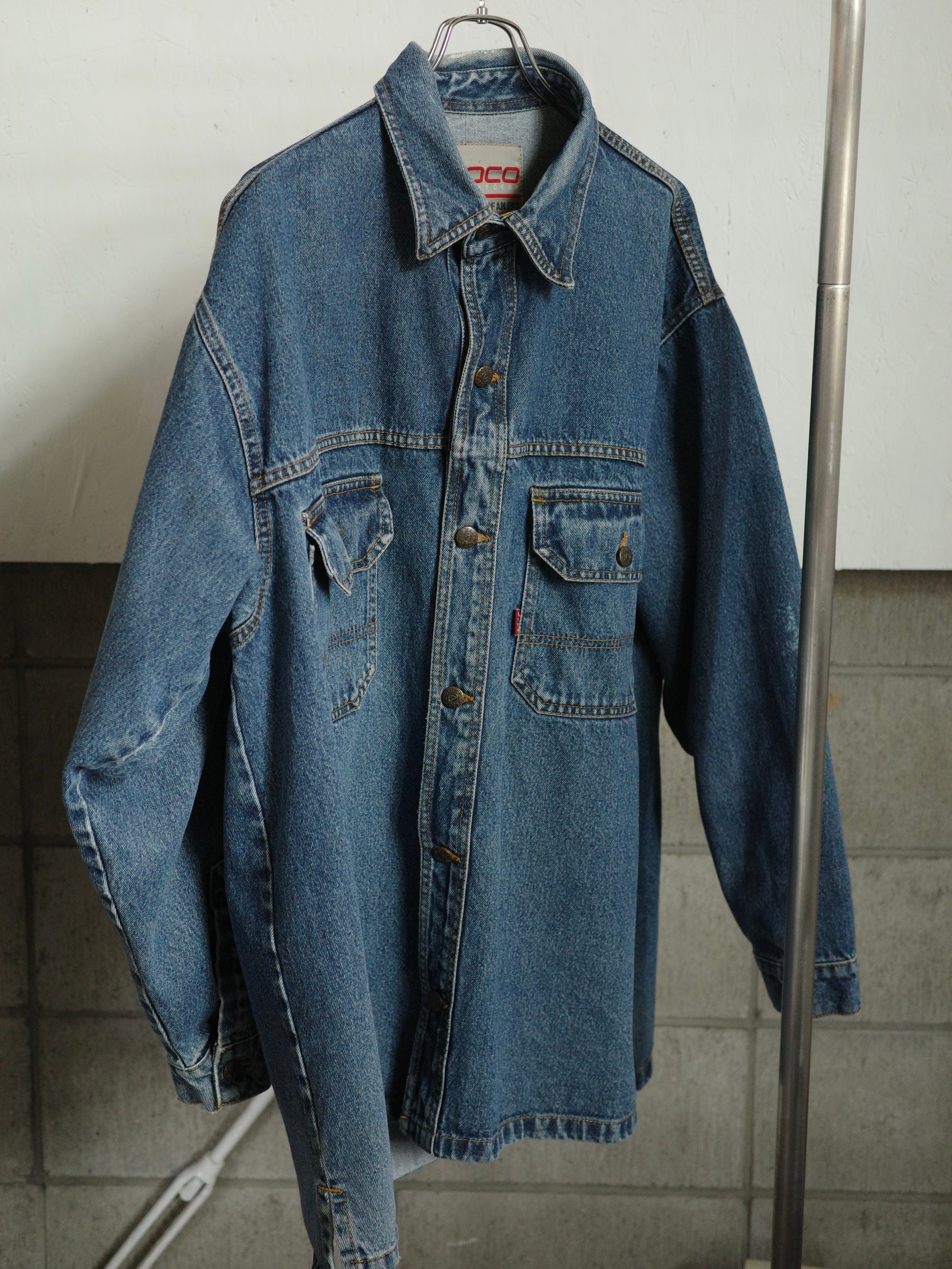オーバーサイズのデニムジャケットです。着丈長めでボックス型のシャツのようなデザインですが、Gジャンぐらいしっかりとした生地感になっています。王道のブルーカラーなので使いやすく、襟元や袖に若干のダメージがありますが、それも良い味になっているかと思います。