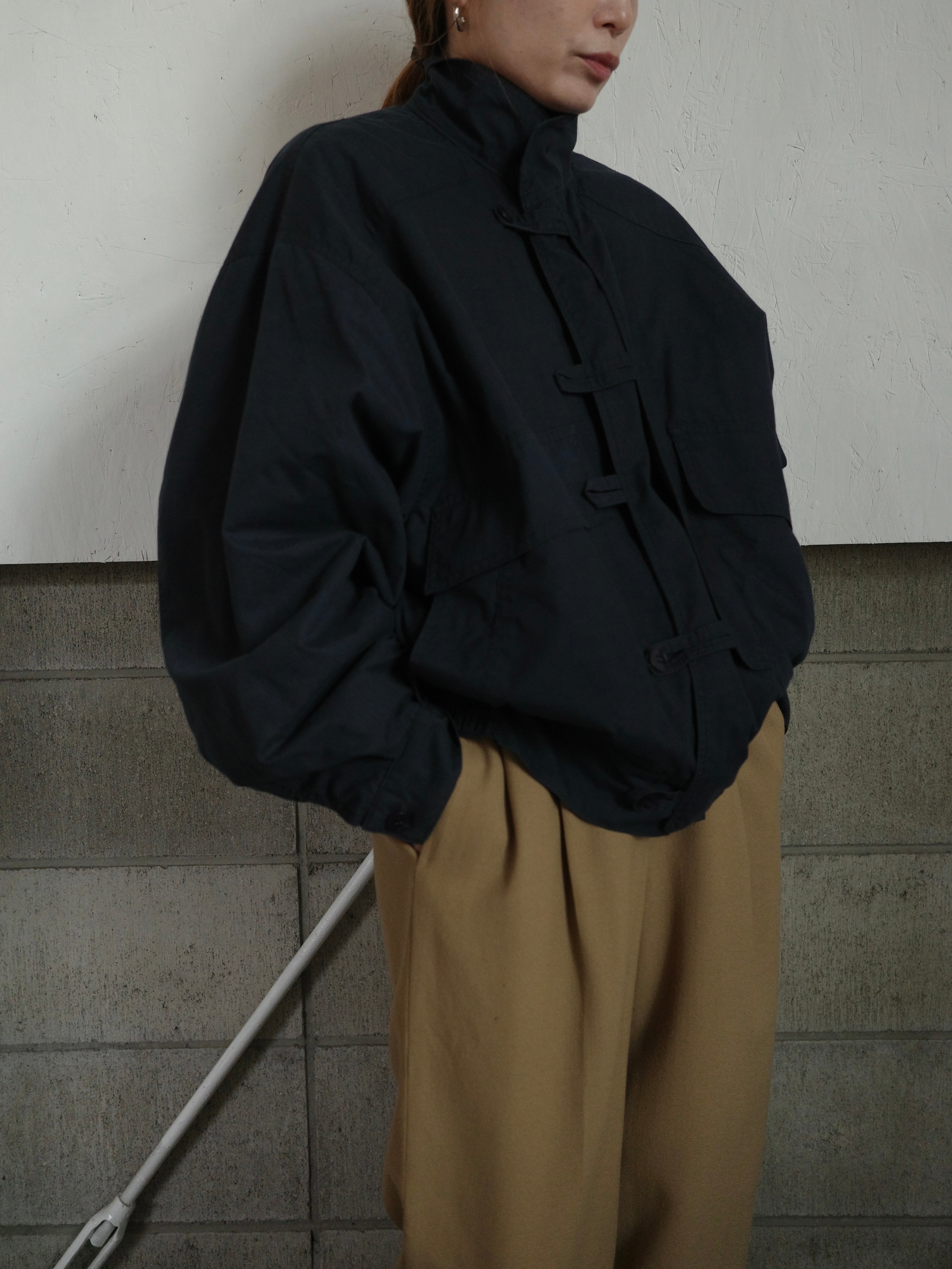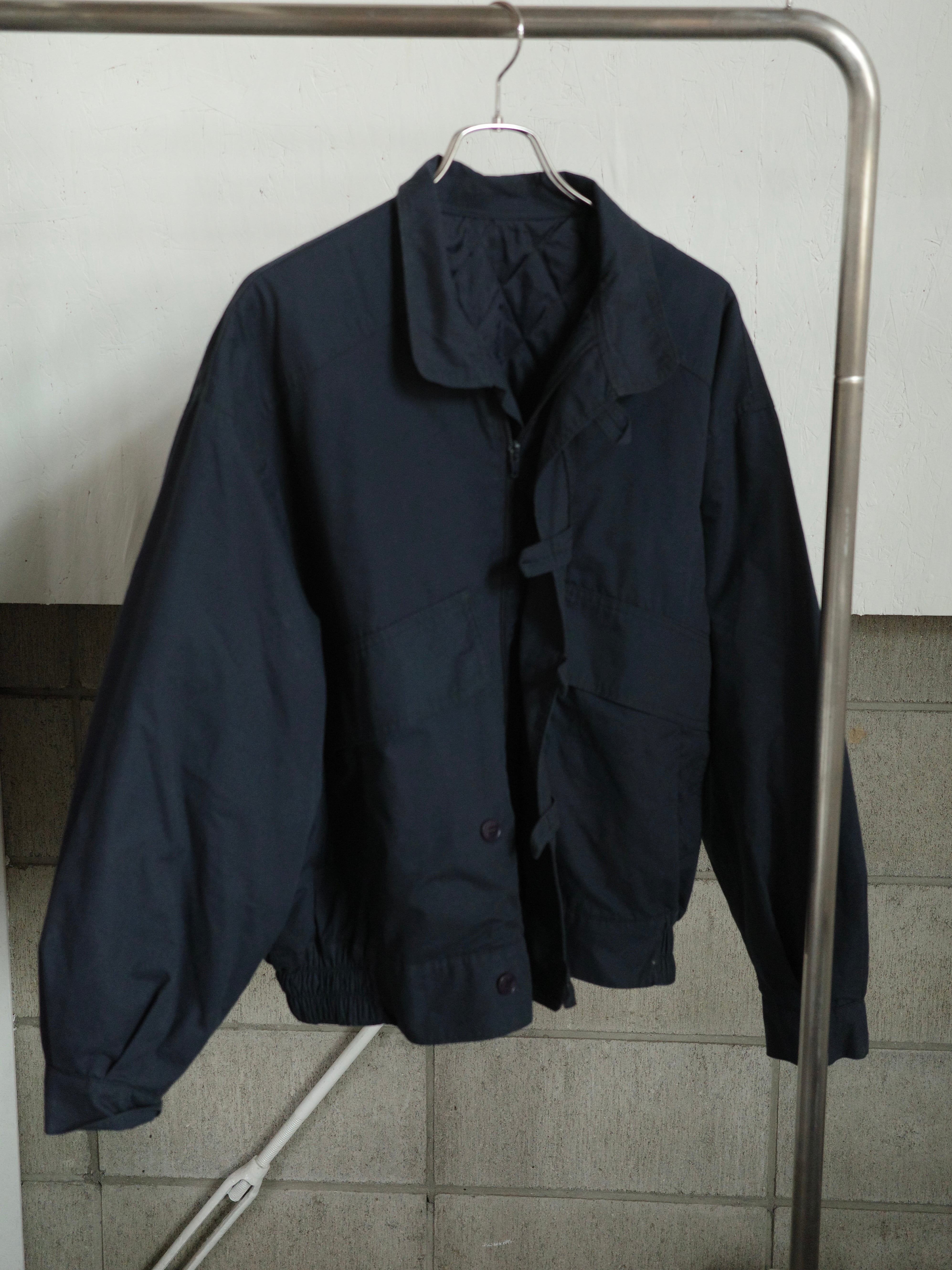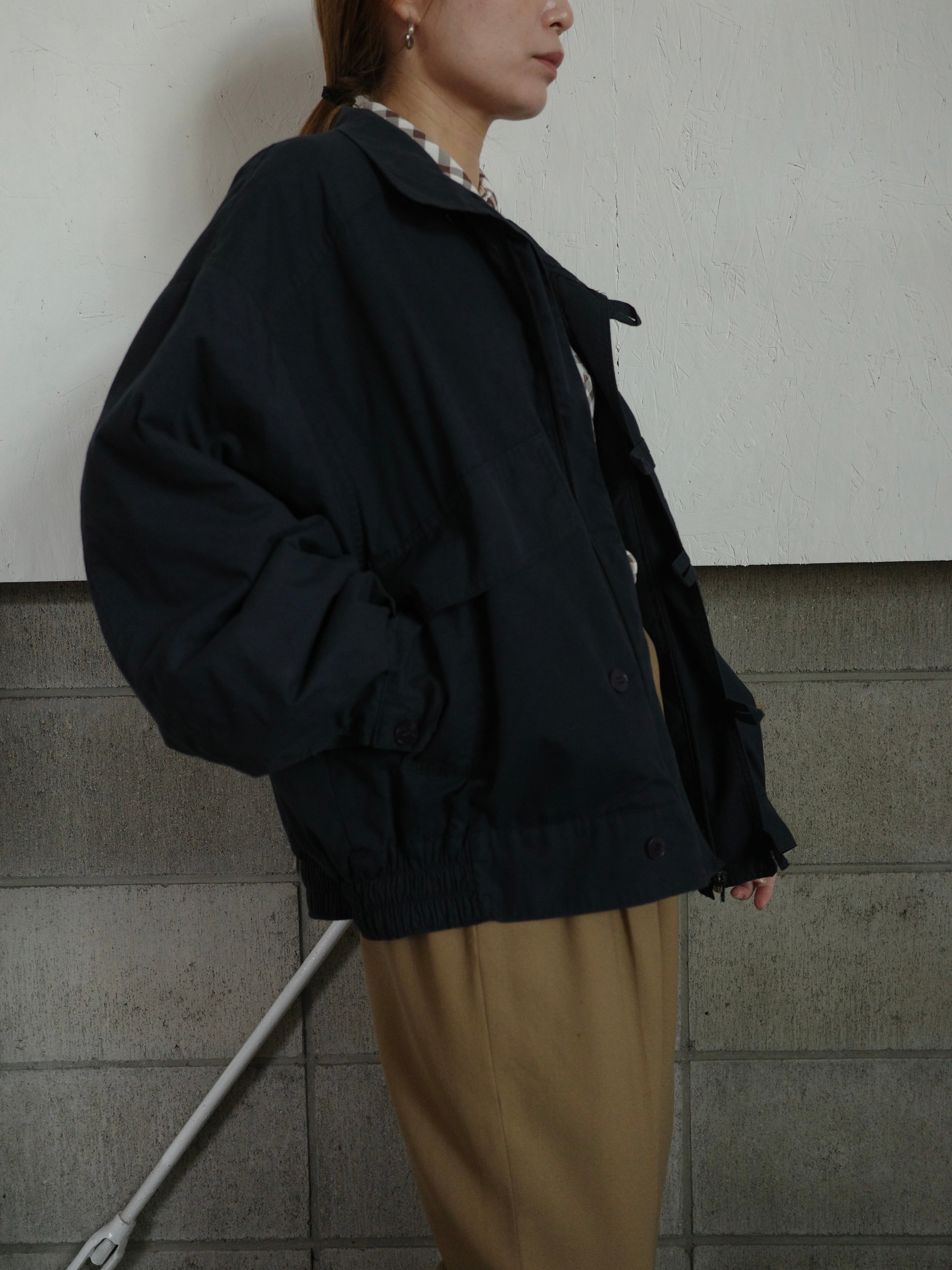 ネイビーのコンパクトなブルゾンです。ボタンループのついたミリタリー調のデザインですが、丸みのあるシルエットが可愛らしさもあるアイテム。中綿キルティングで暖かく、襟を立てて切るのも表情が変わって素敵です。