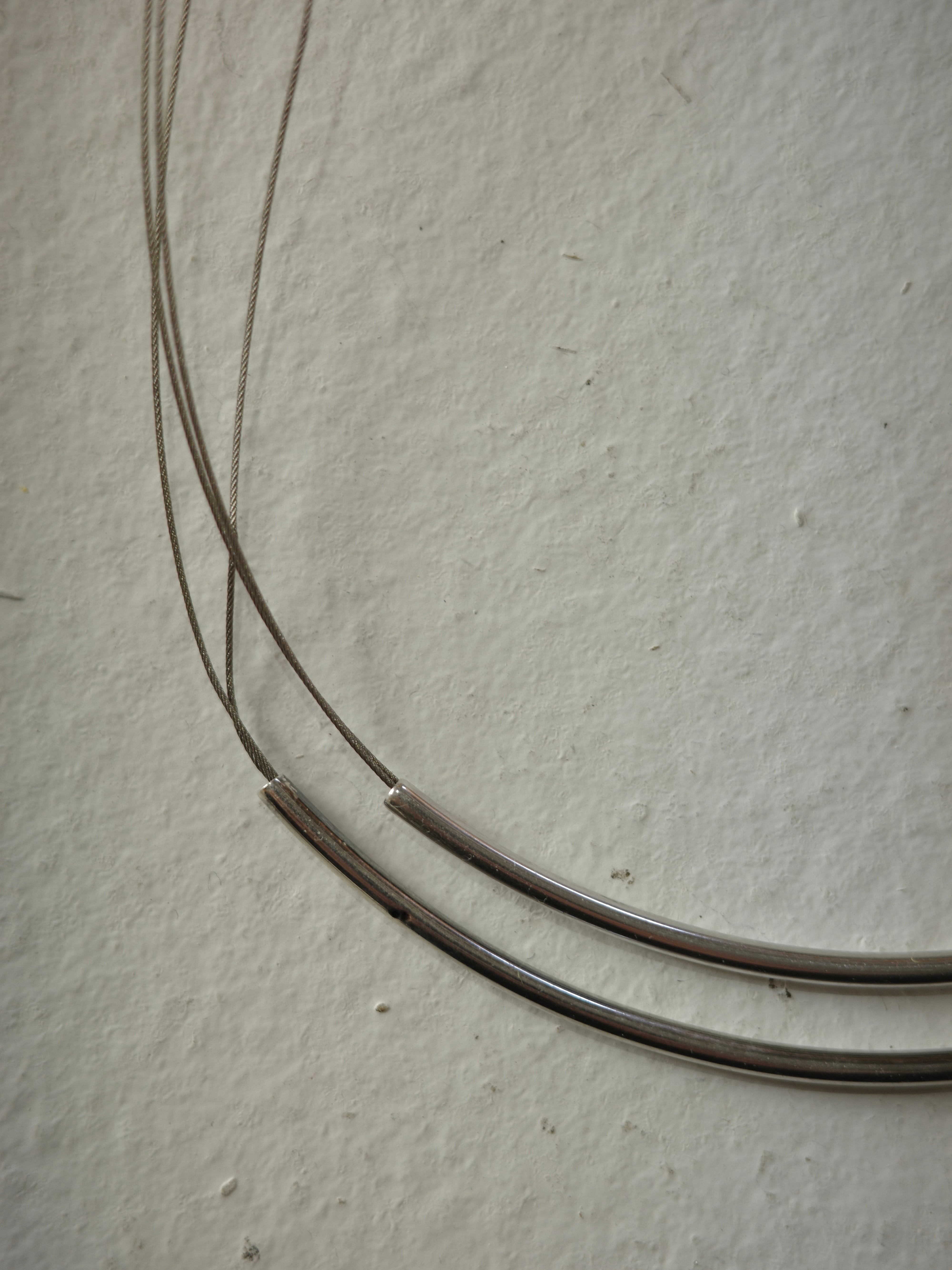 4本のワイヤーに2本のチューブが通ったデザインで、モードな洗練されたデザインがカッコ良いアイテム。重ねつけしているようなデザインなので、これ一つで決まります。