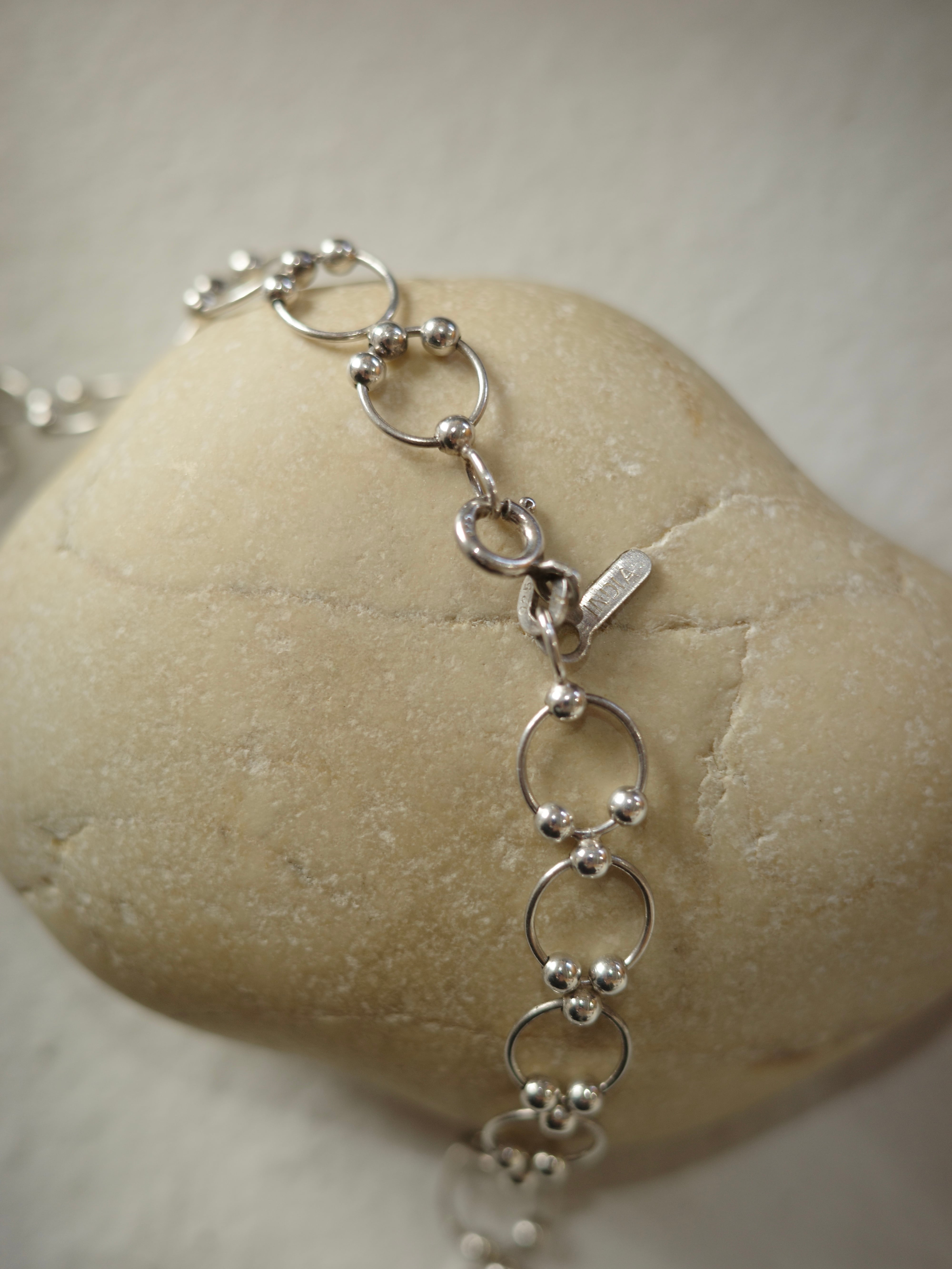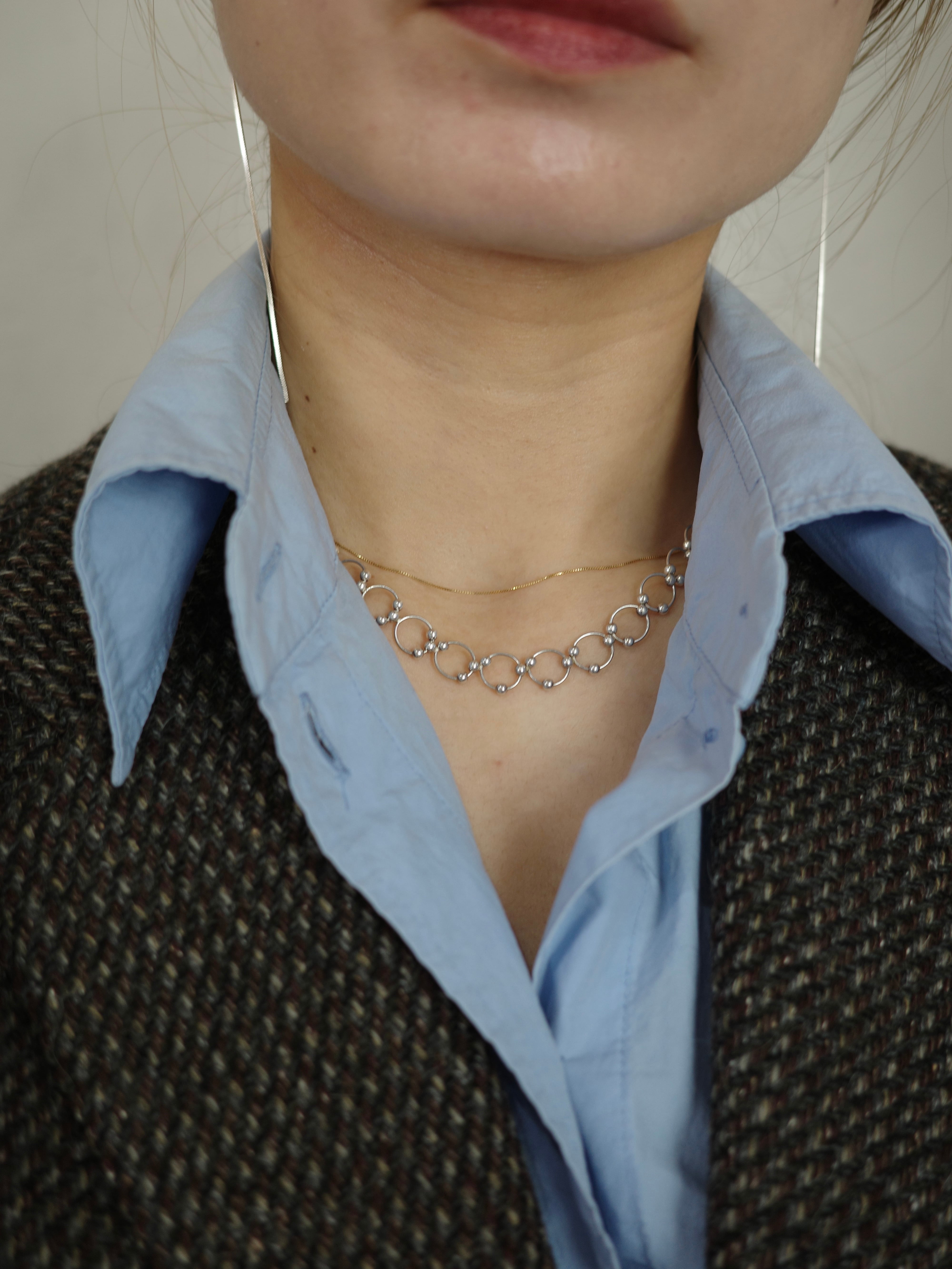 アメリカより仕入れたヴィンテージネックレスです。サークルとビーズが連結した面白いデザインで、華やかな印象になります。長さが短めで、着用した時のバランスもとても素敵なアイテムです。