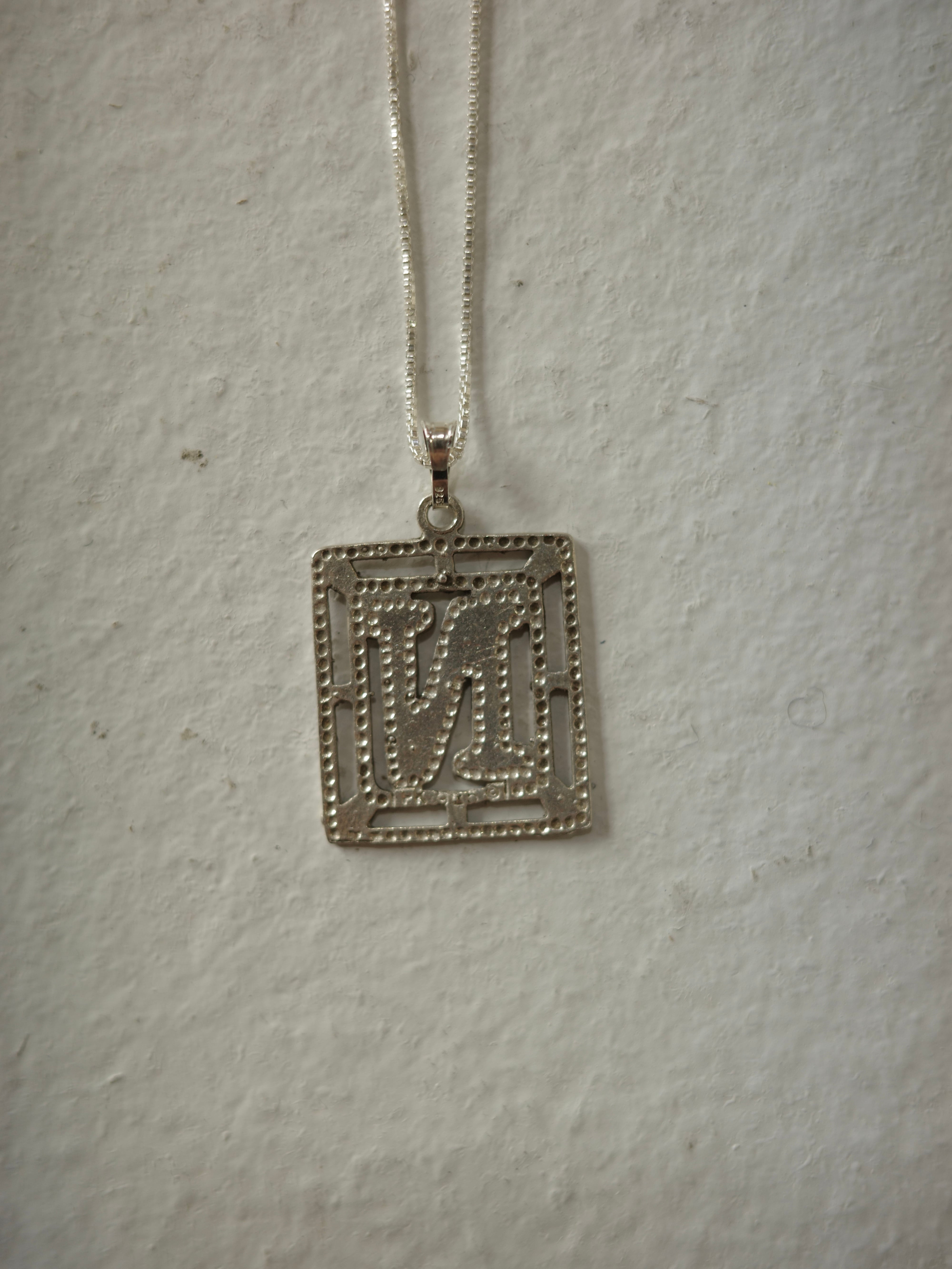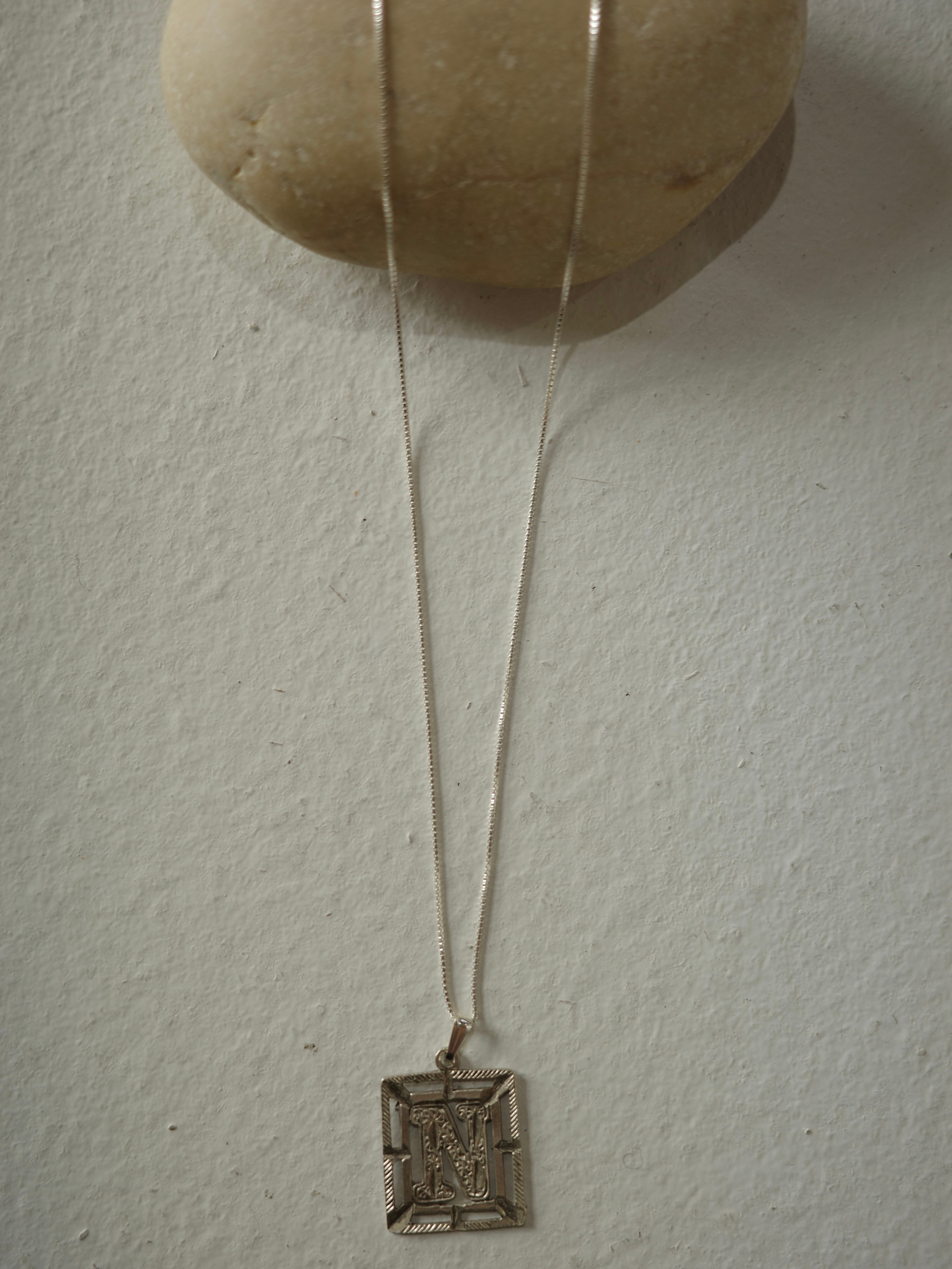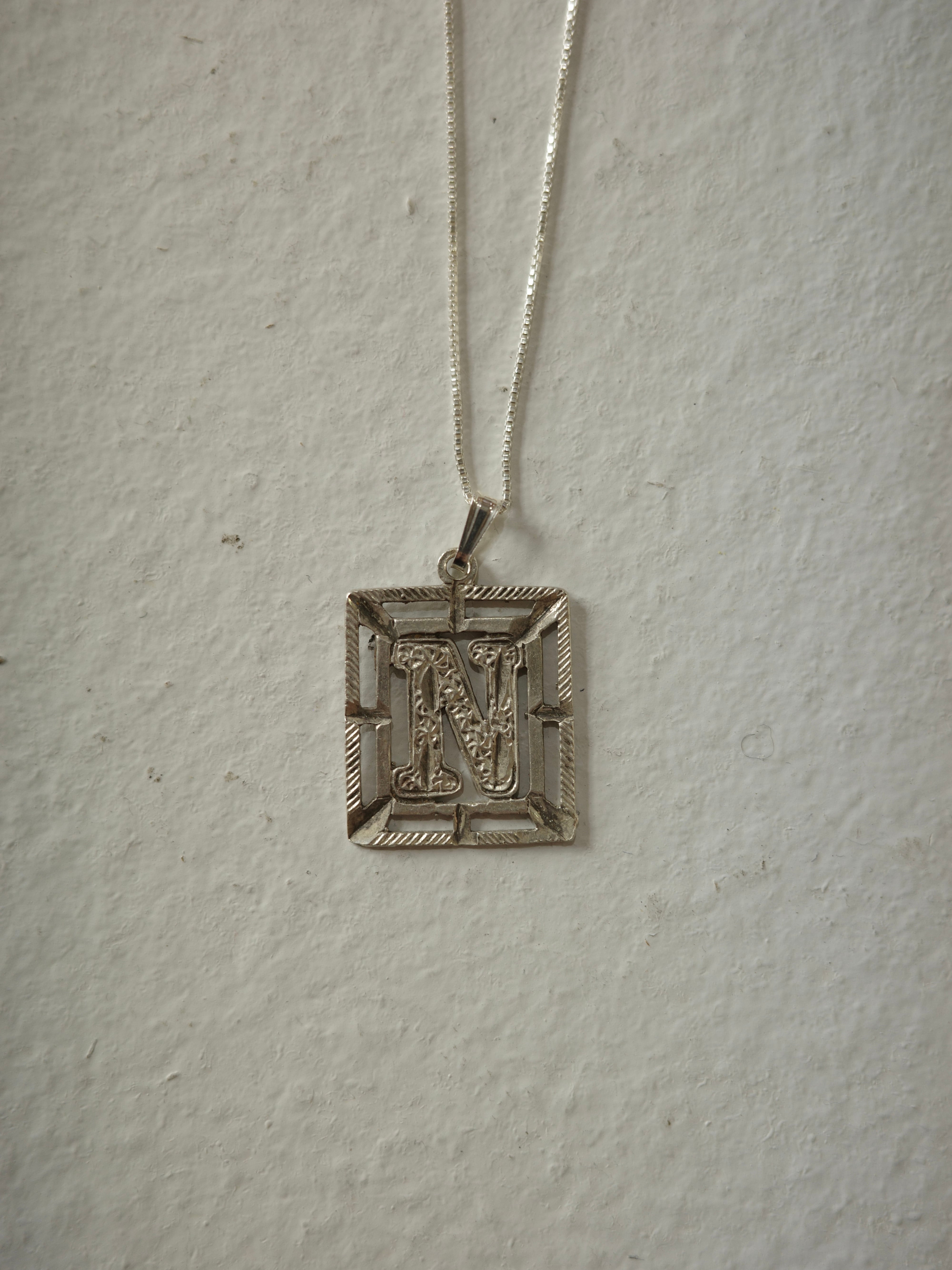 アメリカより仕入れたヴィンテージネックレスです。スクエア型に“N“の文字が入ったモチーフです。存在感がありながらもトップ自体は薄くて軽く着用しやすいです。コーディネートのアクセントになります。