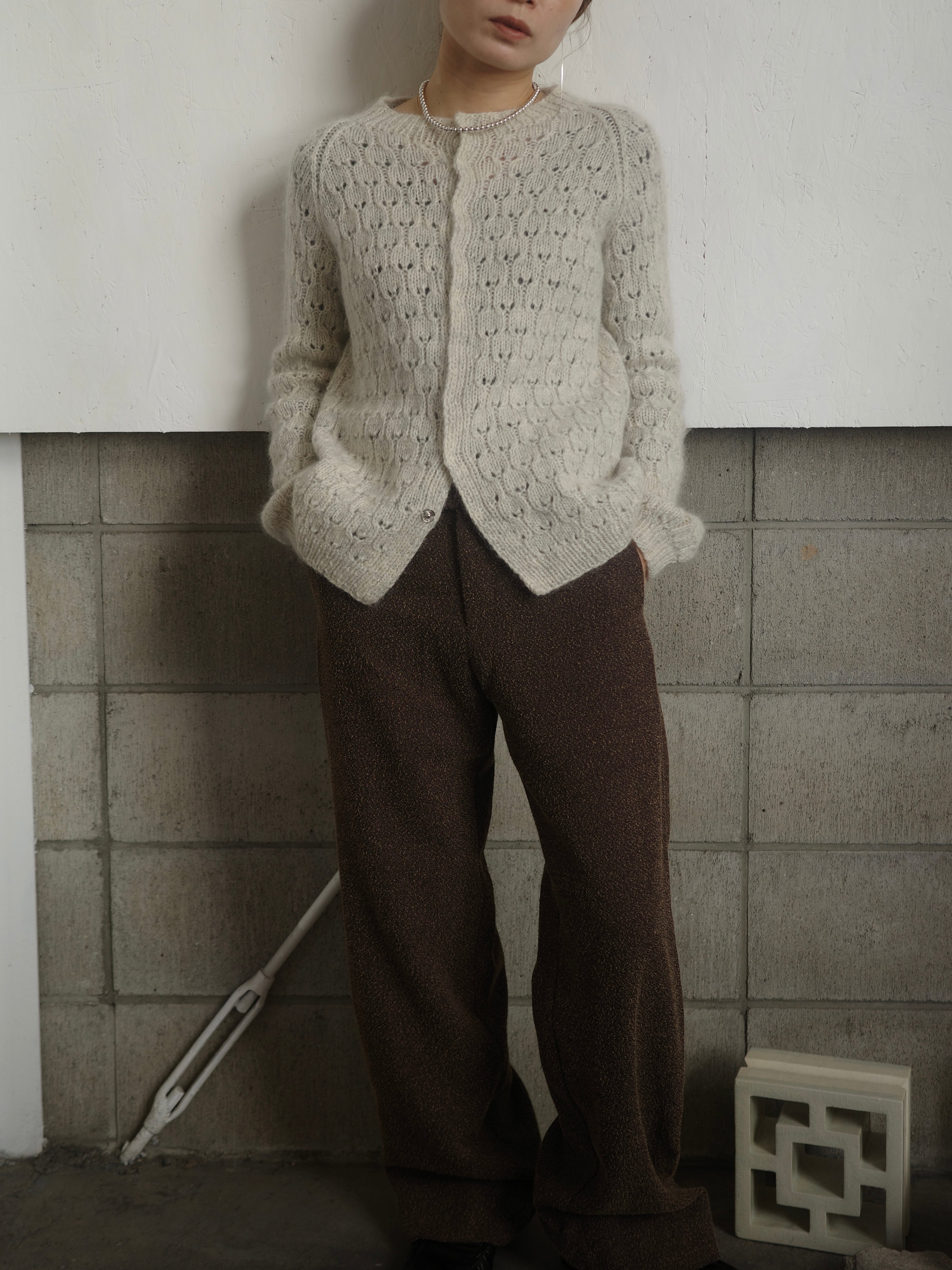 毛足長めのニットカーディガンです。全体の編み模様が可愛らしく、隠ボタンになっているので、トップスとしても羽織としても使えるアイテムです。程よい厚みなのでアウターも上から着やすく、着丈が少し長めなのもポイントです。