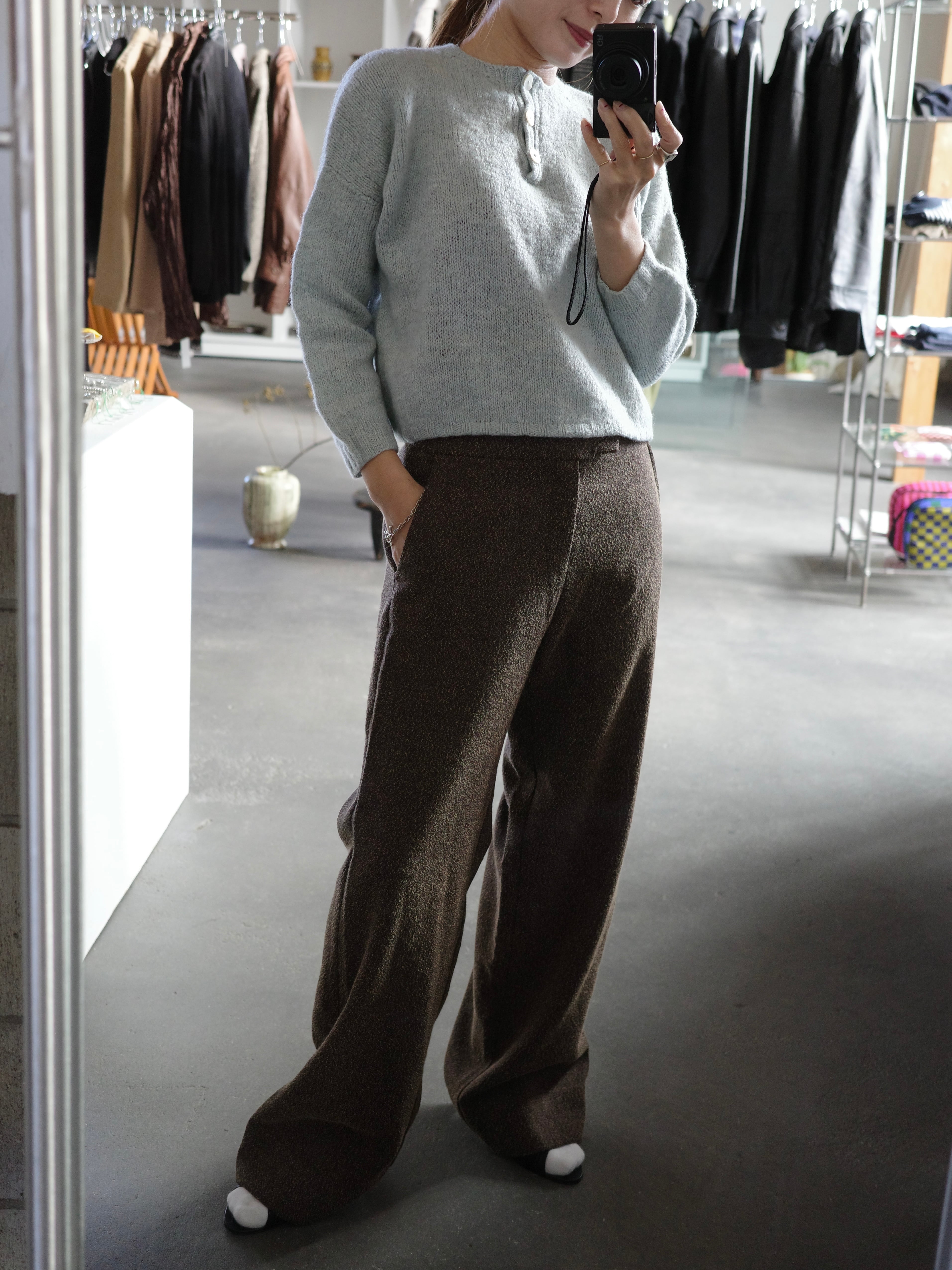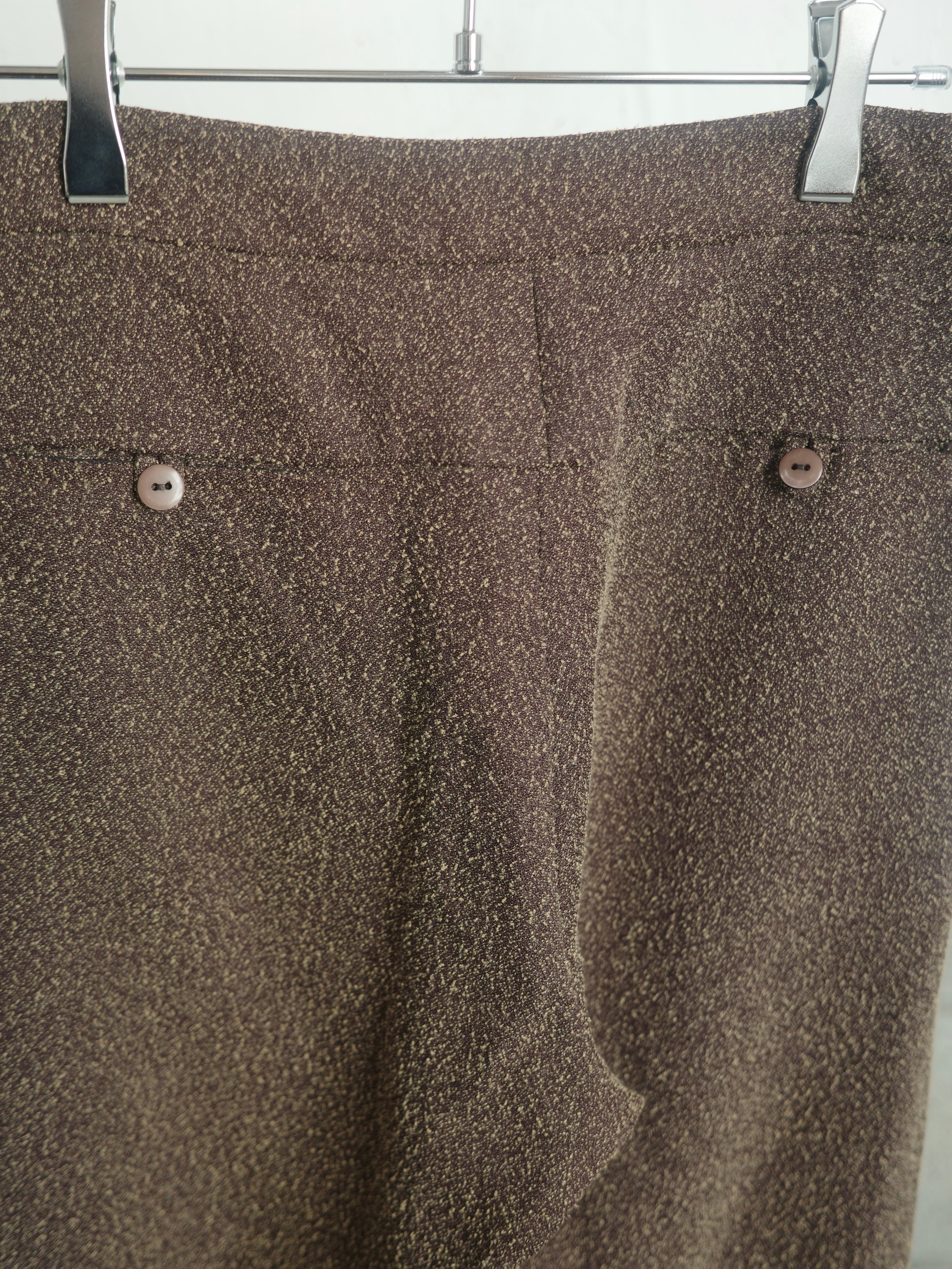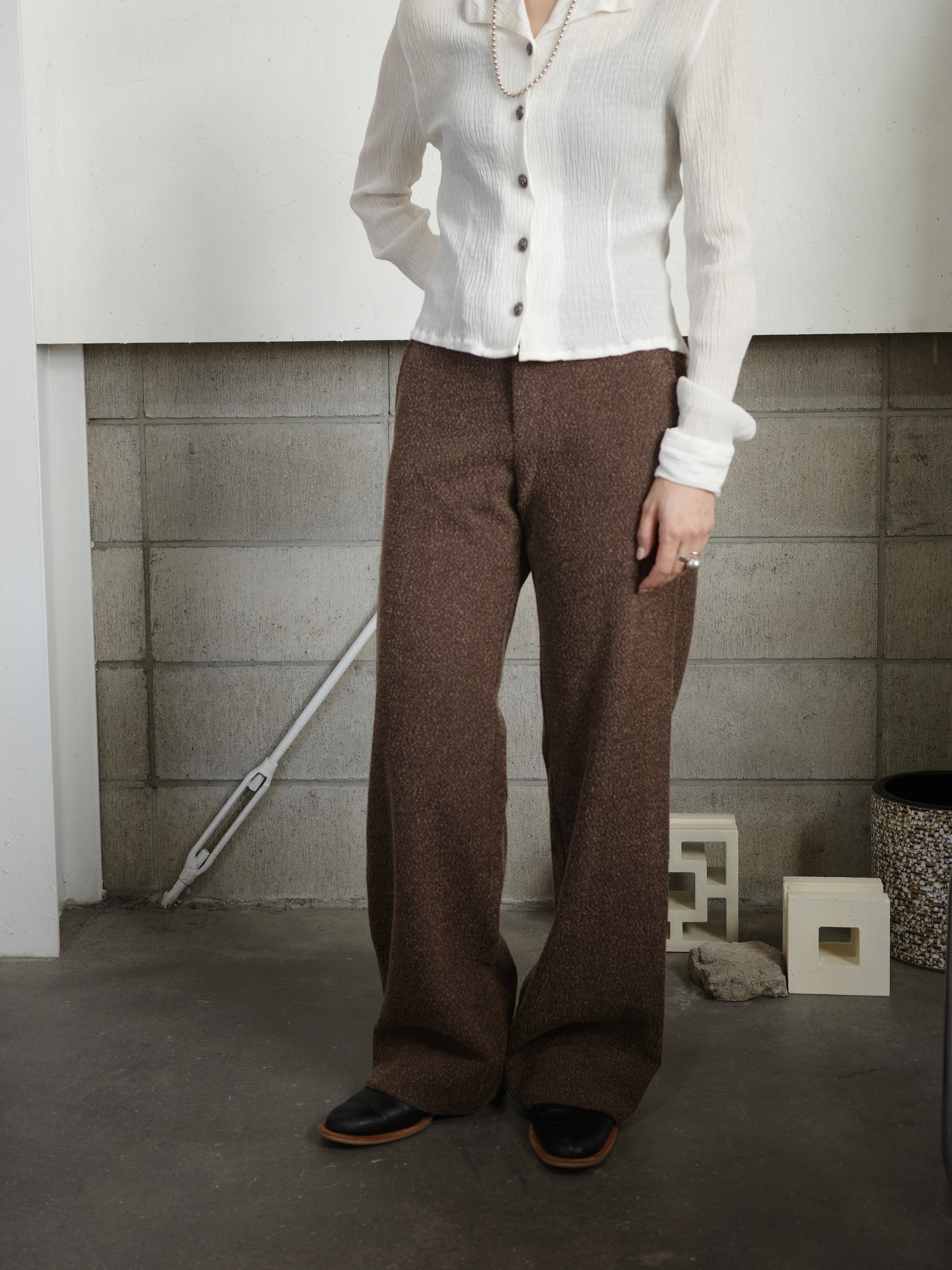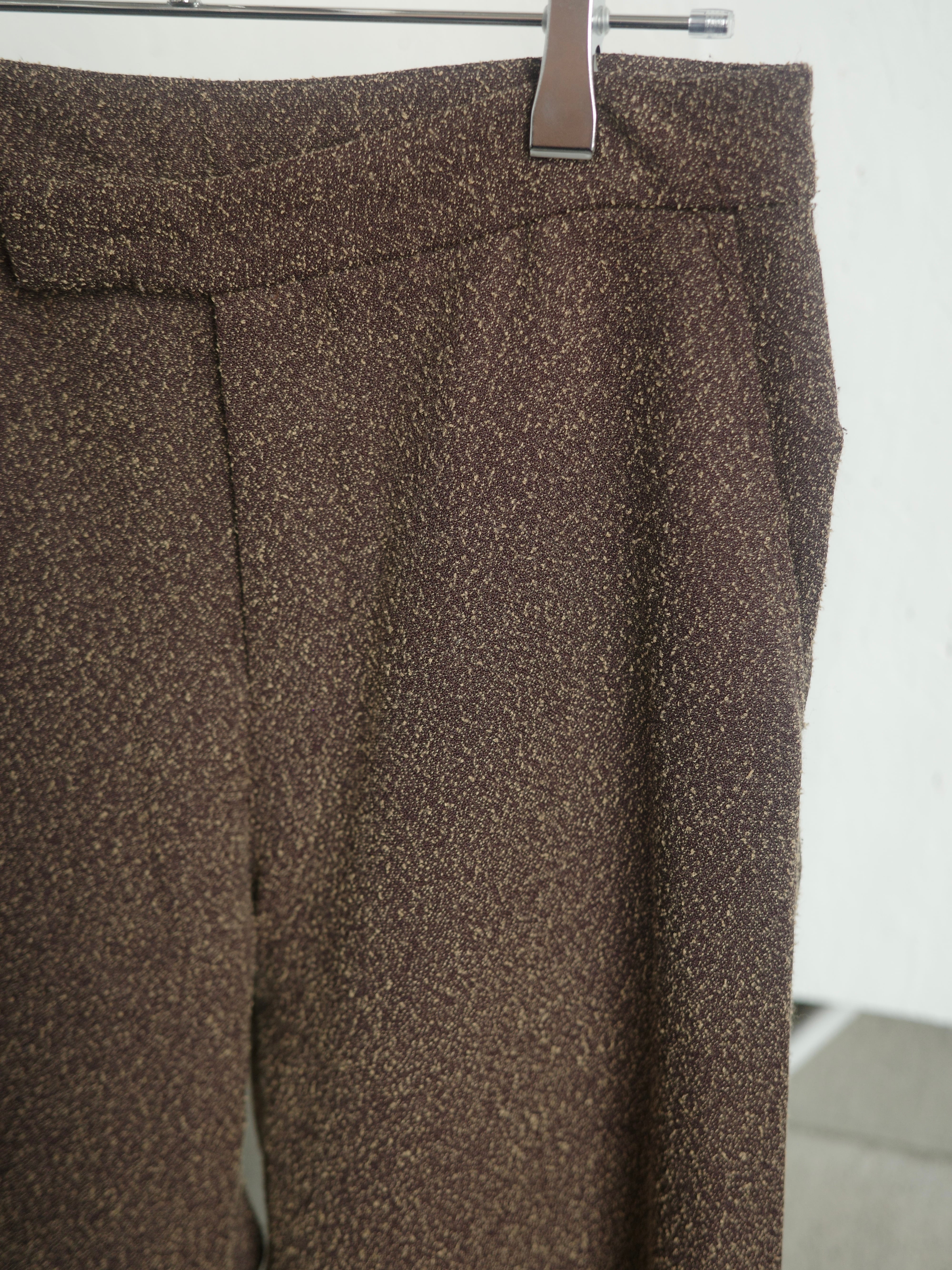 ブラウンにベージュの糸がミックスされた珍しい生地感のパンツです。股上はやや浅め、裾はややフレアになった形で、ほどよくゆるっと履いていただけます。
