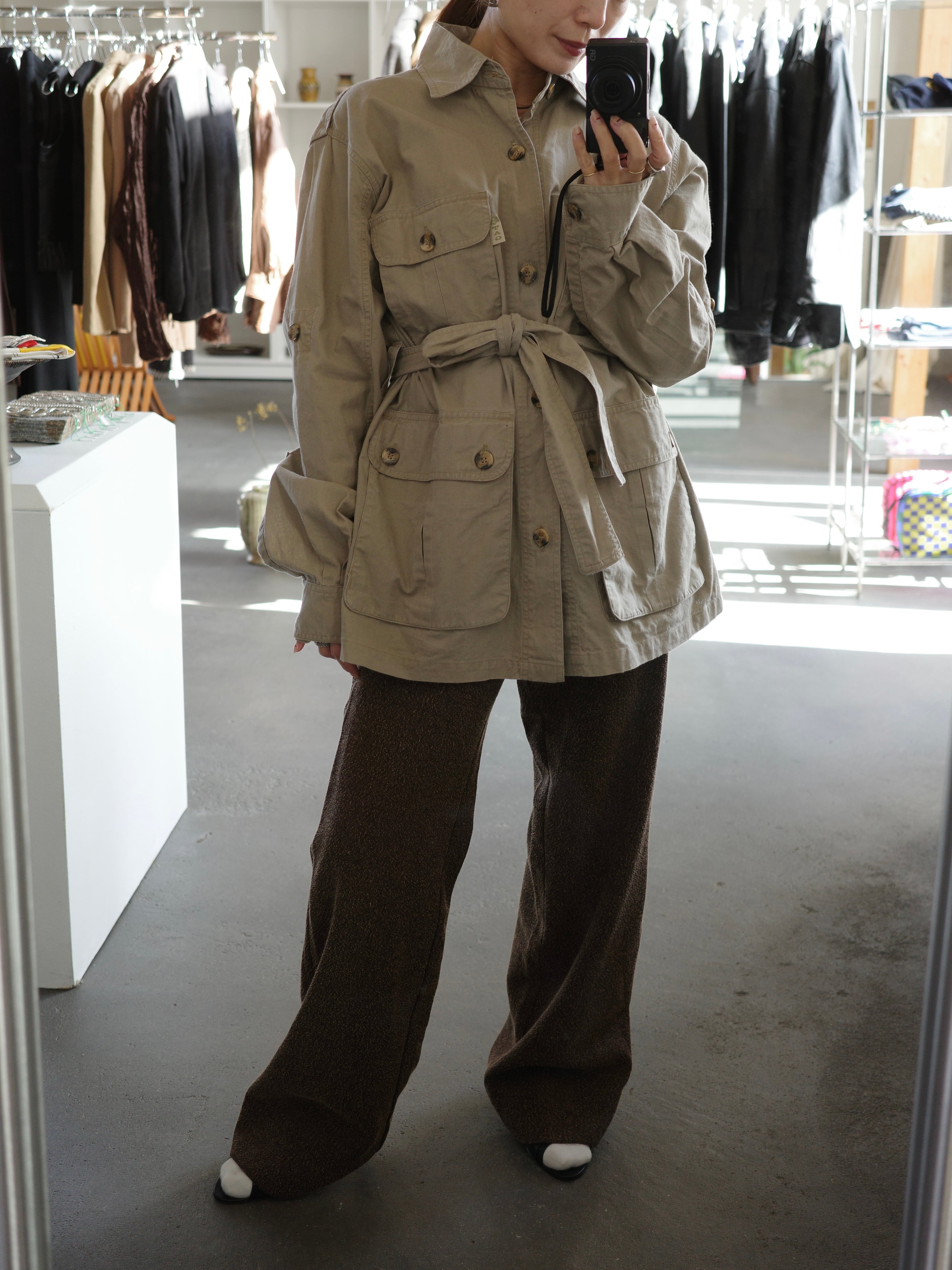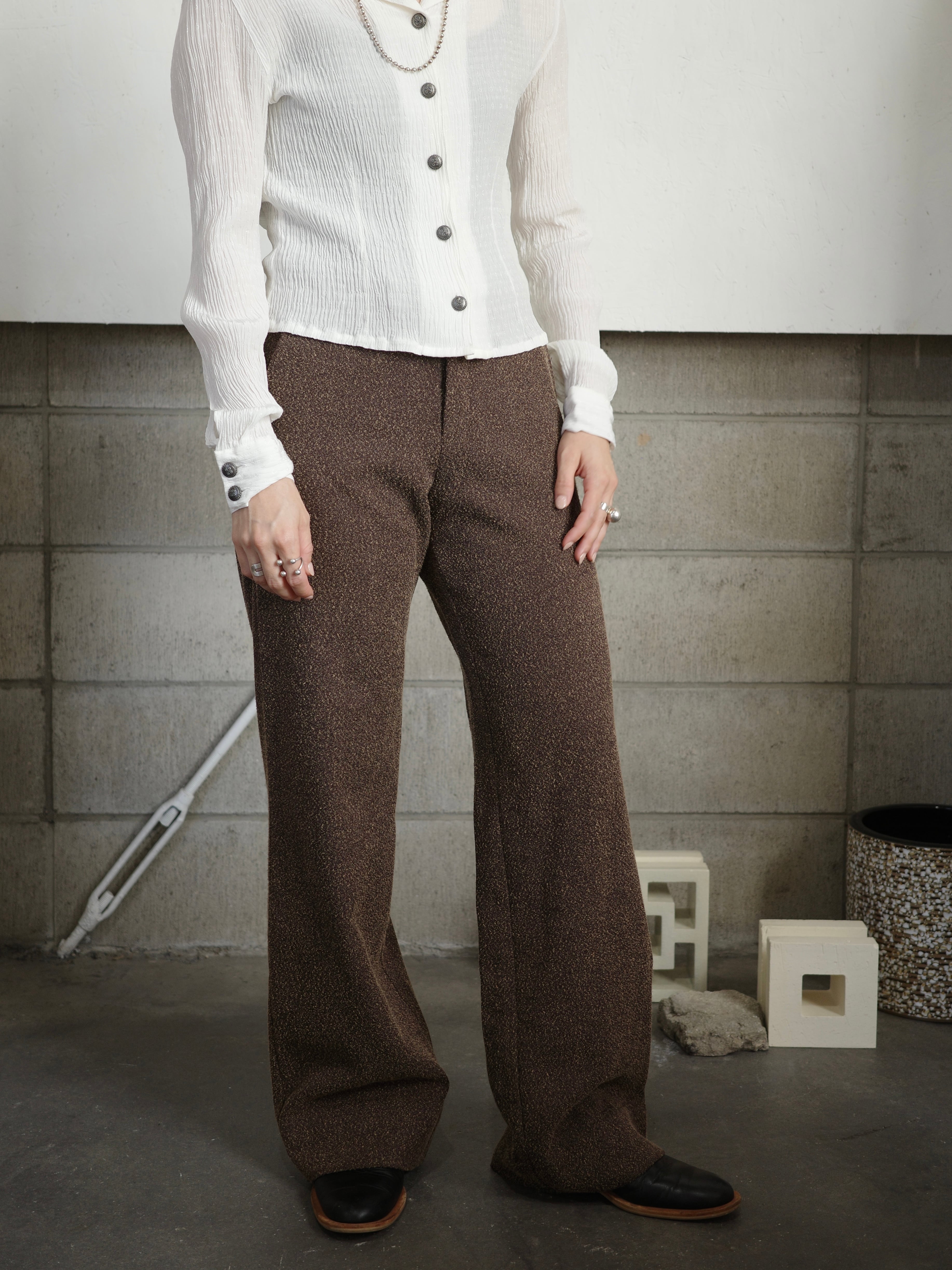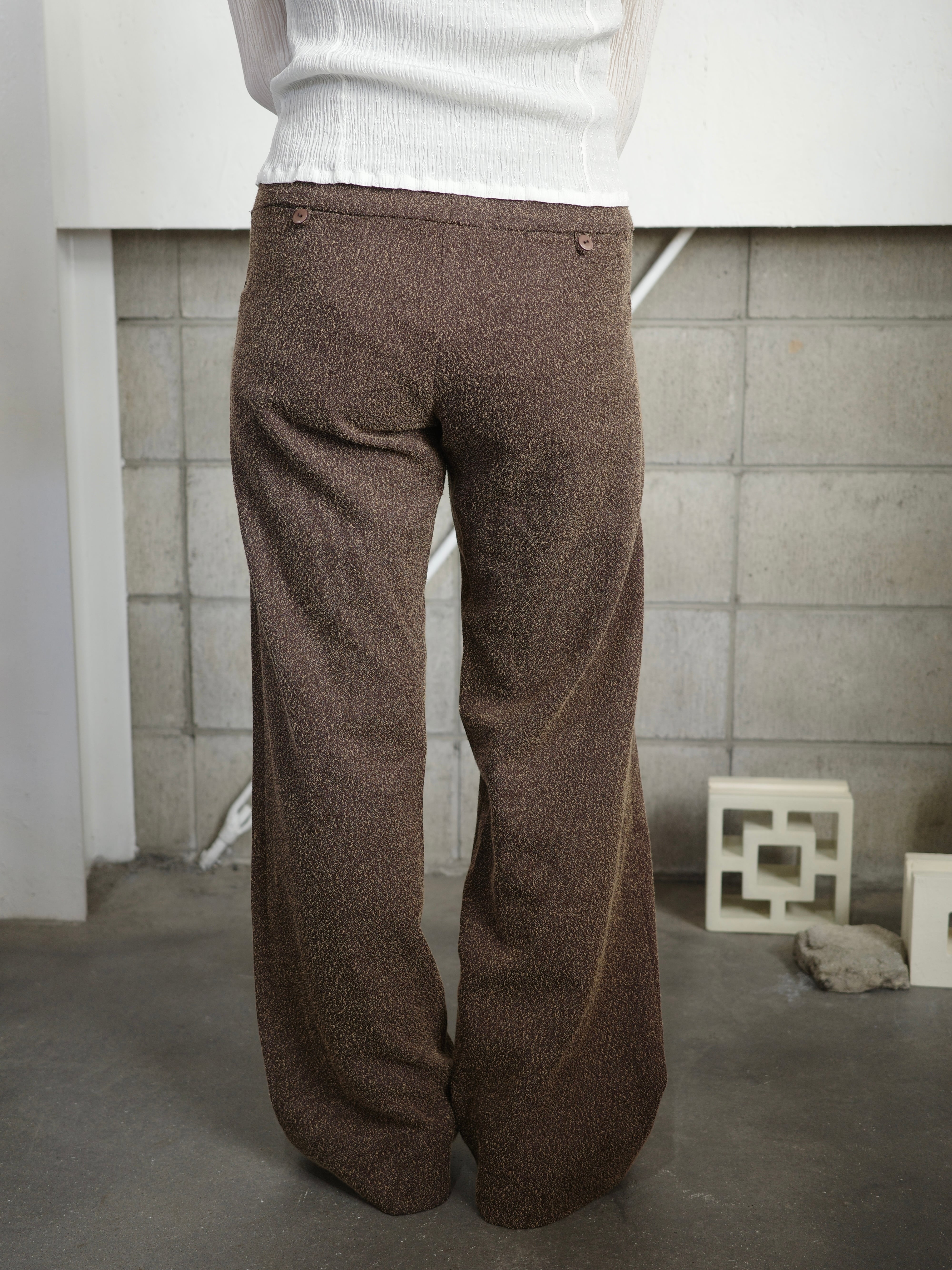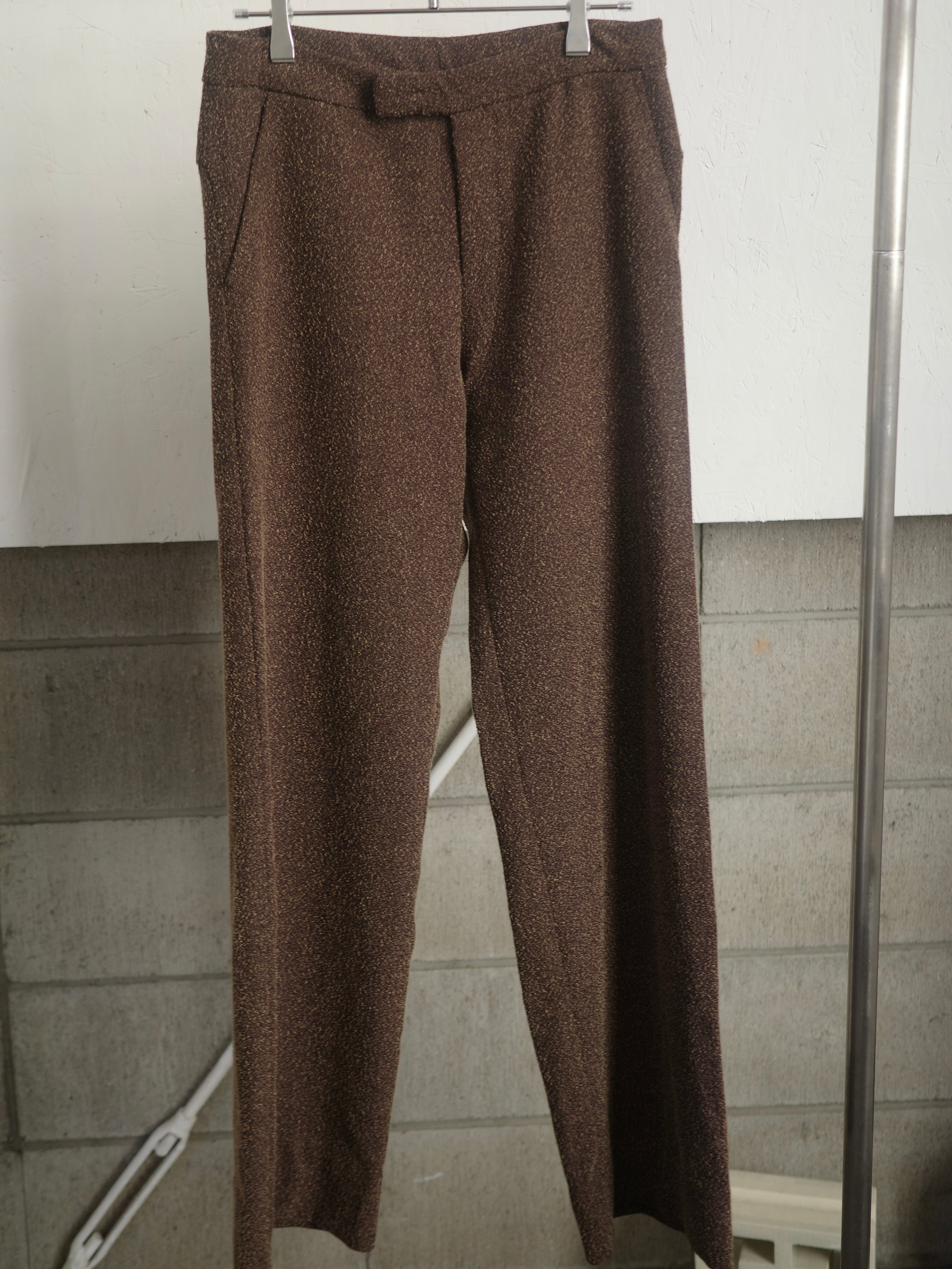 ブラウンにベージュの糸がミックスされた珍しい生地感のパンツです。股上はやや浅め、裾はややフレアになった形で、ほどよくゆるっと履いていただけます。