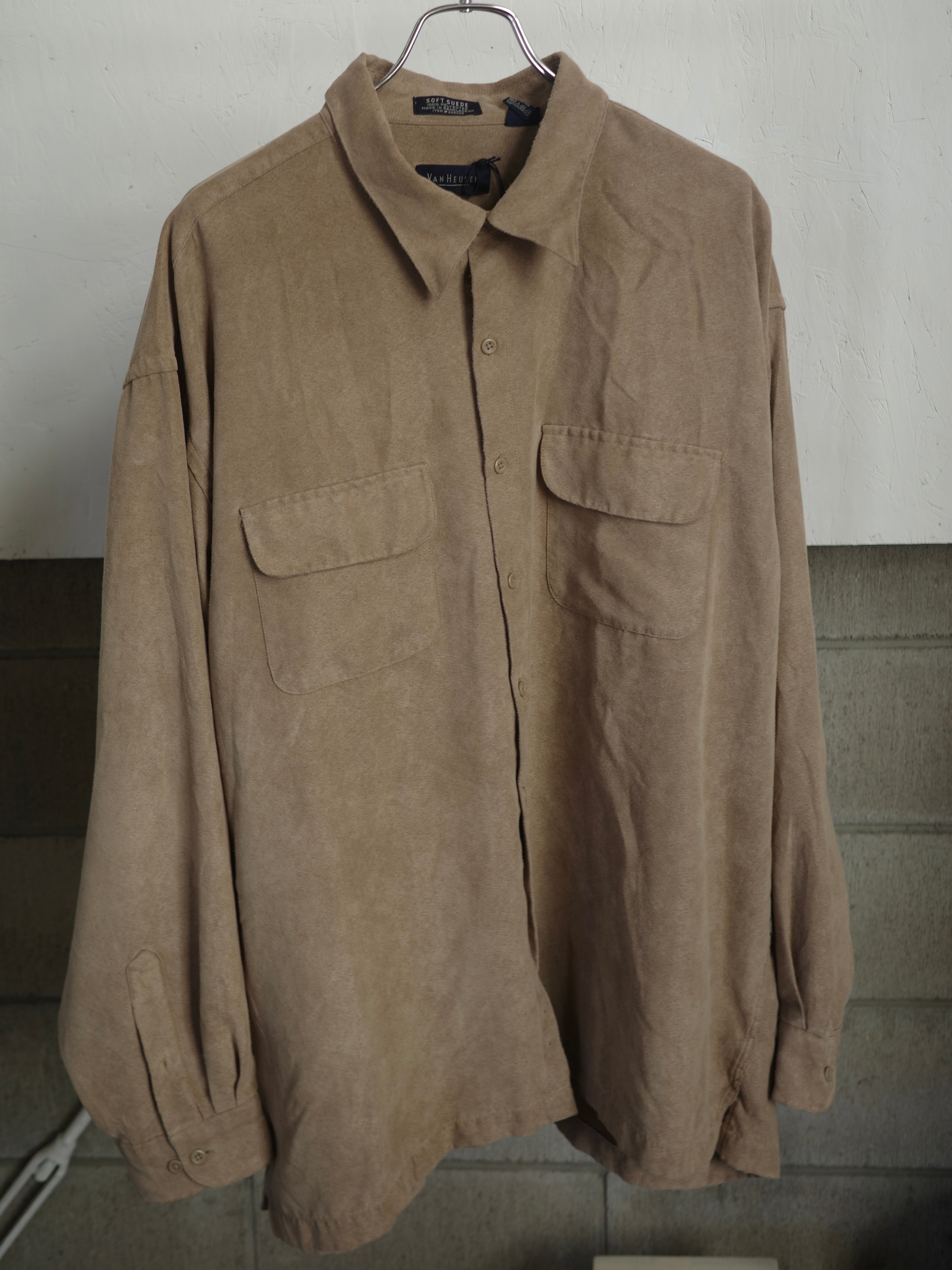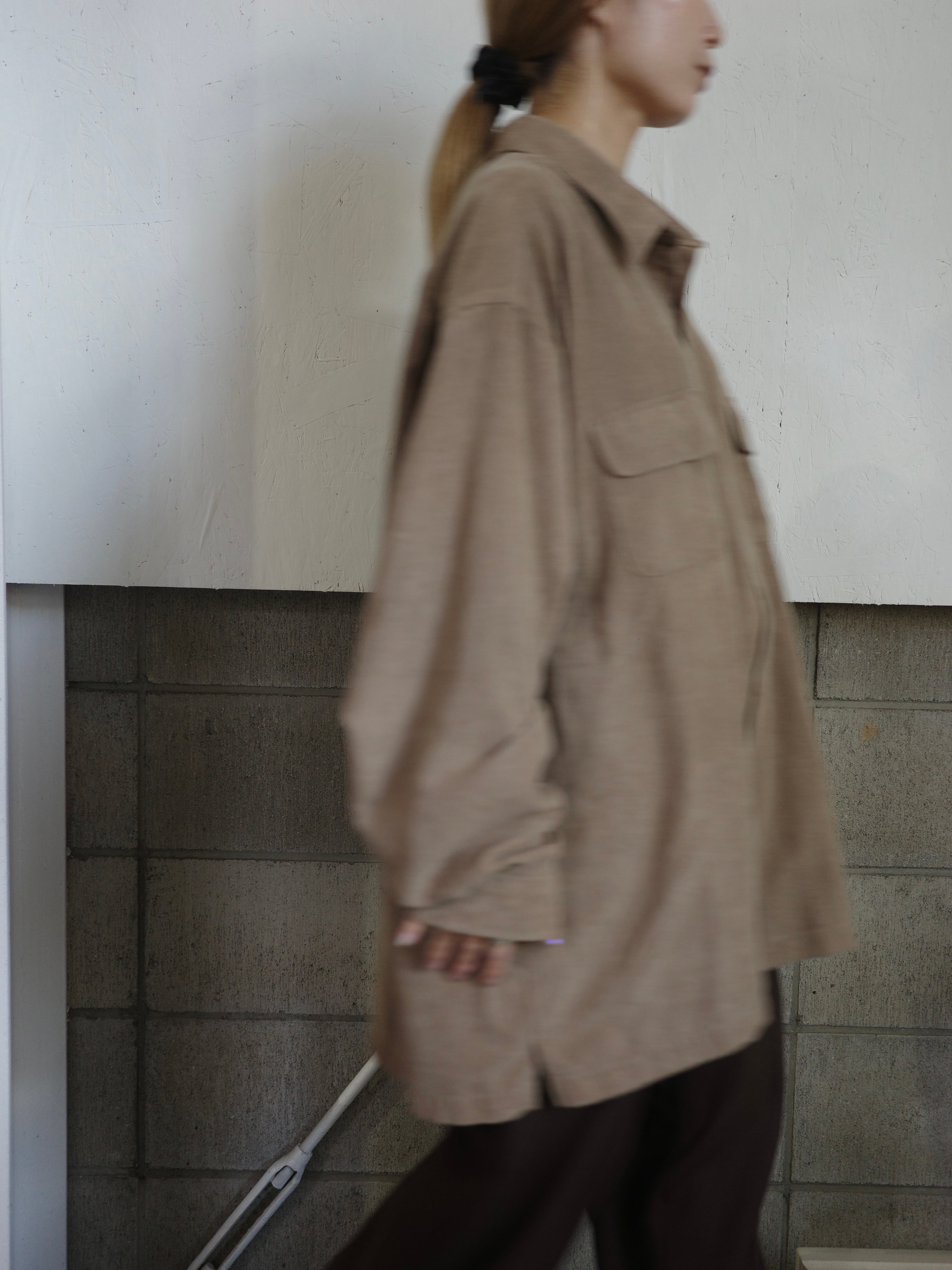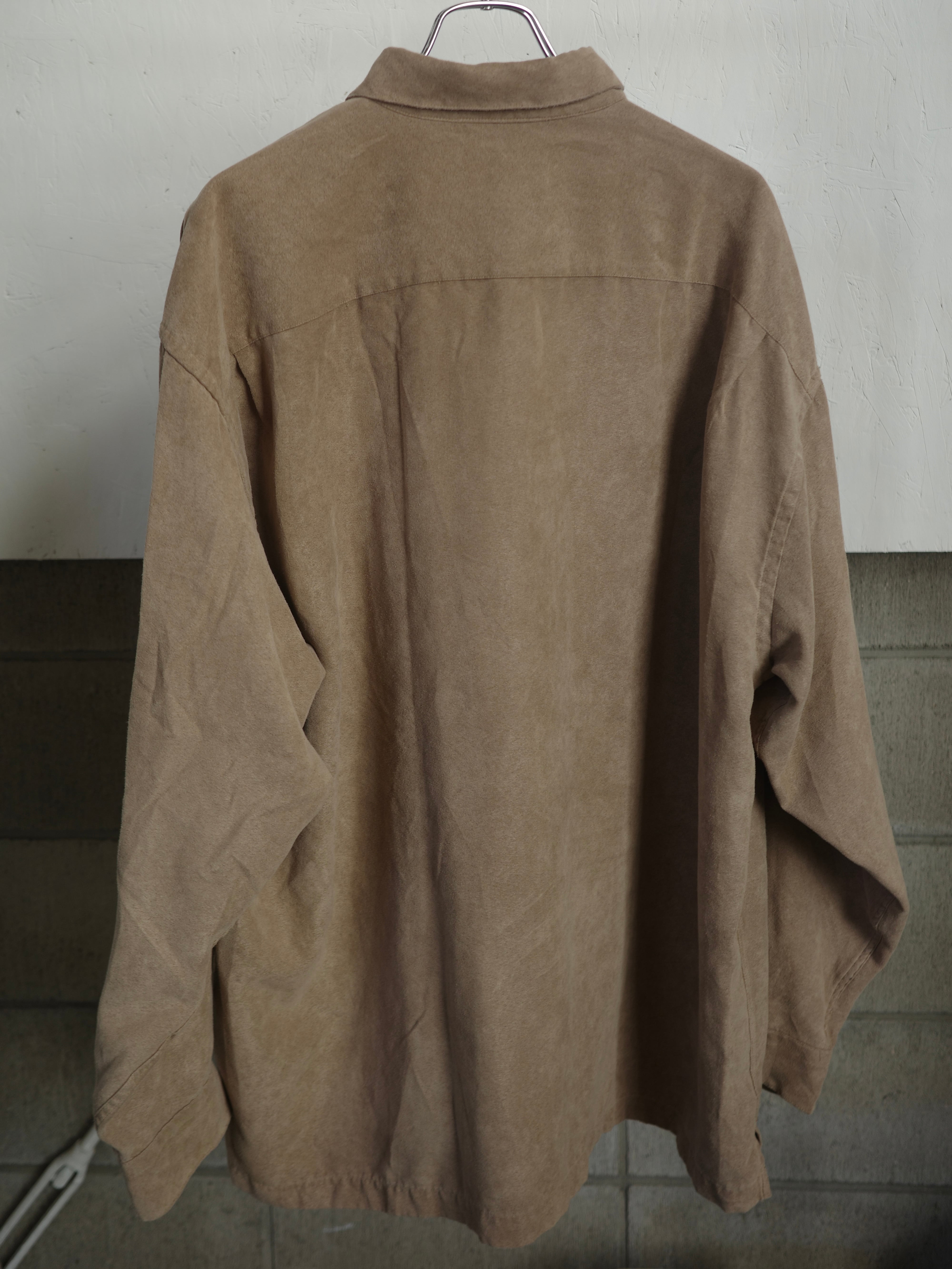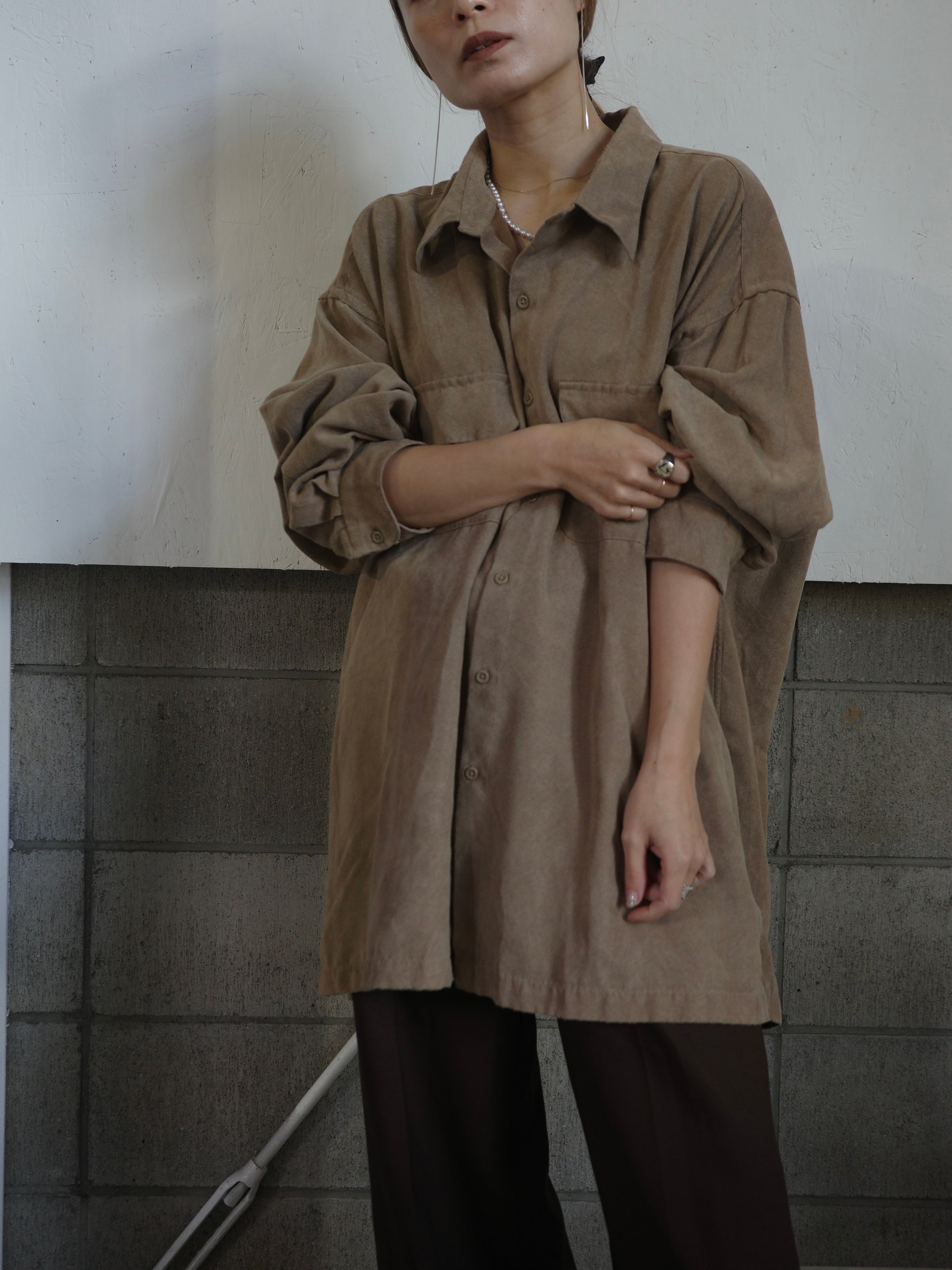オーバーシルエットのフェイクスエードのシャツです。フェイクとは思えないほど滑らかで柔らかい生地感で上品さがあります。女性がずるっと着るのも可愛いですし、男性も着ていただけるサイズ感です。