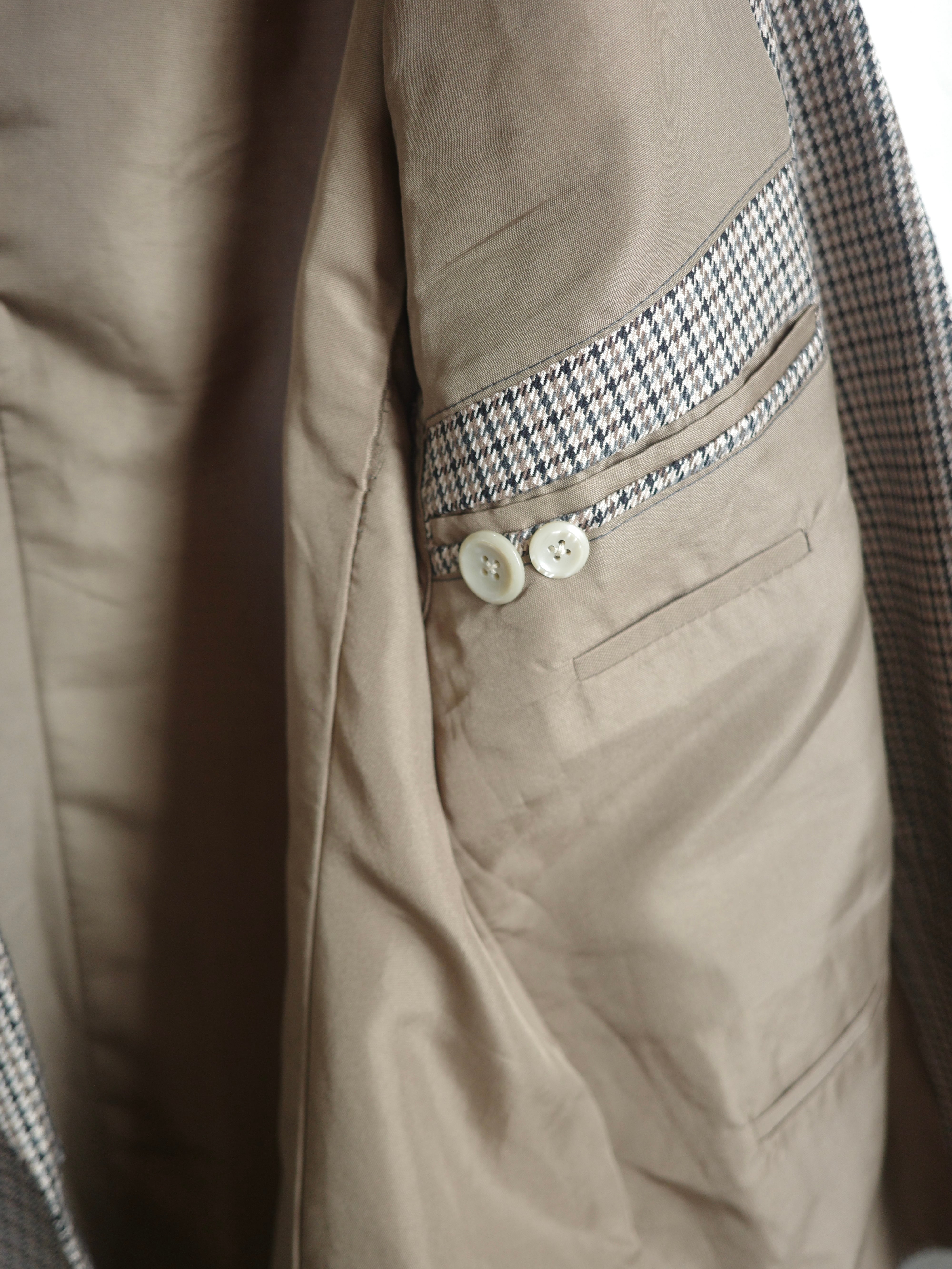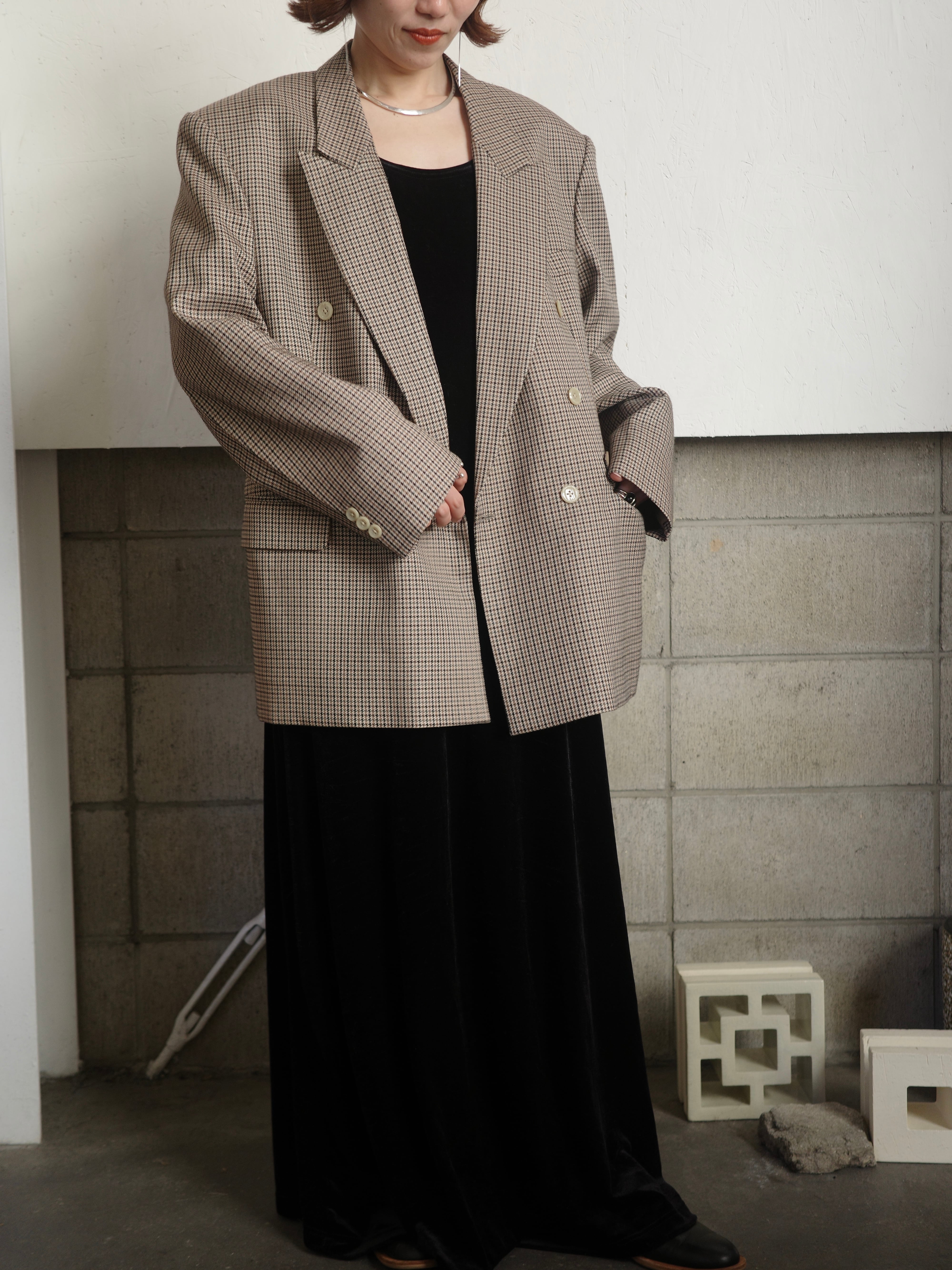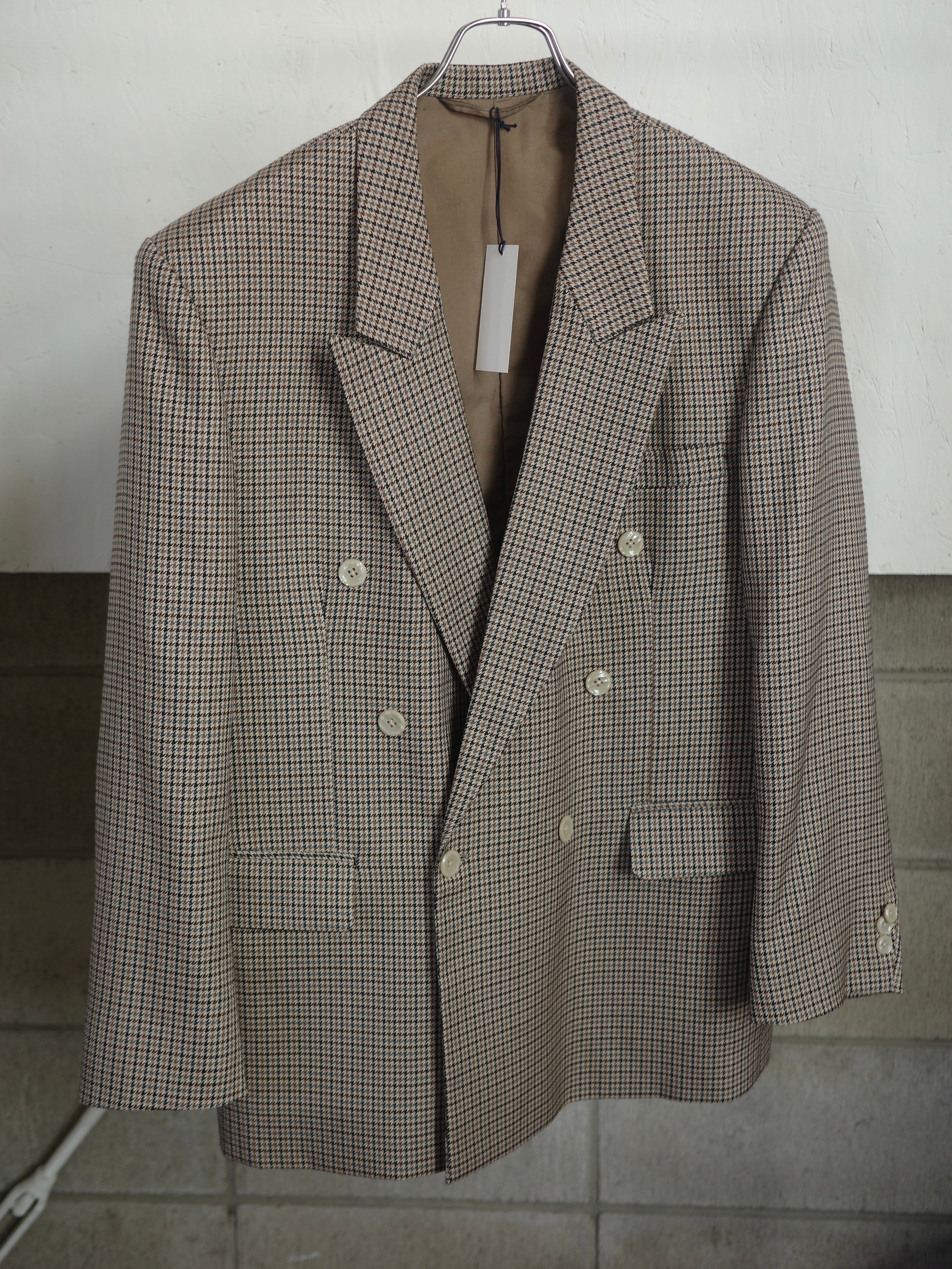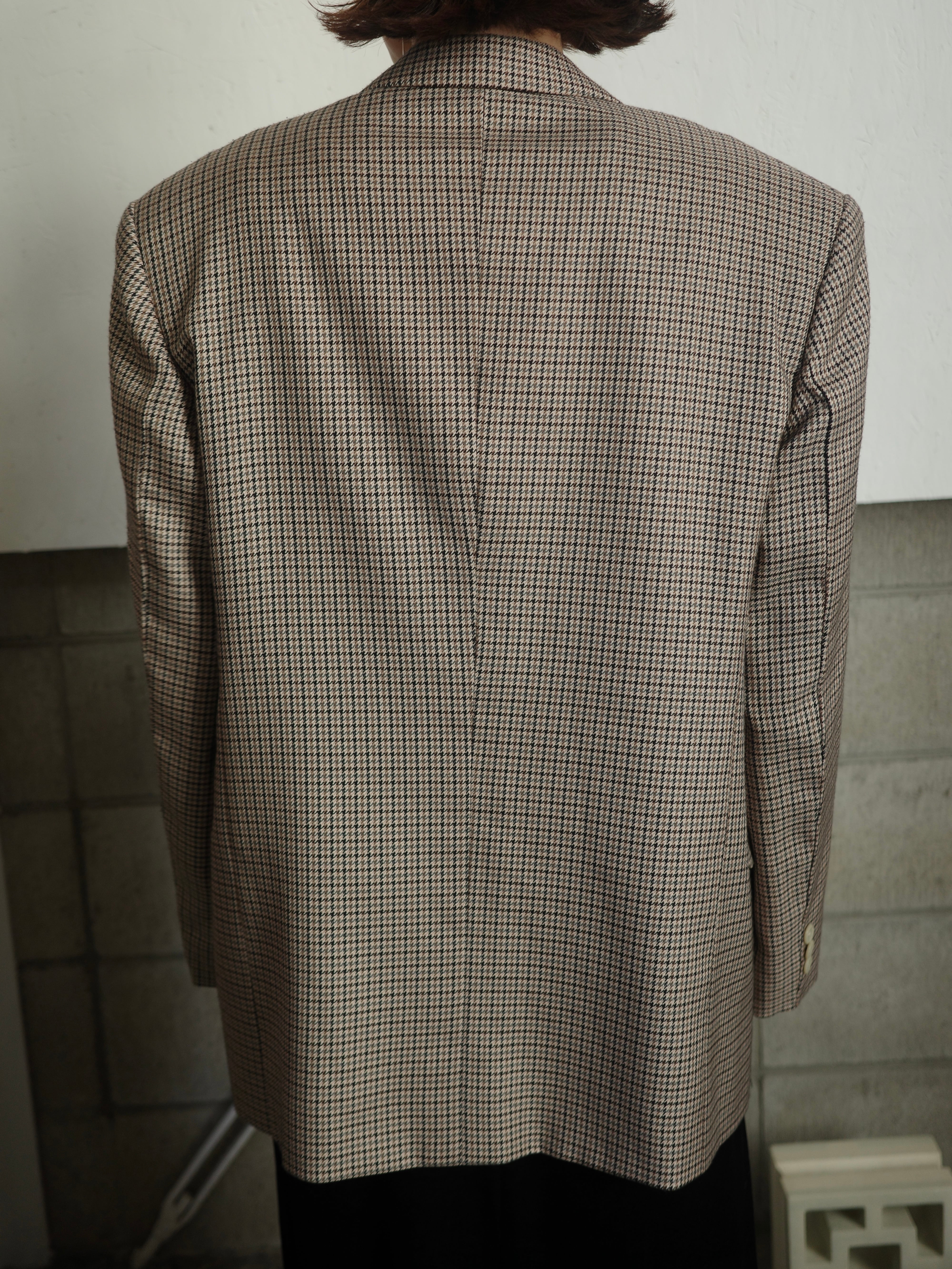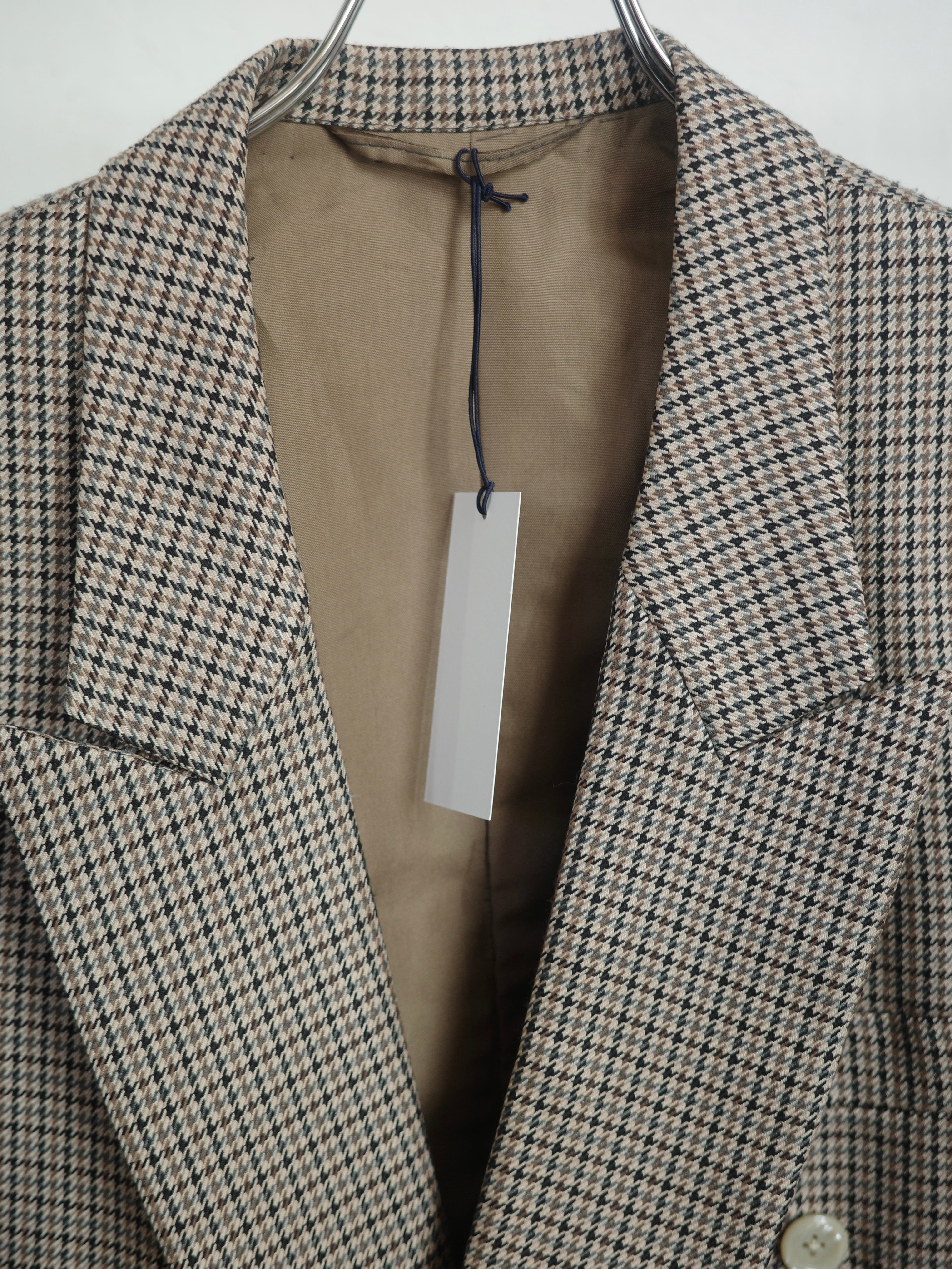 千鳥格子のチェック柄が上品なダブルのジャケットです。色がミックスされたチェックの色合いがとても素敵で、ベージュのボタンもレトロでアクセントになっています。