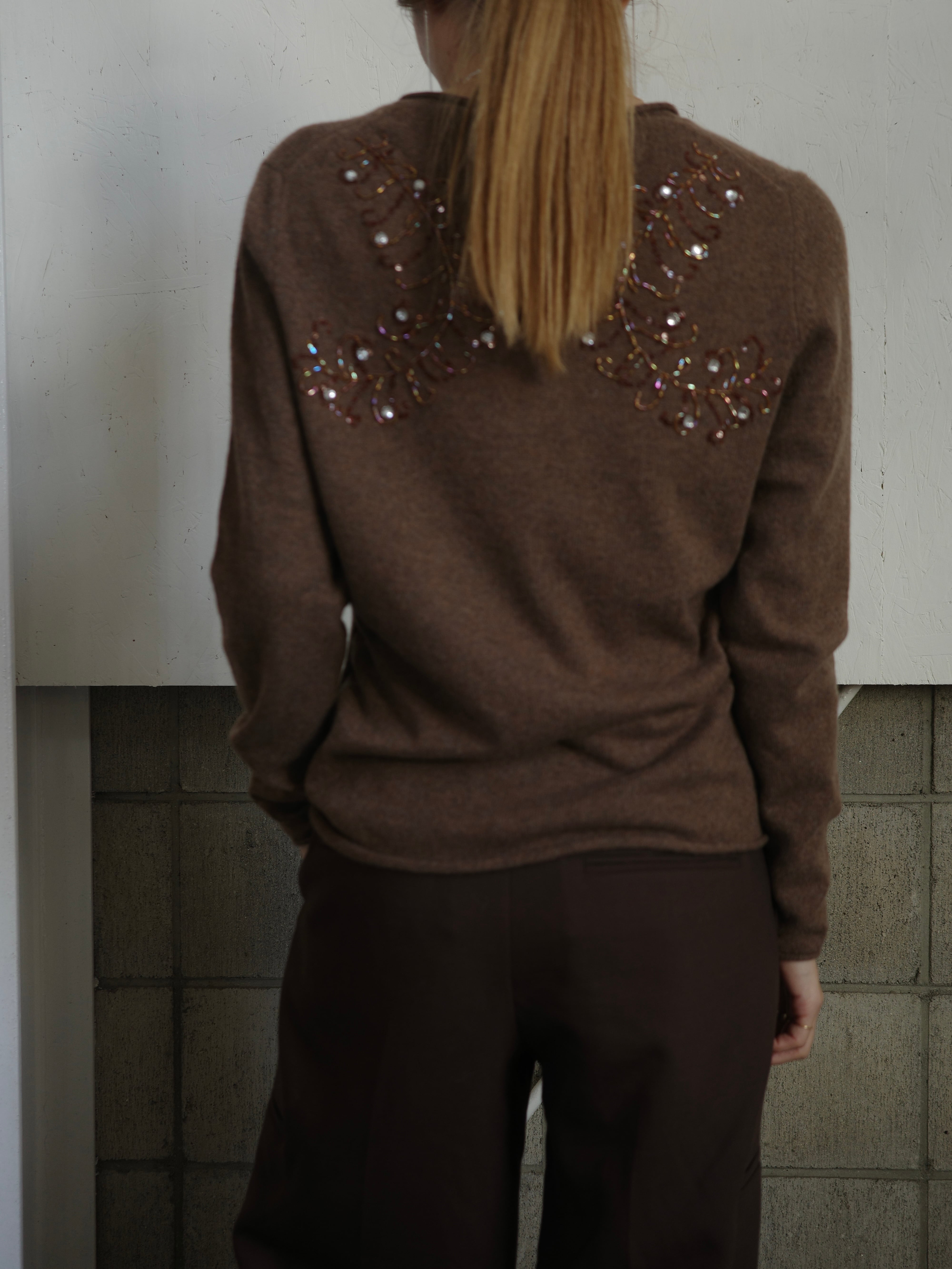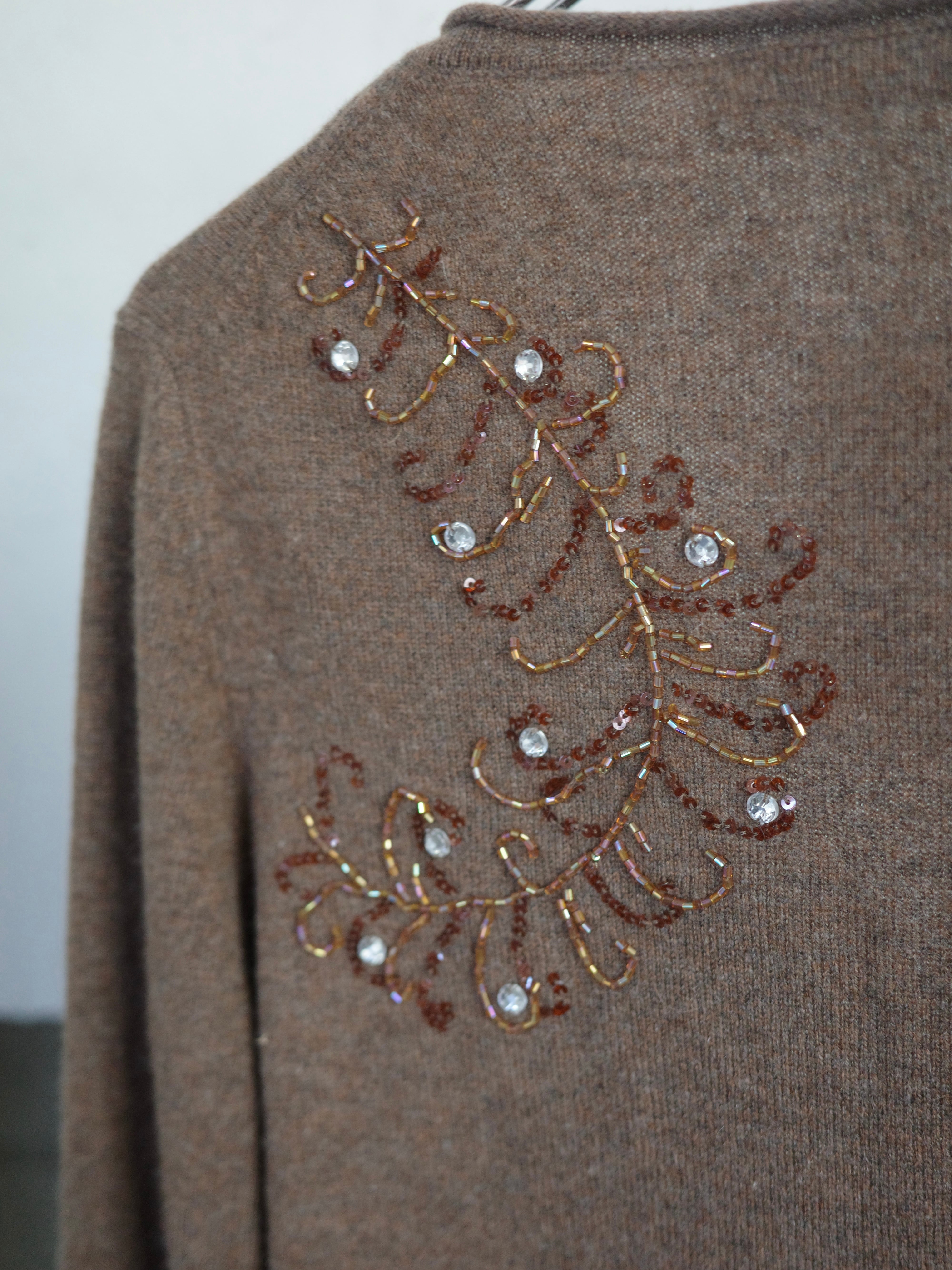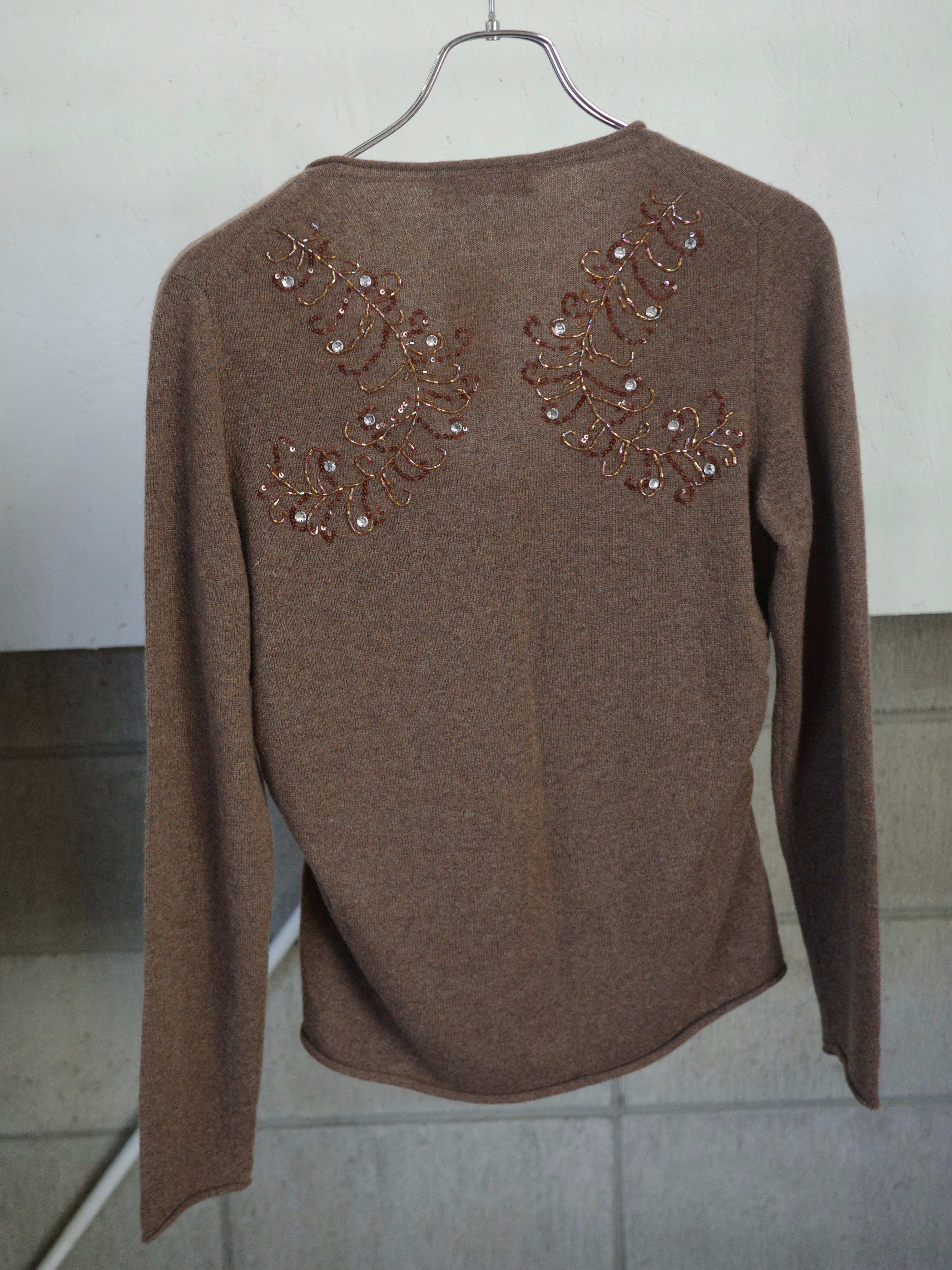 ビーズのモチーフがついたカシミアニットです。薄手なのに暖かく、インナーとしてとっても重宝するアイテムです。