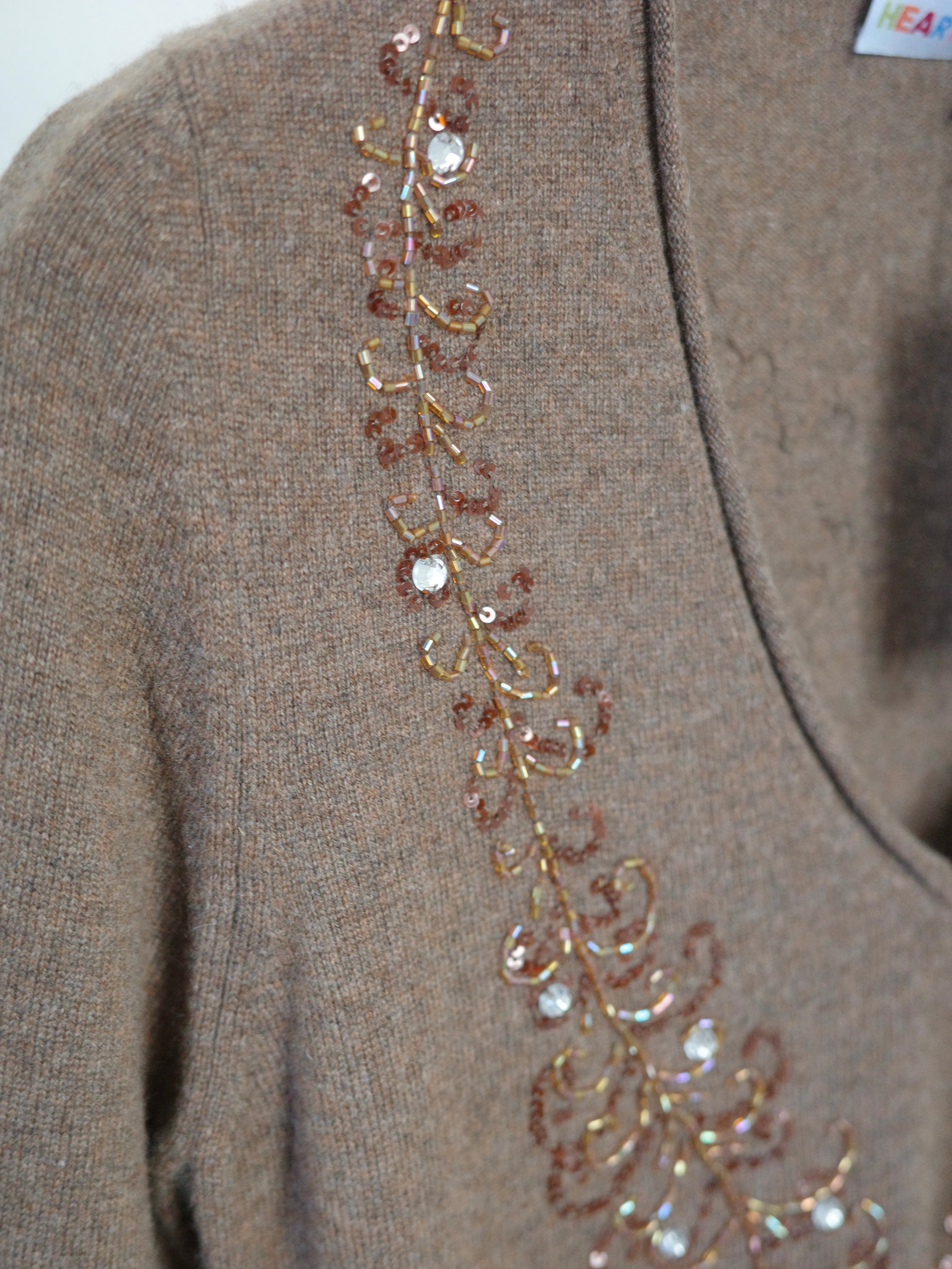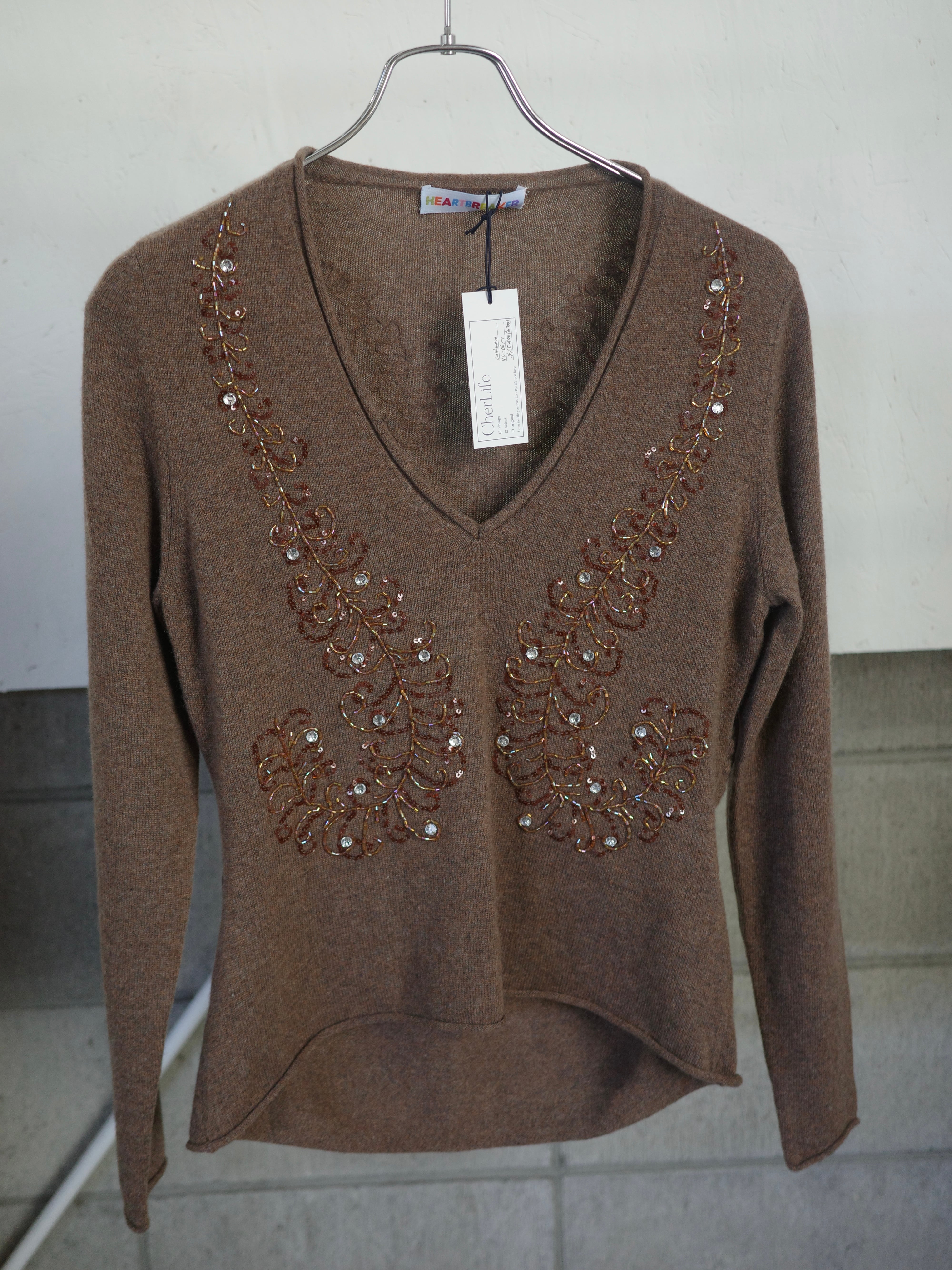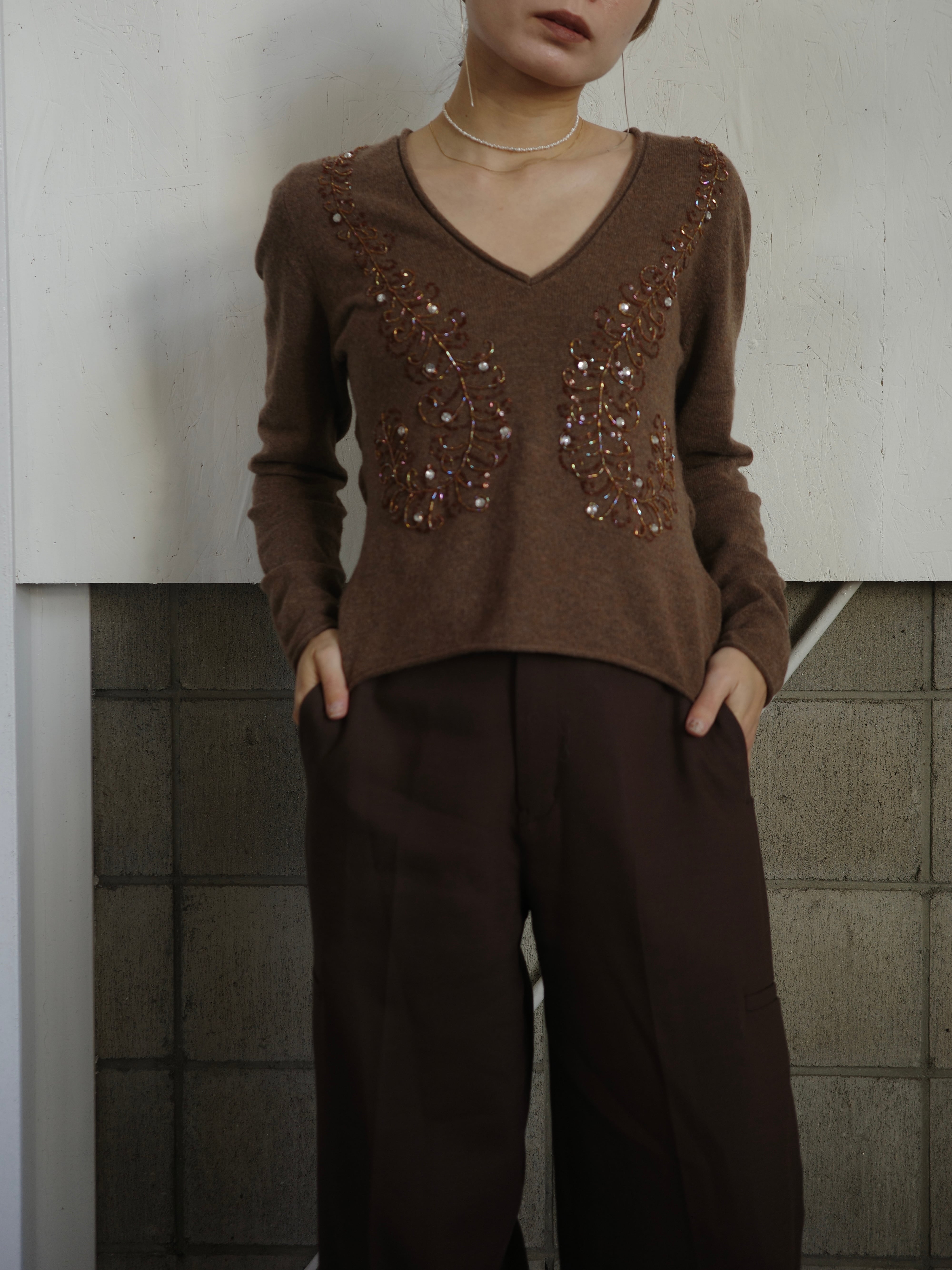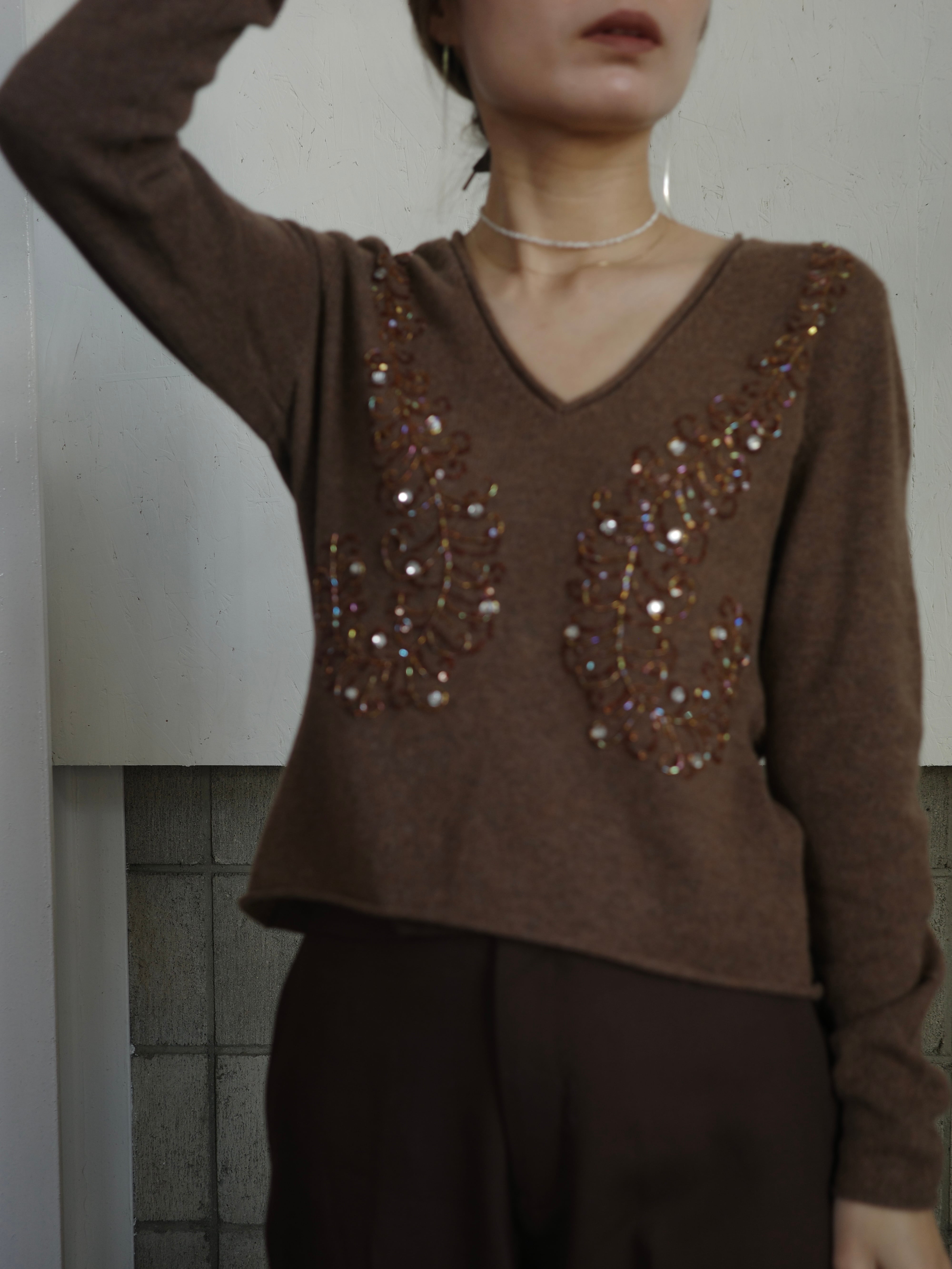 ビーズのモチーフがついたカシミアニットです。薄手なのに暖かく、インナーとしてとっても重宝するアイテムです。