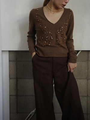 華やかなビーズ刺繍がとても美しく、やや深めのV開きと短丈のバランスが綺麗で、ワイドなボトムとの相性抜群です。