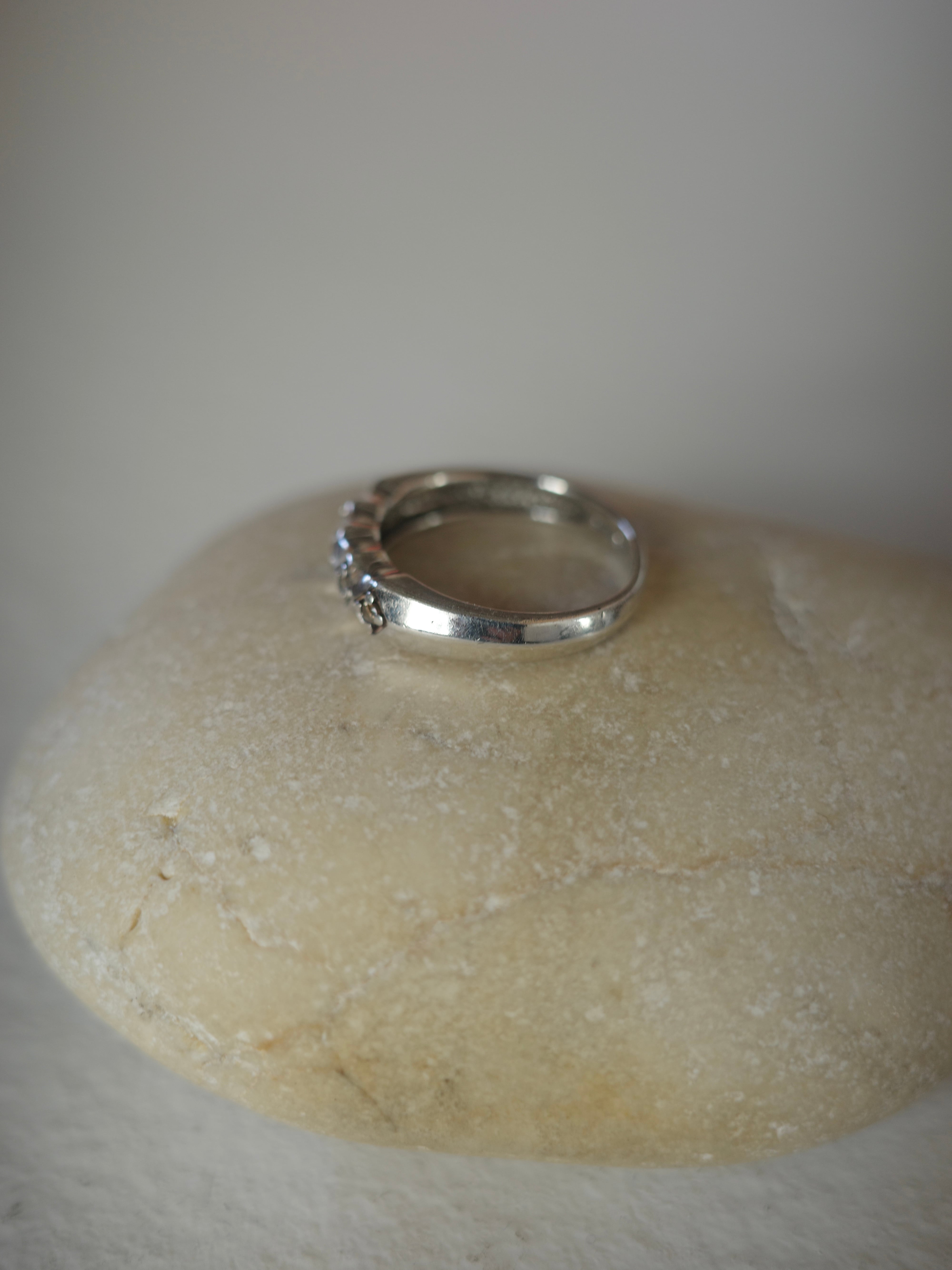 アメリカより仕入れたヴィンテージリングです。菱形の5つのモチーフに小さなダイヤが埋め込まれていて、とっても綺麗に輝きます。ボリューム感がありながらも上品さのあるデザインです。