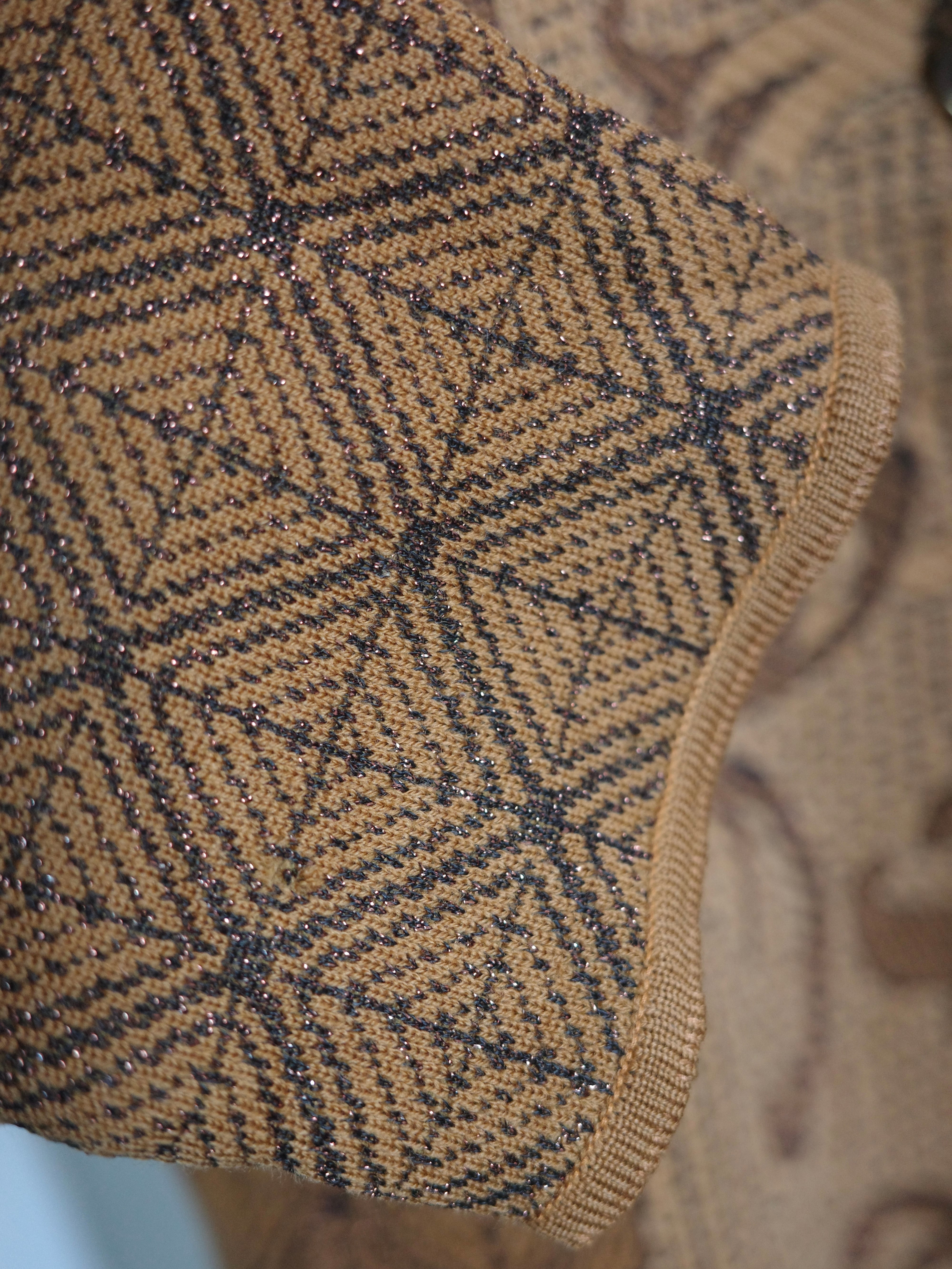 ESCADAのニットジャケット。襟周りの柄、裾と袖の柄、中央のお花モチーフと場所によって異なる織柄が美しくアートのようなアイテムです。ブラウンの濃淡のコントラストが素敵で、ラメ糸も織られていて華やかで上品な印象になります。目の詰まったしっかりとした生地感で、着丈も長めなので軽めのアウターとしてはもちろん、寒い時期は前を閉めてカーディガンのように着て、上から重めのアウターを羽織っていただけます。