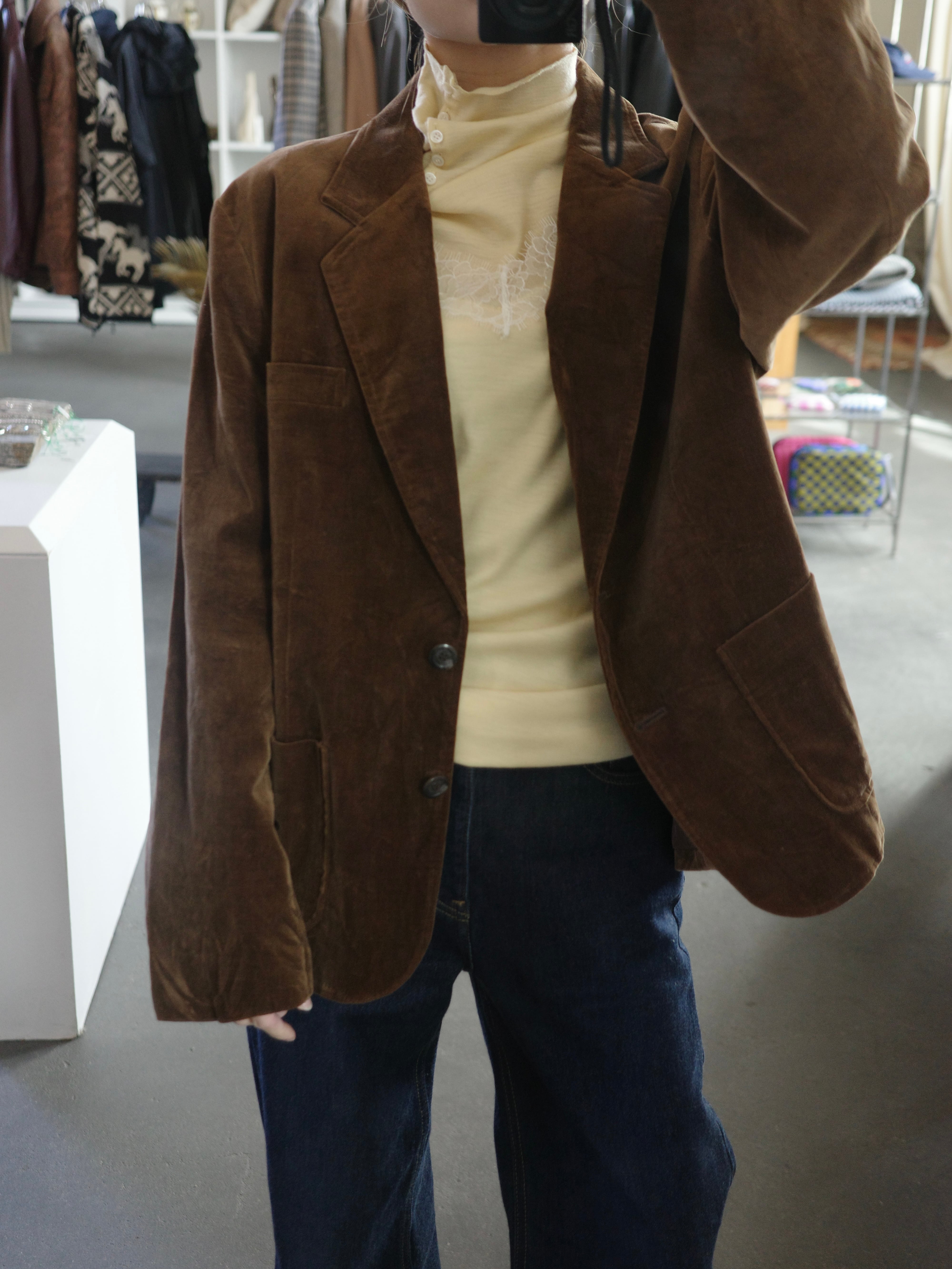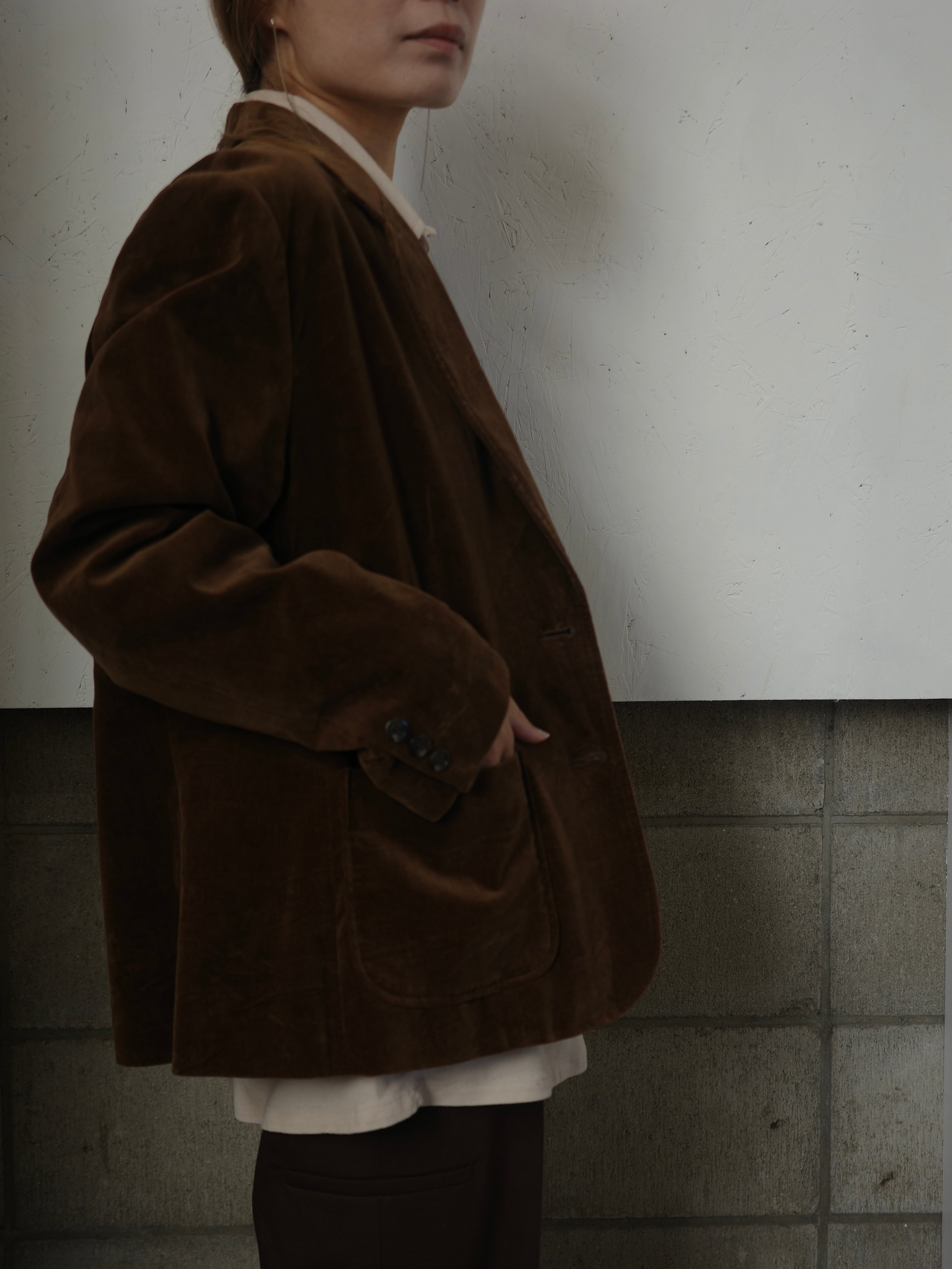 こっくりブラウンカラーのベルベットジャケットです。シンプルなデザイン、シルエットで合わせていただきやすいアイテム。素材感と色合いが上品で、コーデイネートがしまります。軽いので着心地も抜群です。