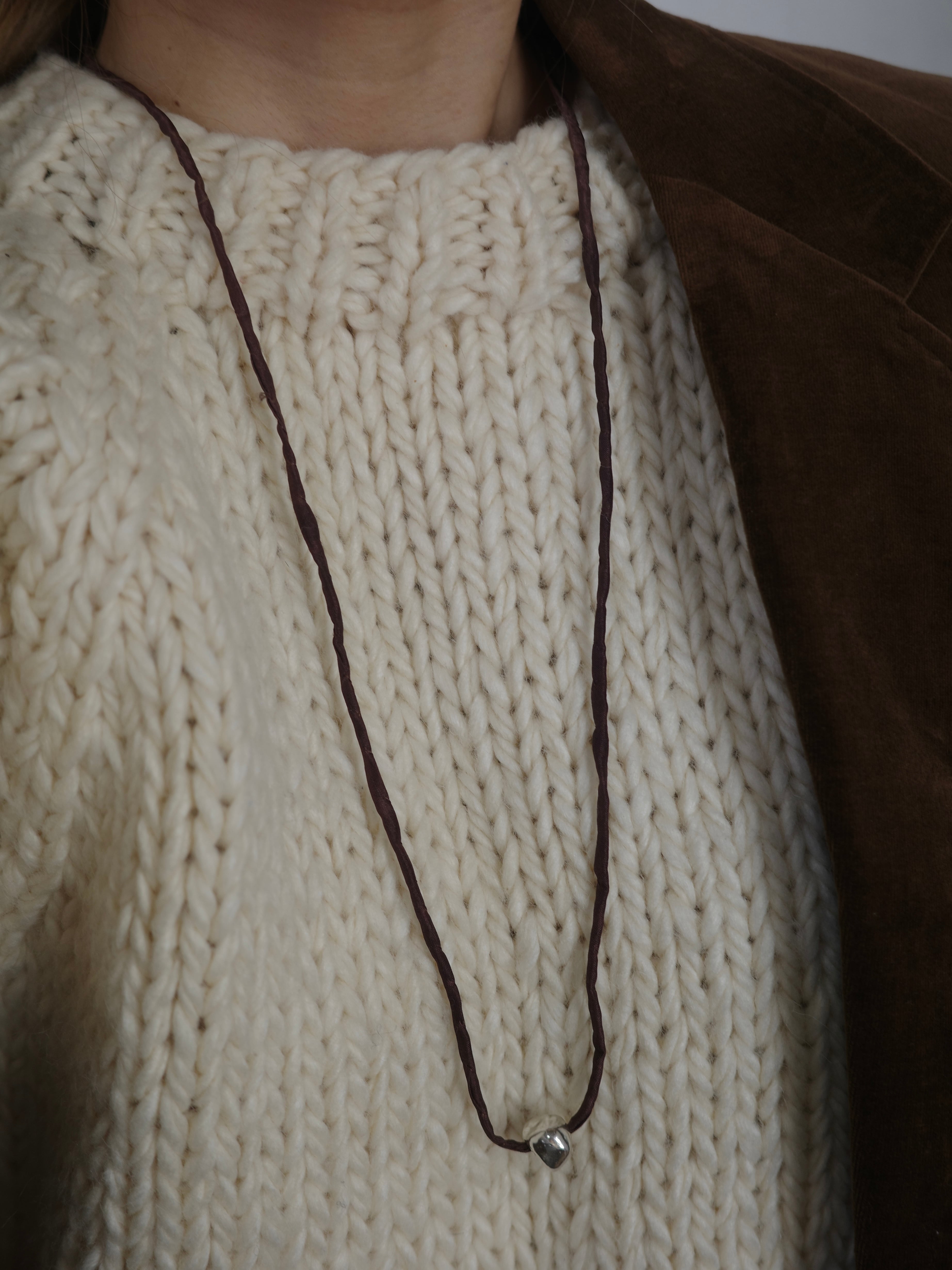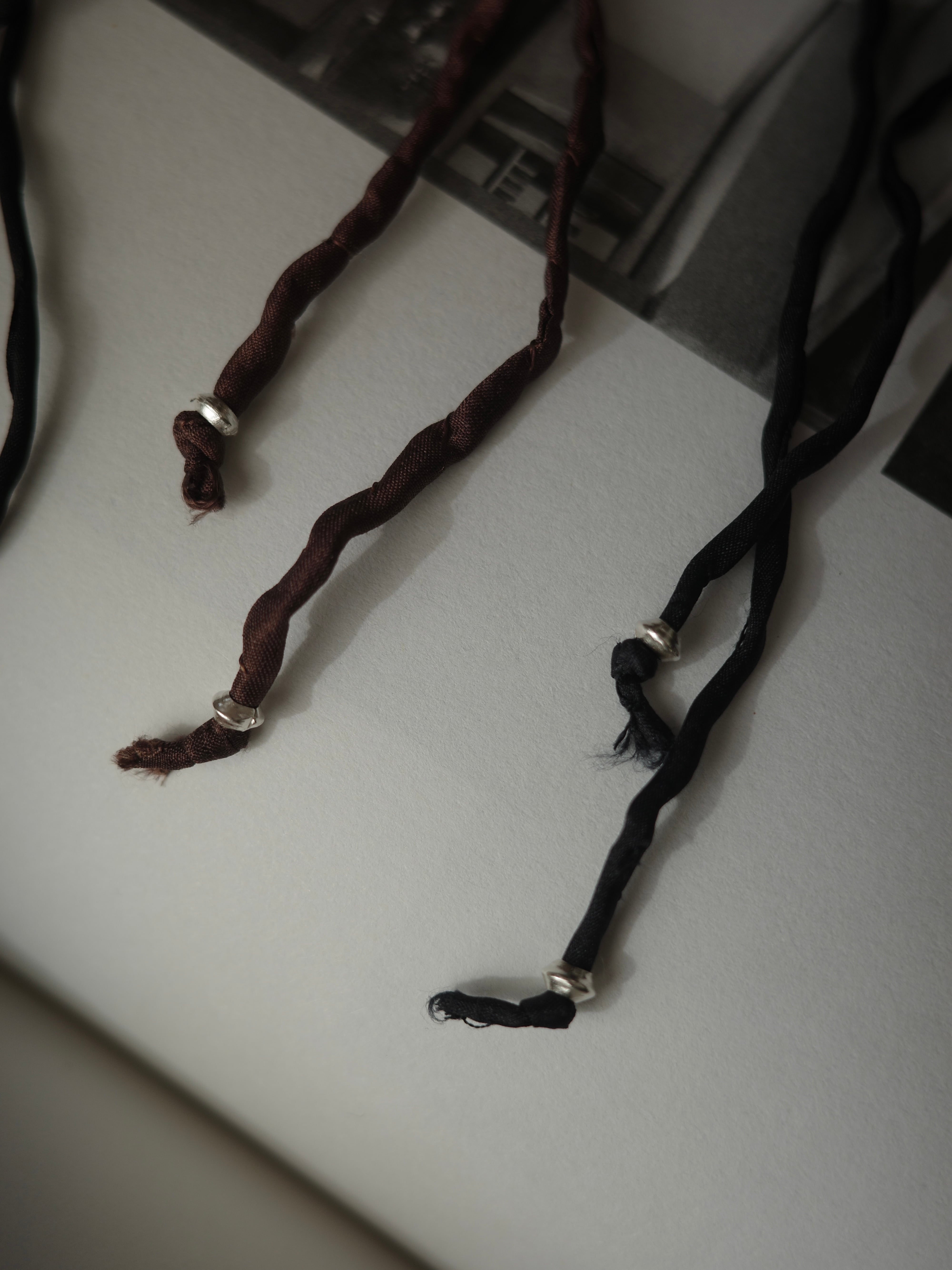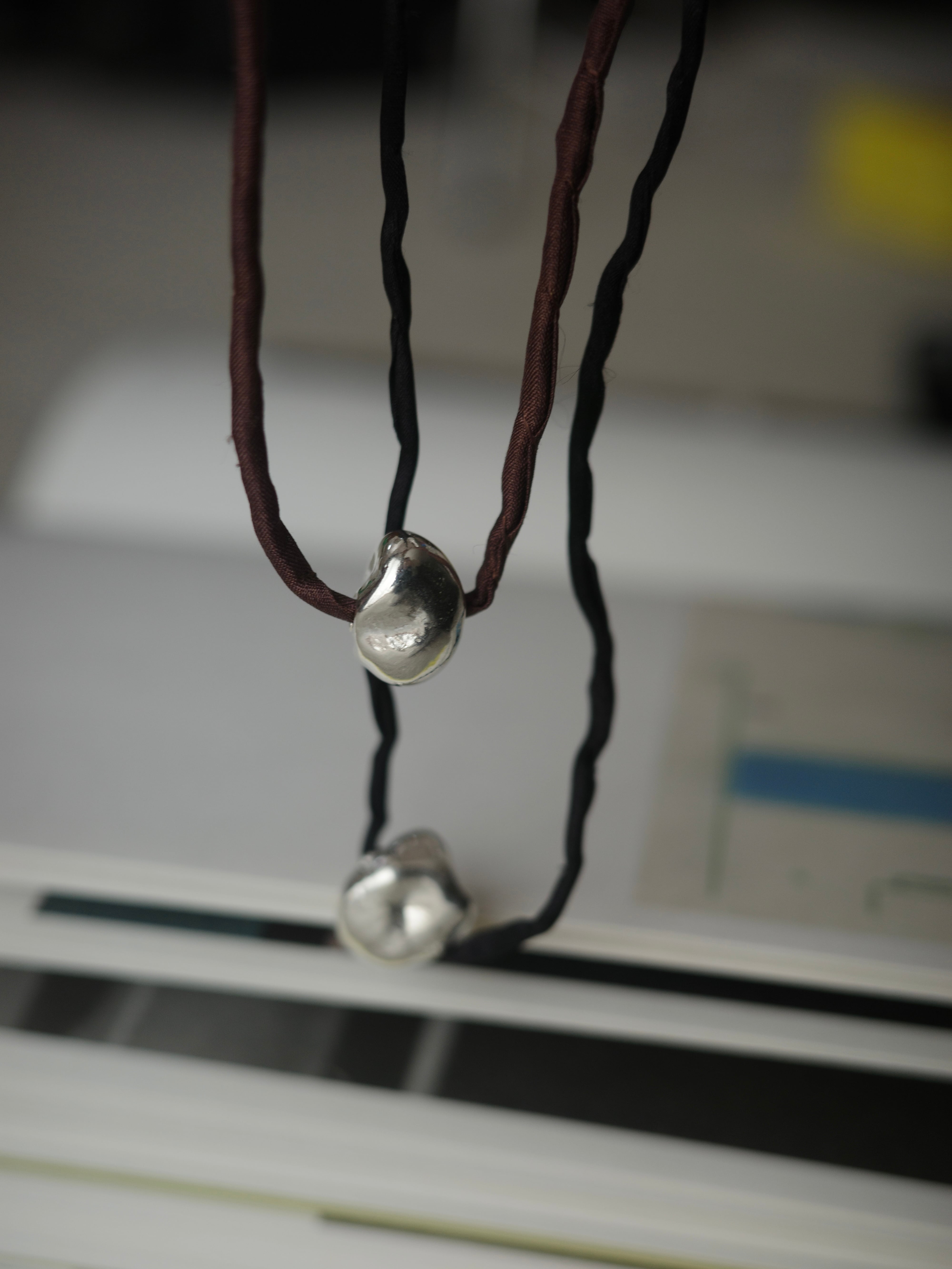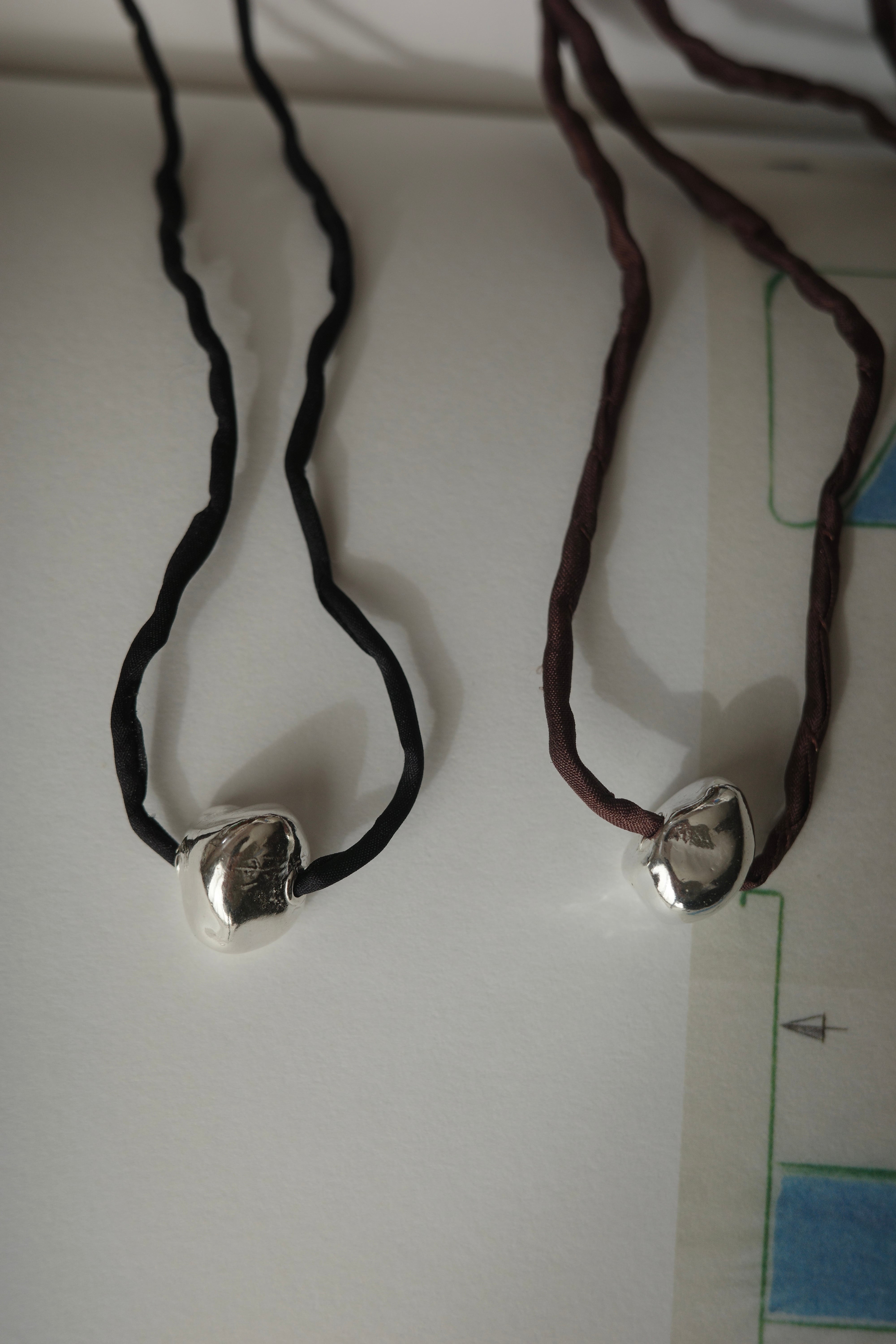 毎回人気なシルクコードネックレスの新作です。今回は石ころのような歪な形のシルバービーズを通したデザインで、立体的で存在感のあるデザインがコーデイネートのアクセントになります。シルクコードはお好きな位置で結んで長さ調節していただけます。
