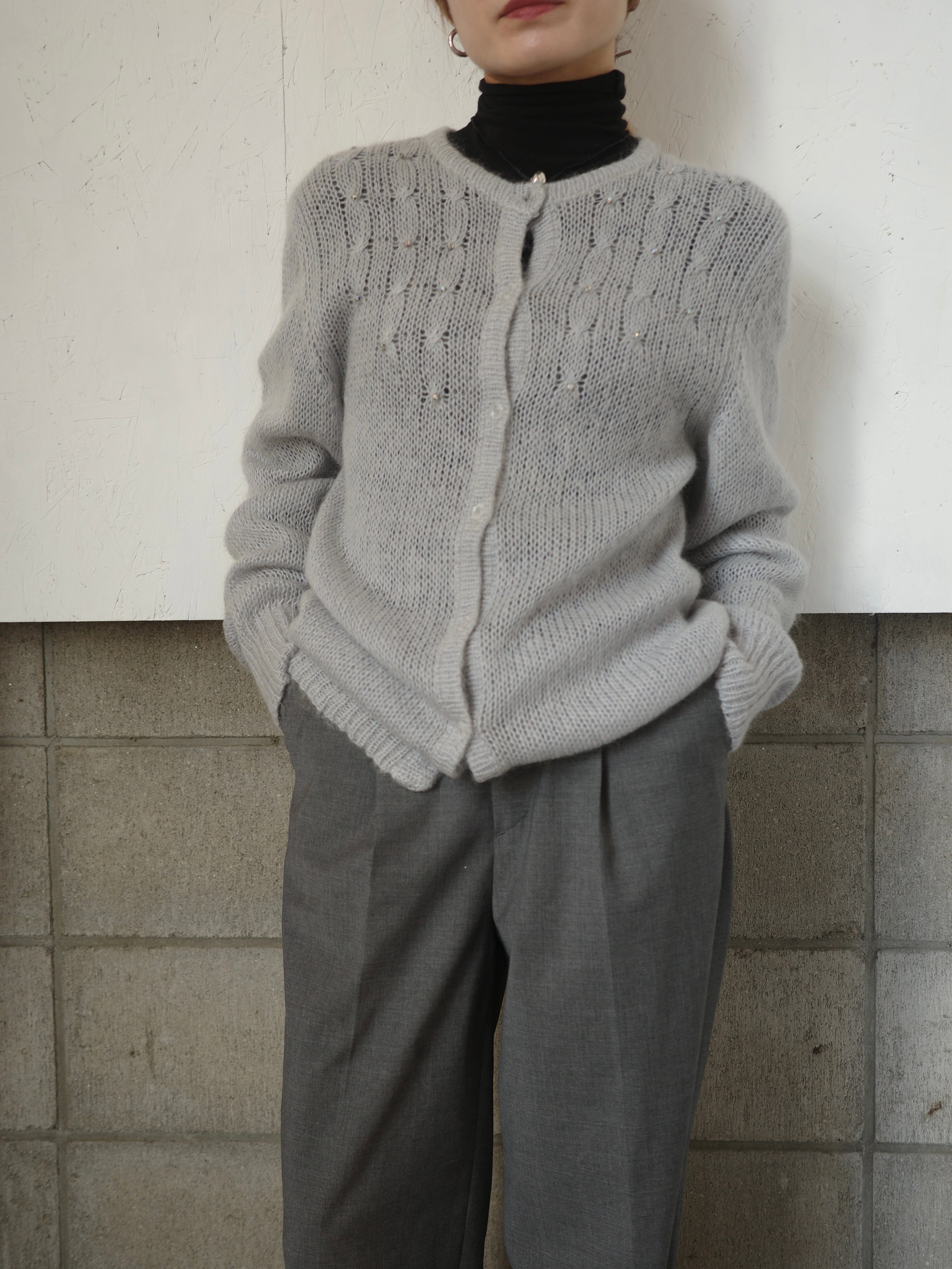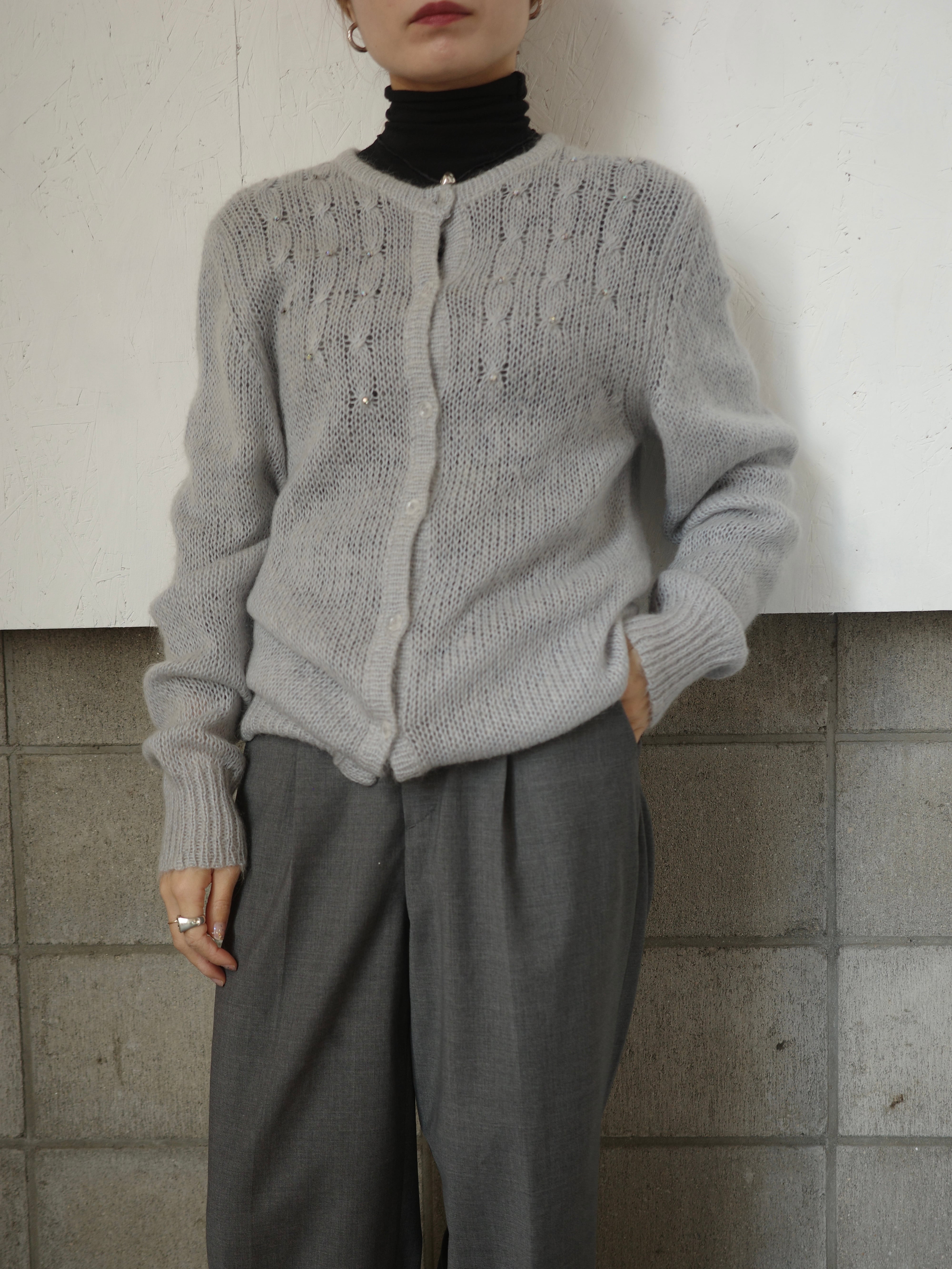 ビジューが散りばめられたモヘアのニットカーデイガンです。ざっくりした編み目にふわっと毛足の長いキッドモヘアが柔らか位印象に。ゆるっとしたシルエットで、インナーに色物やタートルネックを入れて重ね着していただくと素敵です。