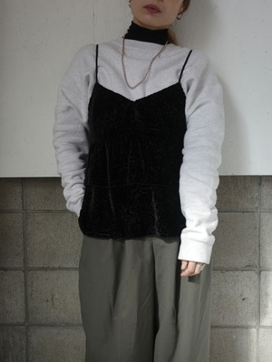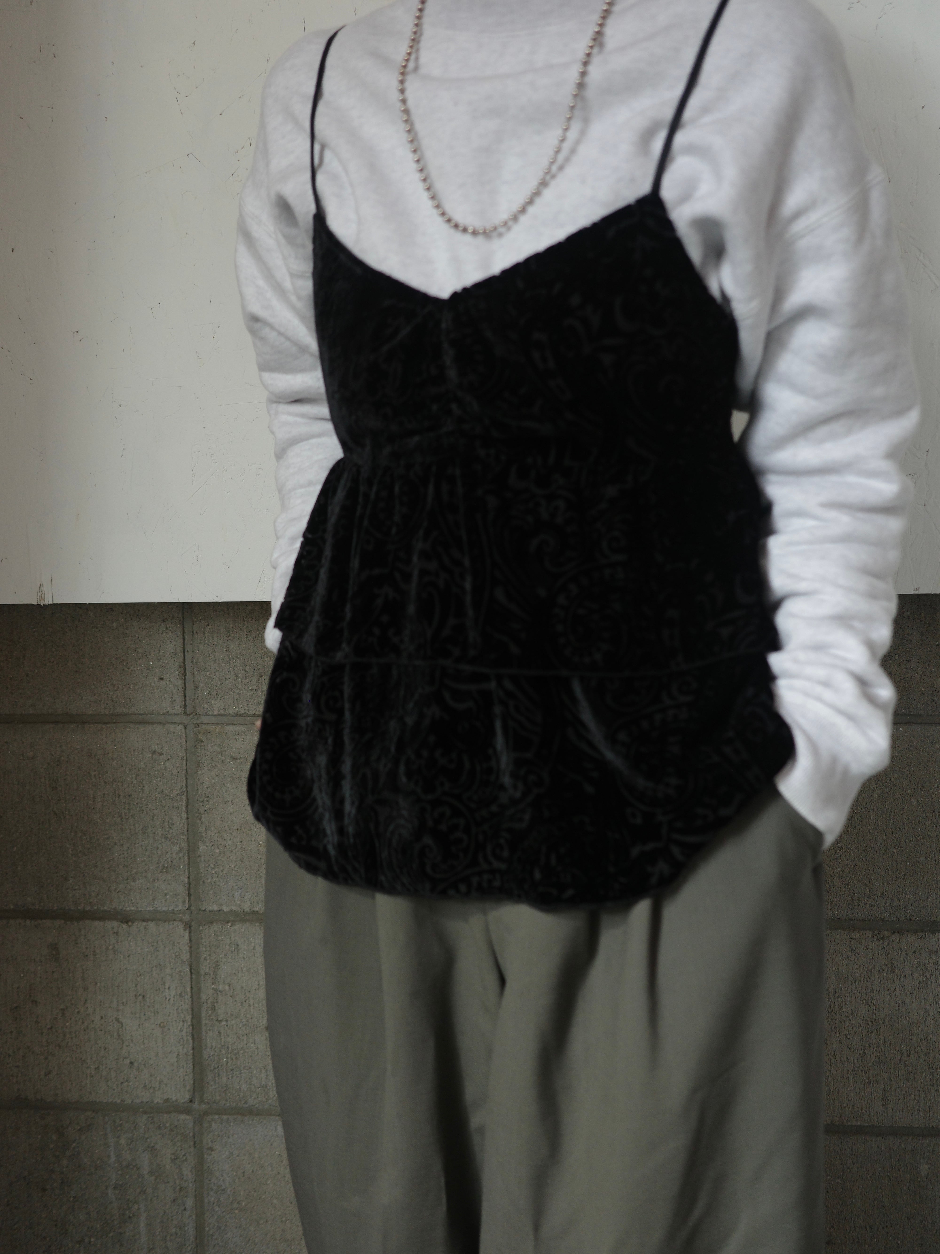 ベルベット素材のペイズリー柄デザインのフレアキャミです。上品で女性らいいデザインなので、普段はあえてカジュアルなアイテムに重ねても良いですし、タートルネックやブラウスと合わせていただくと綺麗めに着ていただけます。