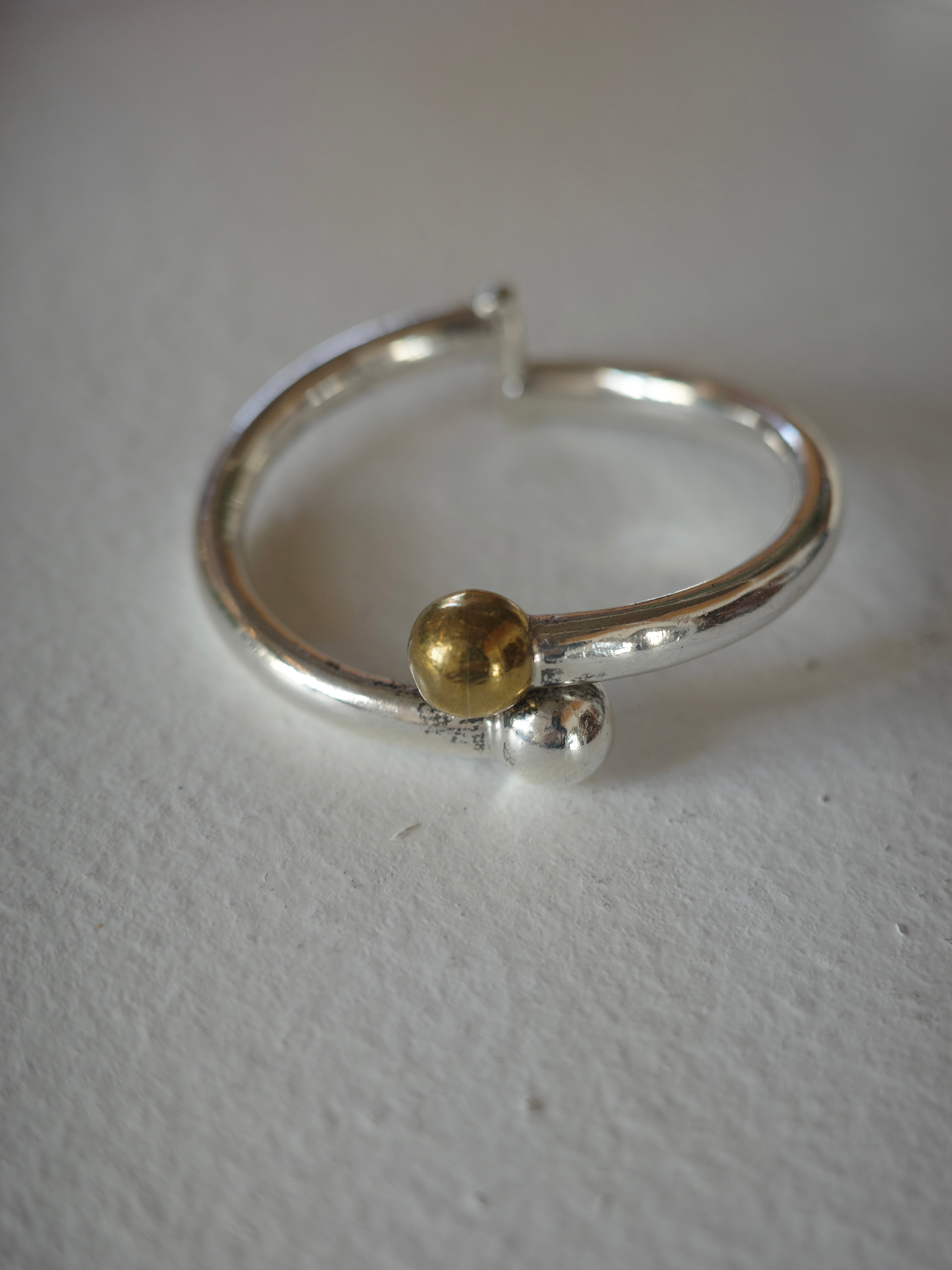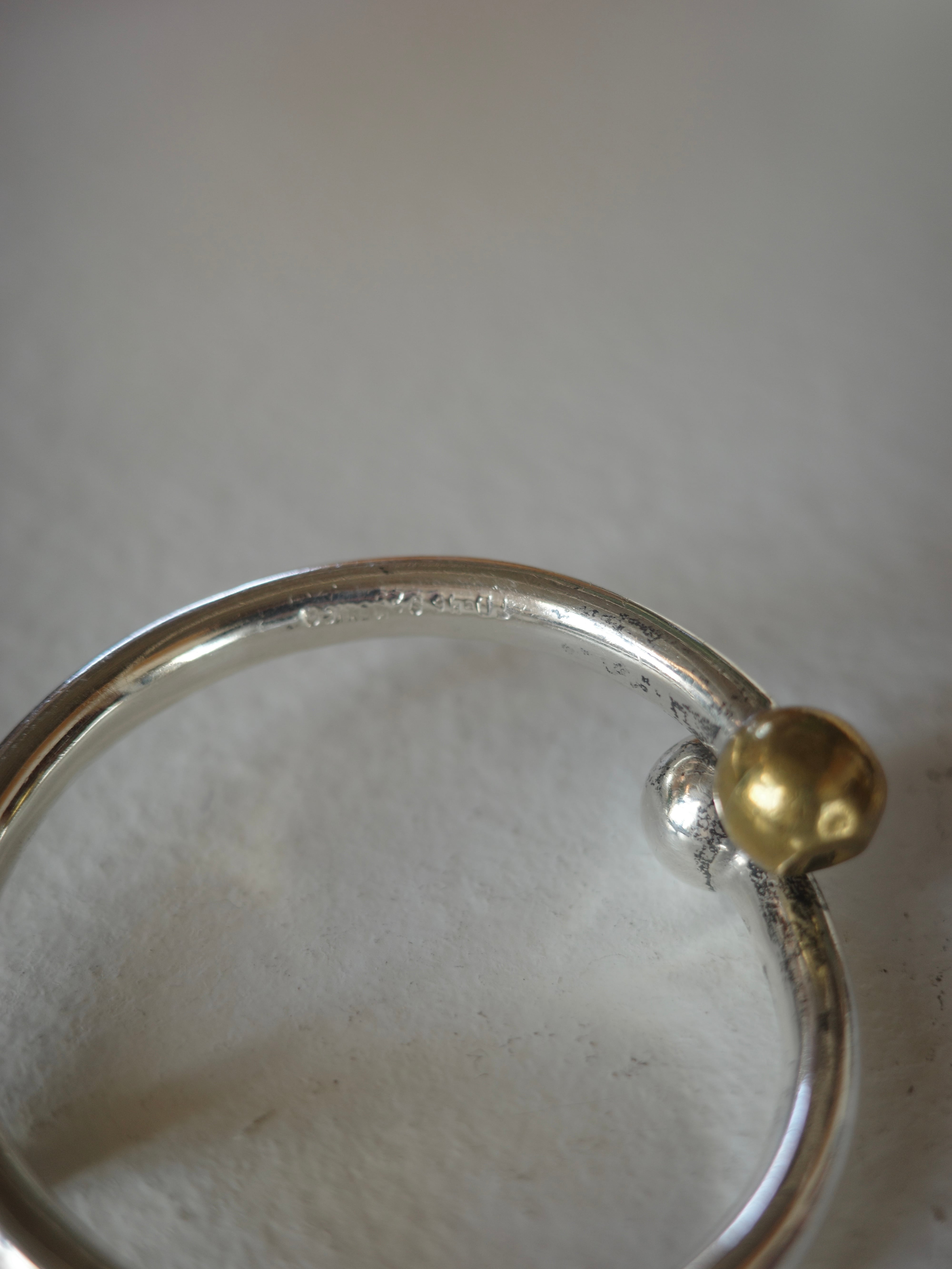 アメリカより仕入れたヴィンテージバングルです。シルバーとゴールド2色のボールモチーフがアクセントになった存在感のあるデザイン。がま口のように捻ると着脱できる仕様になっています。立体感もあり、手元のアクセントになるアイテムです。