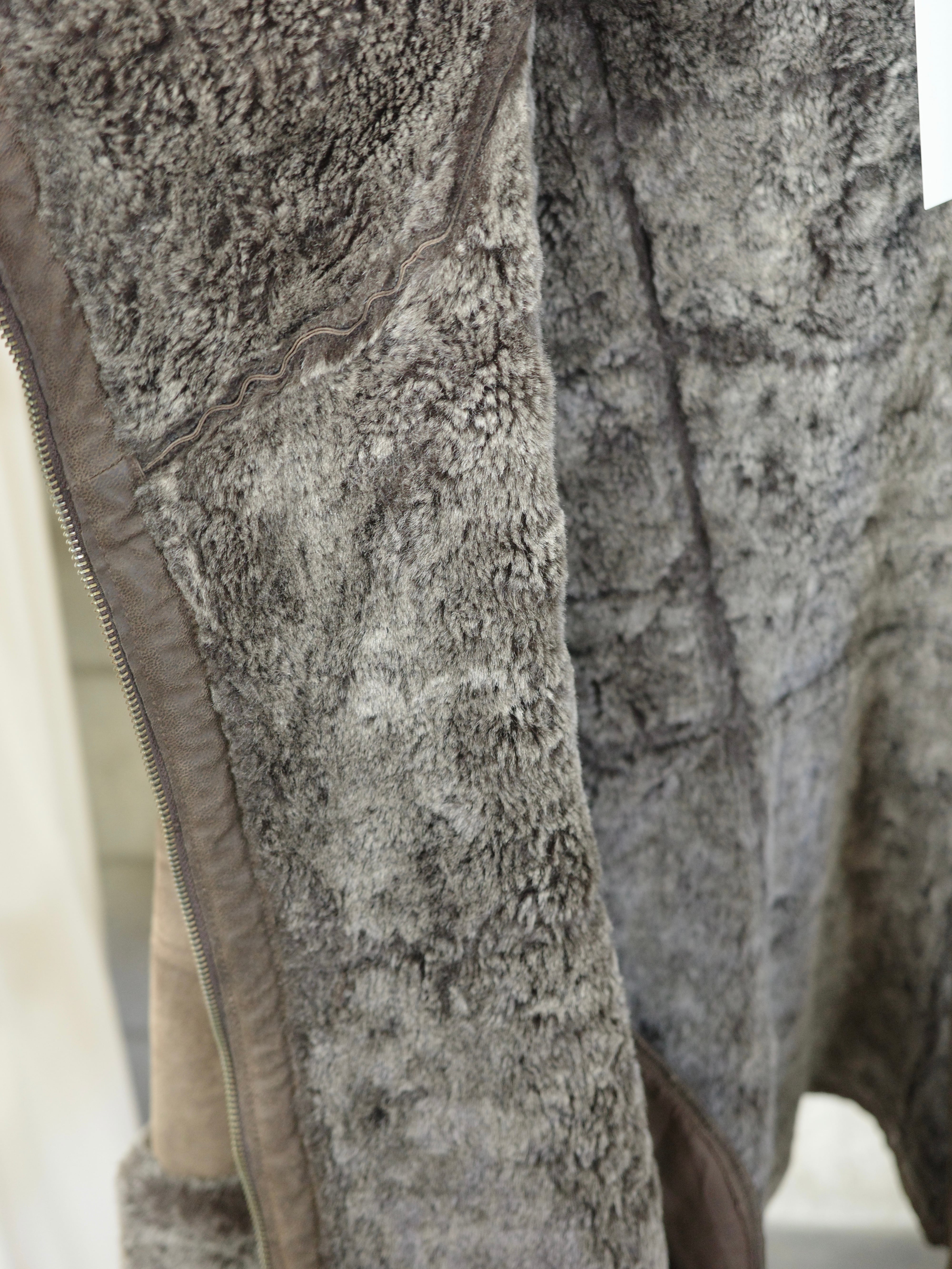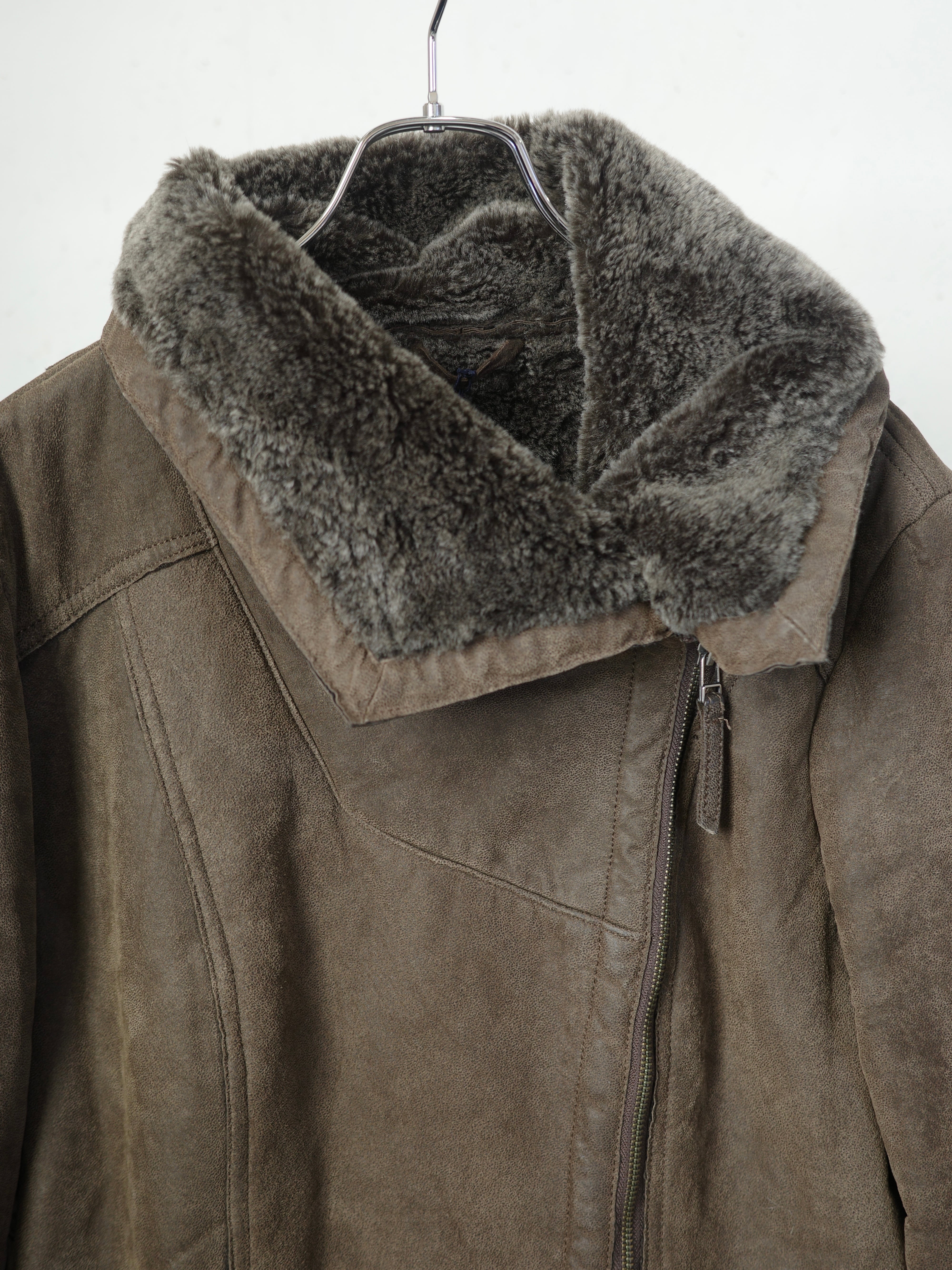 大きな襟とアシンメトリーなジップ位置が特徴的なムートンコートです。ファーの色、表地の色ともに渋くてとてもかっこ良く、コーディネートの主役になります。内側も全てファーなのでとても暖かく、真冬のアウターにぴったりです。