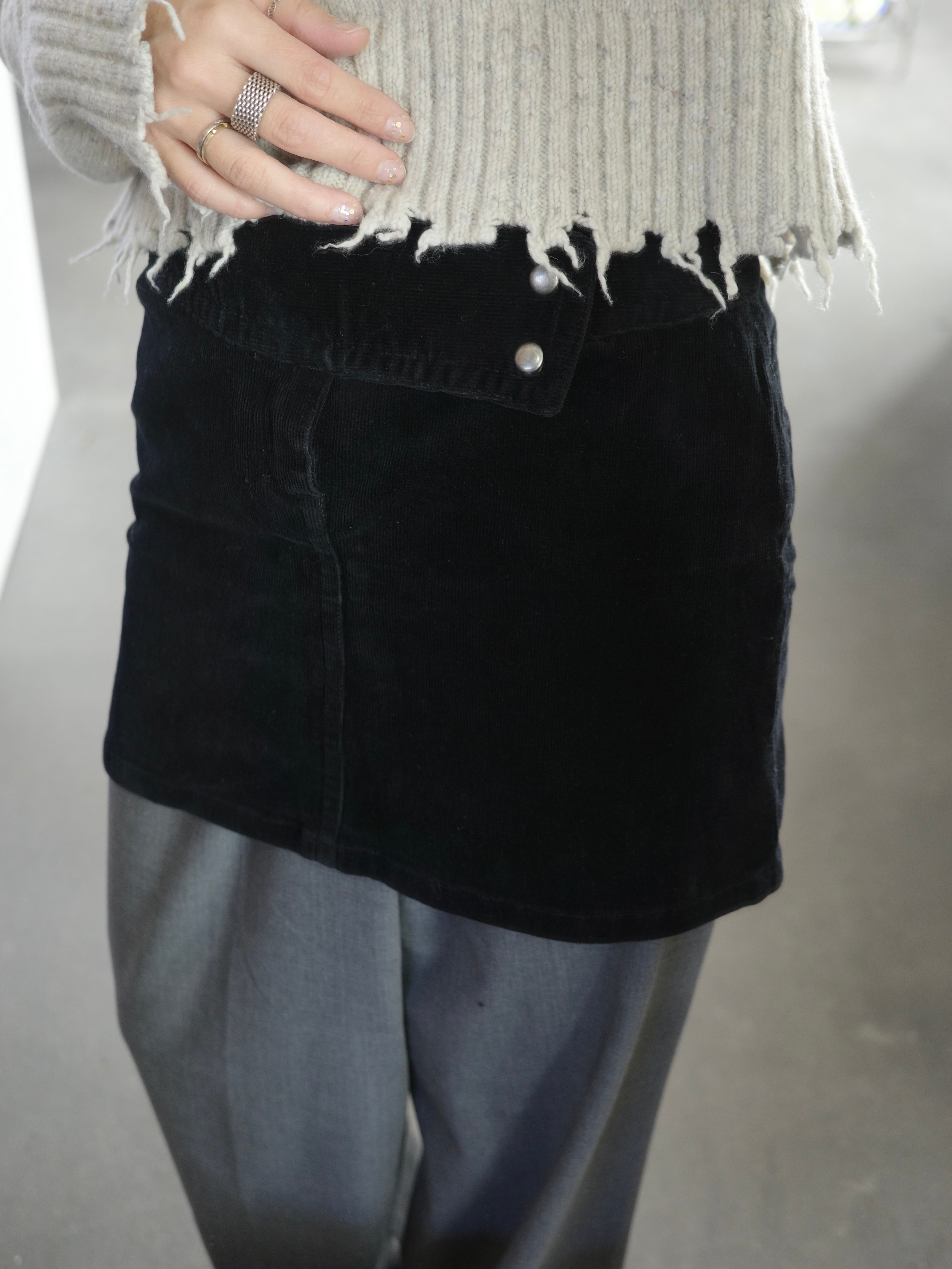 コーデユロイのミニスカートです。ボックス型のシルエットに、ウエストのボタンがアクセントになっています。コンパクトですが伸縮性はあります。タイツと合わせたり、パンツとレイヤードしていただくのがおすすめです。