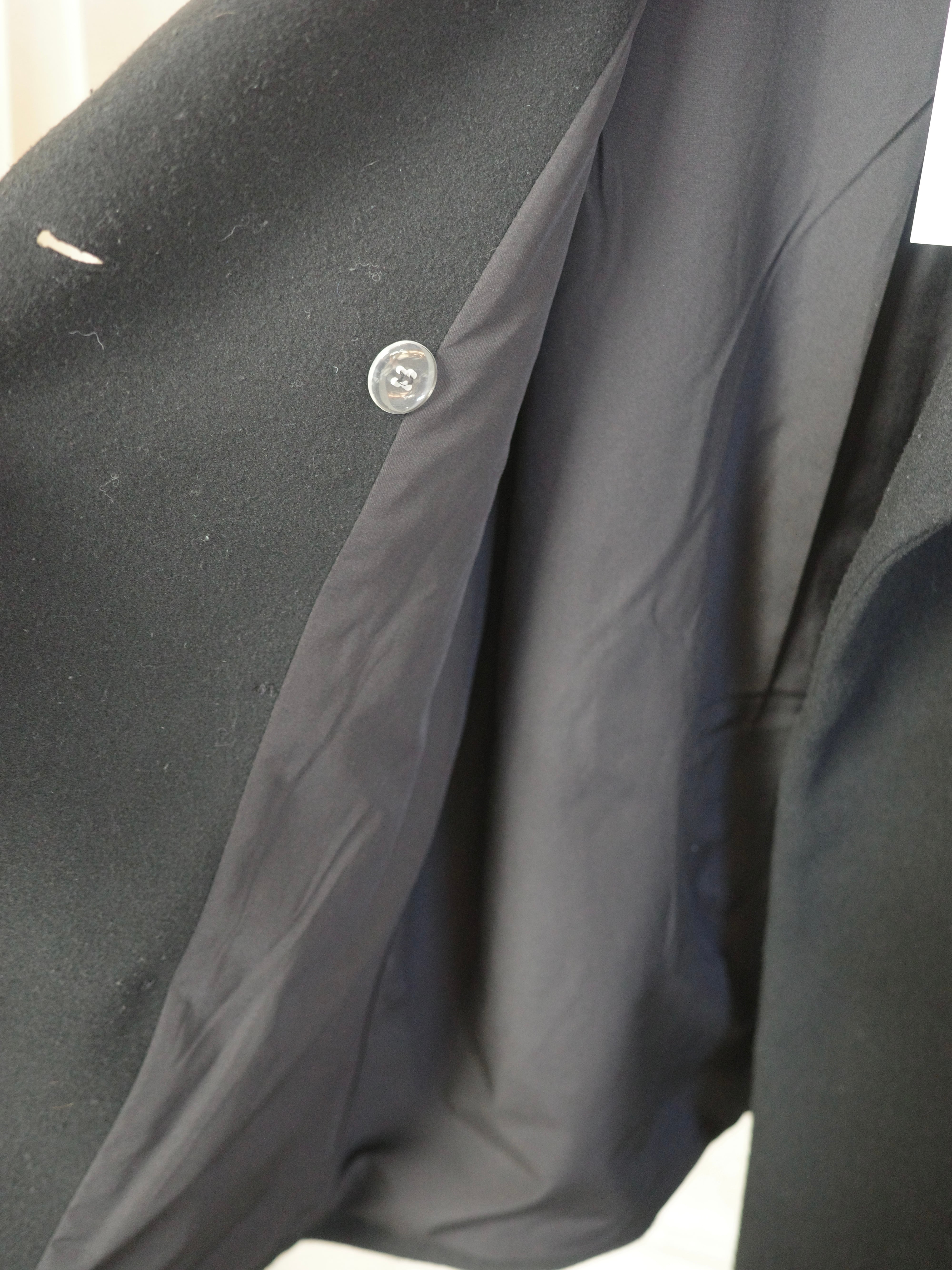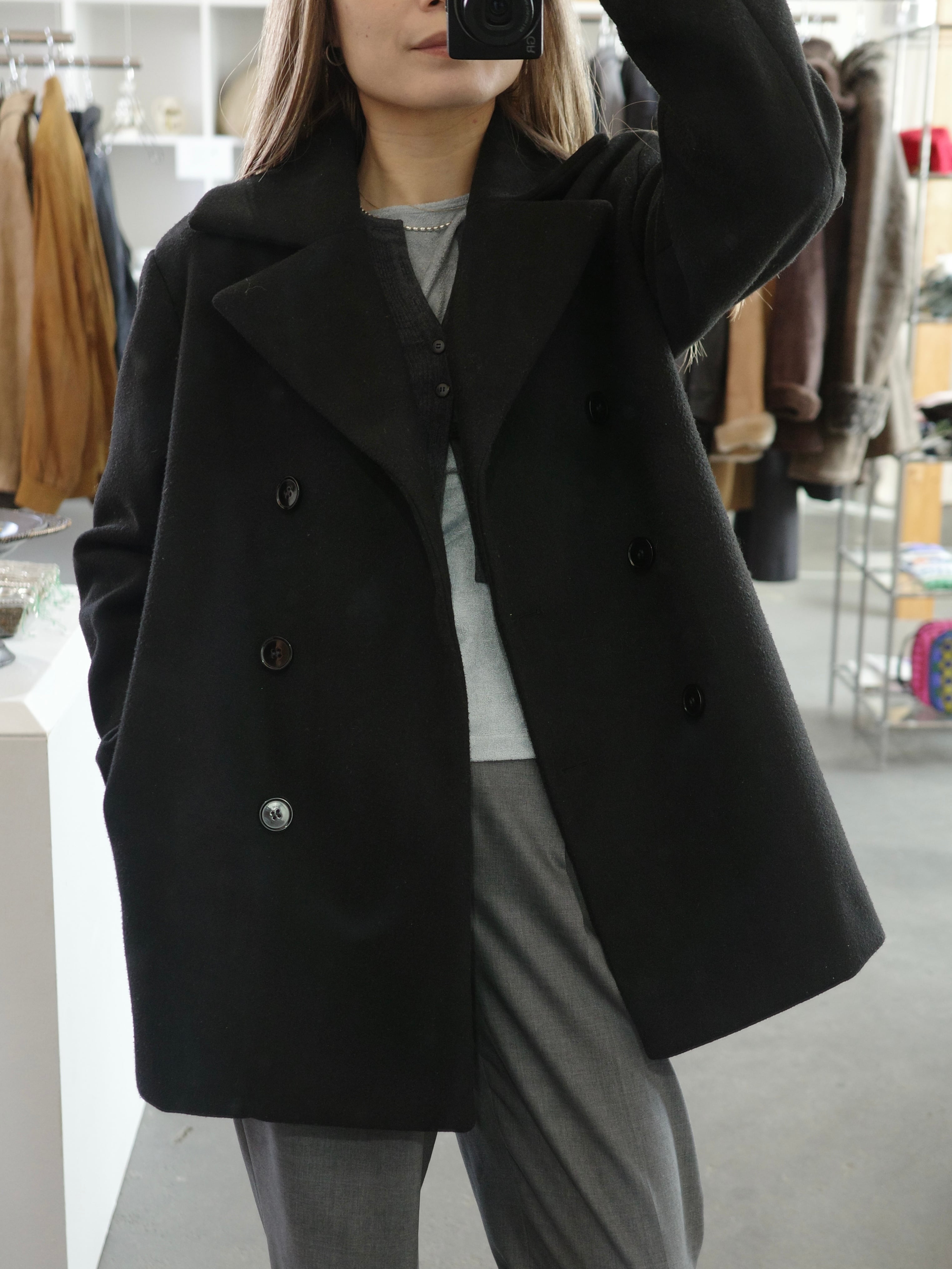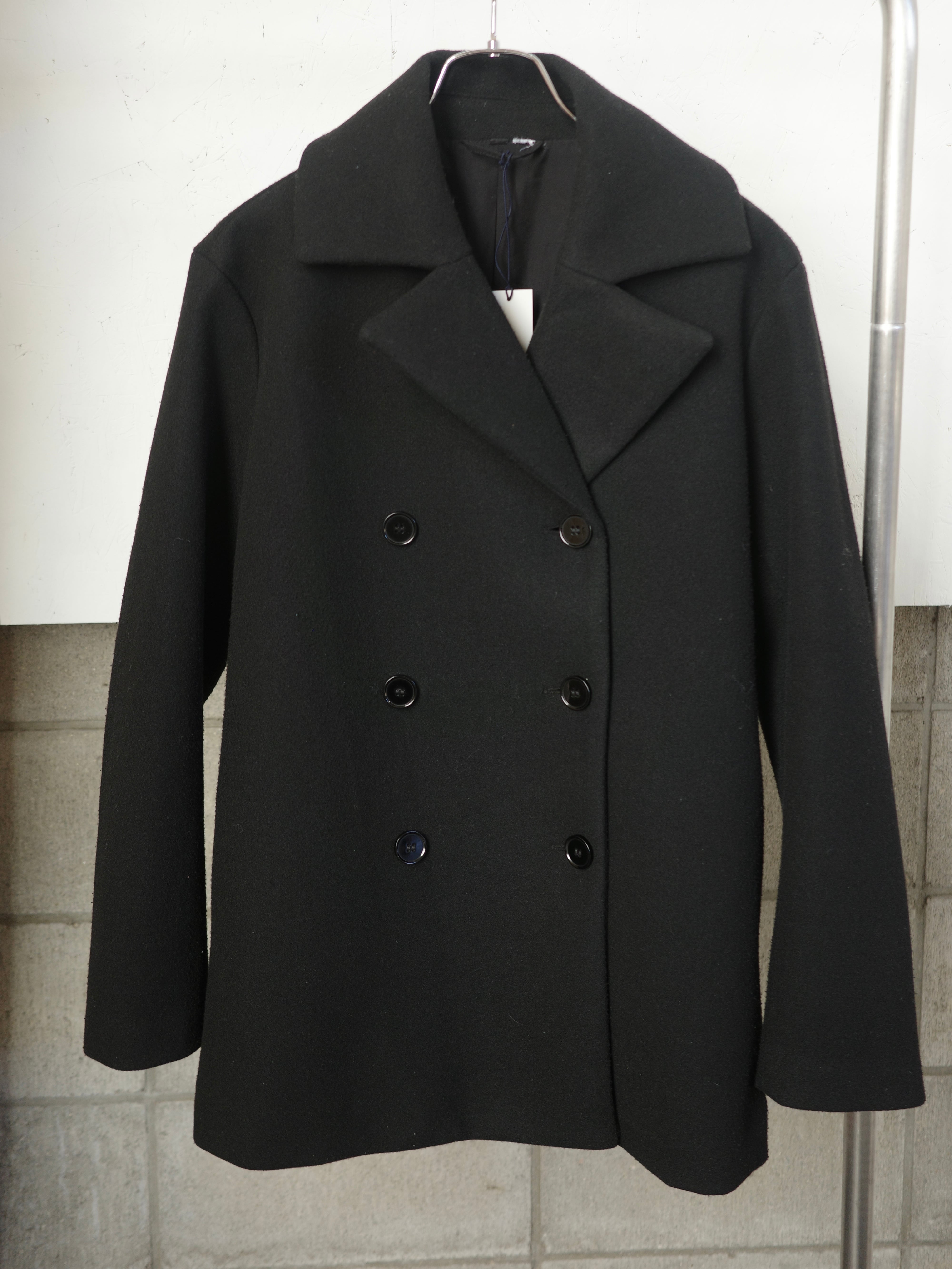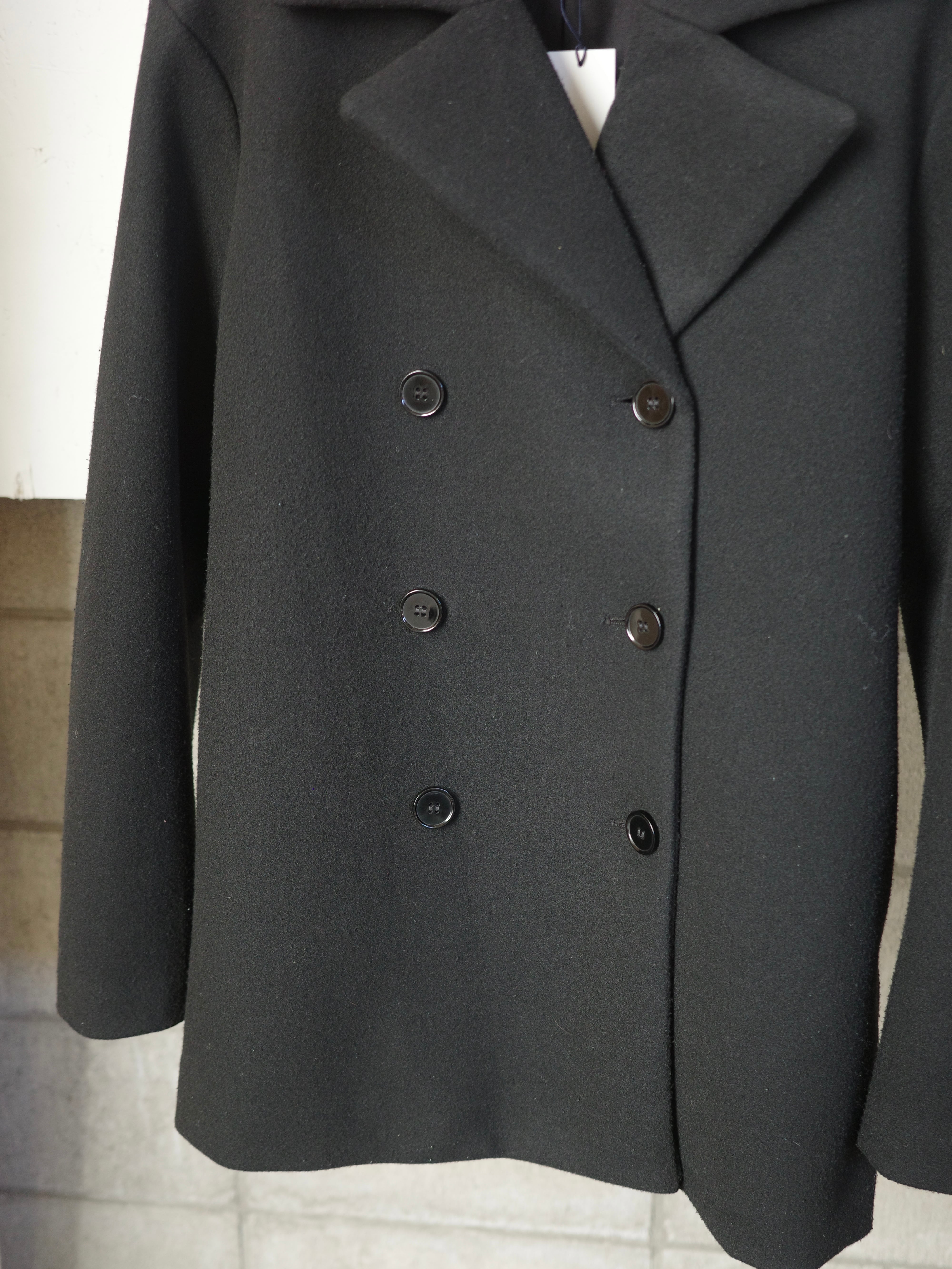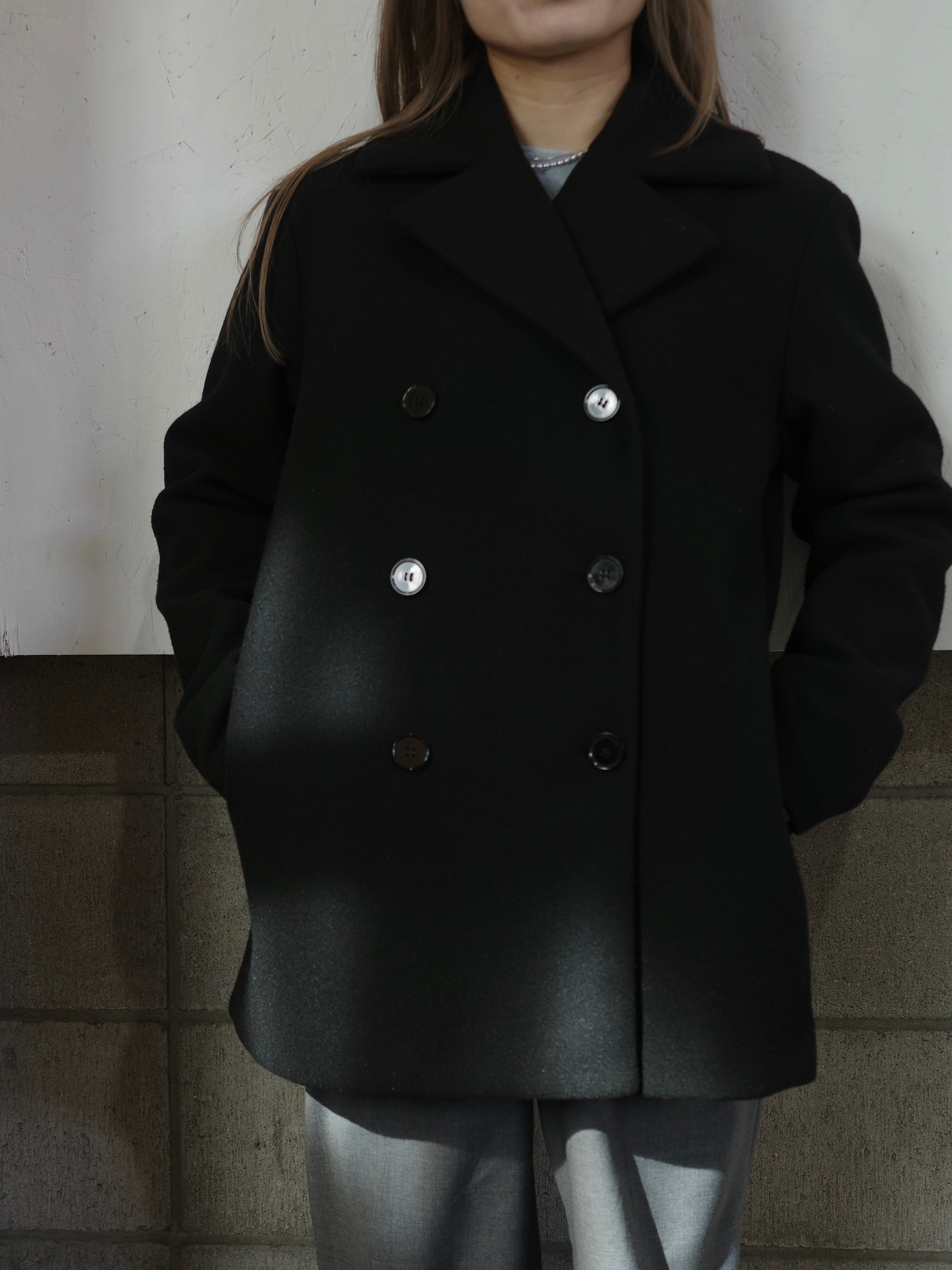 ダブルのボックス型コートです。シンプルで合わせやすいデザインで、シルエットもとても綺麗なので、開けても閉めても素敵に着ていただけます。