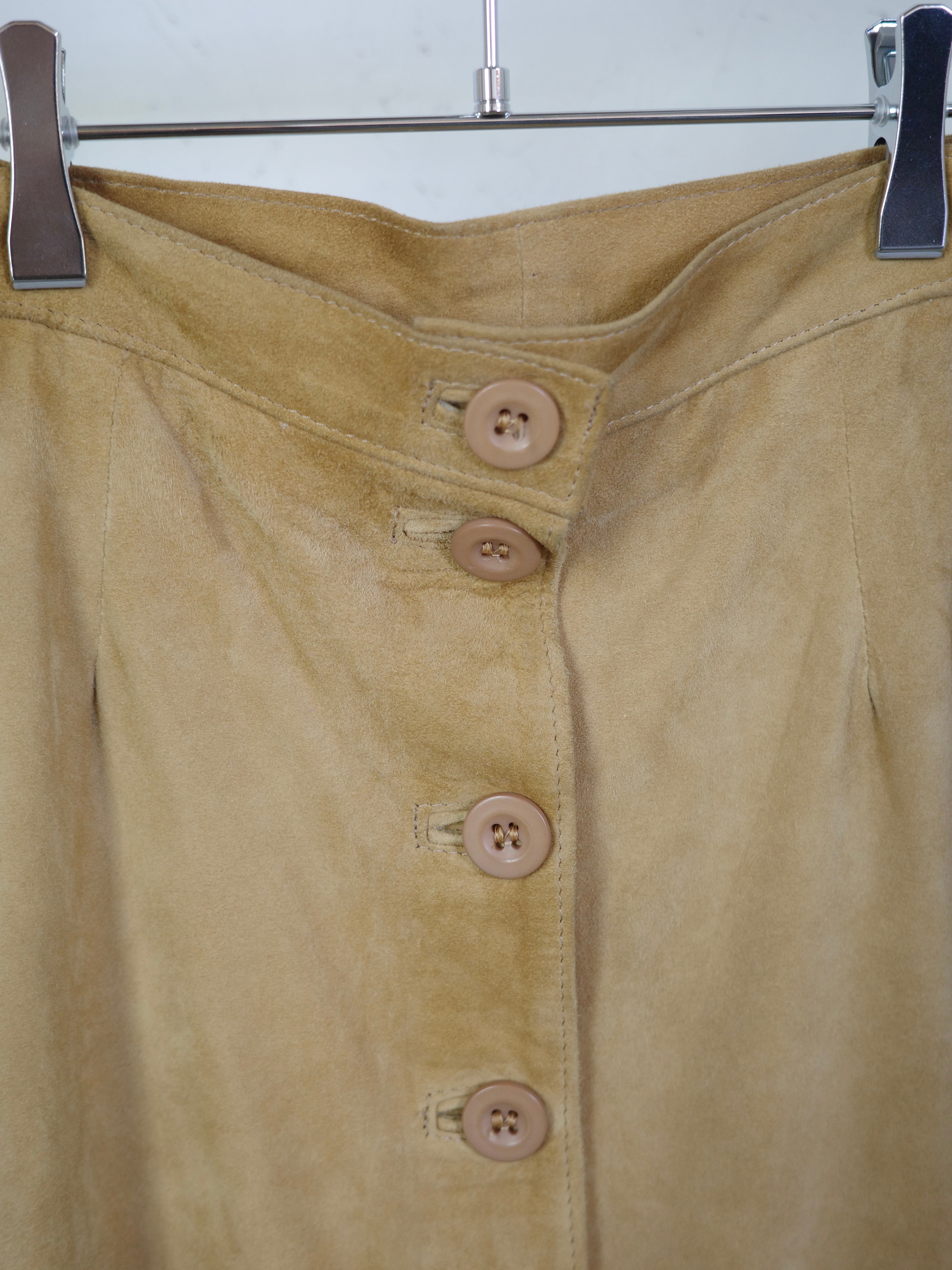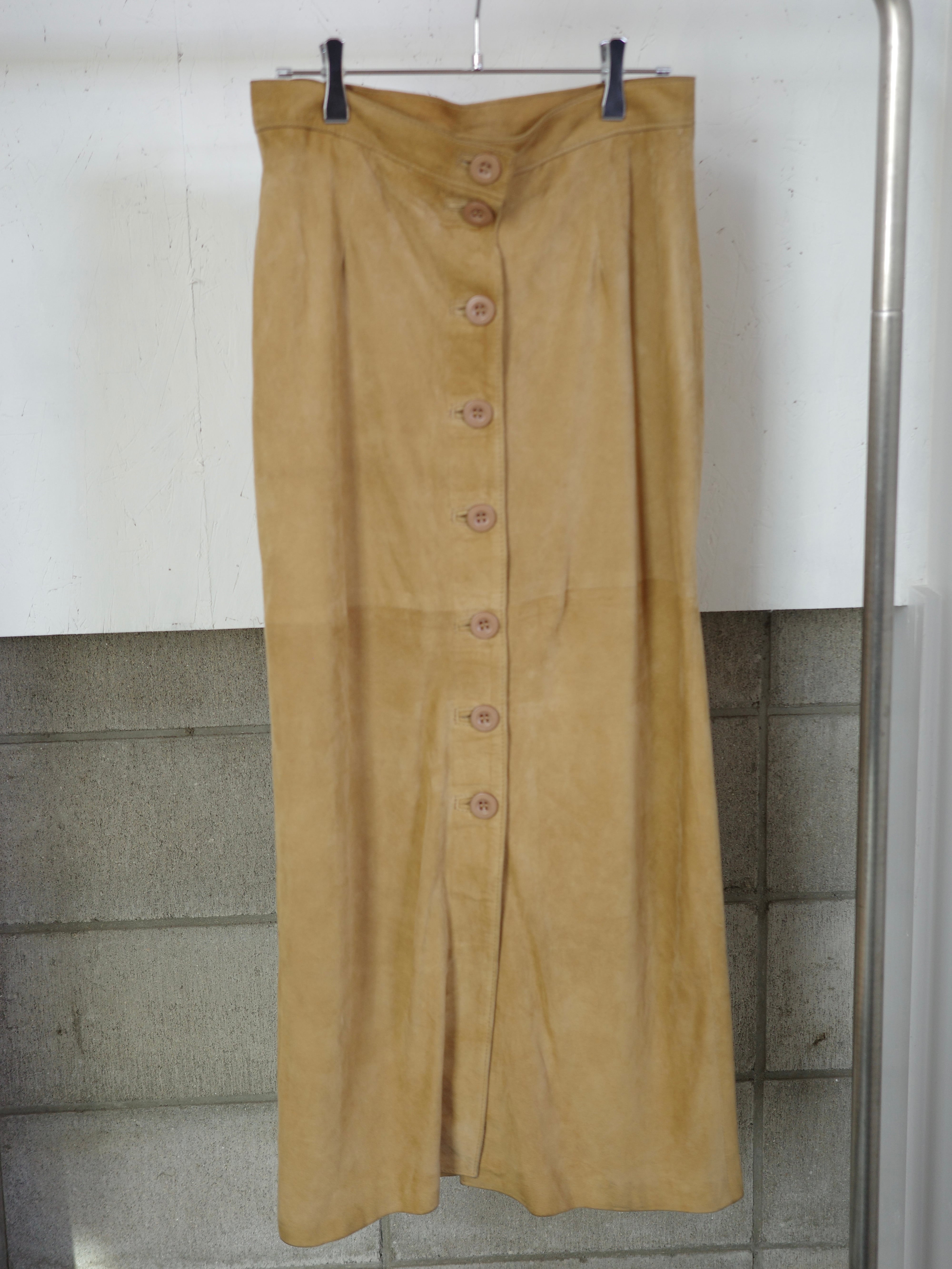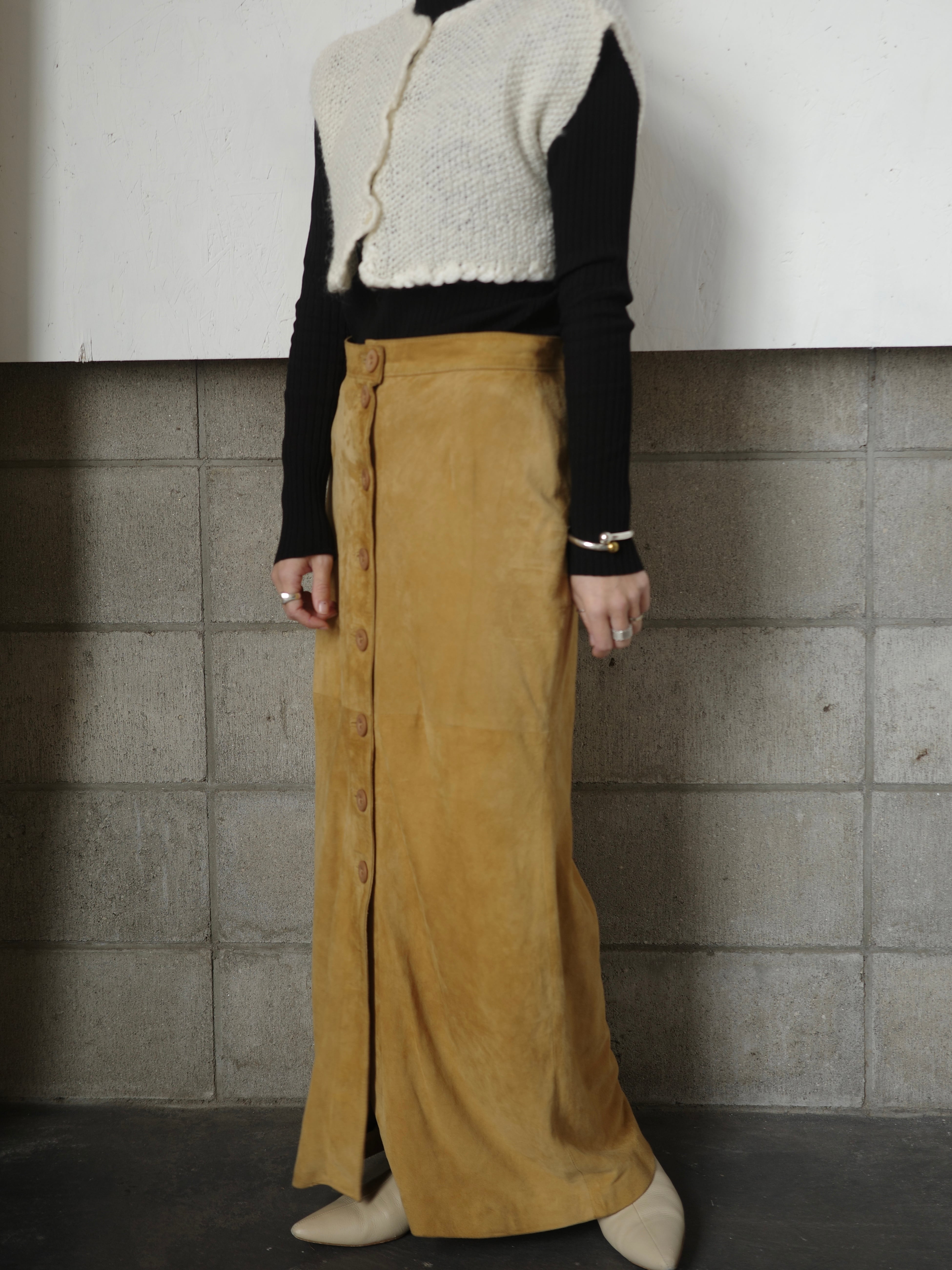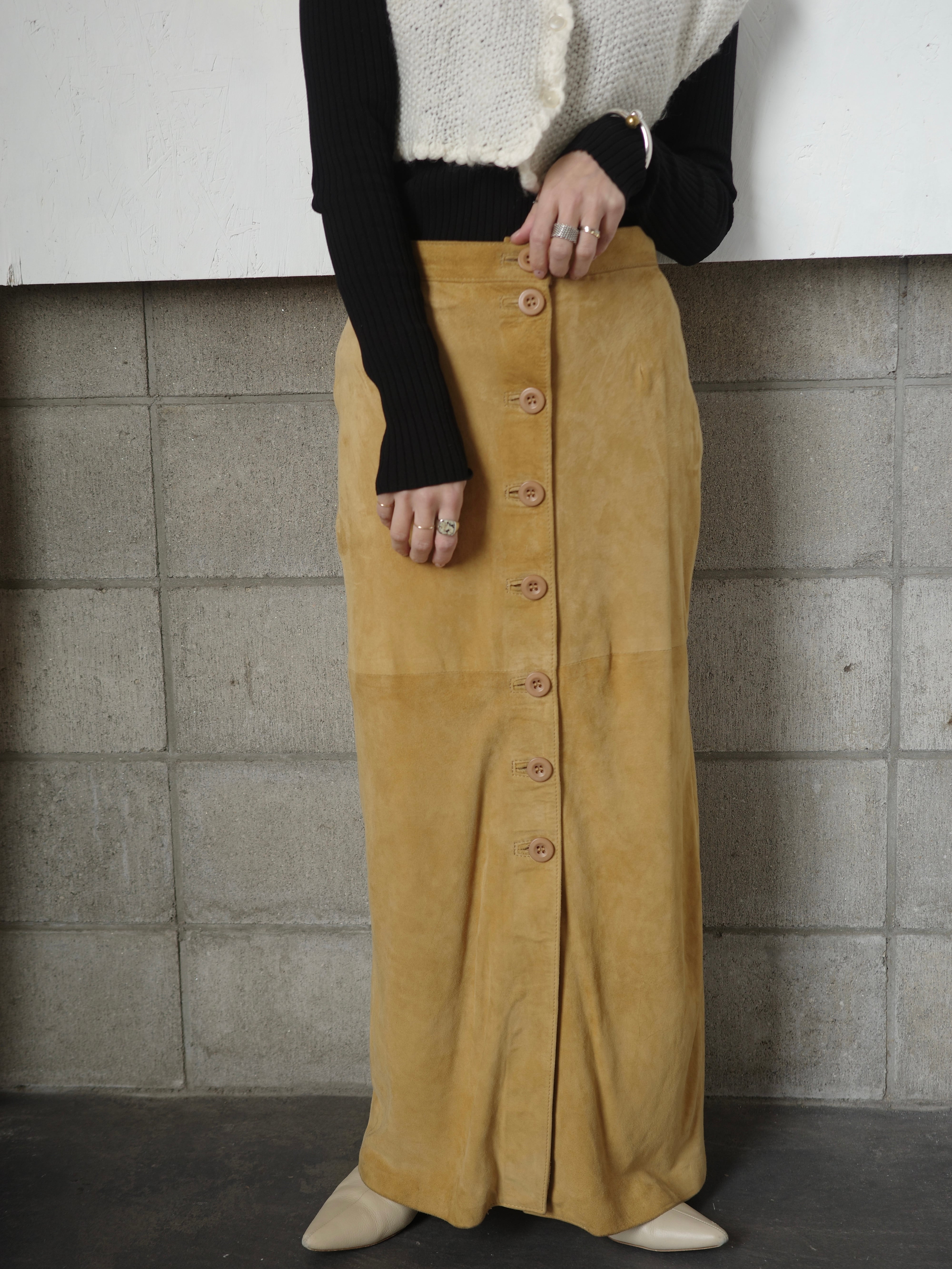 リアルスエードのロングスカートです。落ち感のある素材感とIラインのシルエットがとても綺麗で、カジュアルな印象のスエードを上品に着用いただけます。前ボタンのデザインなのでら開けてパンツとレイヤードするのもおすすめです。