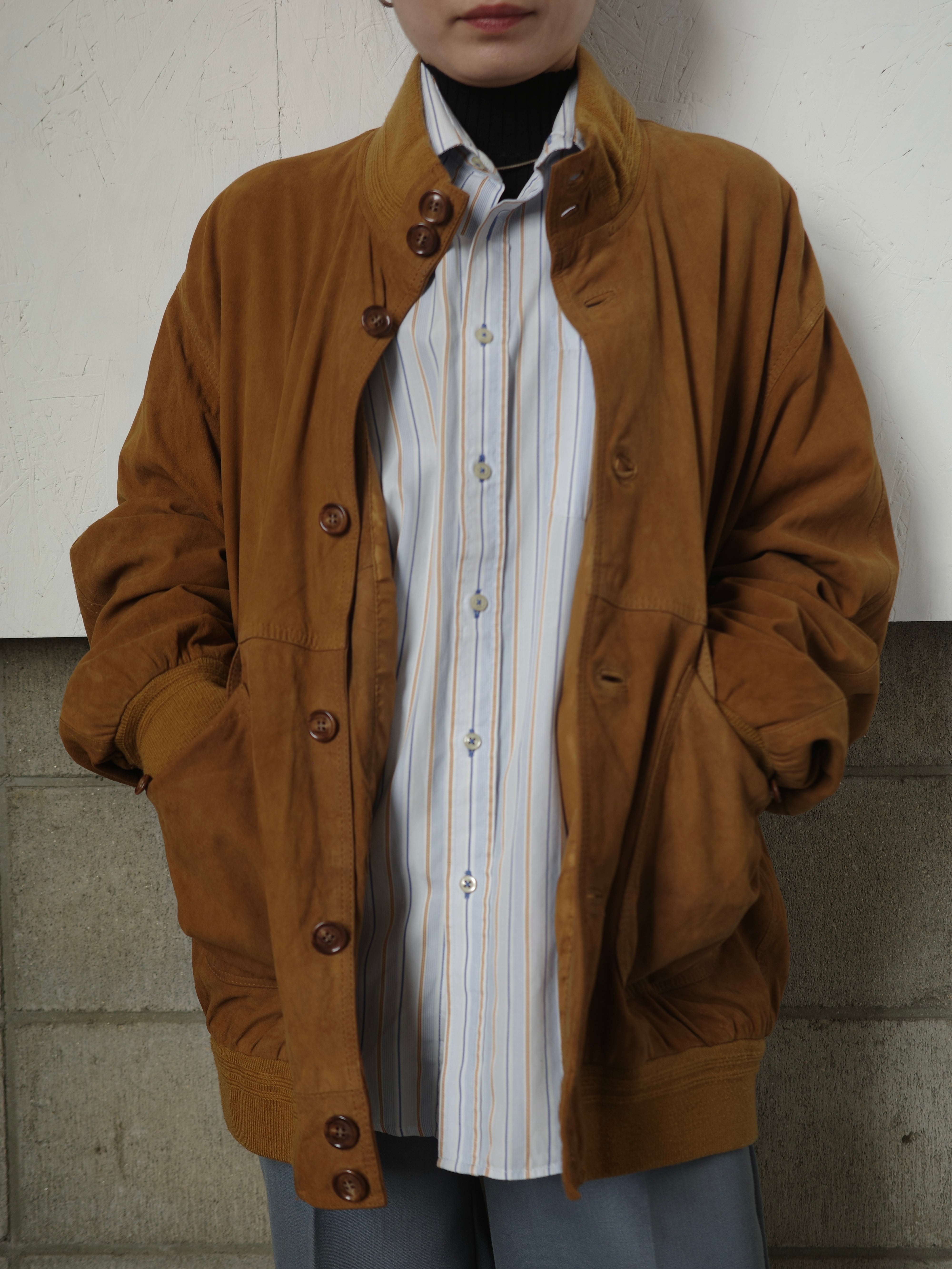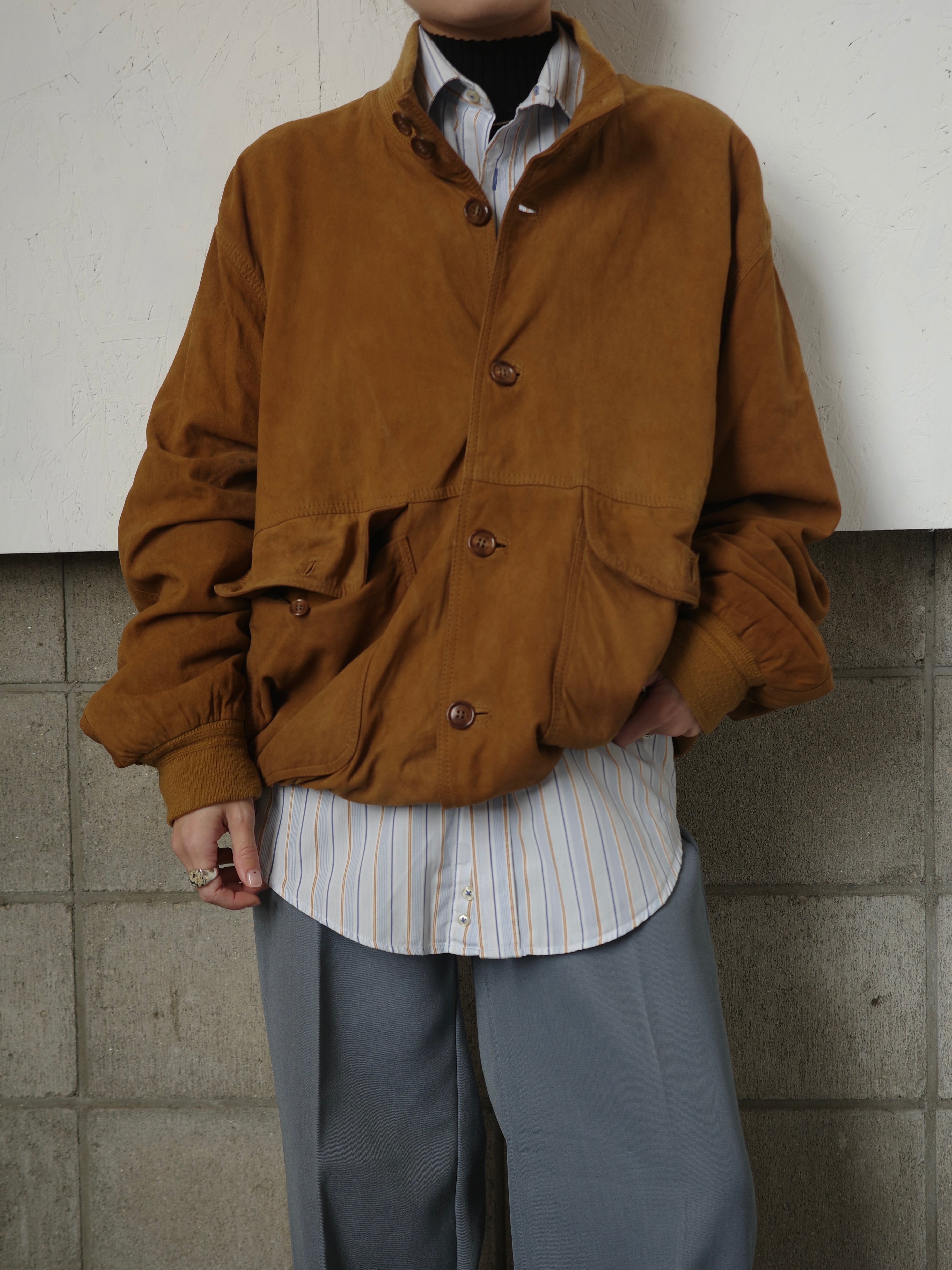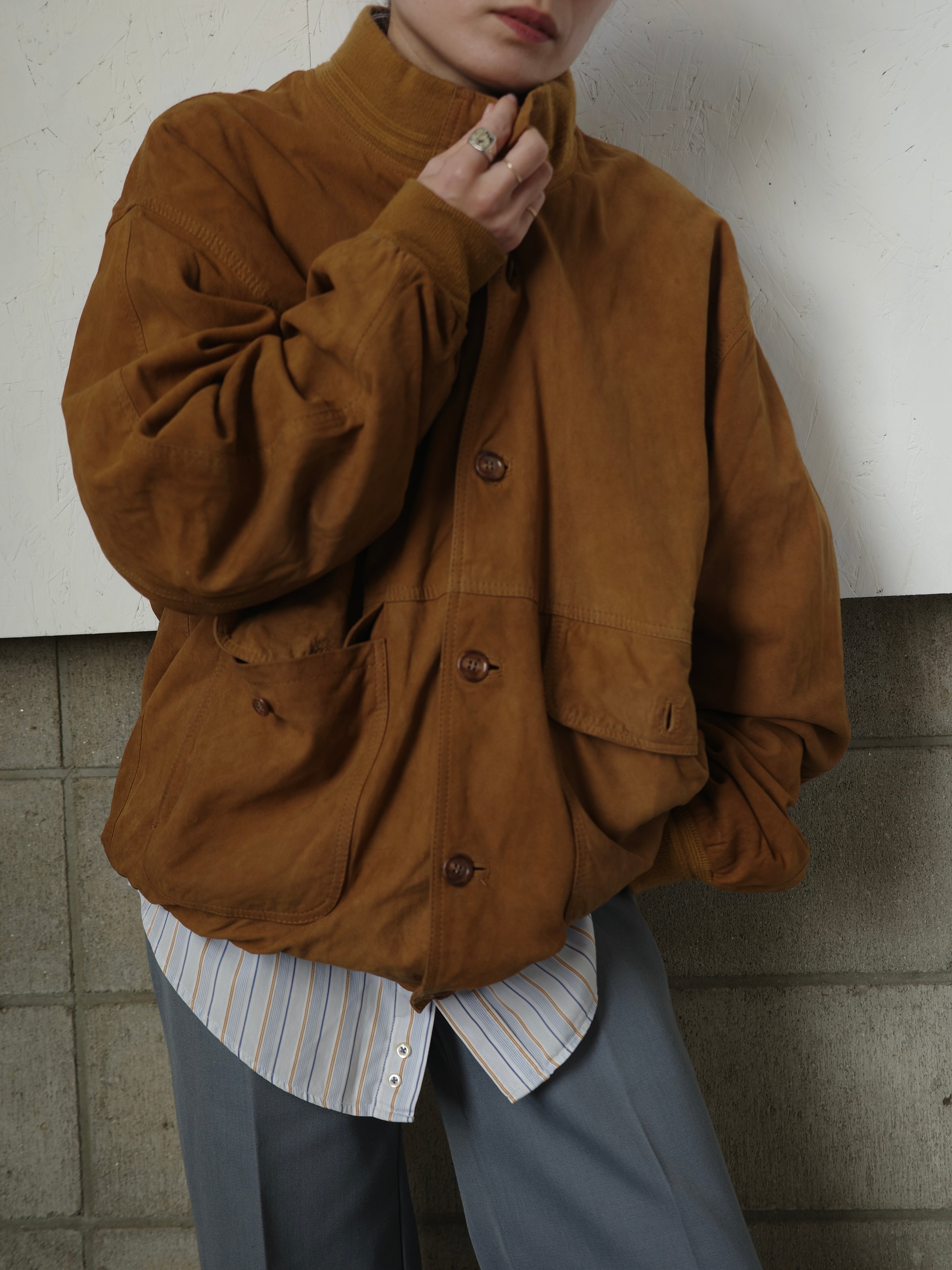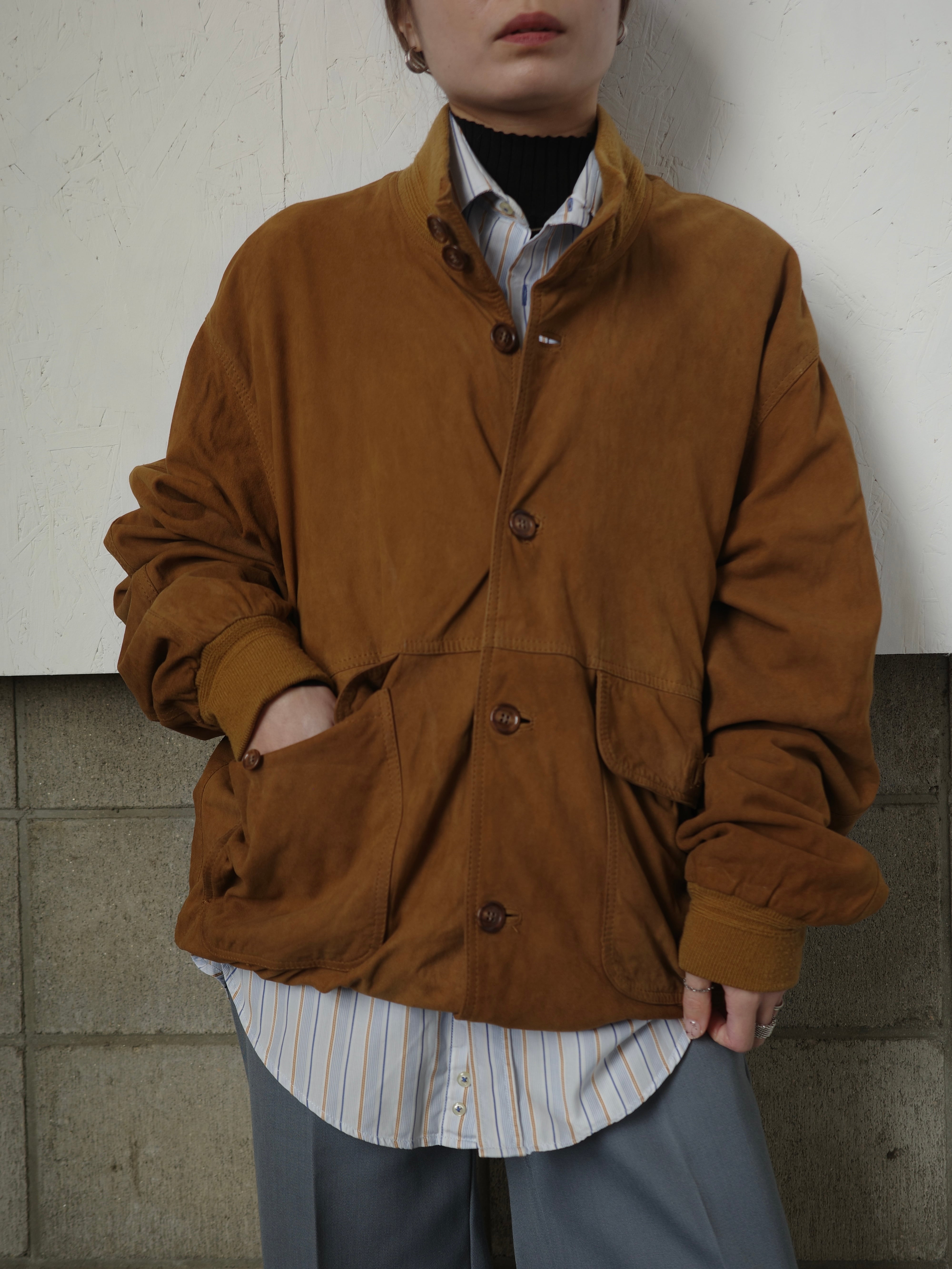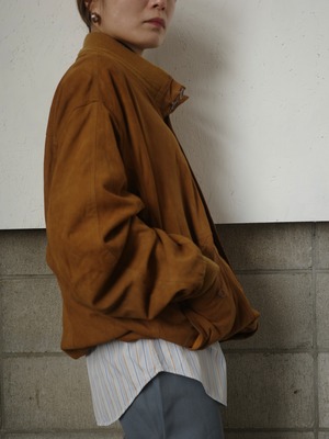 スエード素材のボンバージャケットです。こっくりブラウンな色合いが素敵で、柔らかく滑らかな質感です。