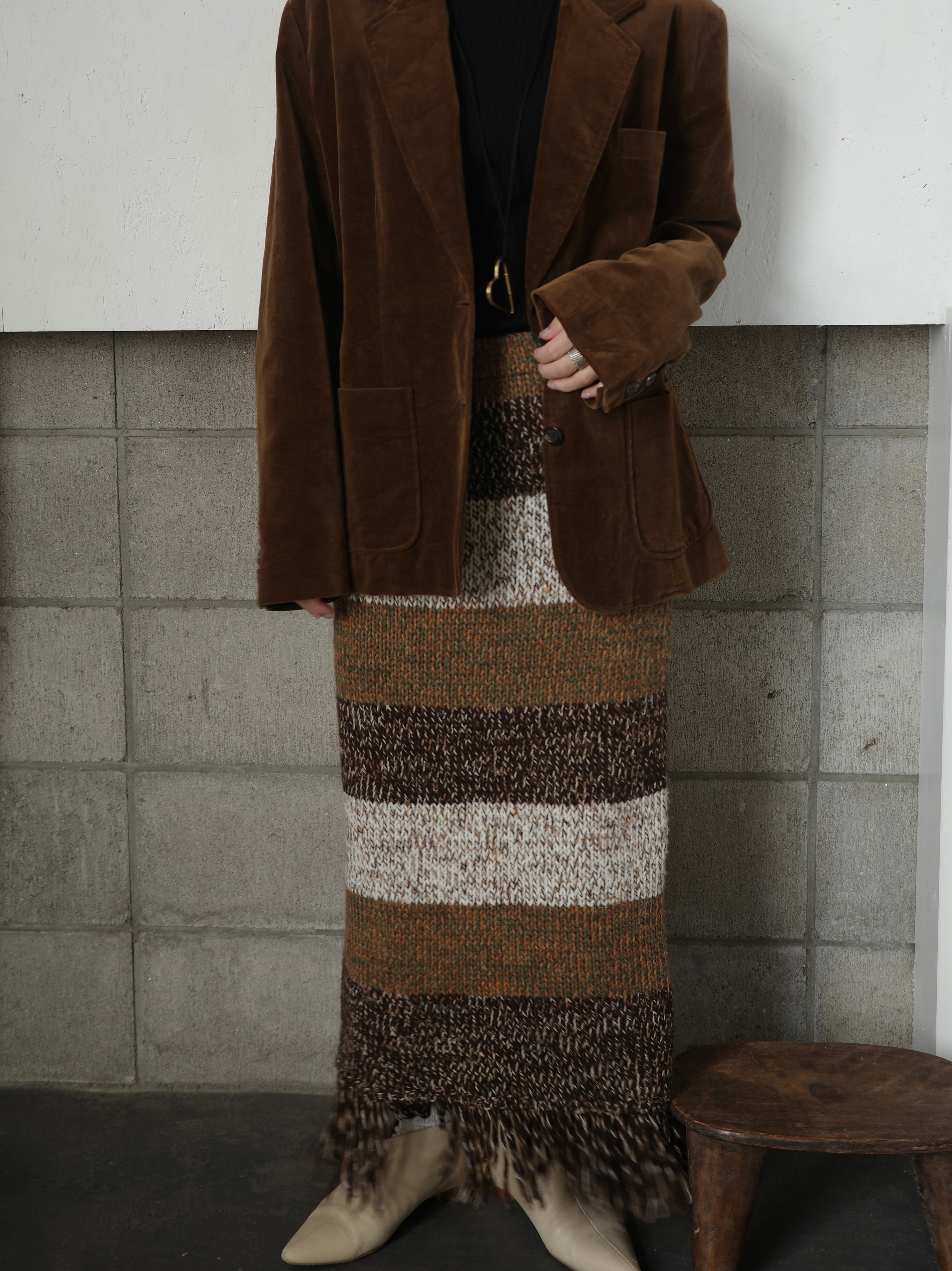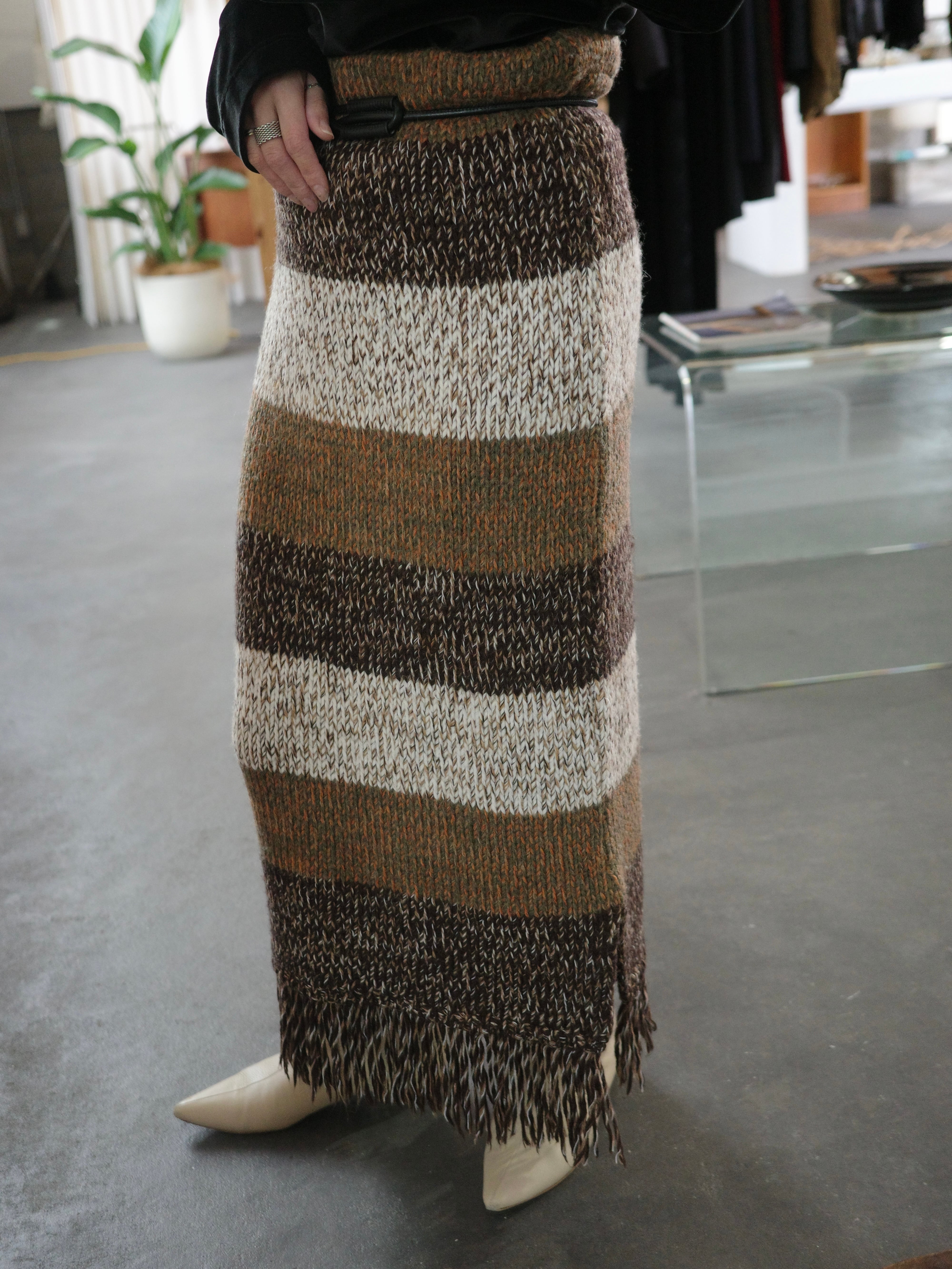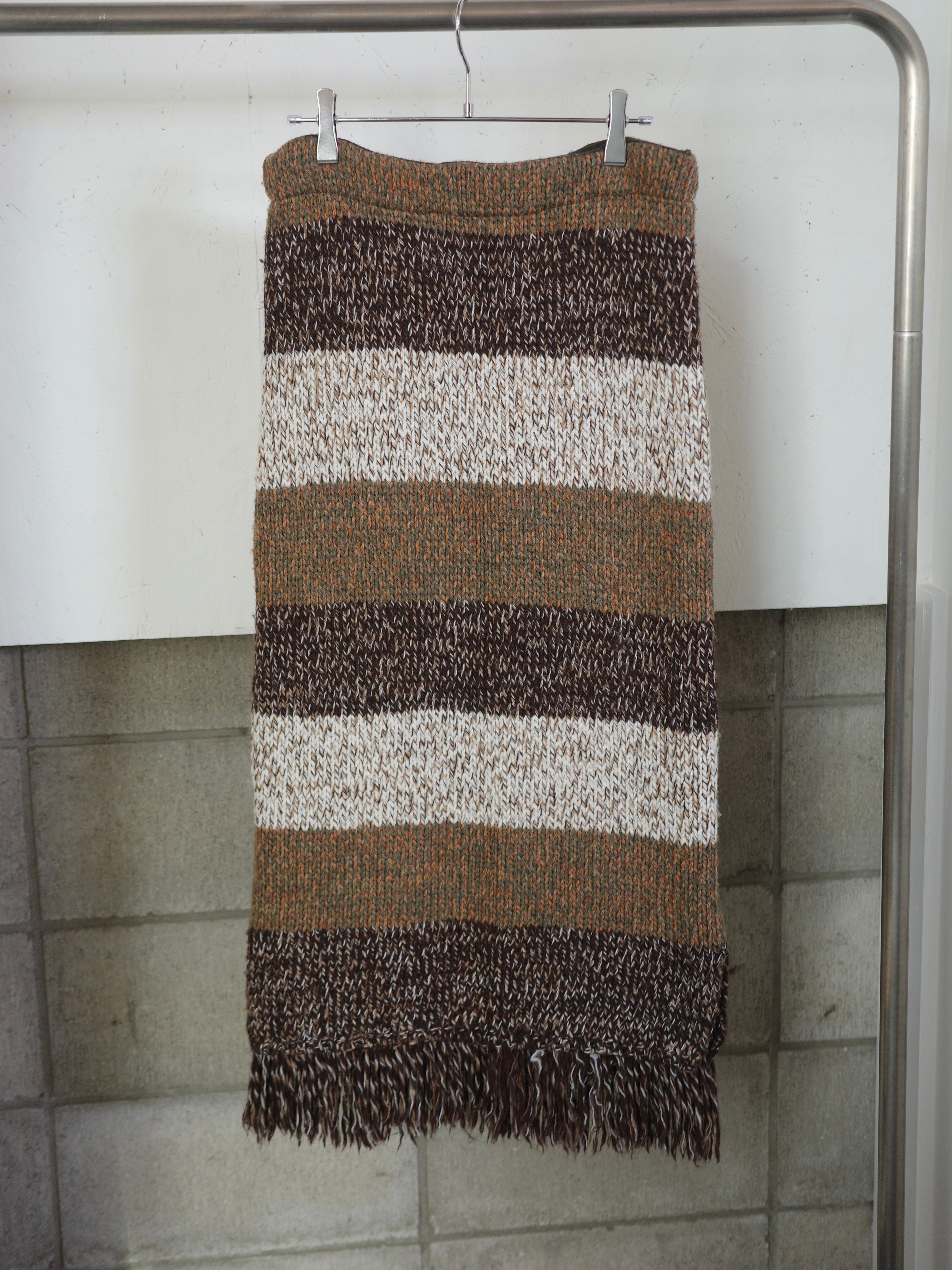 80年代のニットスカートです。ブラウン系のグラデーションボーダーと裾のフリンジがインパクトのあるデザイン。よく見るとミックスカラーになった糸の色合いもとっても素敵です。アイラインでシルエットも綺麗です。