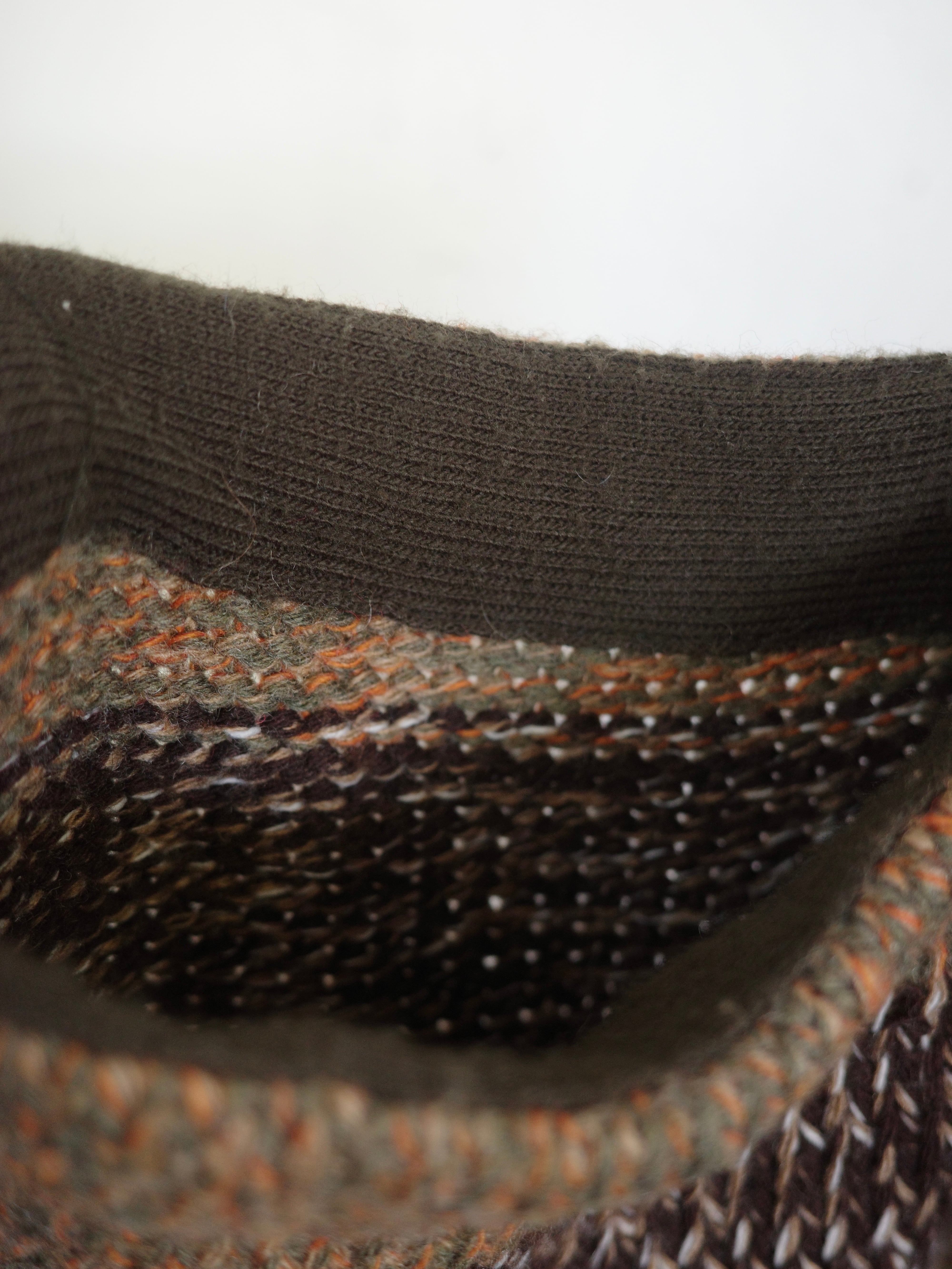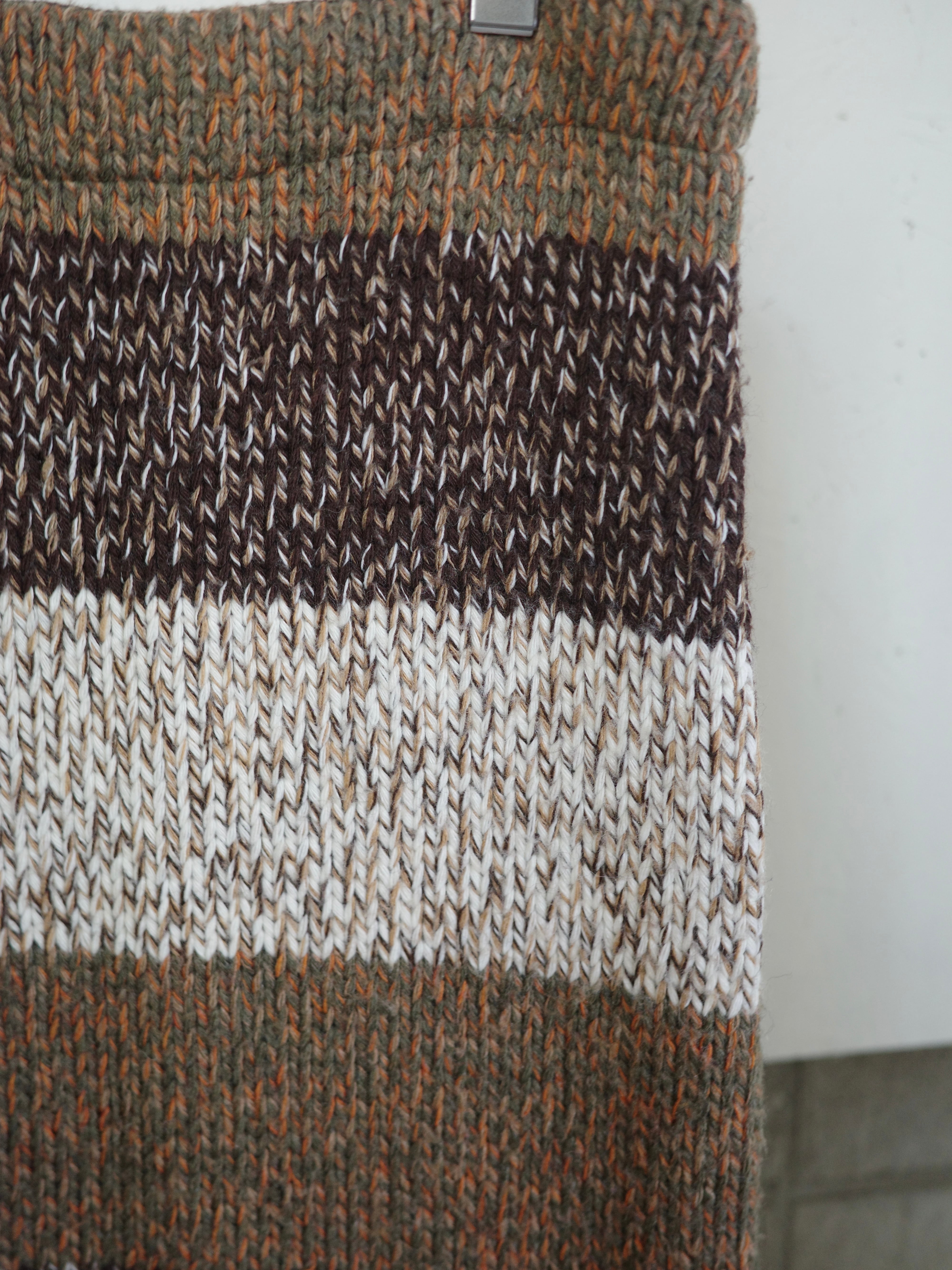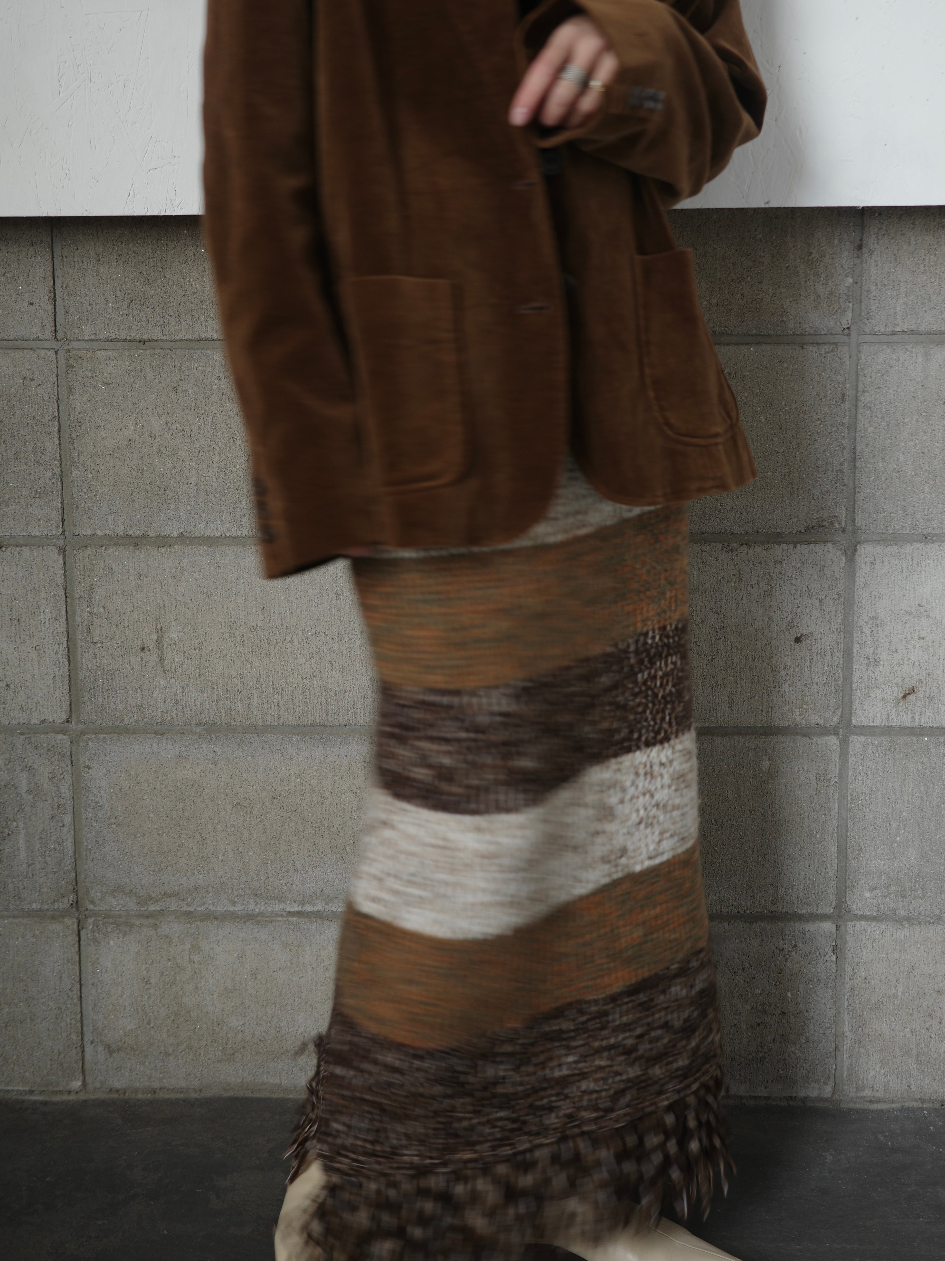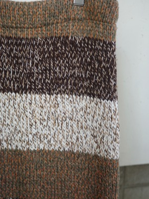 80年代のニットスカートです。ブラウン系のグラデーションボーダーと裾のフリンジがインパクトのあるデザイン。よく見るとミックスカラーになった糸の色合いもとっても素敵です。アイラインでシルエットも綺麗です。