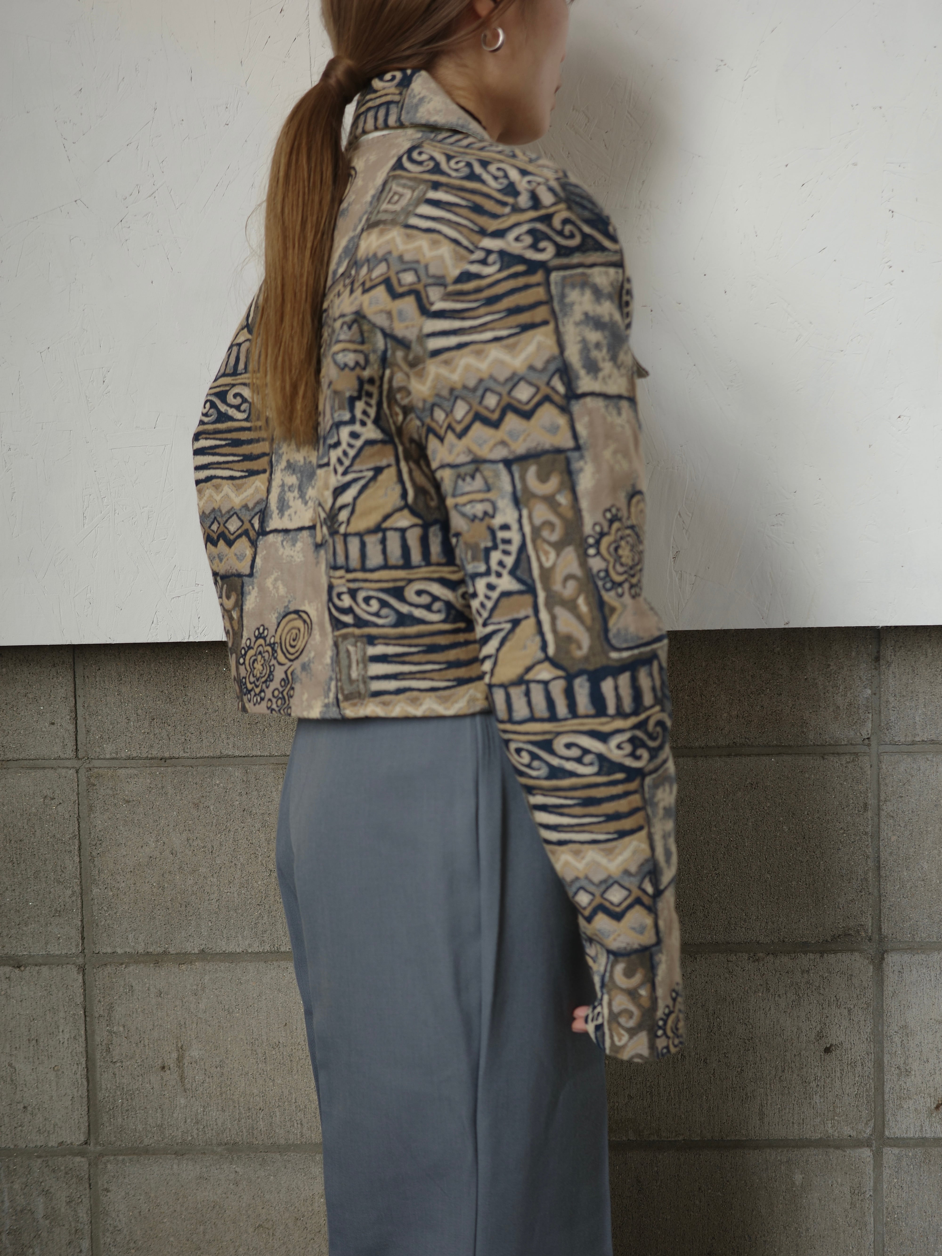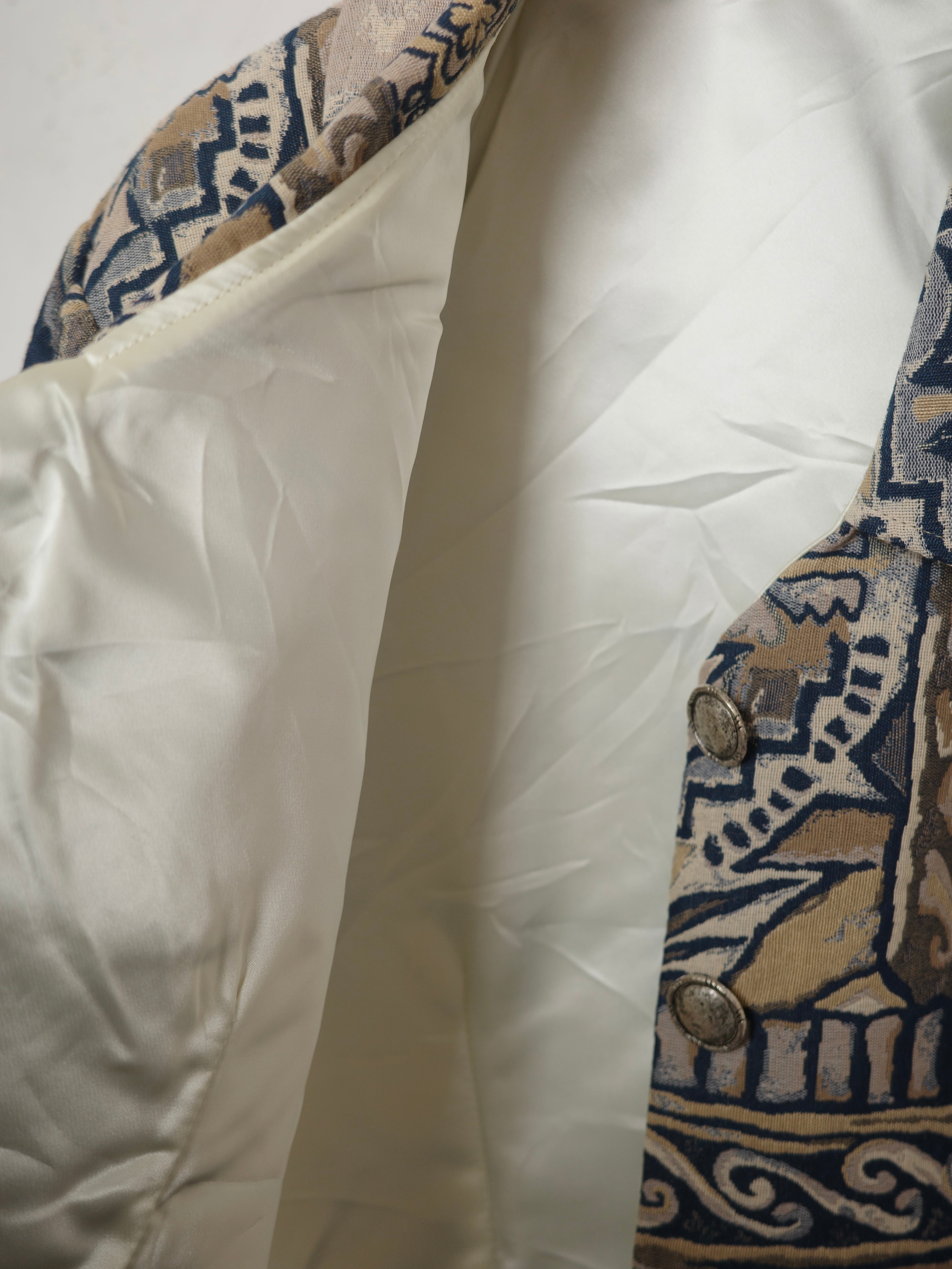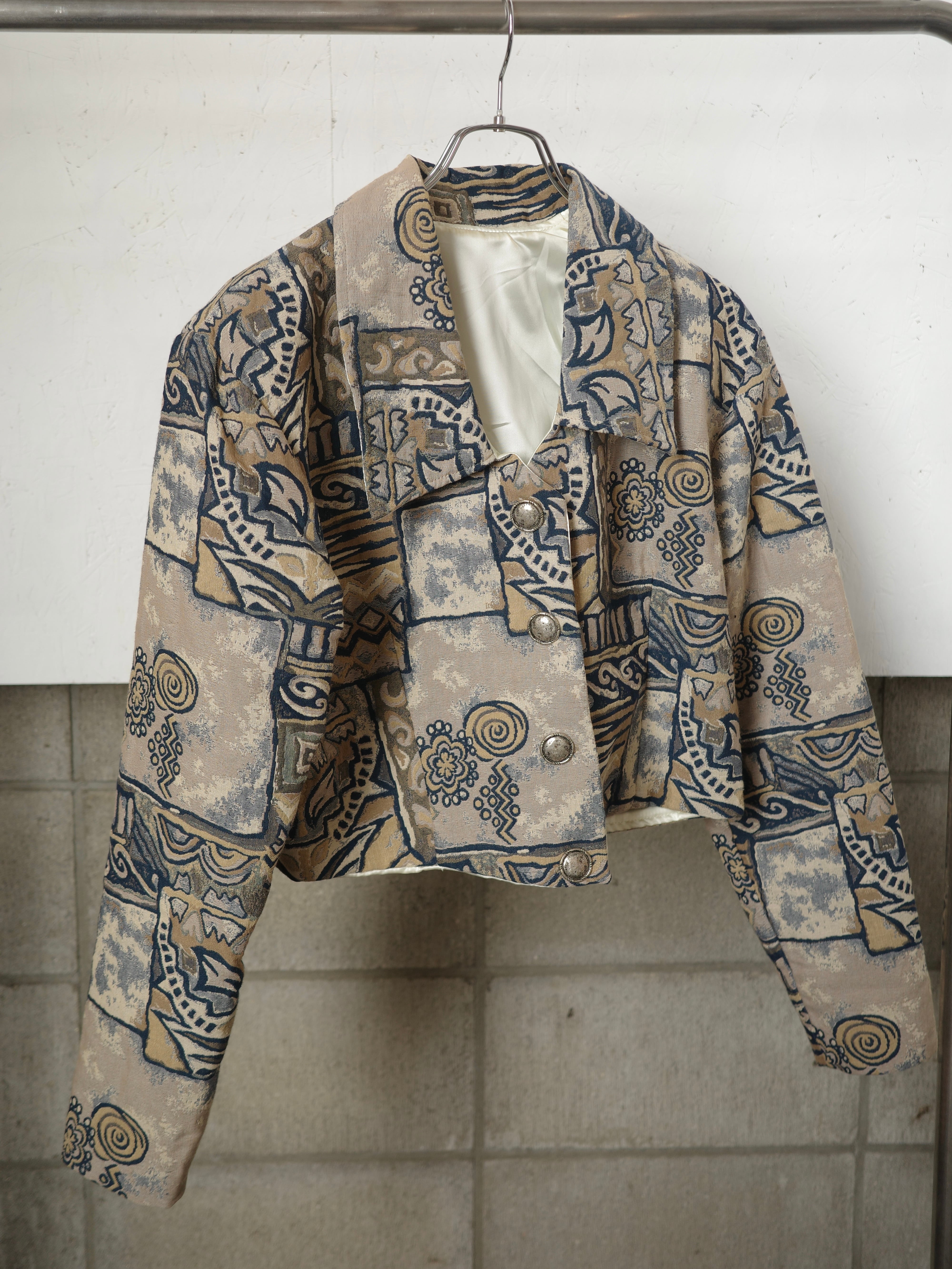 ジャガード織のデザインジャケットです。ショート丈に袖長めのレトロなシルエットで、スタイルアップできるバランス感がカッコ良いアイテム。ブルーとベージュの絶妙な色使い、大きめのデザインボタン、襟元の開口デザインなど、どこをとってもディテールが素敵な主役になるジャケットです。
