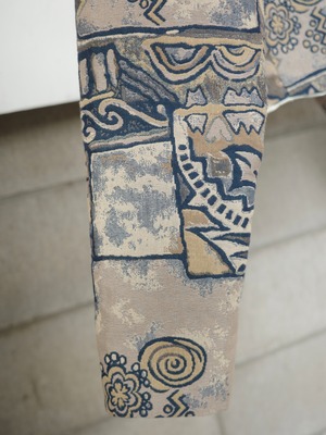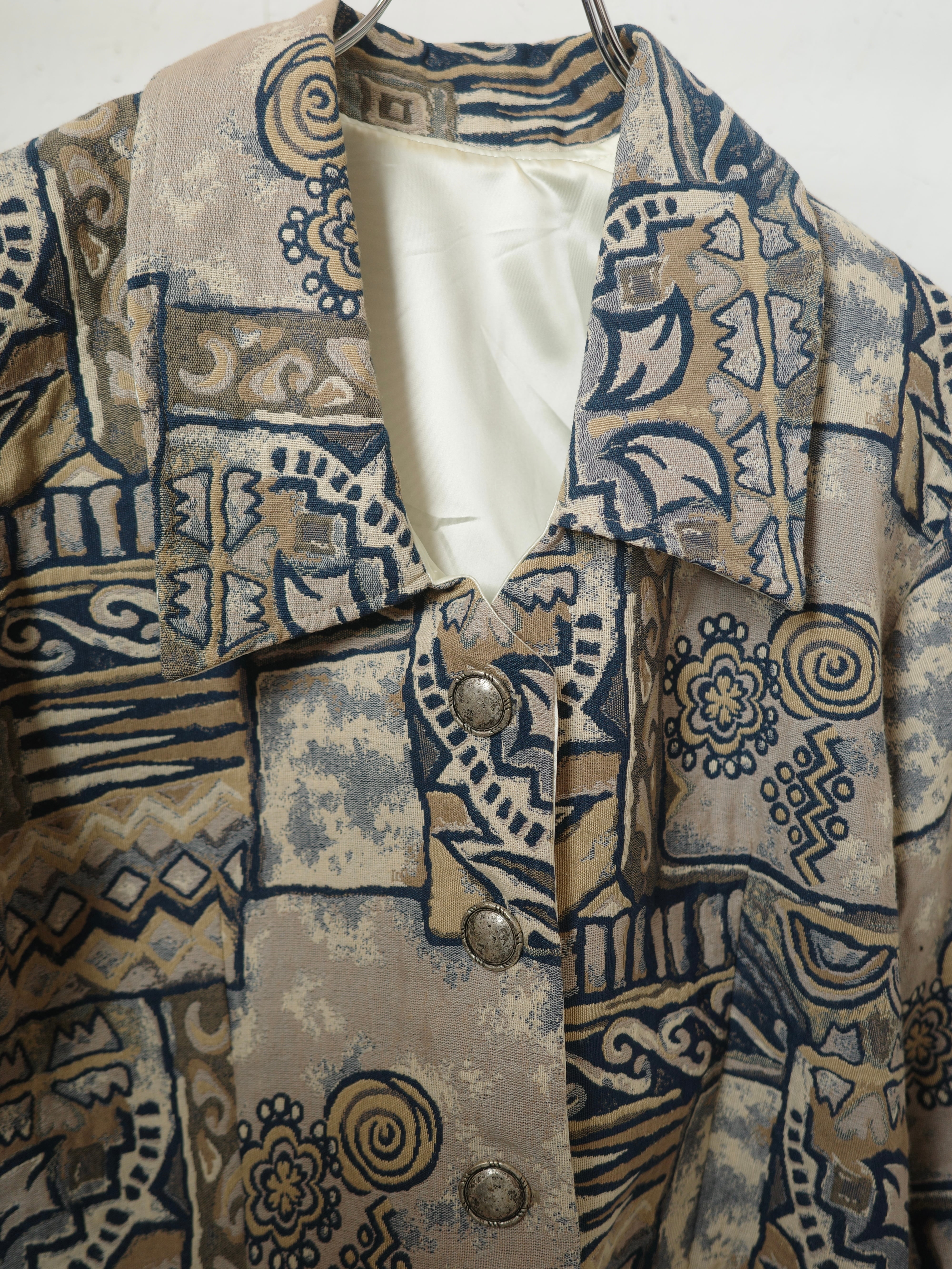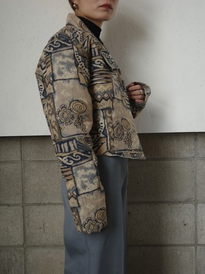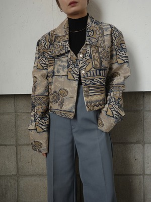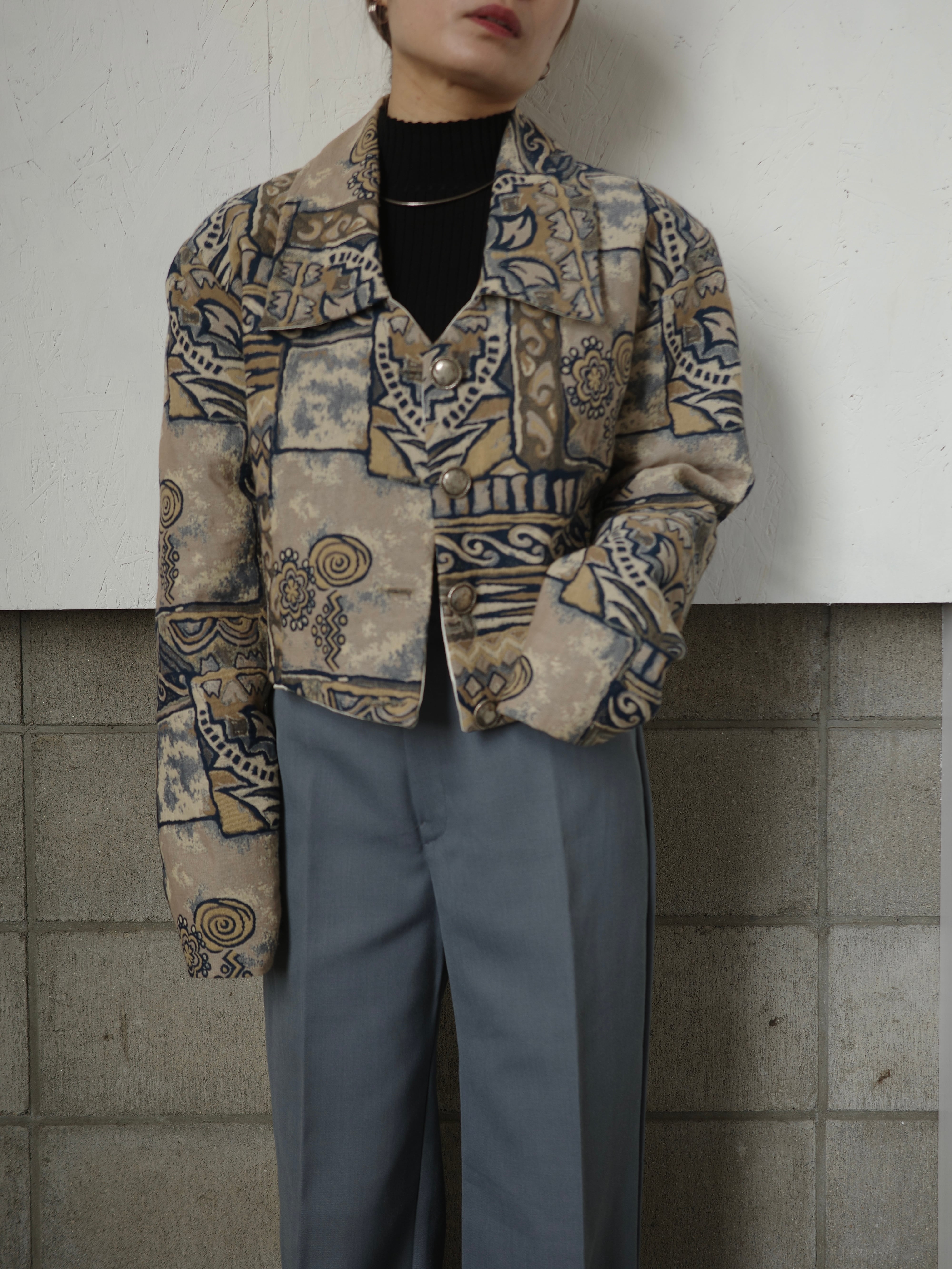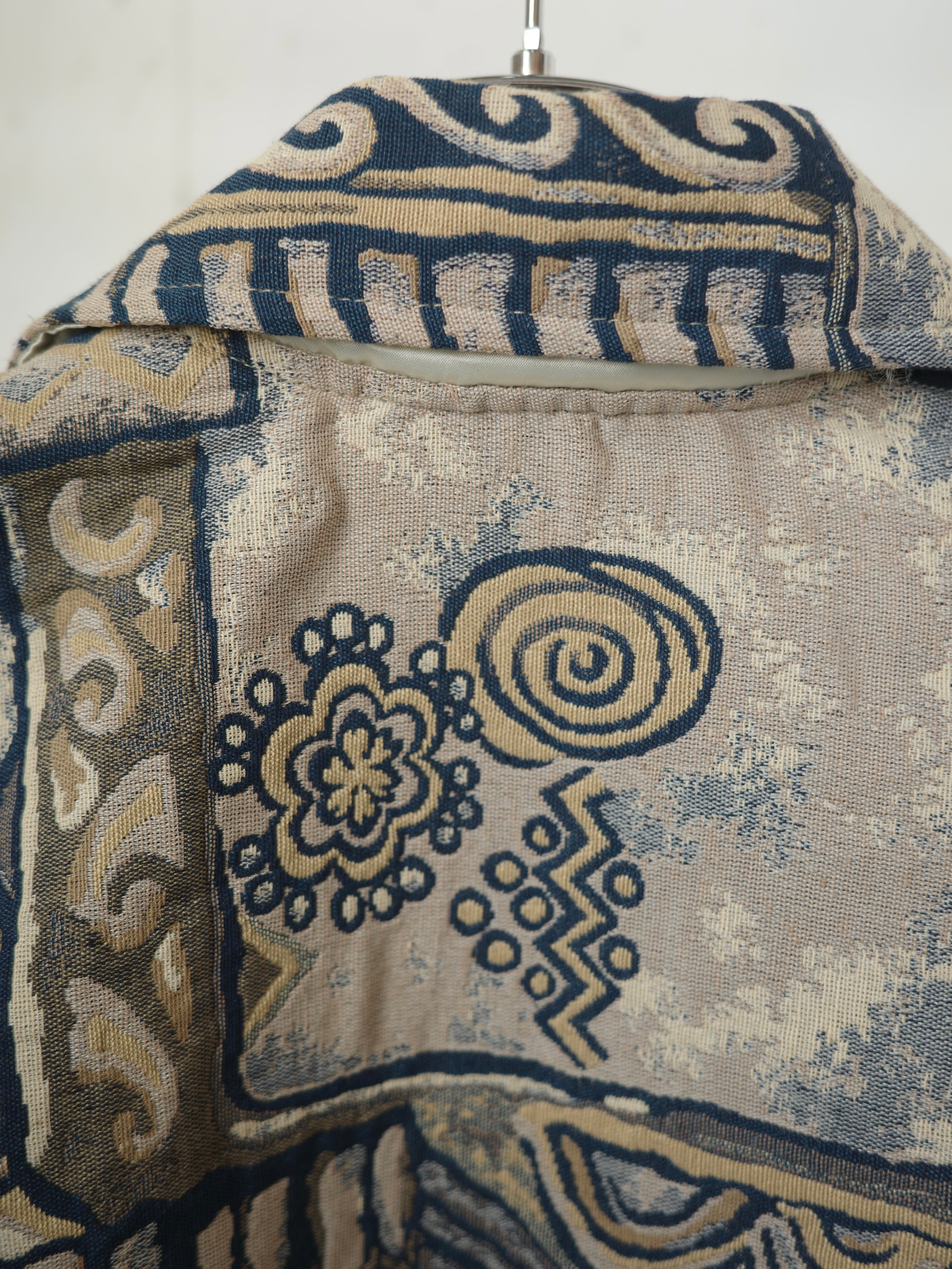 ジャガード織のデザインジャケットです。ショート丈に袖長めのレトロなシルエットで、スタイルアップできるバランス感がカッコ良いアイテム。ブルーとベージュの絶妙な色使い、大きめのデザインボタン、襟元の開口デザインなど、どこをとってもディテールが素敵な主役になるジャケットです。