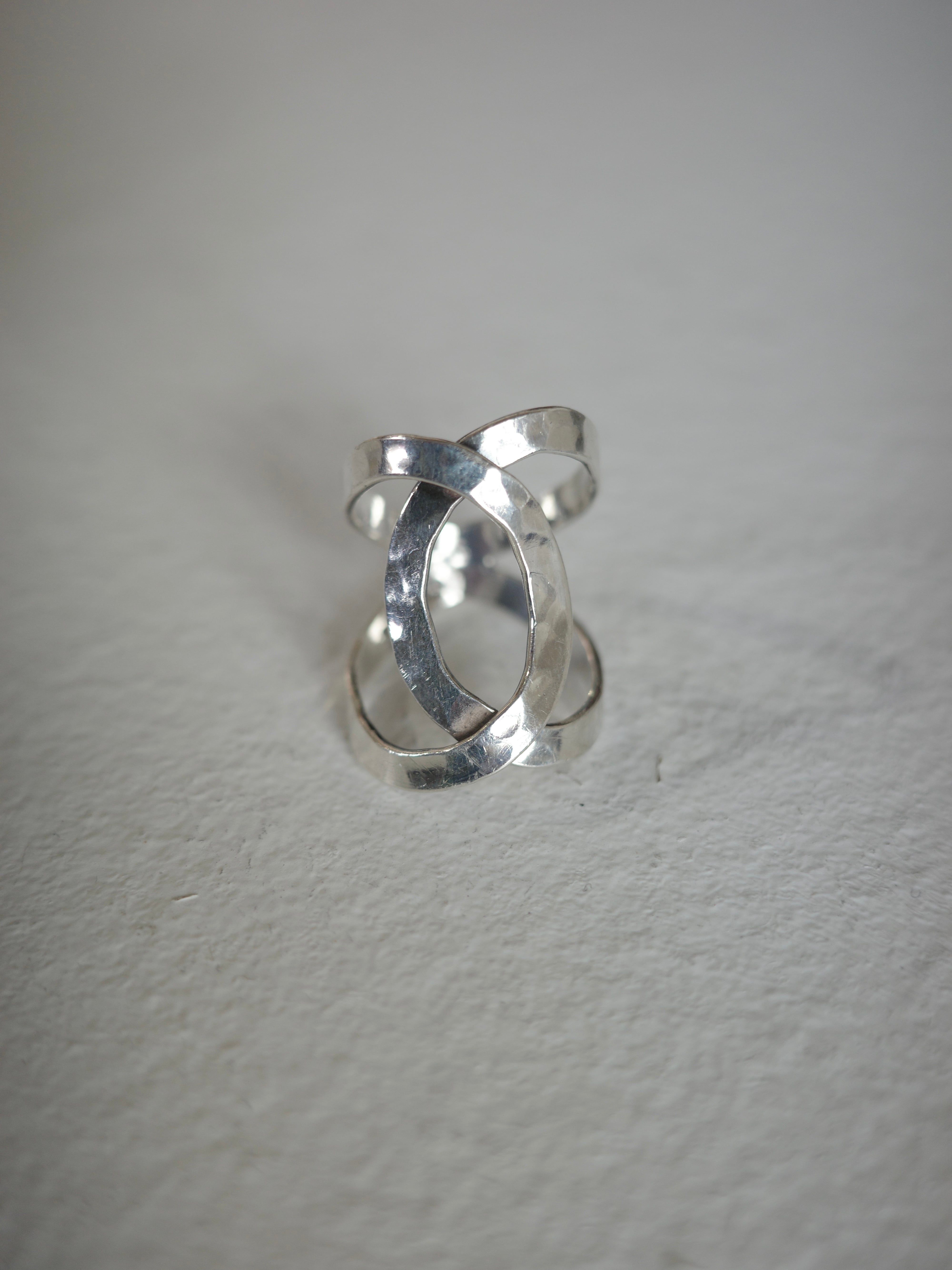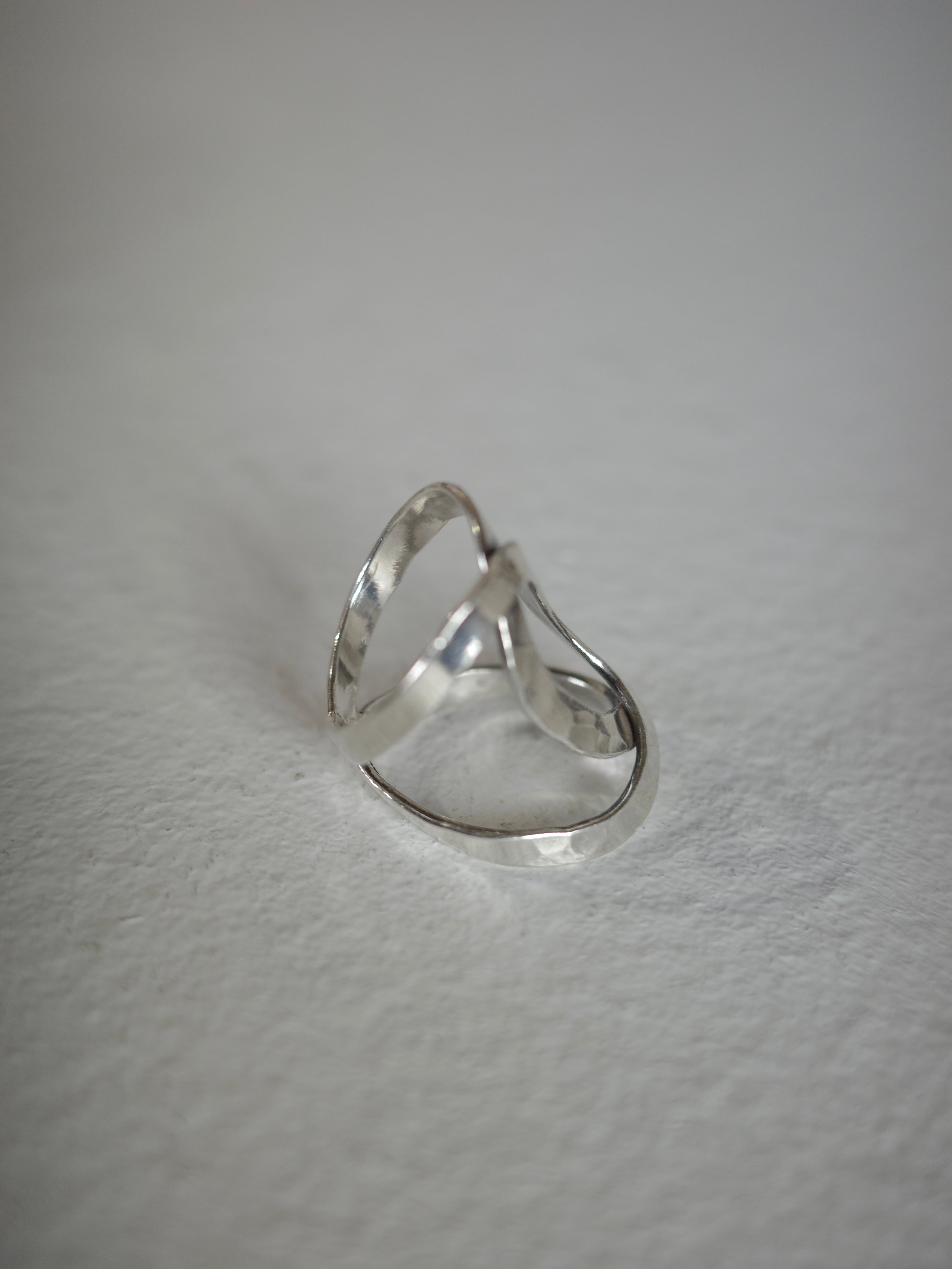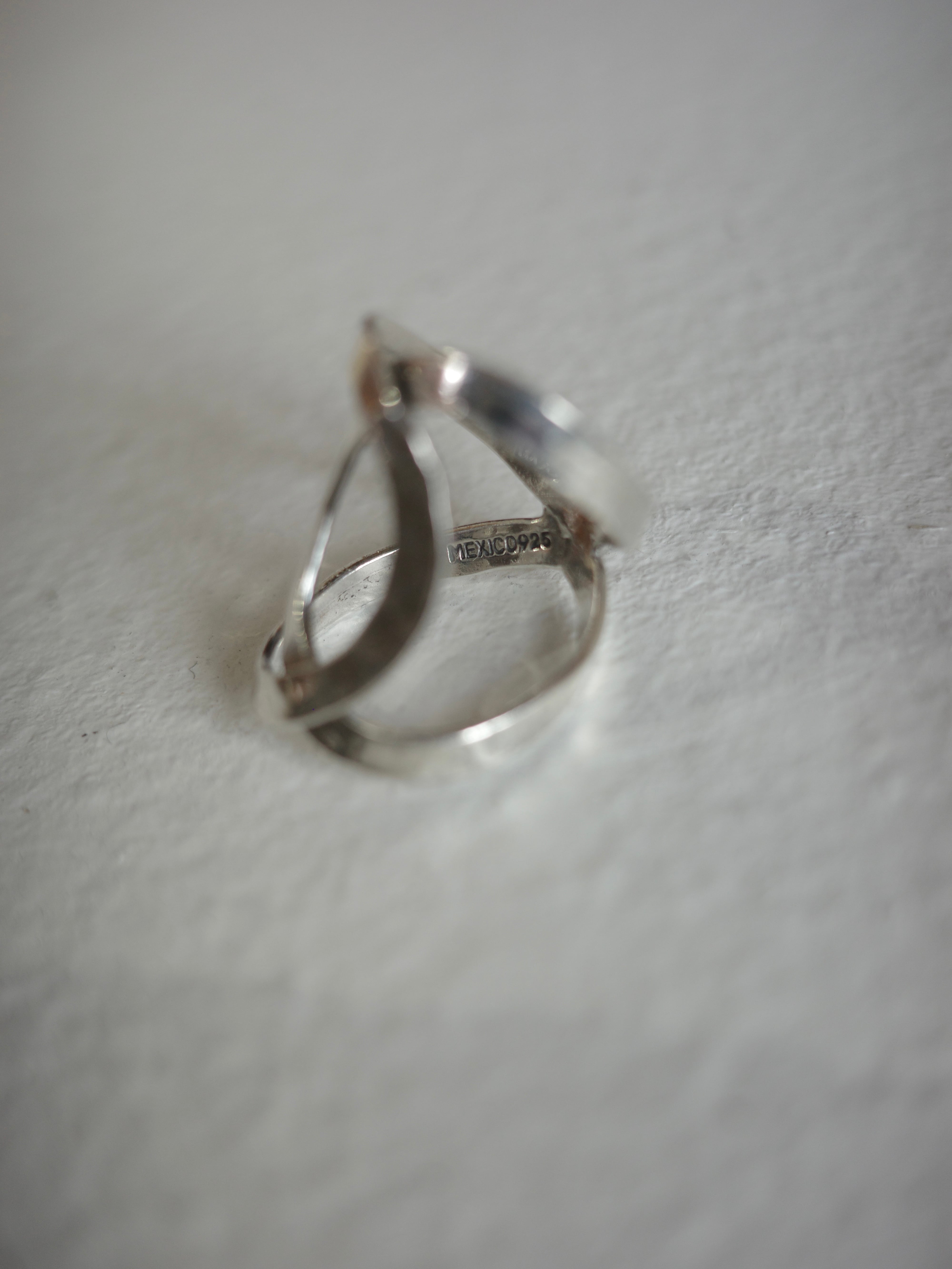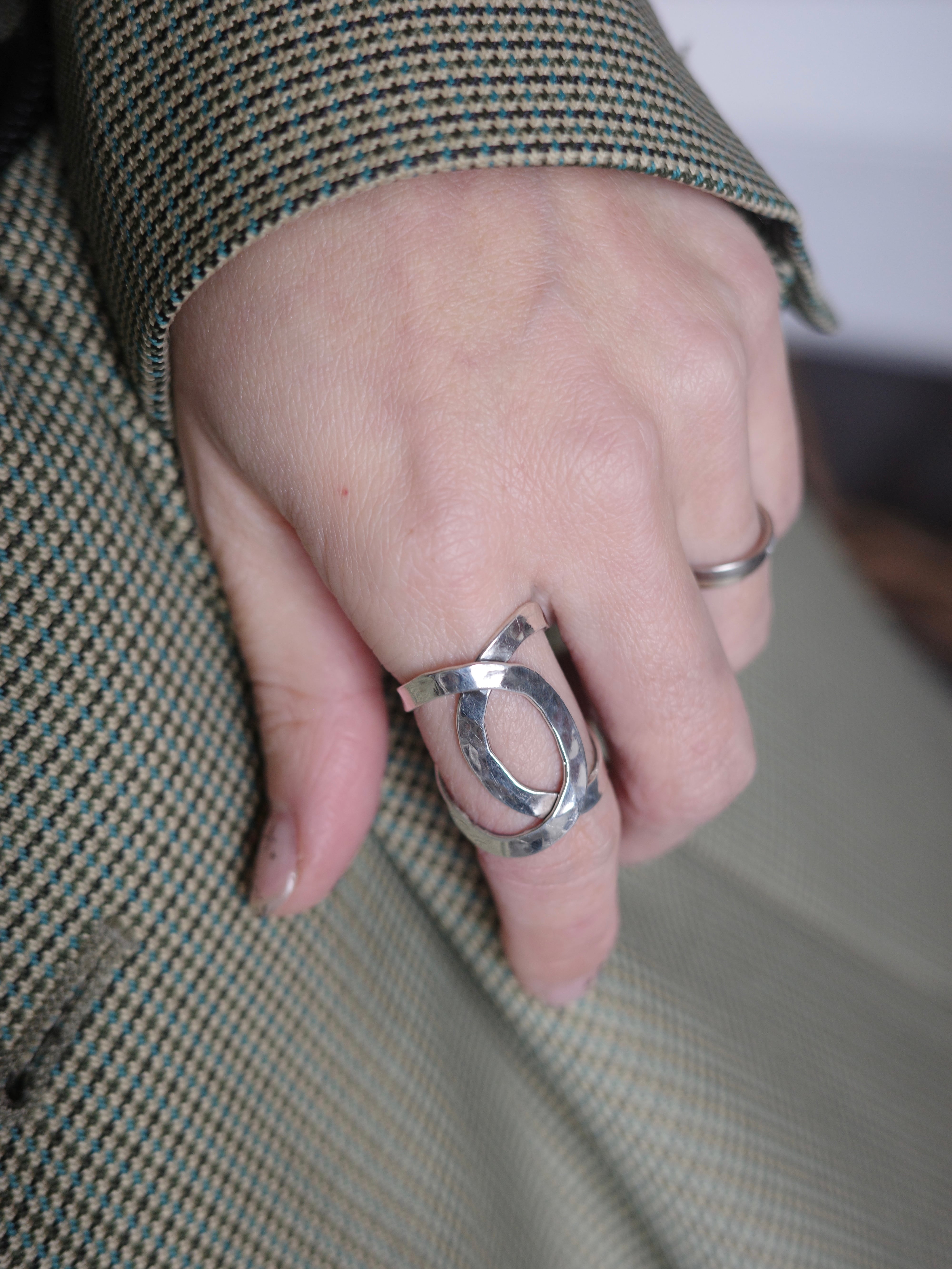 アメリカより仕入れたヴィンテージリングです。第二関節まで届きそうな幅広のデザインが存在感のあるデザイン。抜けがあるのと厚みがないので、付けるとゴツくはならず上品さも感じられます。全体がハンマー打ちされているところもポイントです。