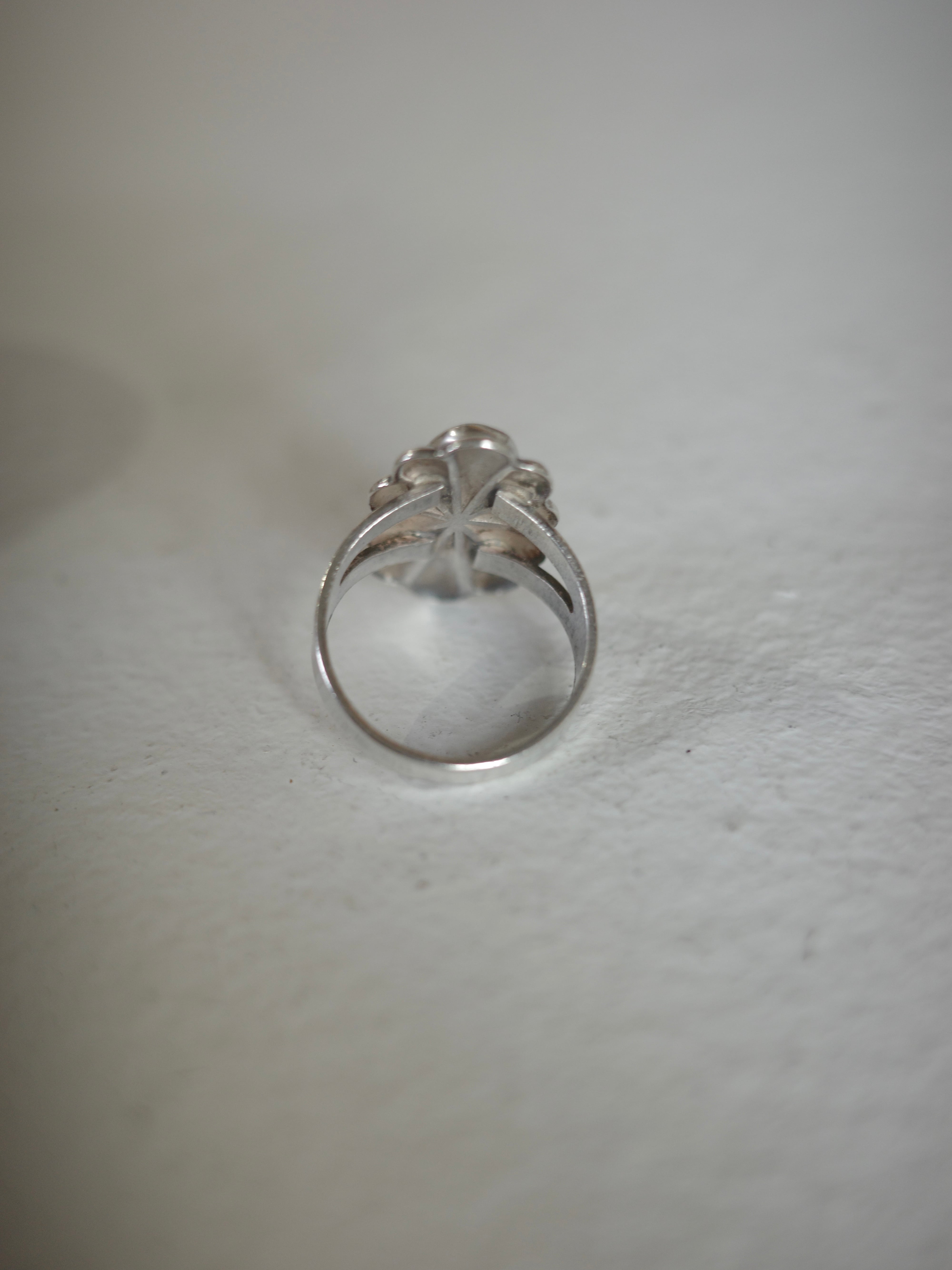 アメリカより仕入れたヴィンテージリングです。サウスウエスタンの民族ジュエリーですが、長細いオーバル型やお花のモチーフがシンプルでゴツくなりすぎないデザインになっています。