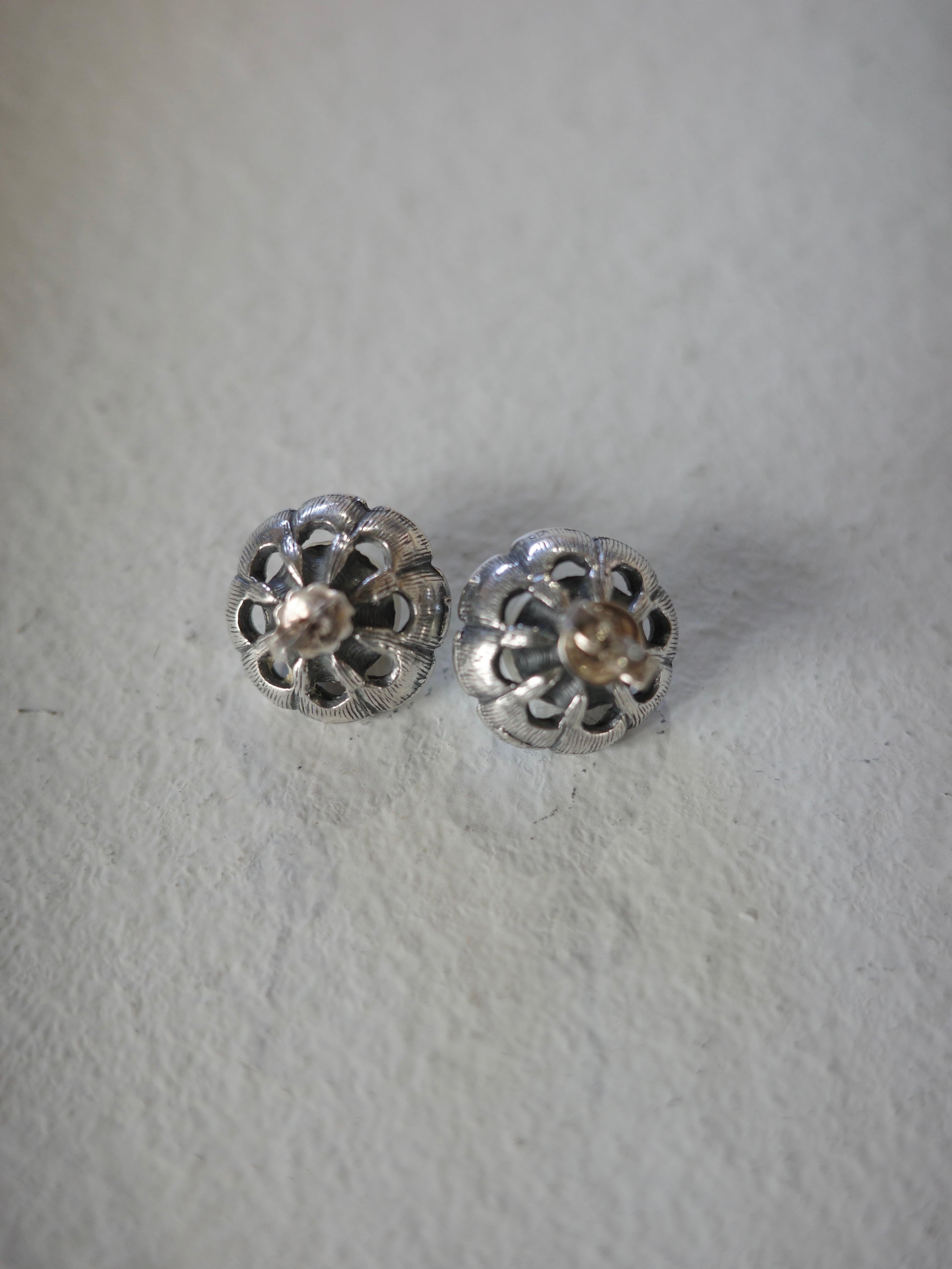 アメリカより仕入れたヴィンテージピアスです。丸みのあるお花のようなモチーフ中が可愛らしいデザイン。パールがあしらわれているので上品さもあり、オケージョンシーンにもおすすめです。